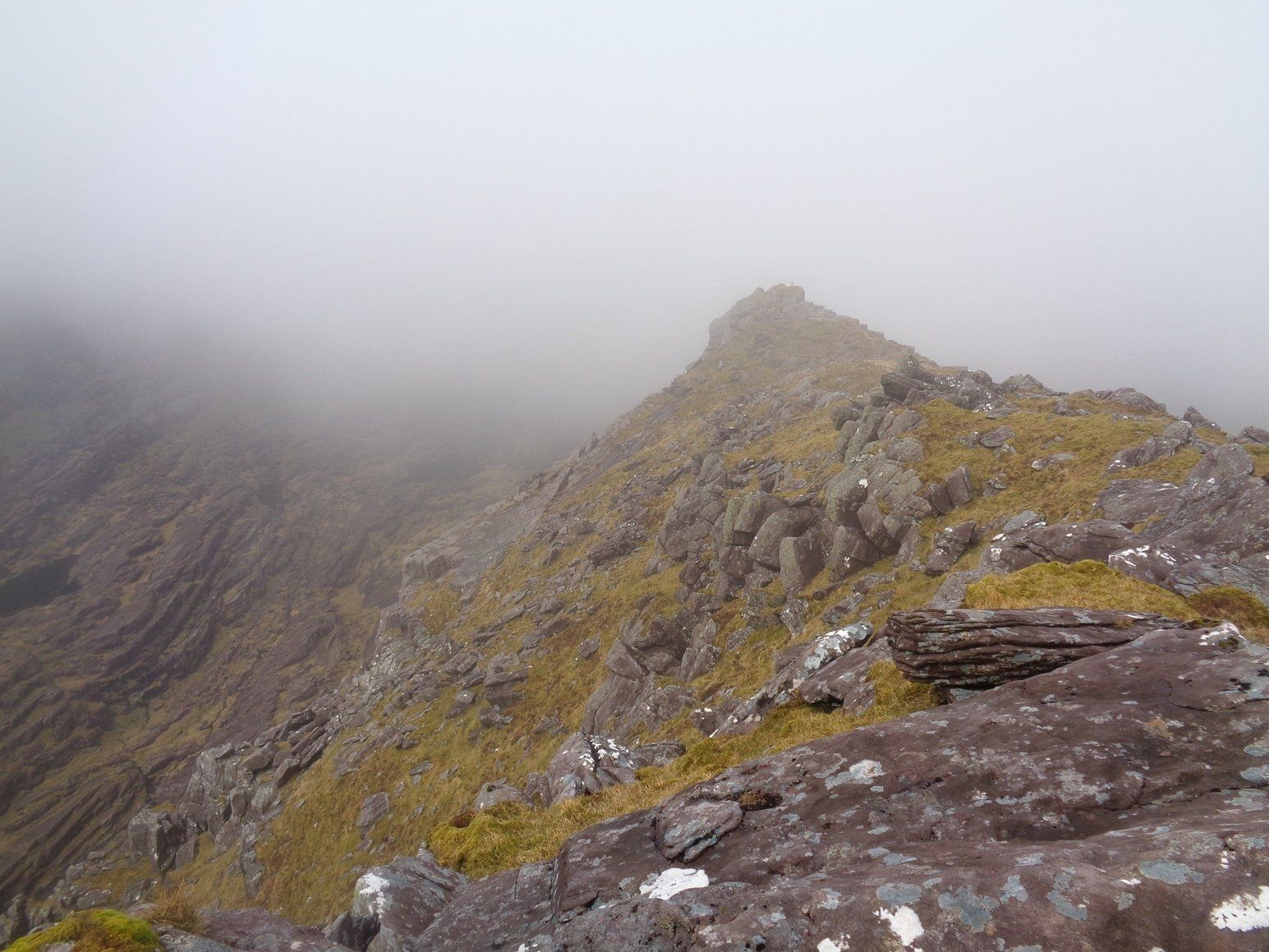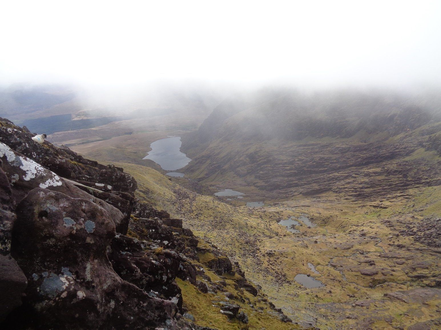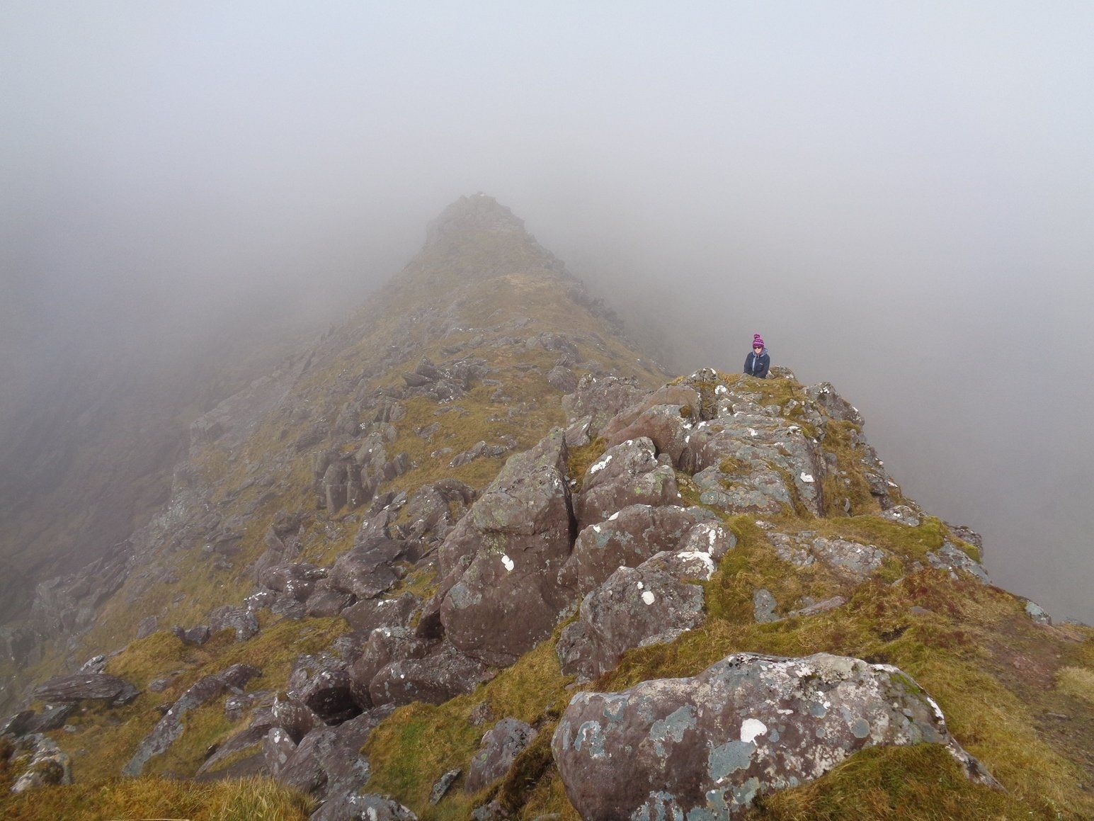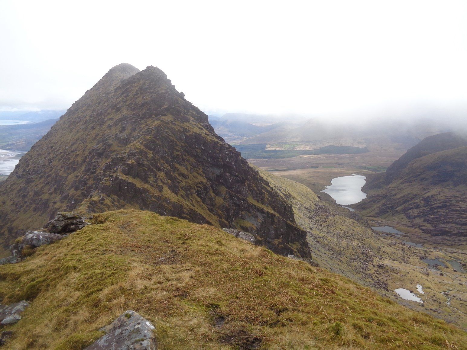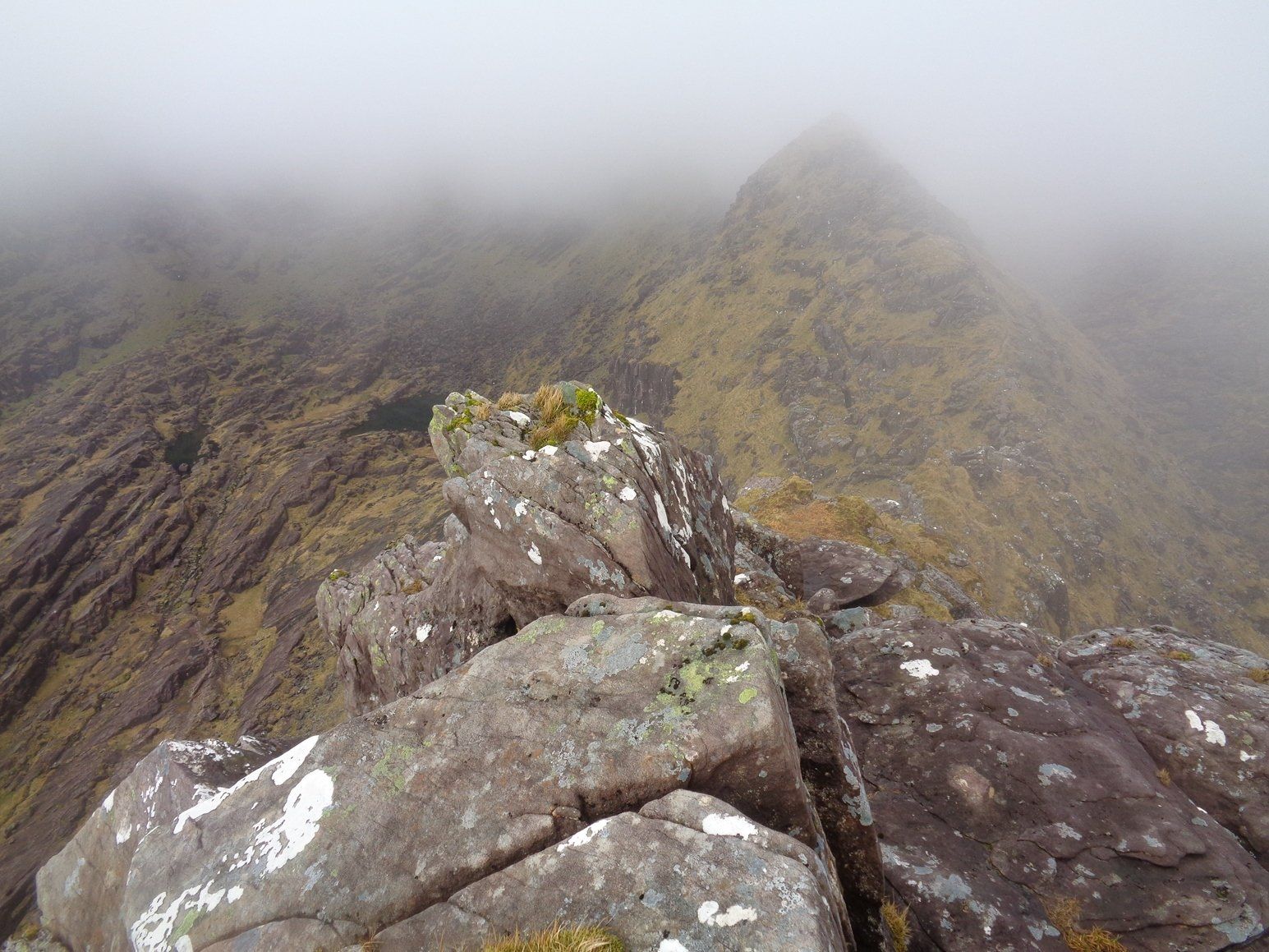 April 2017 - (with Gemma) Ascent from Faha. Brandon Mountain is a mountain on the Dingle Peninsula in County Kerry, Ireland. It is the highest peak of the unnamed central mountain range of the Dingle Peninsula and the ninth highest peak in Ireland. A lovely drive over the Connor Pass to the start point today as we were tackling Brandon Mountain from its east side. This also meant we could take on the notorious Faha Ridge: a Grade 1 scramble, technically easy, but exposure impressive - especially on the ridge's north side. The ascent from Faha car park up the slopes to the start of the ridge proper was hard graft through trackless heather. The scrambling began just after the summit of Benagh and was largely inescapable, with one break in the encircling cliffs on the south side only obvious from below. The views down into the savage glen of the Paternoster lakes with Brandon's ridges falling in parallel were stupendous, as were the views back along the ridge. There were plenty of challenging downclimbs including one where Gemma’s foot became stuck in a cleft of rock, wrenching her shoe off. It took ages to wrestle the shoe free whilst balanced precariously on a shelf of rock. There were moments where the ridge genuinely was knife-edged with sheer drops either side bringing some stomach sinking pangs of exposure. The whole ridge was fantastic and it took us over an hour to negotiate it before we descended to re-join the main path to the summit of Brandon Mountain. Now we were well into the clouds however we enjoyed lunch on the summit next to the large white cross. The views from here would have to wait for another day. The descent was along the ‘Pilgrim’s Path’. The large corrie on the mountain's east side has a series of rock steps, each of which includes a small Paternoster lake. There’s at least ten of these lakes, which grew in size as we descended the mountain. Amazing day out.