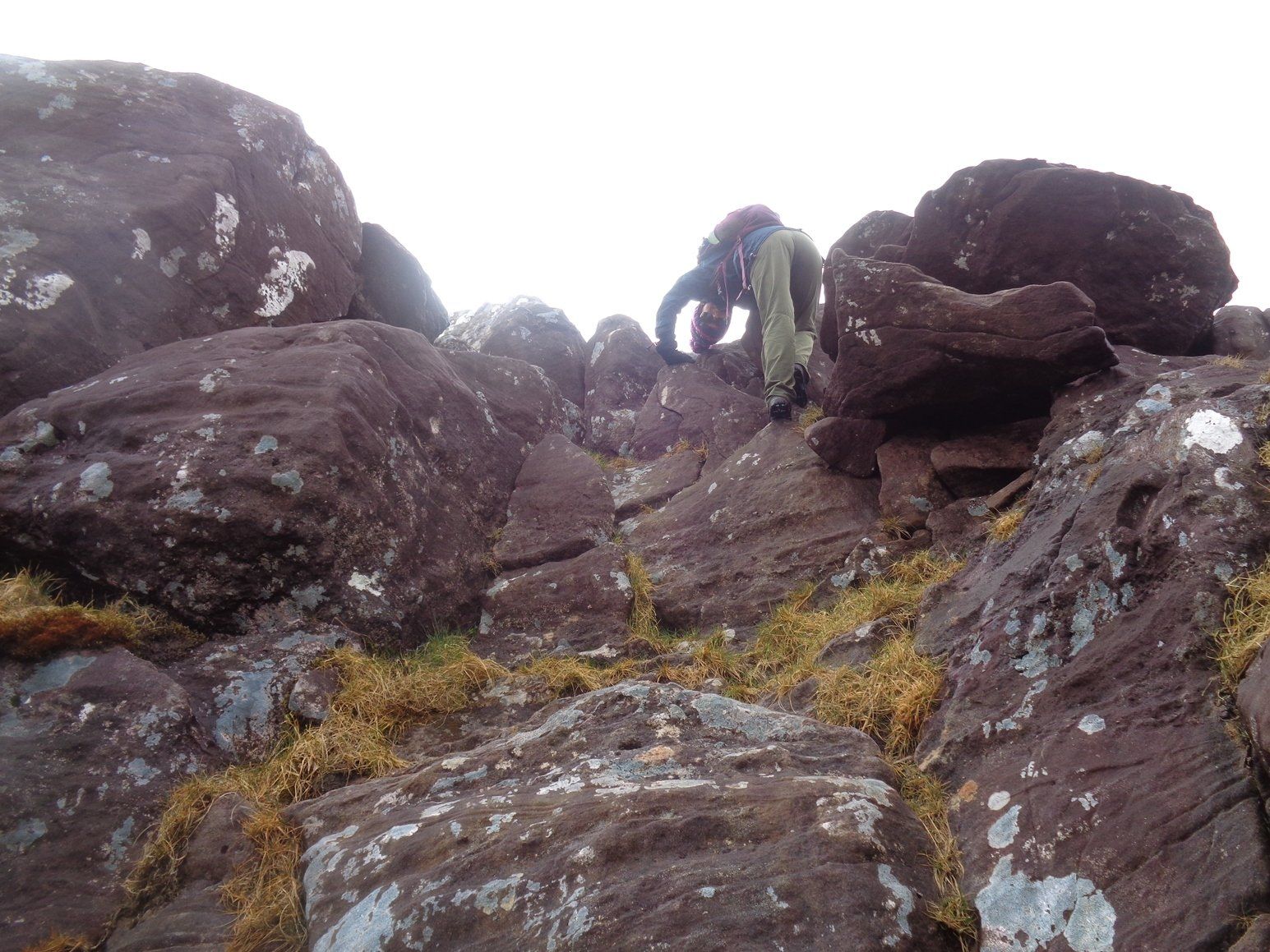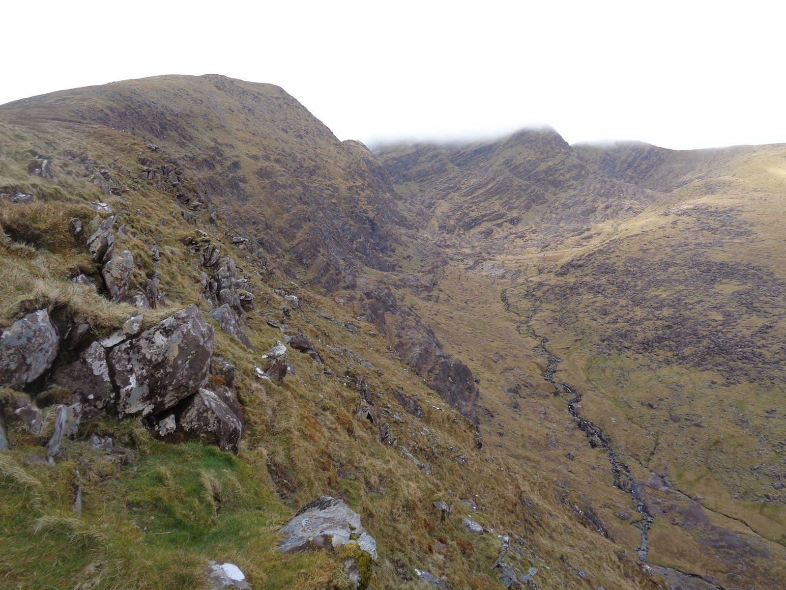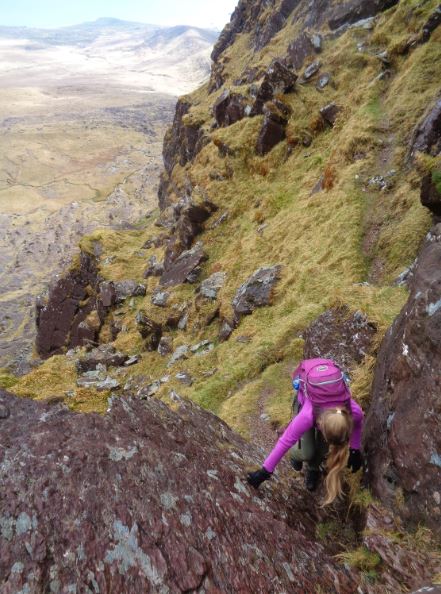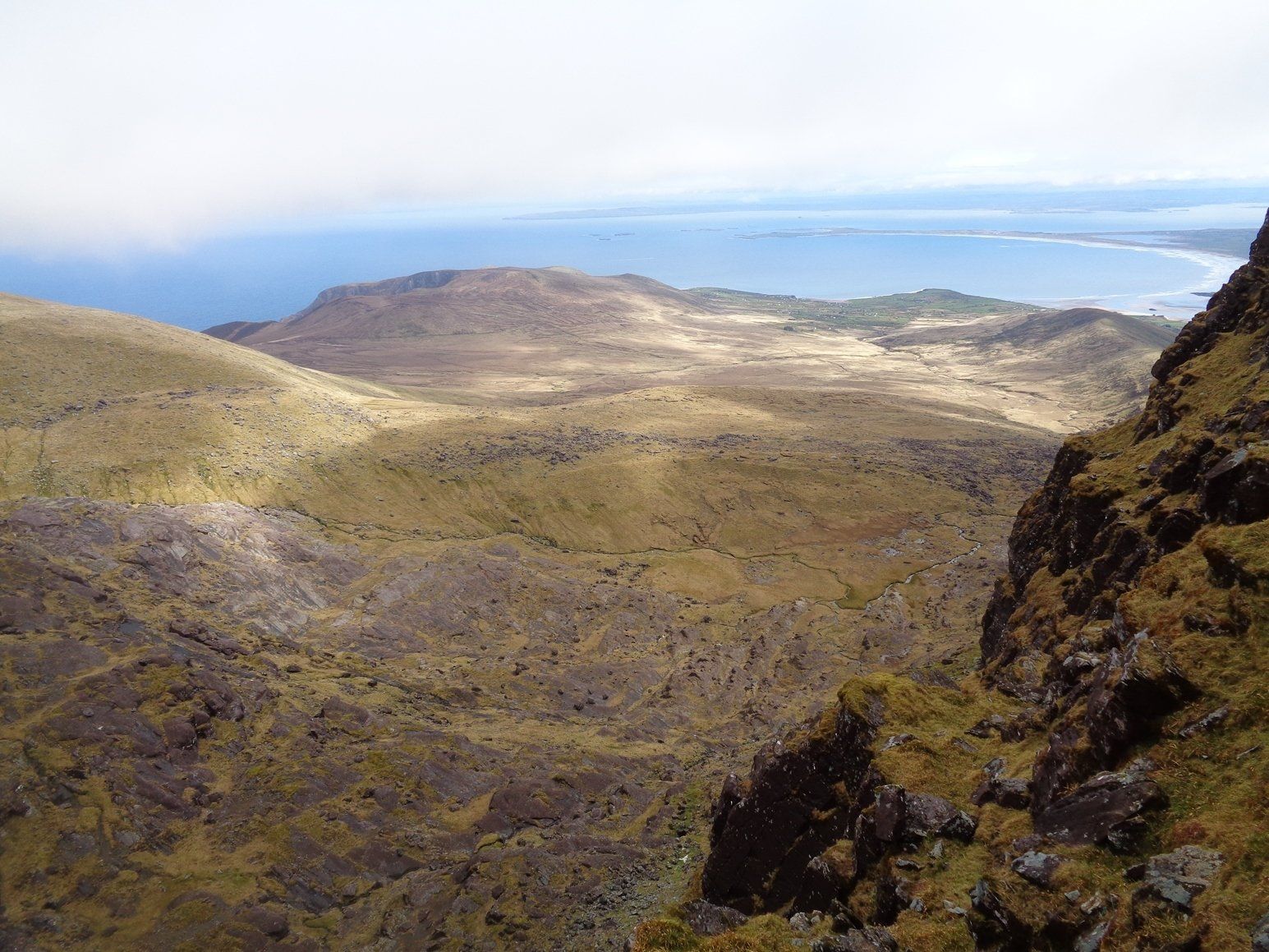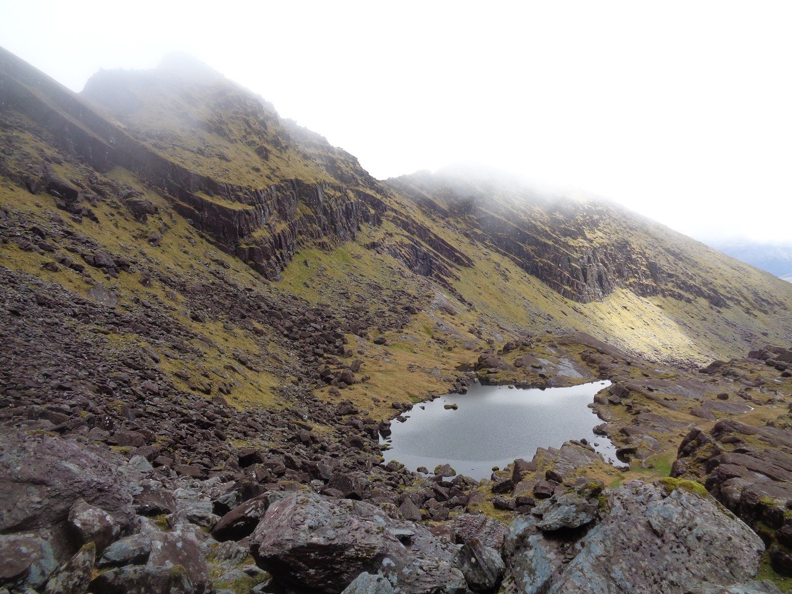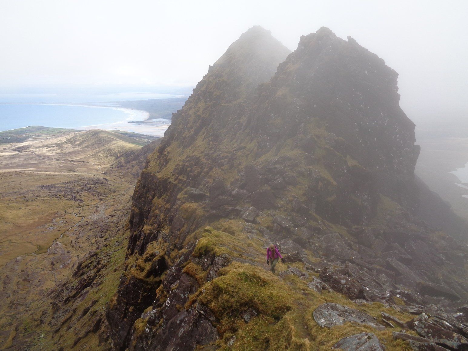 April 2017 - (with Gemma) Ascent from Faha. Brandon Mountain is a mountain on the Dingle Peninsula in County Kerry, Ireland. It is the highest peak of the unnamed central mountain range of the Dingle Peninsula and the ninth highest peak in Ireland. A lovely drive over the Connor Pass to the start point today as we were tackling Brandon Mountain from its east side. This also meant we could take on the notorious Faha Ridge: a Grade 1 scramble, technically easy, but exposure impressive - especially on the ridge's north side. The ascent from Faha car park up the slopes to the start of the ridge proper was hard graft through trackless heather. The scrambling began just after the summit of Benagh and was largely inescapable, with one break in the encircling cliffs on the south side only obvious from below. The views down into the savage glen of the Paternoster lakes with Brandon's ridges falling in parallel were stupendous, as were the views back along the ridge. There were plenty of challenging downclimbs including one where Gemma’s foot became stuck in a cleft of rock, wrenching her shoe off. It took ages to wrestle the shoe free whilst balanced precariously on a shelf of rock. There were moments where the ridge genuinely was knife-edged with sheer drops either side bringing some stomach sinking pangs of exposure. The whole ridge was fantastic and it took us over an hour to negotiate it before we descended to re-join the main path to the summit of Brandon Mountain. Now we were well into the clouds however we enjoyed lunch on the summit next to the large white cross. The views from here would have to wait for another day. The descent was along the ‘Pilgrim’s Path’. The large corrie on the mountain's east side has a series of rock steps, each of which includes a small Paternoster lake. There’s at least ten of these lakes, which grew in size as we descended the mountain. Amazing day out.
