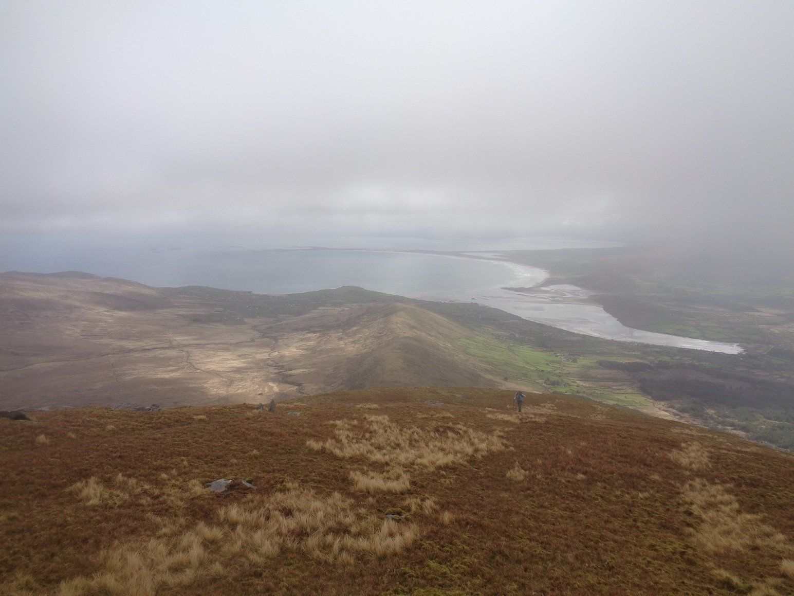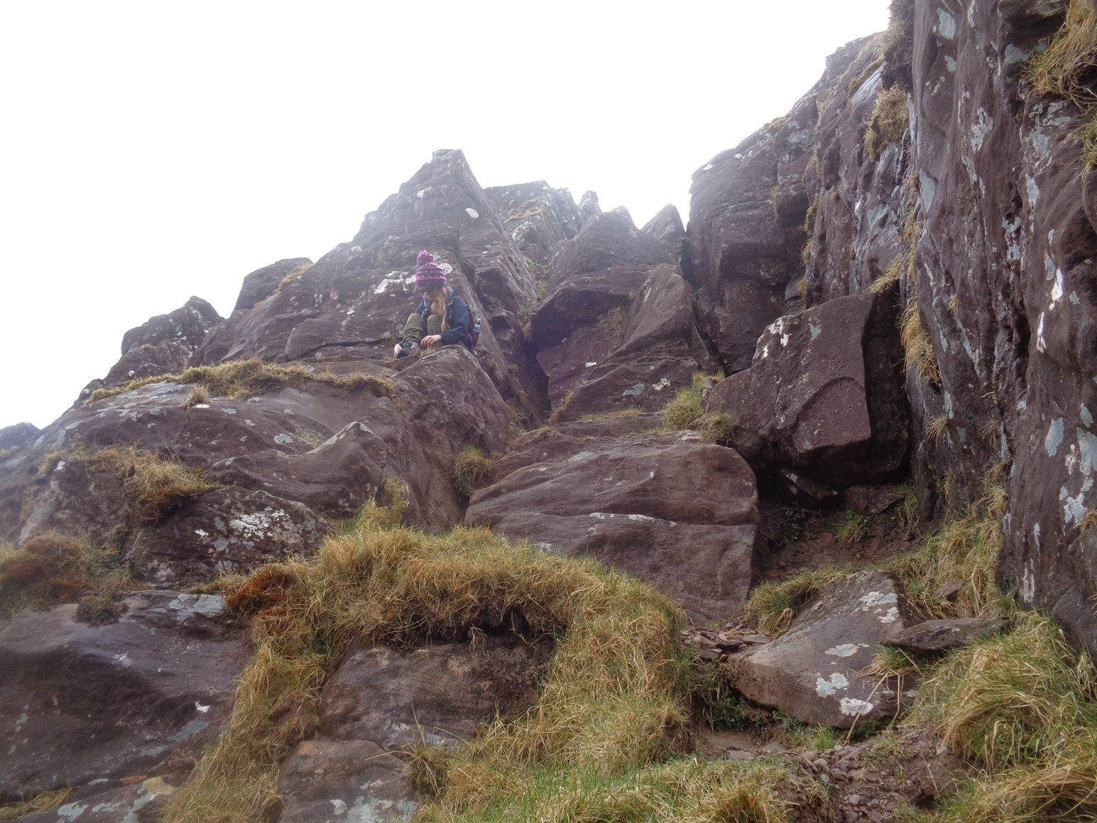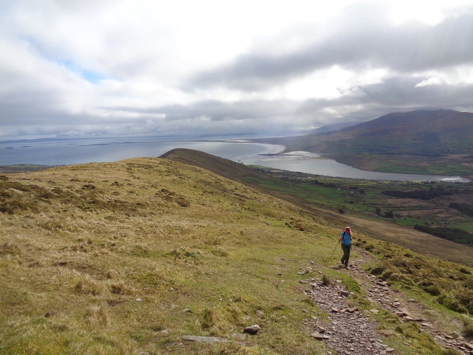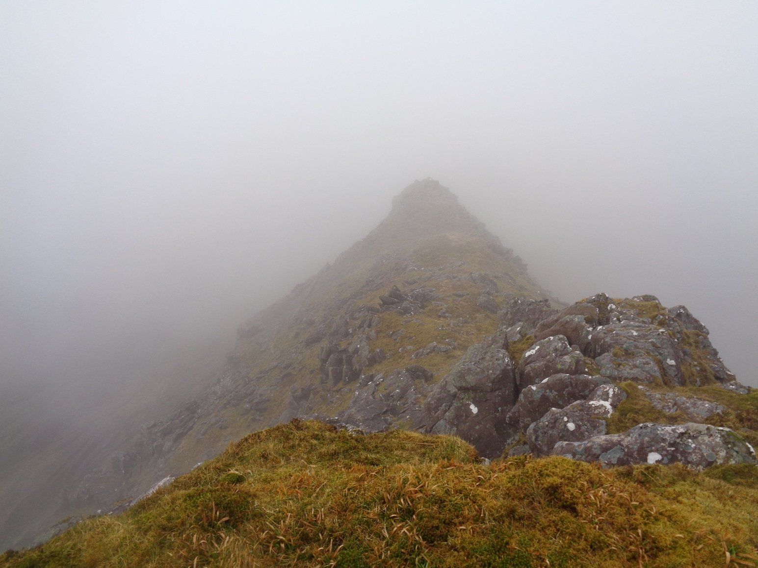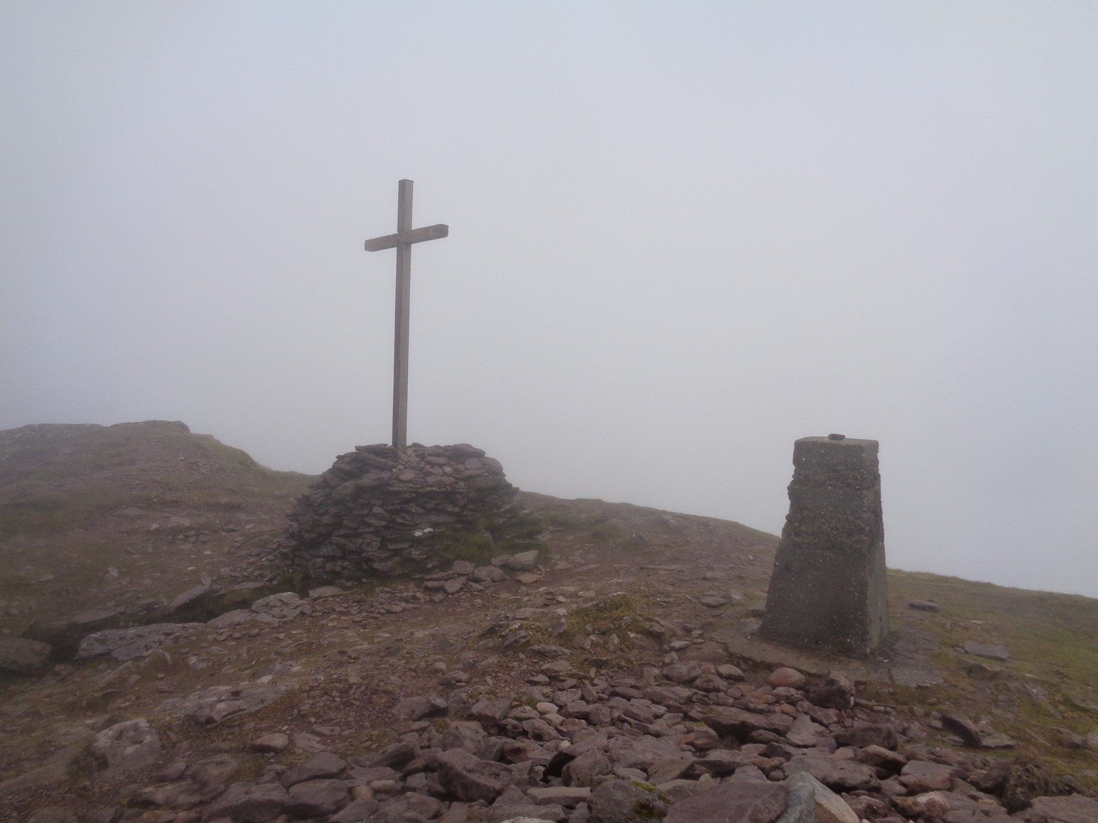 April 2017 - (with Gemma) Ascent from Faha. Brandon Mountain is a mountain on the Dingle Peninsula in County Kerry, Ireland. It is the highest peak of the unnamed central mountain range of the Dingle Peninsula and the ninth highest peak in Ireland. A lovely drive over the Connor Pass to the start point today as we were tackling Brandon Mountain from its east side. This also meant we could take on the notorious Faha Ridge: a Grade 1 scramble, technically easy, but exposure impressive - especially on the ridge's north side. The ascent from Faha car park up the slopes to the start of the ridge proper was hard graft through trackless heather. The scrambling began just after the summit of Benagh and was largely inescapable, with one break in the encircling cliffs on the south side only obvious from below. The views down into the savage glen of the Paternoster lakes with Brandon's ridges falling in parallel were stupendous, as were the views back along the ridge. There were plenty of challenging downclimbs including one where Gemma’s foot became stuck in a cleft of rock, wrenching her shoe off. It took ages to wrestle the shoe free whilst balanced precariously on a shelf of rock. There were moments where the ridge genuinely was knife-edged with sheer drops either side bringing some stomach sinking pangs of exposure. The whole ridge was fantastic and it took us over an hour to negotiate it before we descended to re-join the main path to the summit of Brandon Mountain. Now we were well into the clouds however we enjoyed lunch on the summit next to the large white cross. The views from here would have to wait for another day. The descent was along the ‘Pilgrim’s Path’. The large corrie on the mountain's east side has a series of rock steps, each of which includes a small Paternoster lake. There’s at least ten of these lakes, which grew in size as we descended the mountain. Amazing day out.