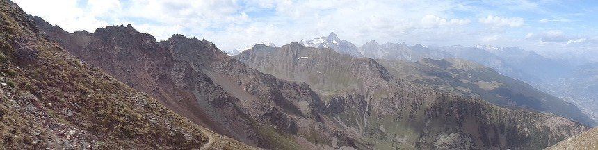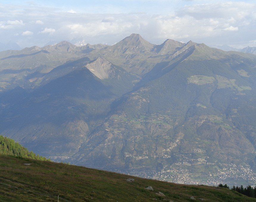 Aug 2017 - (with Gemma) Ascent from Pila. Goodness me. What an ascent! An eight-hour epic. The Becca di Nona mountain towers over Aosta and, at over 3100m, is a serious undertaking. The route climbs initially for a few miles before descending into another valley at an altitude only 150m higher than the start point. We didn't let this deter us (even though we knew we'd have to return over it later when legs were aching) and we pressed on. When the mountain came into view it was exhilarating; a kilometre straight up from the valley. Scrambly sections kept us enthused with the Matterhorn and the Mont Blanc massif as a backdrop. The immediate rugged surroundings were more than enough however with Monte Emilius dominating the view south-eastwards. I carried 6 bottles of water and Gemma 2 after our Swiss heatwave! Actually, as we set off at 7:30am, the heat wasn't really a factor on the way up and we reached the summit shortly before midday. Views were astounding with Aosta looking like a Lego set far below. A cast-iron statue of St. Mary adorns the summit which is a proper pinnacle with ferocious drops on 3 sides. We had lunch and spent almost an hour on the summit before descending to the col where evidence of a huge avalanche which had obliterated the adjoining descent path was obvious. The return was lovely apart from the energy-sapping up and over mentioned earlier. Truly memorable stuff. Billions of grasshoppers and a few marmots. Pizza earned in Aosta tonight!