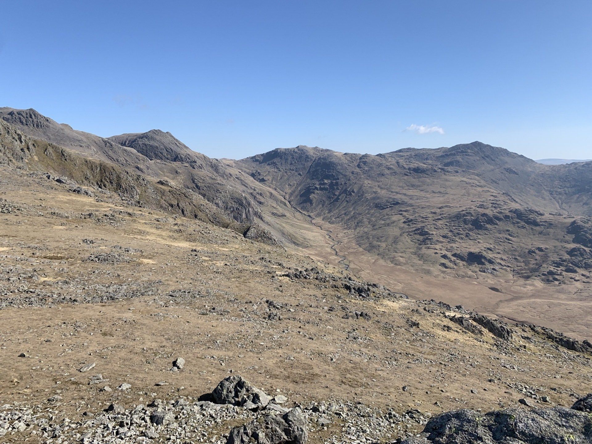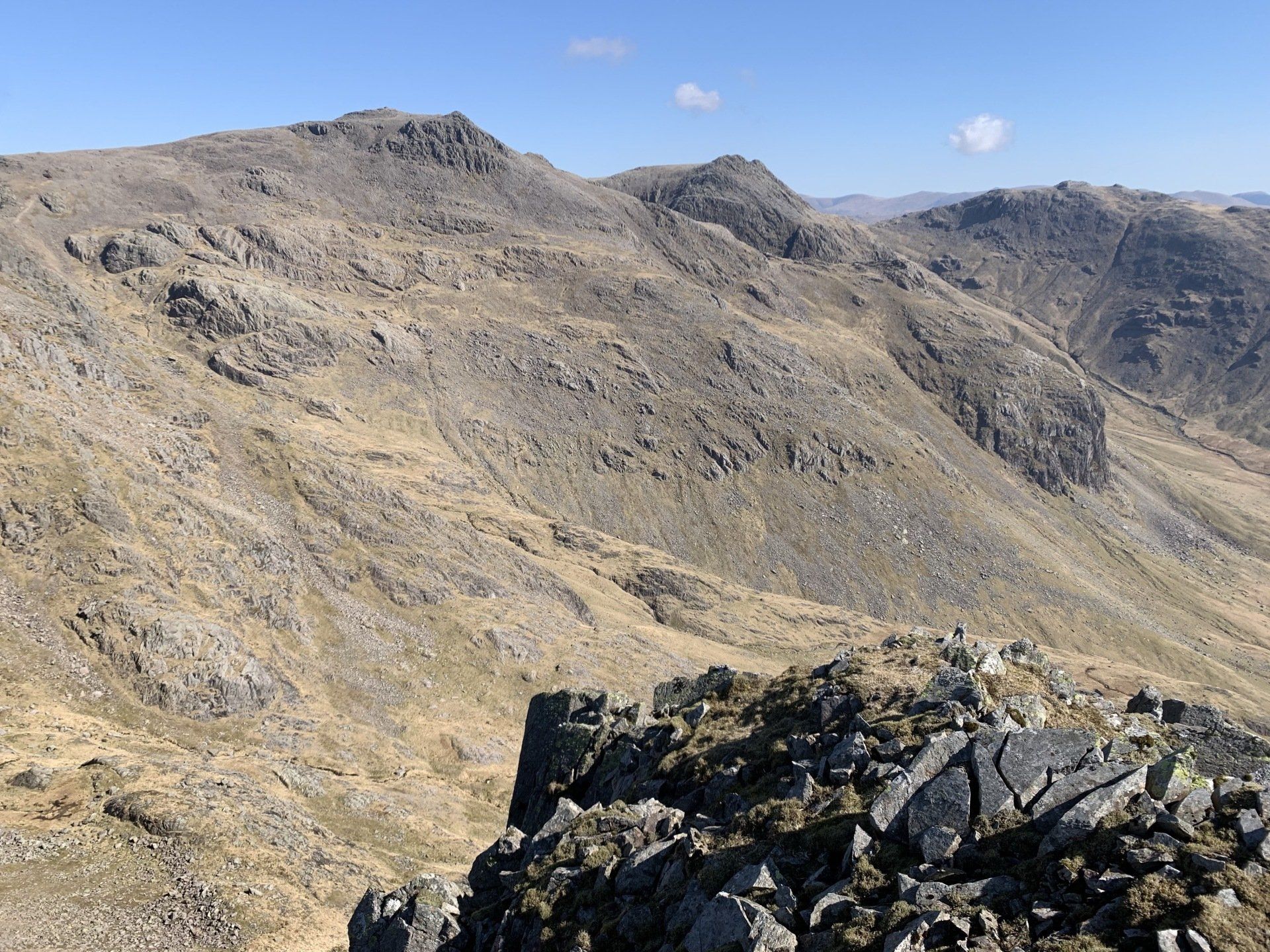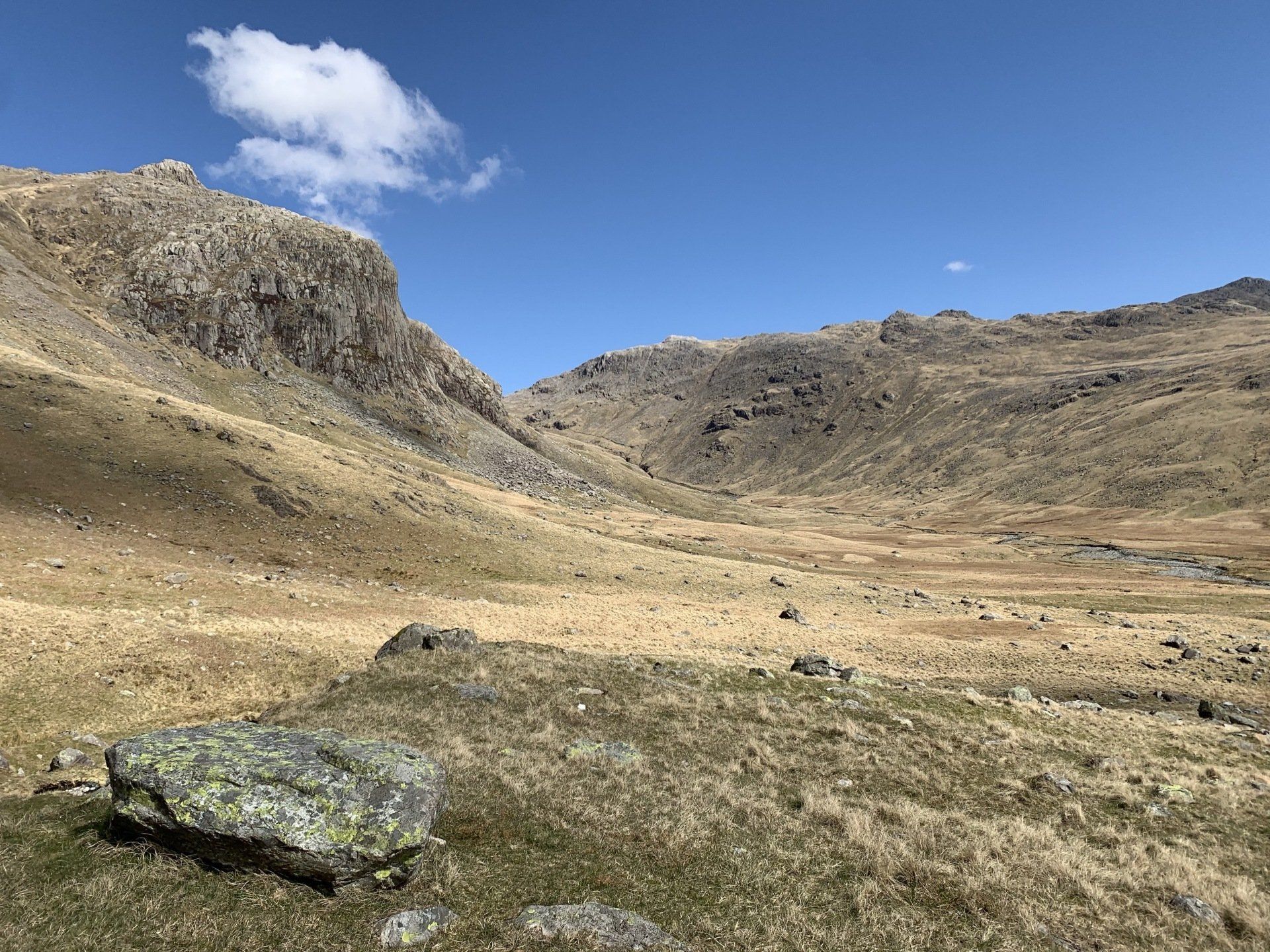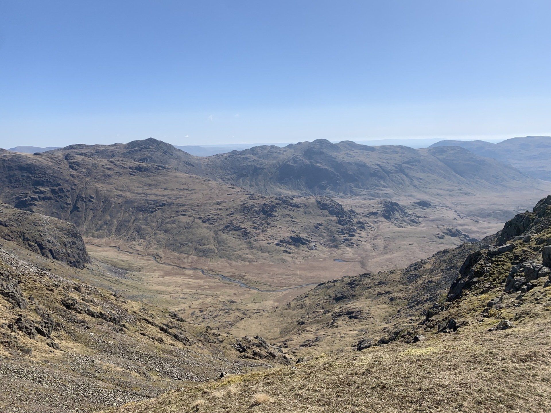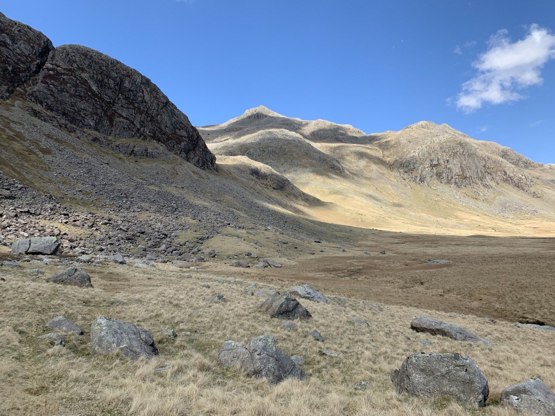 Apr 2021 - Ascent from Wha House. Superb walk in perfect conditions. In contrast to yesterday (weird staring chap in the car park), I met a lovely farmer at the start point. She was genuinely interested in me and easy to speak to. She wouldn't let me have a go on her quad bike though. In fact, on every occasion I've walked from here or up the road at Brotherikeld, I've witnessed local farmers out on the fells rounding up the sheep. Fascinating to watch the dogs do their stuff. Today, it was me inadvertently driving a bunch on; a huge flock scampered on ahead of me as I made my way towards Slight Side. Eventually, as things got steeper, they all veered off to the right. I sat and had a snack on the summit of Slight Side, taking in upper Eskdale and the horseshoe of Scafell, the Pike, Ill Crag, Esk Pike, Bowfell and Crinkle Crags, not forgetting retrospective views of Harter Fell, Hard Knott and, above Burnmoor Tarn, Whin Rigg and Illgill Head. By the time I'd reached Scafell, after exploring the wonderful Long Green (why isn't this a Wainwright?), I could see literally every summit in Lakeland. Of course, I was naming them all inwardly. Gable and the western fells were particularly stunning as were the Coniston fells to the south-east. Had the summit to myself whilst I could see dozens of folk milling about on the Pike. Fortunately, I couldn't hear them, despite the complete lack of a breeze. I crossed to a spot overlooking Broad Stand for lunch. After grub, I picked my way down the scree to Foxes Tarn before the wonderful chocked gully that leads steeply down to the path up from Cam Spout. It's a brilliant descent to the upper-valley floor and the Great Moss from here, alongside a series of waterfalls, with some gentle scrambling. I spotted a great wild swim spot for Gemma. After the Sampson's Stones, an erratic collection of massive boulders below Cam Spot Crag, the return is long but wonderful. Eskdale retains such a wild feel. At the conclusion of the walk, I encountered a confrontational chicken. Magnificent day!