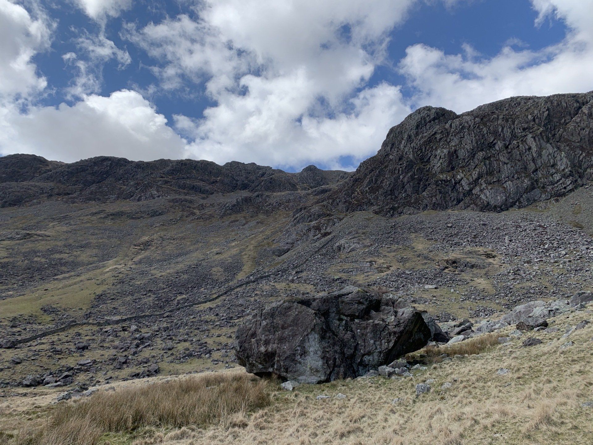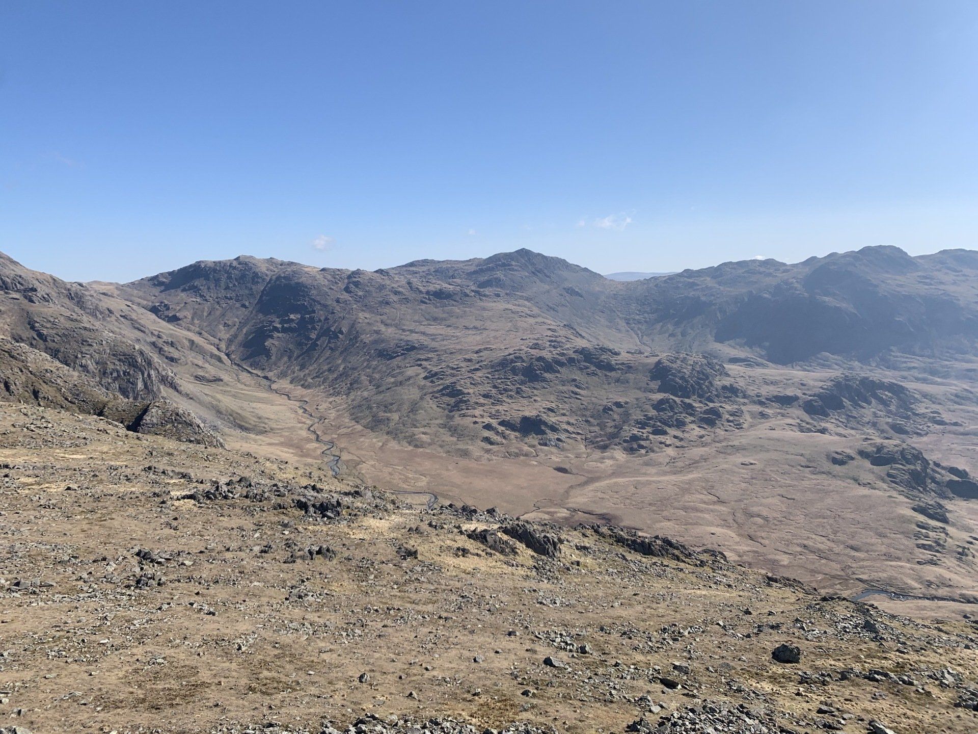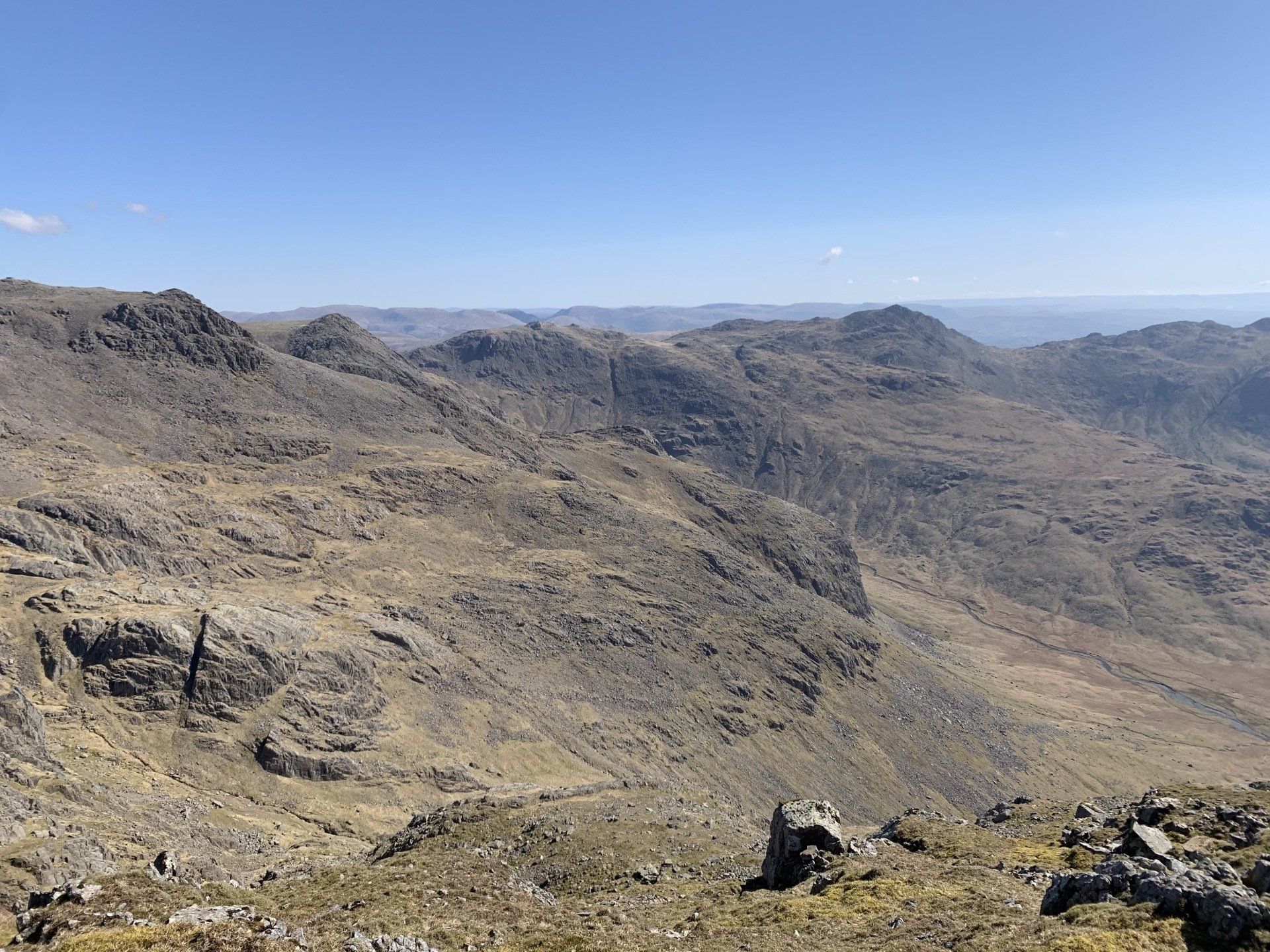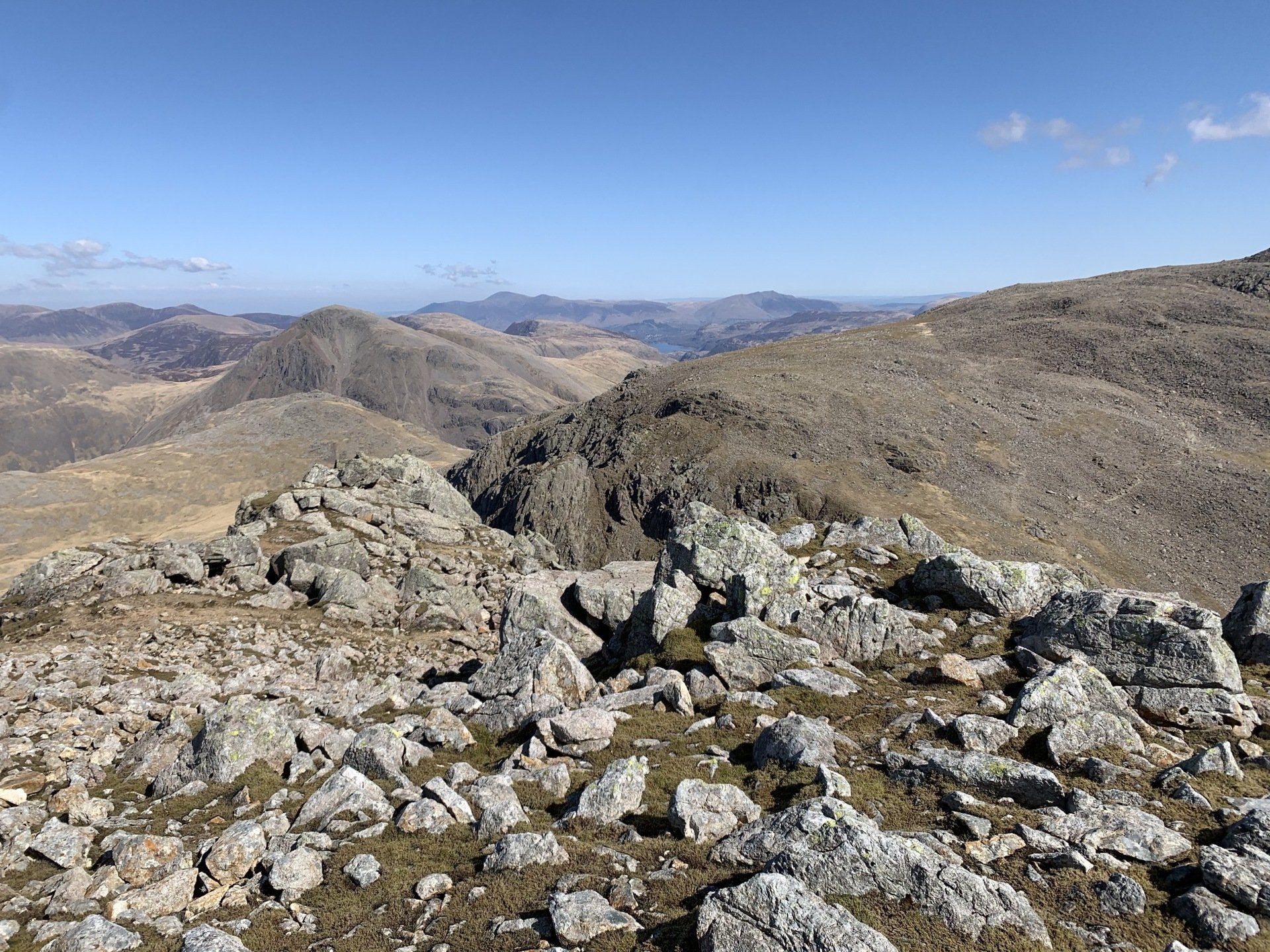 Apr 2021 - Ascent from Wha House. Superb walk in perfect conditions. In contrast to yesterday (weird staring chap in the car park), I met a lovely farmer at the start point. She was genuinely interested in me and easy to speak to. She wouldn't let me have a go on her quad bike though. In fact, on every occasion I've walked from here or up the road at Brotherikeld, I've witnessed local farmers out on the fells rounding up the sheep. Fascinating to watch the dogs do their stuff. Today, it was me inadvertently driving a bunch on; a huge flock scampered on ahead of me as I made my way towards Slight Side. Eventually, as things got steeper, they all veered off to the right. I sat and had a snack on the summit of Slight Side, taking in upper Eskdale and the horseshoe of Scafell, the Pike, Ill Crag, Esk Pike, Bowfell and Crinkle Crags, not forgetting retrospective views of Harter Fell, Hard Knott and, above Burnmoor Tarn, Whin Rigg and Illgill Head. By the time I'd reached Scafell, after exploring the wonderful Long Green (why isn't this a Wainwright?), I could see literally every summit in Lakeland. Of course, I was naming them all inwardly. Gable and the western fells were particularly stunning as were the Coniston fells to the south-east. Had the summit to myself whilst I could see dozens of folk milling about on the Pike. Fortunately, I couldn't hear them, despite the complete lack of a breeze. I crossed to a spot overlooking Broad Stand for lunch. After grub, I picked my way down the scree to Foxes Tarn before the wonderful chocked gully that leads steeply down to the path up from Cam Spout. It's a brilliant descent to the upper-valley floor and the Great Moss from here, alongside a series of waterfalls, with some gentle scrambling. I spotted a great wild swim spot for Gemma. After the Sampson's Stones, an erratic collection of massive boulders below Cam Spot Crag, the return is long but wonderful. Eskdale retains such a wild feel. At the conclusion of the walk, I encountered a confrontational chicken. Magnificent day!
