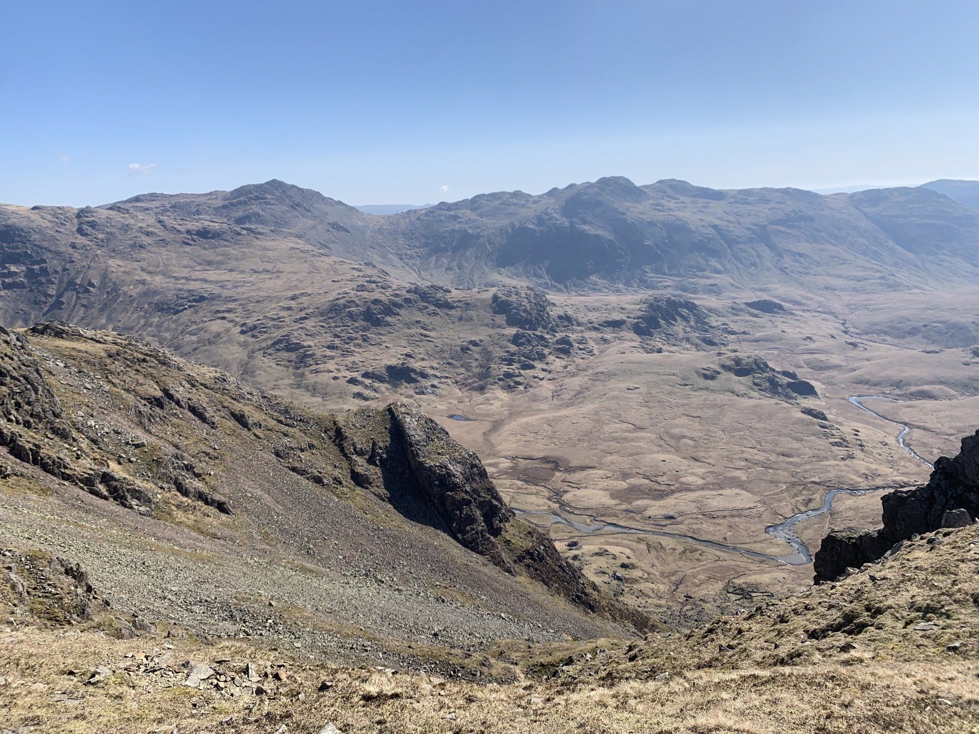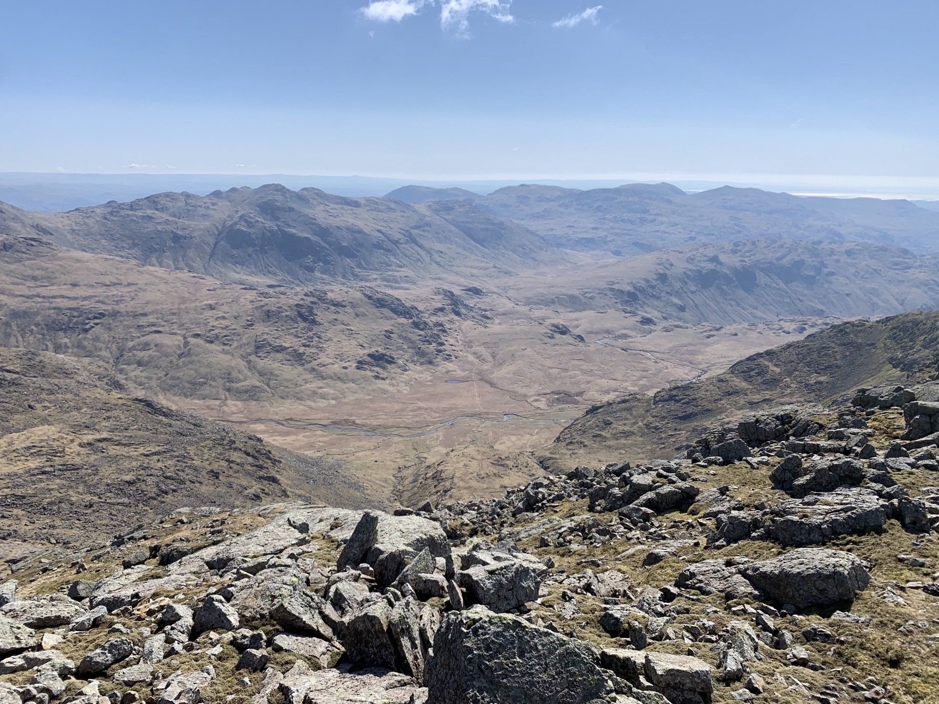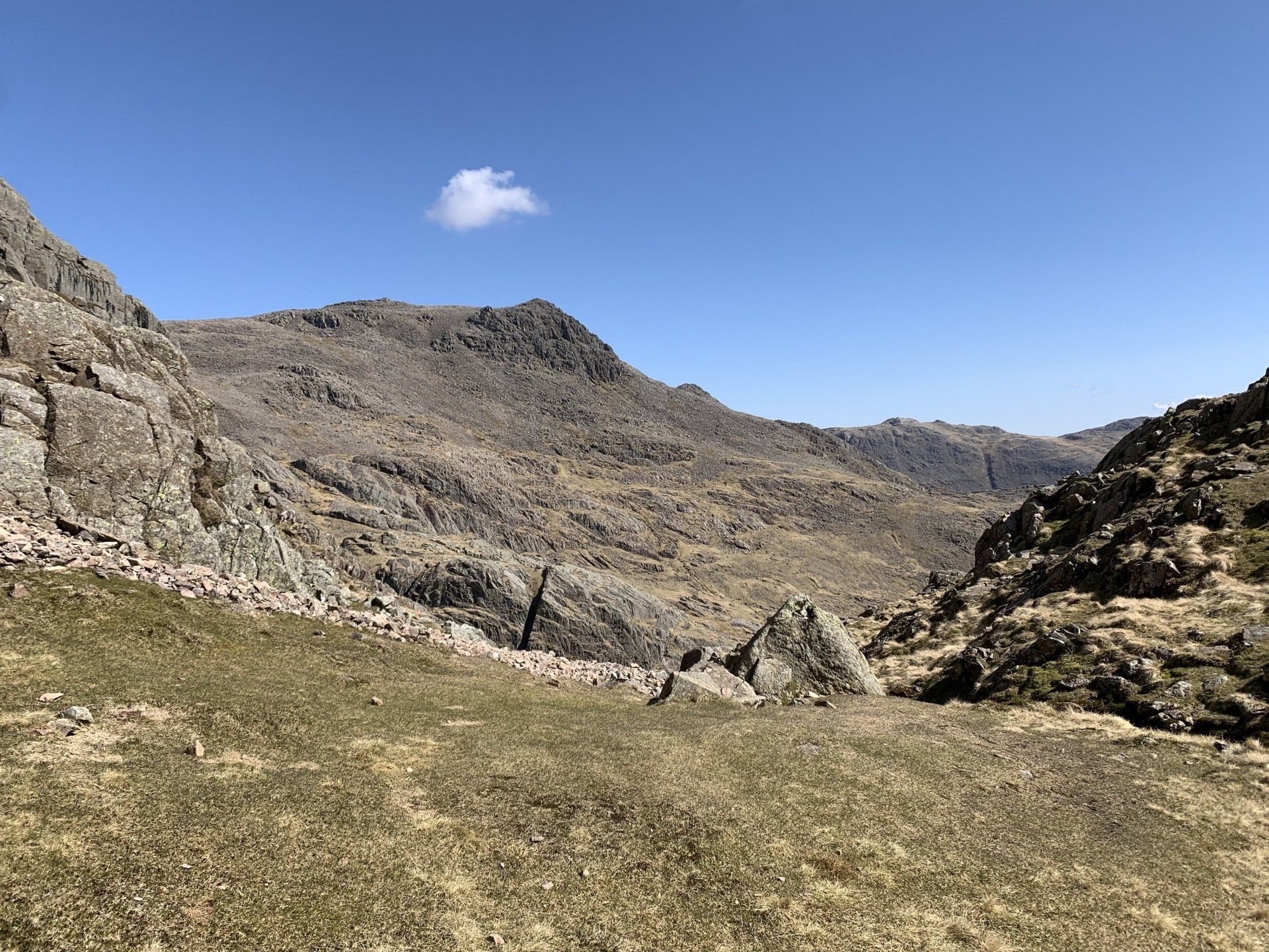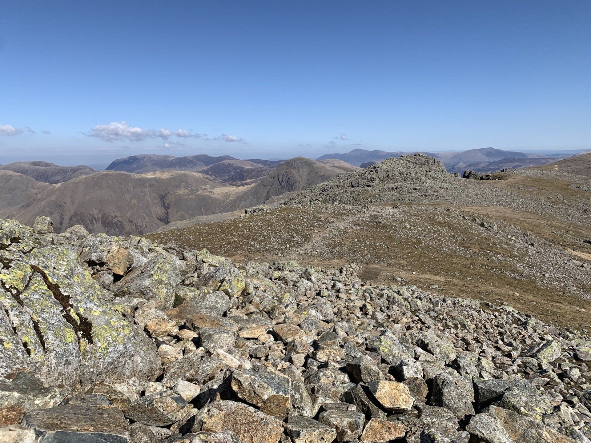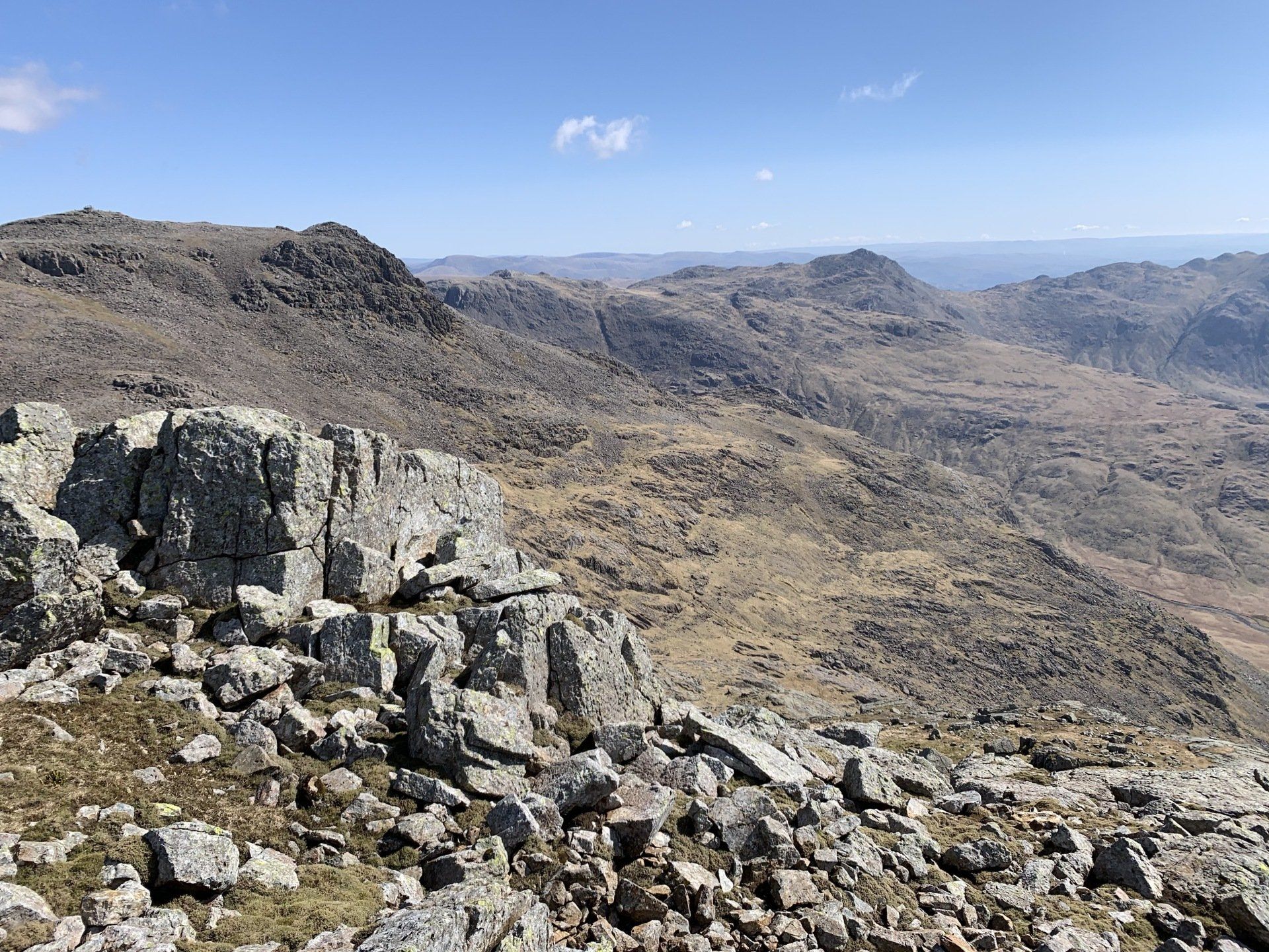 Apr 2021 - Ascent from Wha House. Superb walk in perfect conditions. In contrast to yesterday (weird staring chap in the car park), I met a lovely farmer at the start point. She was genuinely interested in me and easy to speak to. She wouldn't let me have a go on her quad bike though. In fact, on every occasion I've walked from here or up the road at Brotherikeld, I've witnessed local farmers out on the fells rounding up the sheep. Fascinating to watch the dogs do their stuff. Today, it was me inadvertently driving a bunch on; a huge flock scampered on ahead of me as I made my way towards Slight Side. Eventually, as things got steeper, they all veered off to the right. I sat and had a snack on the summit of Slight Side, taking in upper Eskdale and the horseshoe of Scafell, the Pike, Ill Crag, Esk Pike, Bowfell and Crinkle Crags, not forgetting retrospective views of Harter Fell, Hard Knott and, above Burnmoor Tarn, Whin Rigg and Illgill Head. By the time I'd reached Scafell, after exploring the wonderful Long Green (why isn't this a Wainwright?), I could see literally every summit in Lakeland. Of course, I was naming them all inwardly. Gable and the western fells were particularly stunning as were the Coniston fells to the south-east. Had the summit to myself whilst I could see dozens of folk milling about on the Pike. Fortunately, I couldn't hear them, despite the complete lack of a breeze. I crossed to a spot overlooking Broad Stand for lunch. After grub, I picked my way down the scree to Foxes Tarn before the wonderful chocked gully that leads steeply down to the path up from Cam Spout. It's a brilliant descent to the upper-valley floor and the Great Moss from here, alongside a series of waterfalls, with some gentle scrambling. I spotted a great wild swim spot for Gemma. After the Sampson's Stones, an erratic collection of massive boulders below Cam Spot Crag, the return is long but wonderful. Eskdale retains such a wild feel. At the conclusion of the walk, I encountered a confrontational chicken. Magnificent day!