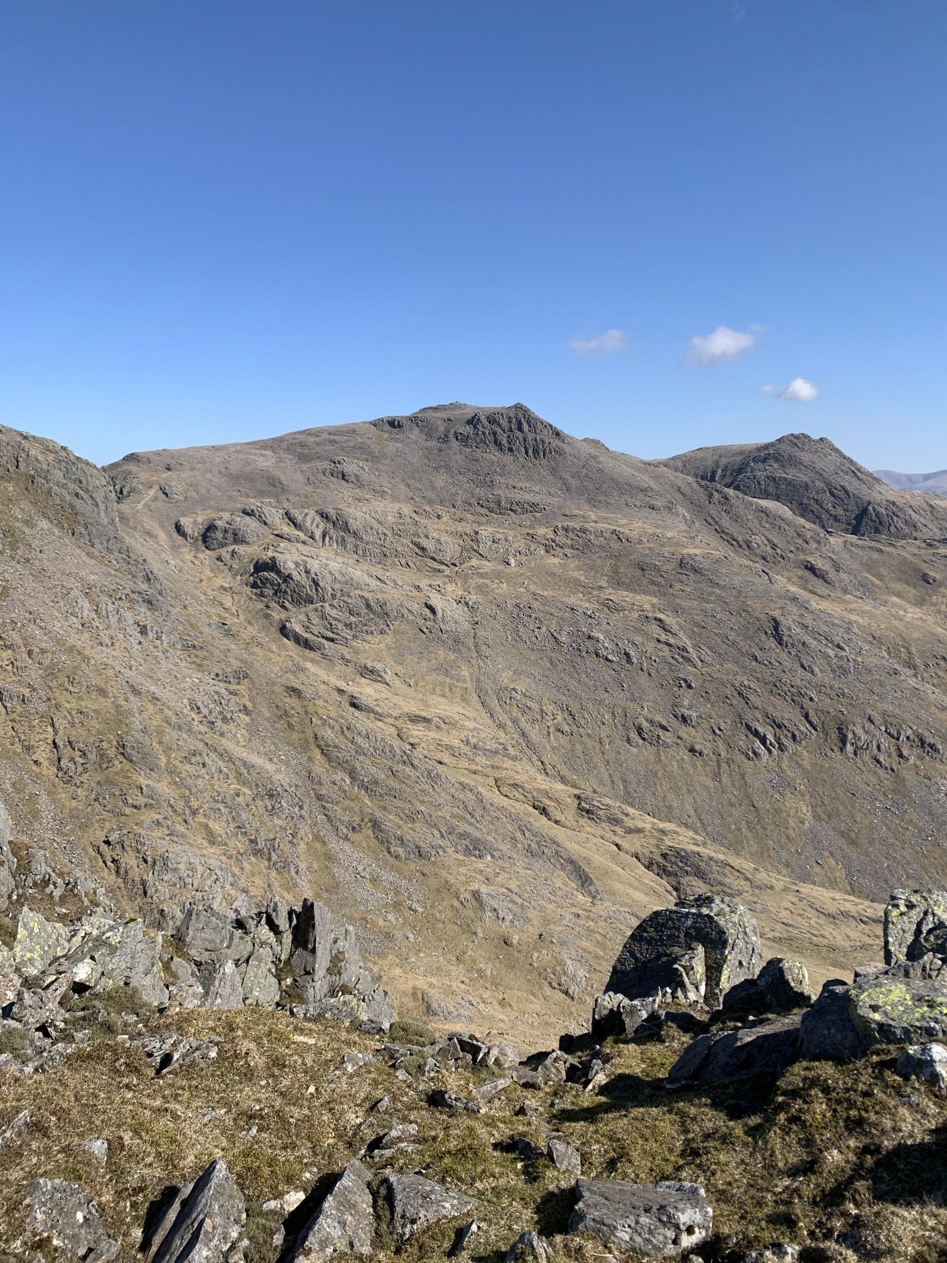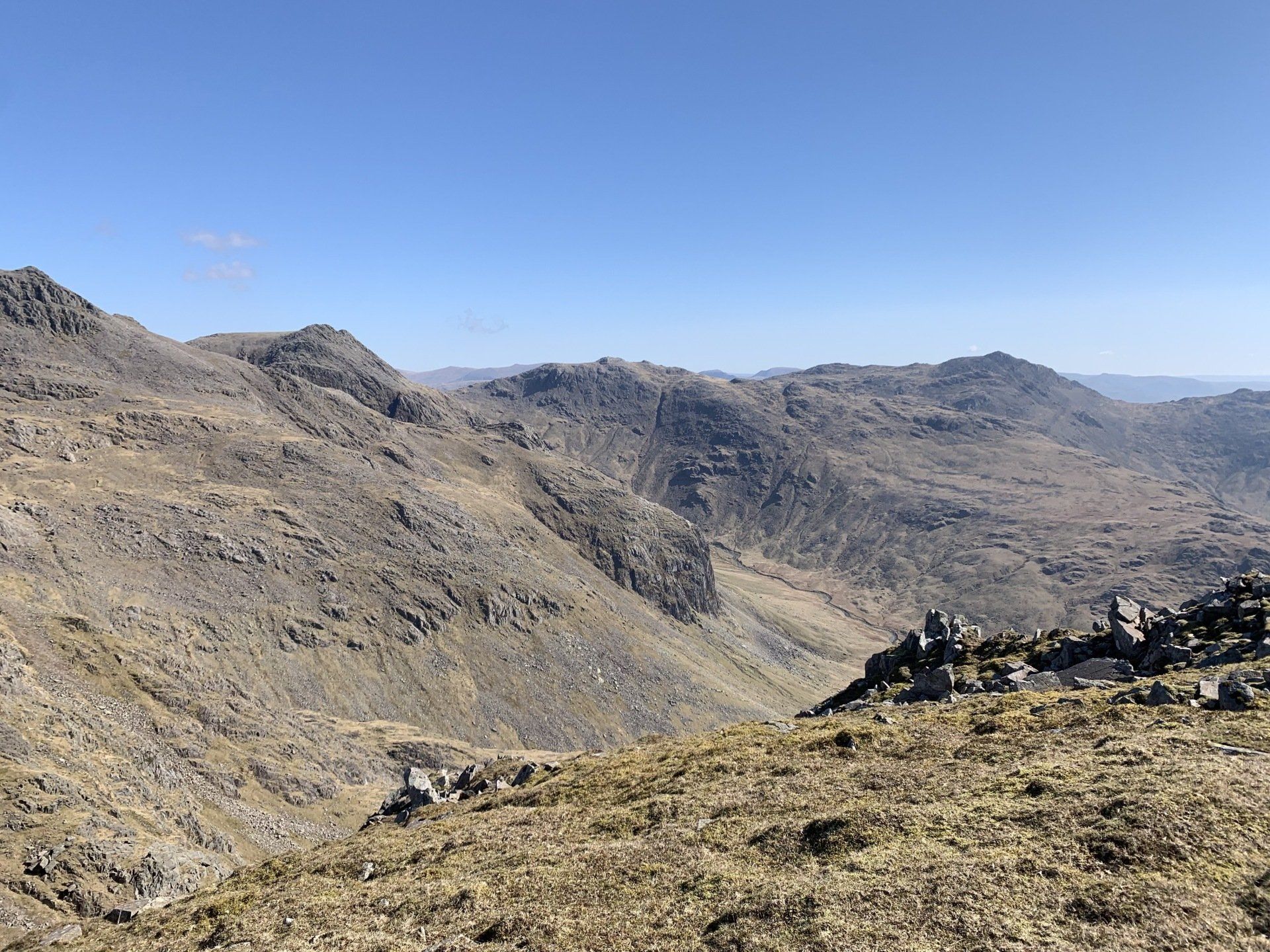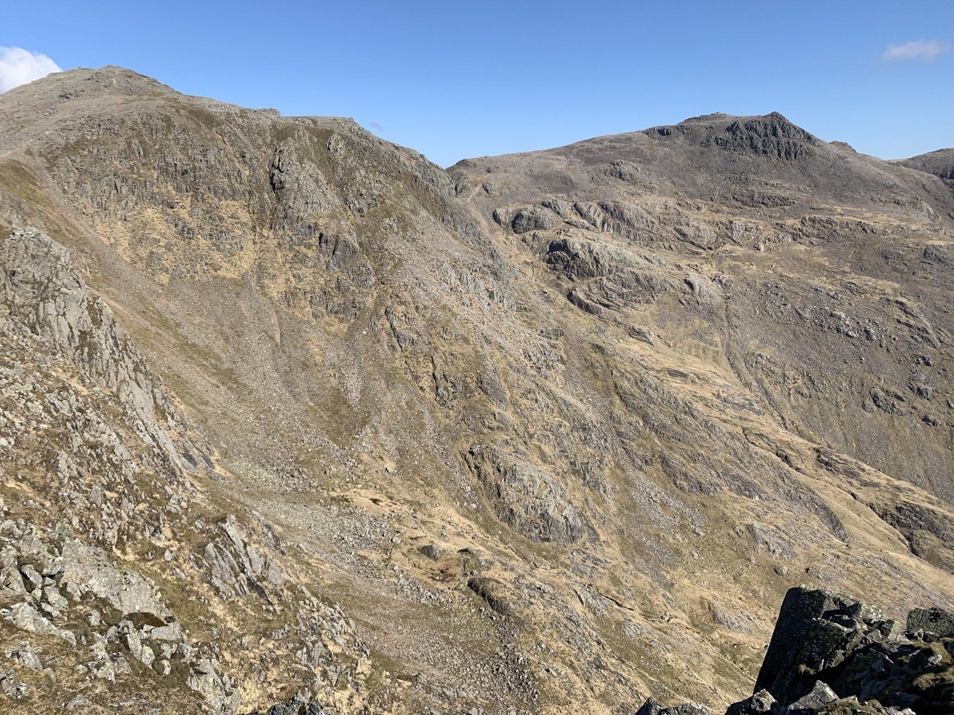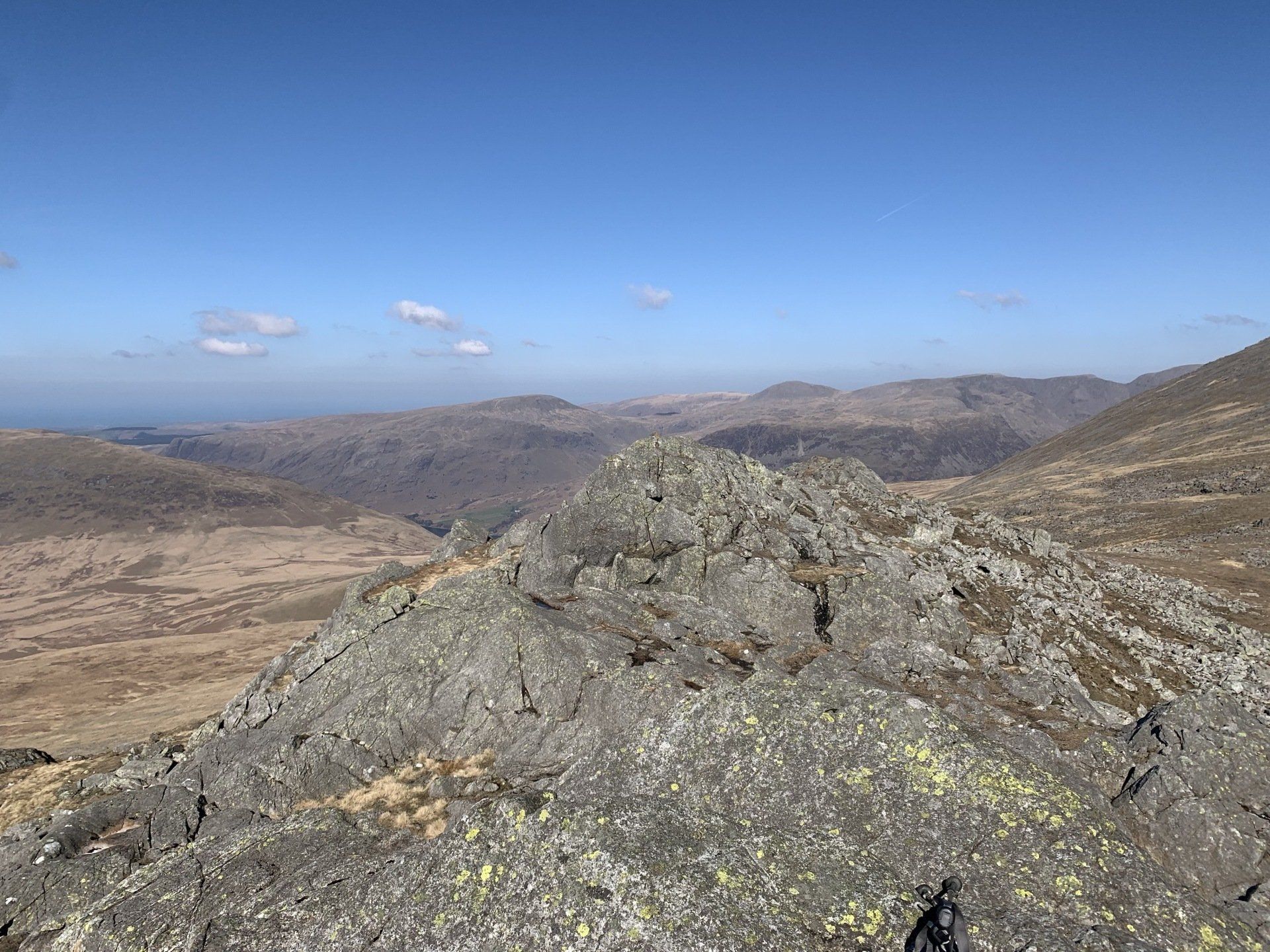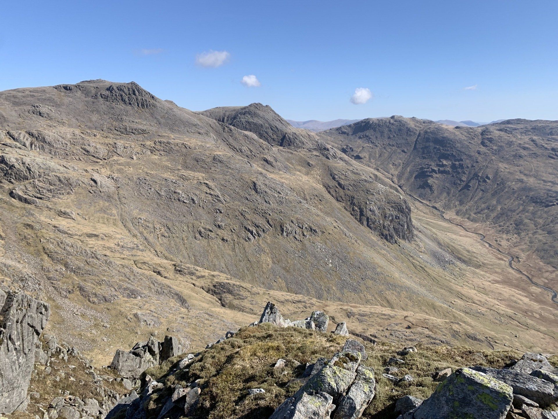 Apr 2021 - Ascent from Wha House. Superb walk in perfect conditions. In contrast to yesterday (weird staring chap in the car park), I met a lovely farmer at the start point. She was genuinely interested in me and easy to speak to. She wouldn't let me have a go on her quad bike though. In fact, on every occasion I've walked from here or up the road at Brotherikeld, I've witnessed local farmers out on the fells rounding up the sheep. Fascinating to watch the dogs do their stuff. Today, it was me inadvertently driving a bunch on; a huge flock scampered on ahead of me as I made my way towards Slight Side. Eventually, as things got steeper, they all veered off to the right. I sat and had a snack on the summit of Slight Side, taking in upper Eskdale and the horseshoe of Scafell, the Pike, Ill Crag, Esk Pike, Bowfell and Crinkle Crags, not forgetting retrospective views of Harter Fell, Hard Knott and, above Burnmoor Tarn, Whin Rigg and Illgill Head. By the time I'd reached Scafell, after exploring the wonderful Long Green (why isn't this a Wainwright?), I could see literally every summit in Lakeland. Of course, I was naming them all inwardly. Gable and the western fells were particularly stunning as were the Coniston fells to the south-east. Had the summit to myself whilst I could see dozens of folk milling about on the Pike. Fortunately, I couldn't hear them, despite the complete lack of a breeze. I crossed to a spot overlooking Broad Stand for lunch. After grub, I picked my way down the scree to Foxes Tarn before the wonderful chocked gully that leads steeply down to the path up from Cam Spout. It's a brilliant descent to the upper-valley floor and the Great Moss from here, alongside a series of waterfalls, with some gentle scrambling. I spotted a great wild swim spot for Gemma. After the Sampson's Stones, an erratic collection of massive boulders below Cam Spot Crag, the return is long but wonderful. Eskdale retains such a wild feel. At the conclusion of the walk, I encountered a confrontational chicken. Magnificent day!