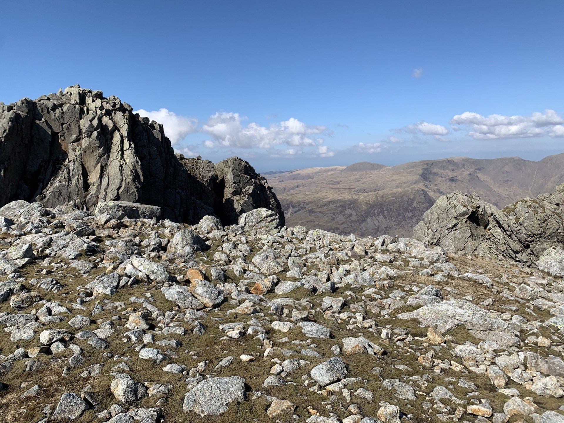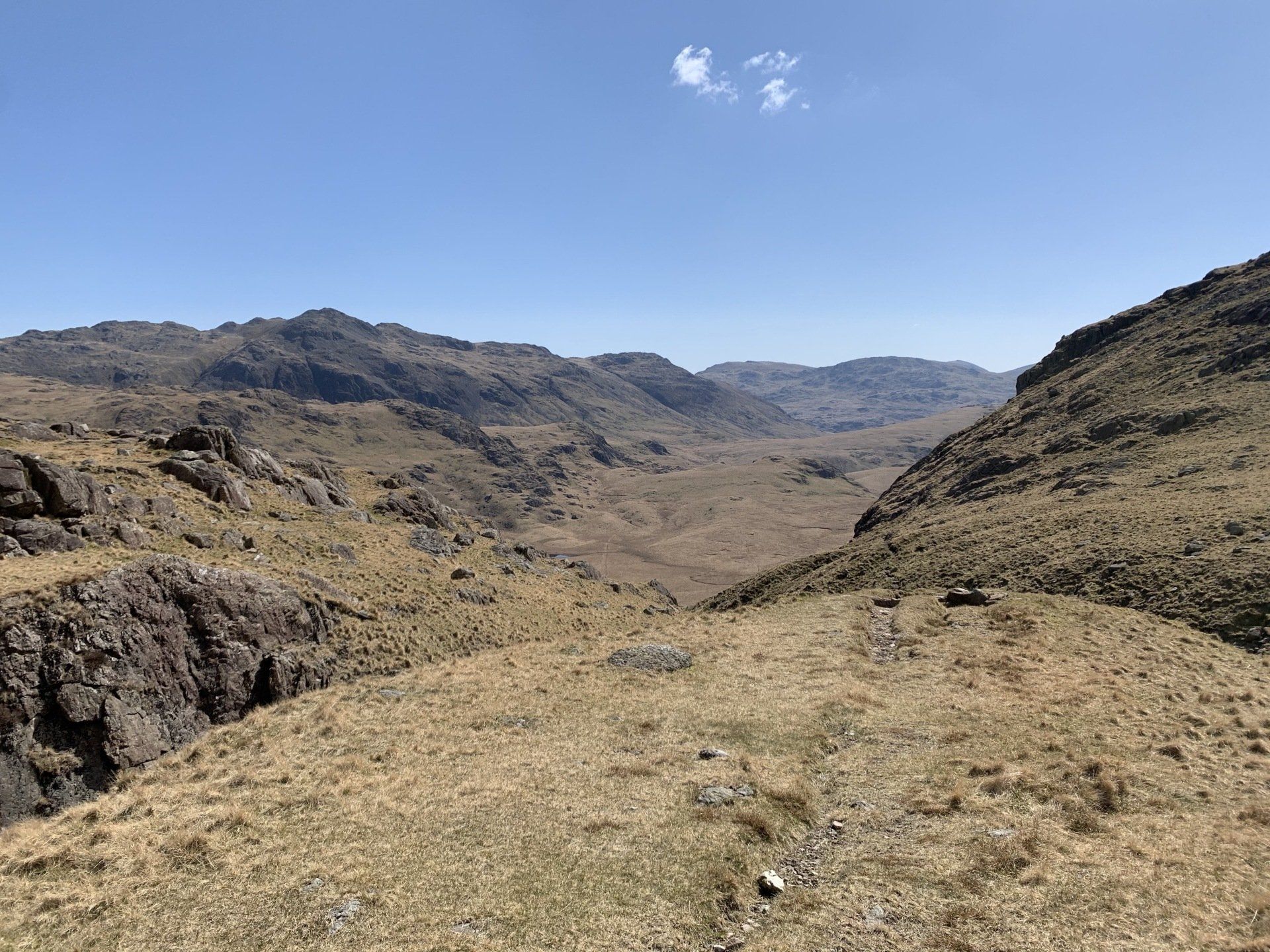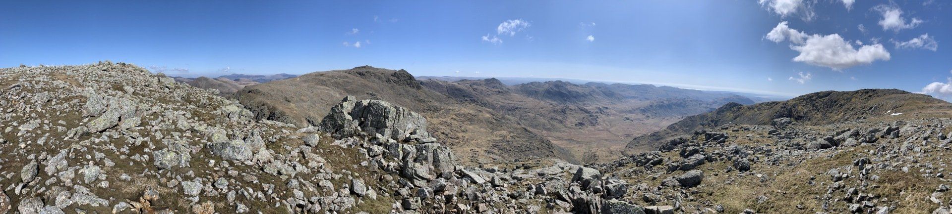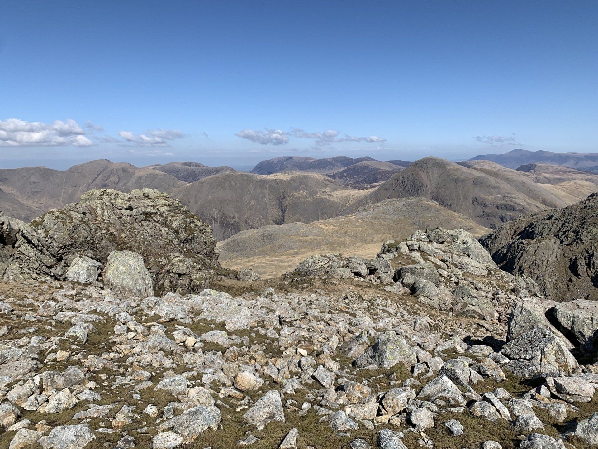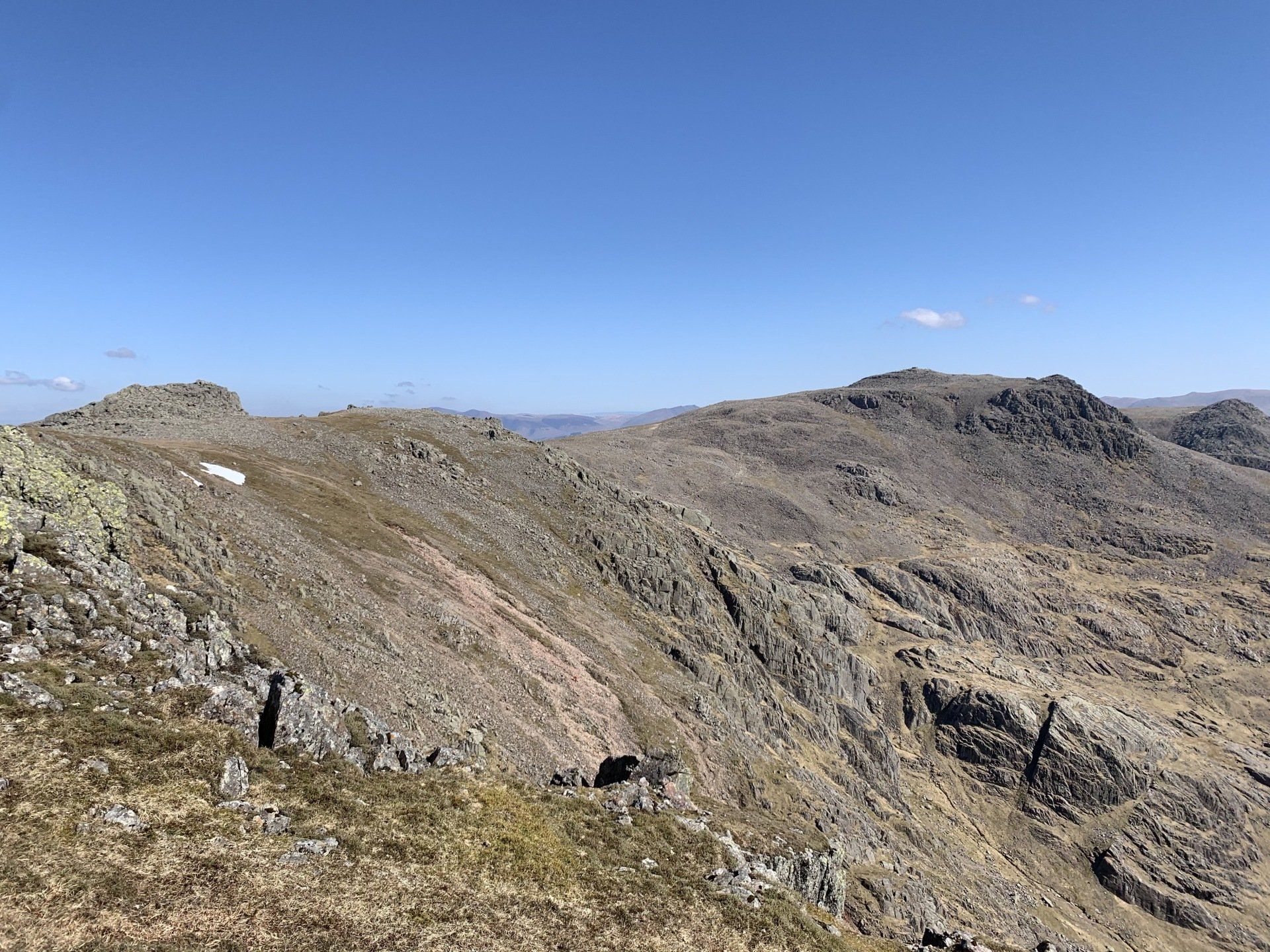 Apr 2021 - Ascent from Wha House. Superb walk in perfect conditions. In contrast to yesterday (weird staring chap in the car park), I met a lovely farmer at the start point. She was genuinely interested in me and easy to speak to. She wouldn't let me have a go on her quad bike though. In fact, on every occasion I've walked from here or up the road at Brotherikeld, I've witnessed local farmers out on the fells rounding up the sheep. Fascinating to watch the dogs do their stuff. Today, it was me inadvertently driving a bunch on; a huge flock scampered on ahead of me as I made my way towards Slight Side. Eventually, as things got steeper, they all veered off to the right. I sat and had a snack on the summit of Slight Side, taking in upper Eskdale and the horseshoe of Scafell, the Pike, Ill Crag, Esk Pike, Bowfell and Crinkle Crags, not forgetting retrospective views of Harter Fell, Hard Knott and, above Burnmoor Tarn, Whin Rigg and Illgill Head. By the time I'd reached Scafell, after exploring the wonderful Long Green (why isn't this a Wainwright?), I could see literally every summit in Lakeland. Of course, I was naming them all inwardly. Gable and the western fells were particularly stunning as were the Coniston fells to the south-east. Had the summit to myself whilst I could see dozens of folk milling about on the Pike. Fortunately, I couldn't hear them, despite the complete lack of a breeze. I crossed to a spot overlooking Broad Stand for lunch. After grub, I picked my way down the scree to Foxes Tarn before the wonderful chocked gully that leads steeply down to the path up from Cam Spout. It's a brilliant descent to the upper-valley floor and the Great Moss from here, alongside a series of waterfalls, with some gentle scrambling. I spotted a great wild swim spot for Gemma. After the Sampson's Stones, an erratic collection of massive boulders below Cam Spot Crag, the return is long but wonderful. Eskdale retains such a wild feel. At the conclusion of the walk, I encountered a confrontational chicken. Magnificent day!