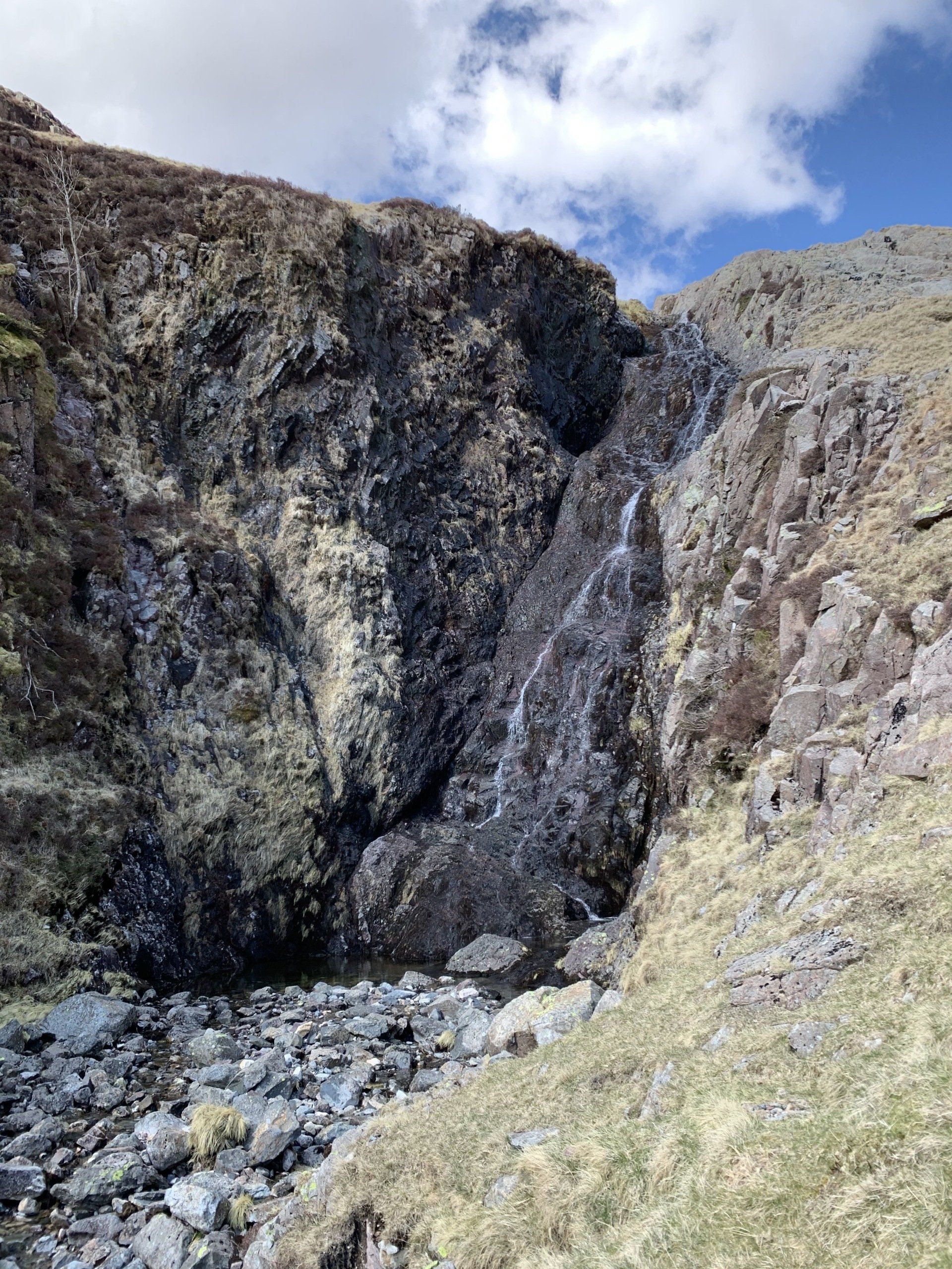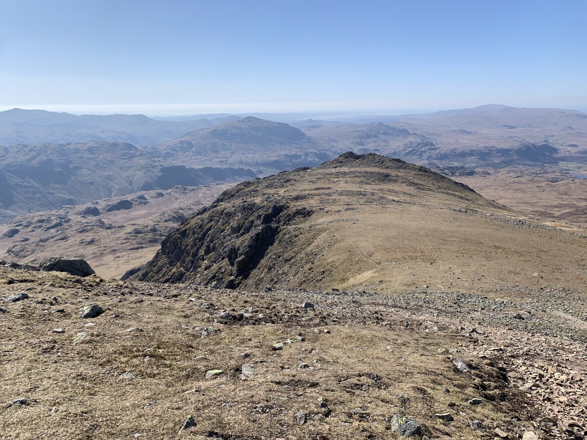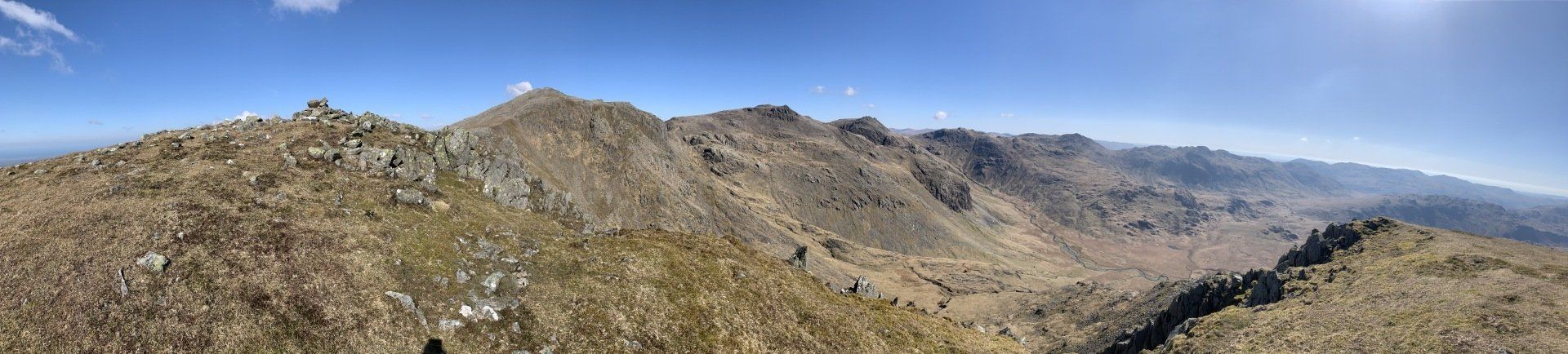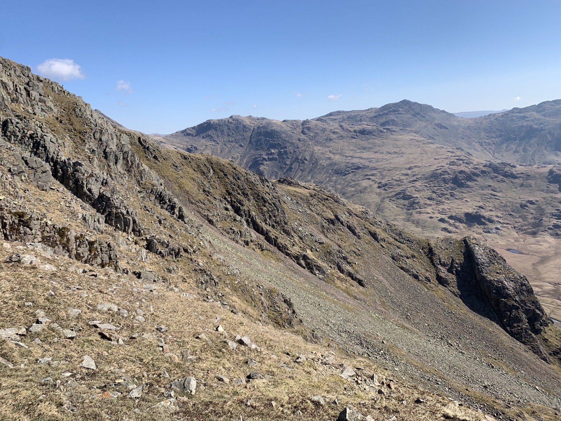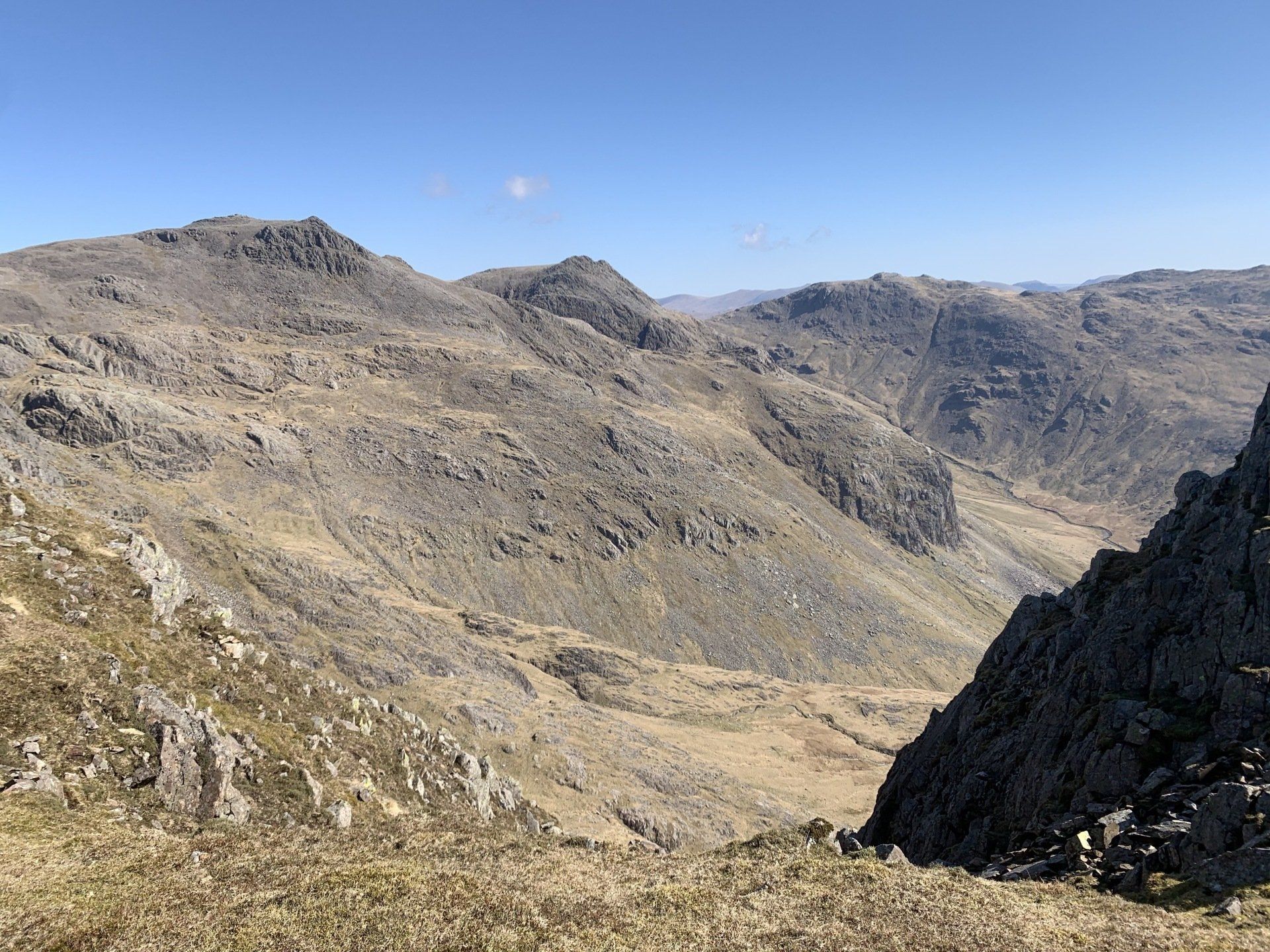 Apr 2021 - Ascent from Wha House. Superb walk in perfect conditions. In contrast to yesterday (weird staring chap in the car park), I met a lovely farmer at the start point. She was genuinely interested in me and easy to speak to. She wouldn't let me have a go on her quad bike though. In fact, on every occasion I've walked from here or up the road at Brotherikeld, I've witnessed local farmers out on the fells rounding up the sheep. Fascinating to watch the dogs do their stuff. Today, it was me inadvertently driving a bunch on; a huge flock scampered on ahead of me as I made my way towards Slight Side. Eventually, as things got steeper, they all veered off to the right. I sat and had a snack on the summit of Slight Side, taking in upper Eskdale and the horseshoe of Scafell, the Pike, Ill Crag, Esk Pike, Bowfell and Crinkle Crags, not forgetting retrospective views of Harter Fell, Hard Knott and, above Burnmoor Tarn, Whin Rigg and Illgill Head. By the time I'd reached Scafell, after exploring the wonderful Long Green (why isn't this a Wainwright?), I could see literally every summit in Lakeland. Of course, I was naming them all inwardly. Gable and the western fells were particularly stunning as were the Coniston fells to the south-east. Had the summit to myself whilst I could see dozens of folk milling about on the Pike. Fortunately, I couldn't hear them, despite the complete lack of a breeze. I crossed to a spot overlooking Broad Stand for lunch. After grub, I picked my way down the scree to Foxes Tarn before the wonderful chocked gully that leads steeply down to the path up from Cam Spout. It's a brilliant descent to the upper-valley floor and the Great Moss from here, alongside a series of waterfalls, with some gentle scrambling. I spotted a great wild swim spot for Gemma. After the Sampson's Stones, an erratic collection of massive boulders below Cam Spot Crag, the return is long but wonderful. Eskdale retains such a wild feel. At the conclusion of the walk, I encountered a confrontational chicken. Magnificent day!