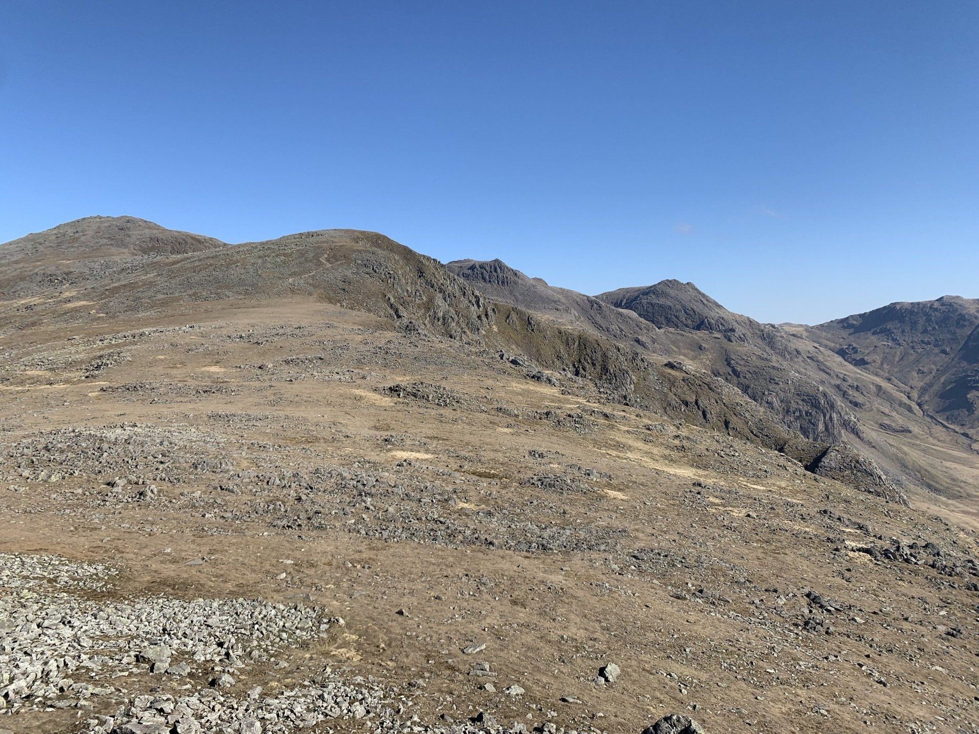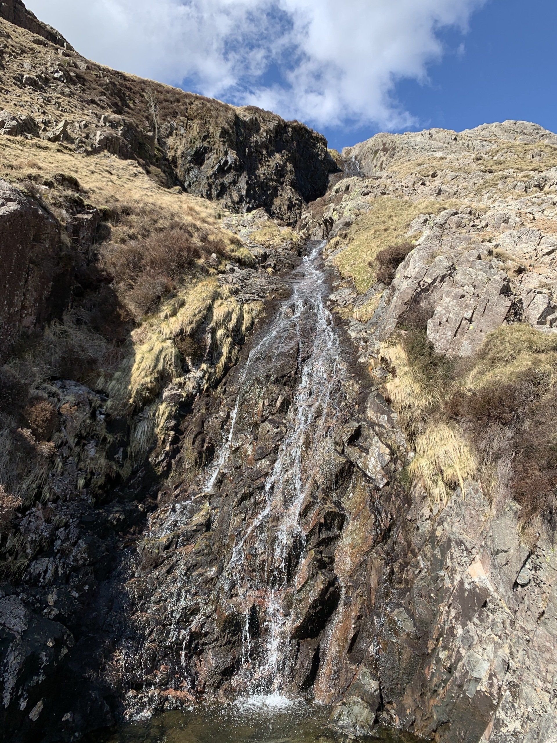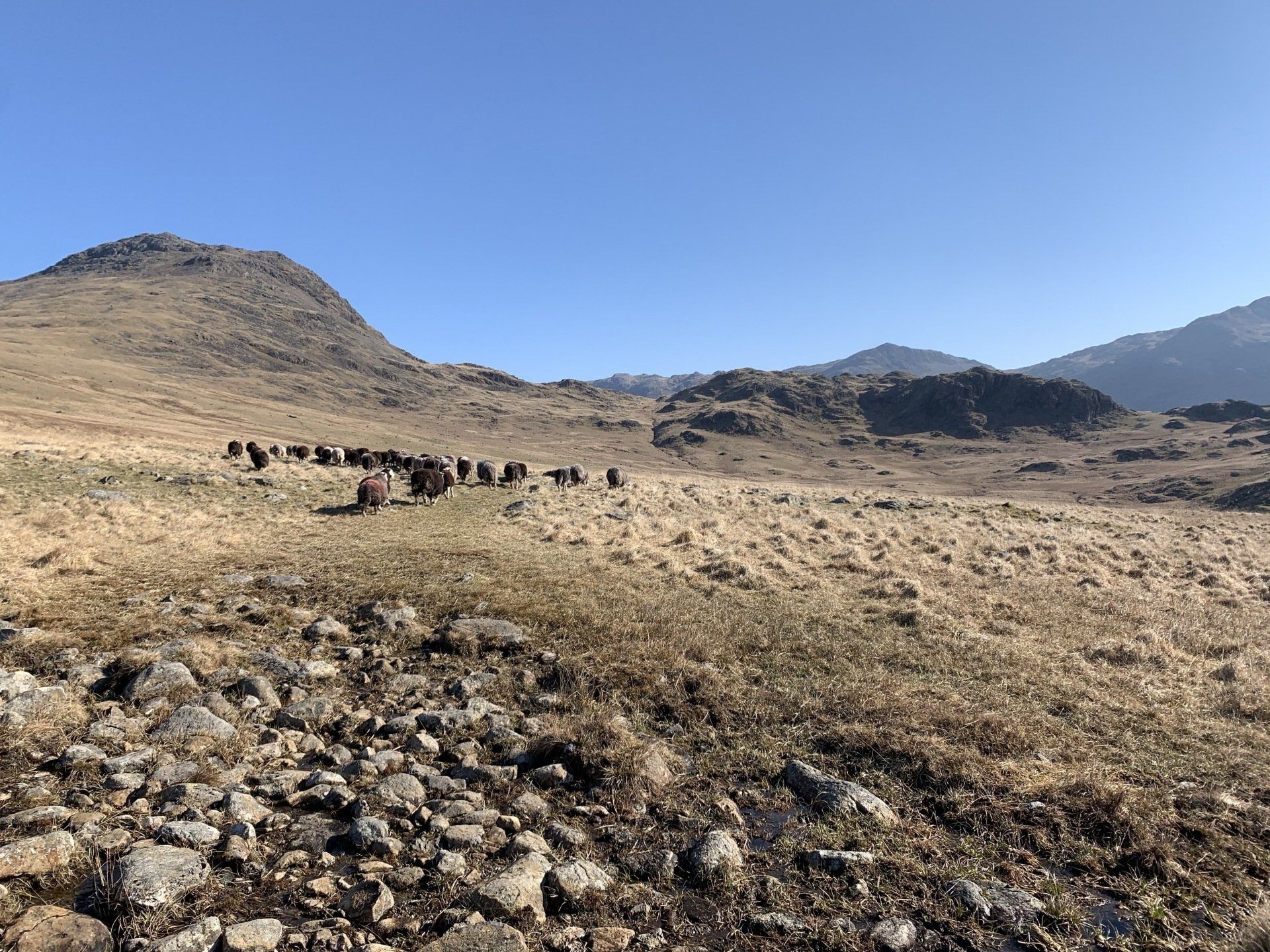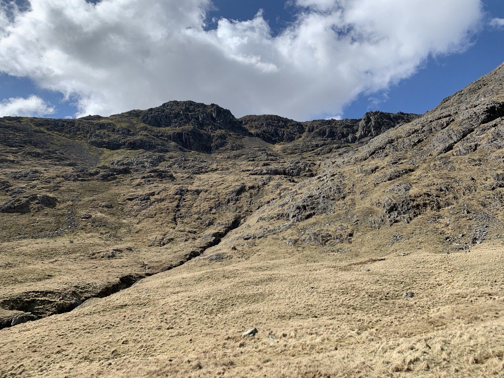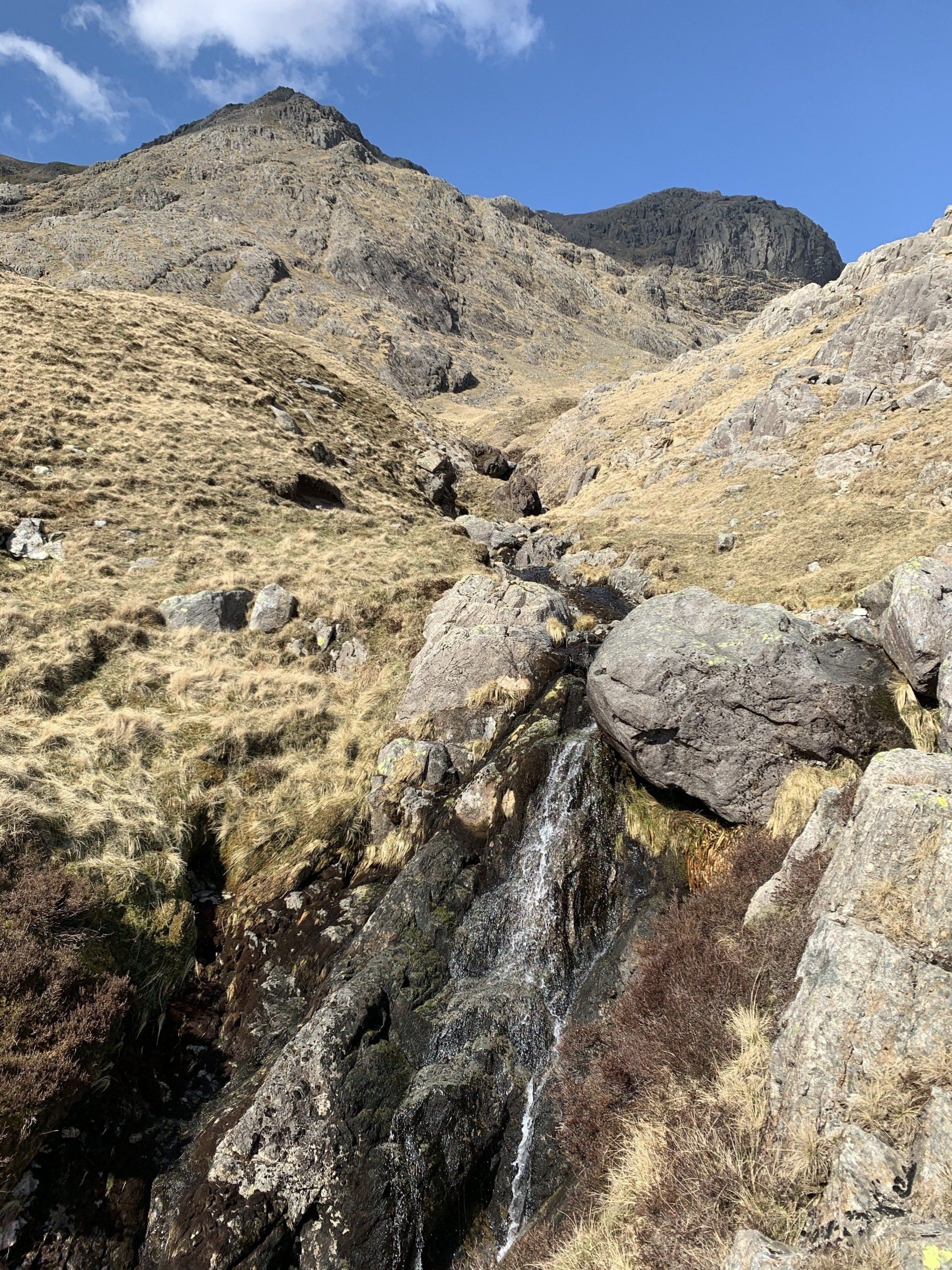 Apr 2021 - Ascent from Wha House. Superb walk in perfect conditions. In contrast to yesterday (weird staring chap in the car park), I met a lovely farmer at the start point. She was genuinely interested in me and easy to speak to. She wouldn't let me have a go on her quad bike though. In fact, on every occasion I've walked from here or up the road at Brotherikeld, I've witnessed local farmers out on the fells rounding up the sheep. Fascinating to watch the dogs do their stuff. Today, it was me inadvertently driving a bunch on; a huge flock scampered on ahead of me as I made my way towards Slight Side. Eventually, as things got steeper, they all veered off to the right. I sat and had a snack on the summit of Slight Side, taking in upper Eskdale and the horseshoe of Scafell, the Pike, Ill Crag, Esk Pike, Bowfell and Crinkle Crags, not forgetting retrospective views of Harter Fell, Hard Knott and, above Burnmoor Tarn, Whin Rigg and Illgill Head. By the time I'd reached Scafell, after exploring the wonderful Long Green (why isn't this a Wainwright?), I could see literally every summit in Lakeland. Of course, I was naming them all inwardly. Gable and the western fells were particularly stunning as were the Coniston fells to the south-east. Had the summit to myself whilst I could see dozens of folk milling about on the Pike. Fortunately, I couldn't hear them, despite the complete lack of a breeze. I crossed to a spot overlooking Broad Stand for lunch. After grub, I picked my way down the scree to Foxes Tarn before the wonderful chocked gully that leads steeply down to the path up from Cam Spout. It's a brilliant descent to the upper-valley floor and the Great Moss from here, alongside a series of waterfalls, with some gentle scrambling. I spotted a great wild swim spot for Gemma. After the Sampson's Stones, an erratic collection of massive boulders below Cam Spot Crag, the return is long but wonderful. Eskdale retains such a wild feel. At the conclusion of the walk, I encountered a confrontational chicken. Magnificent day!