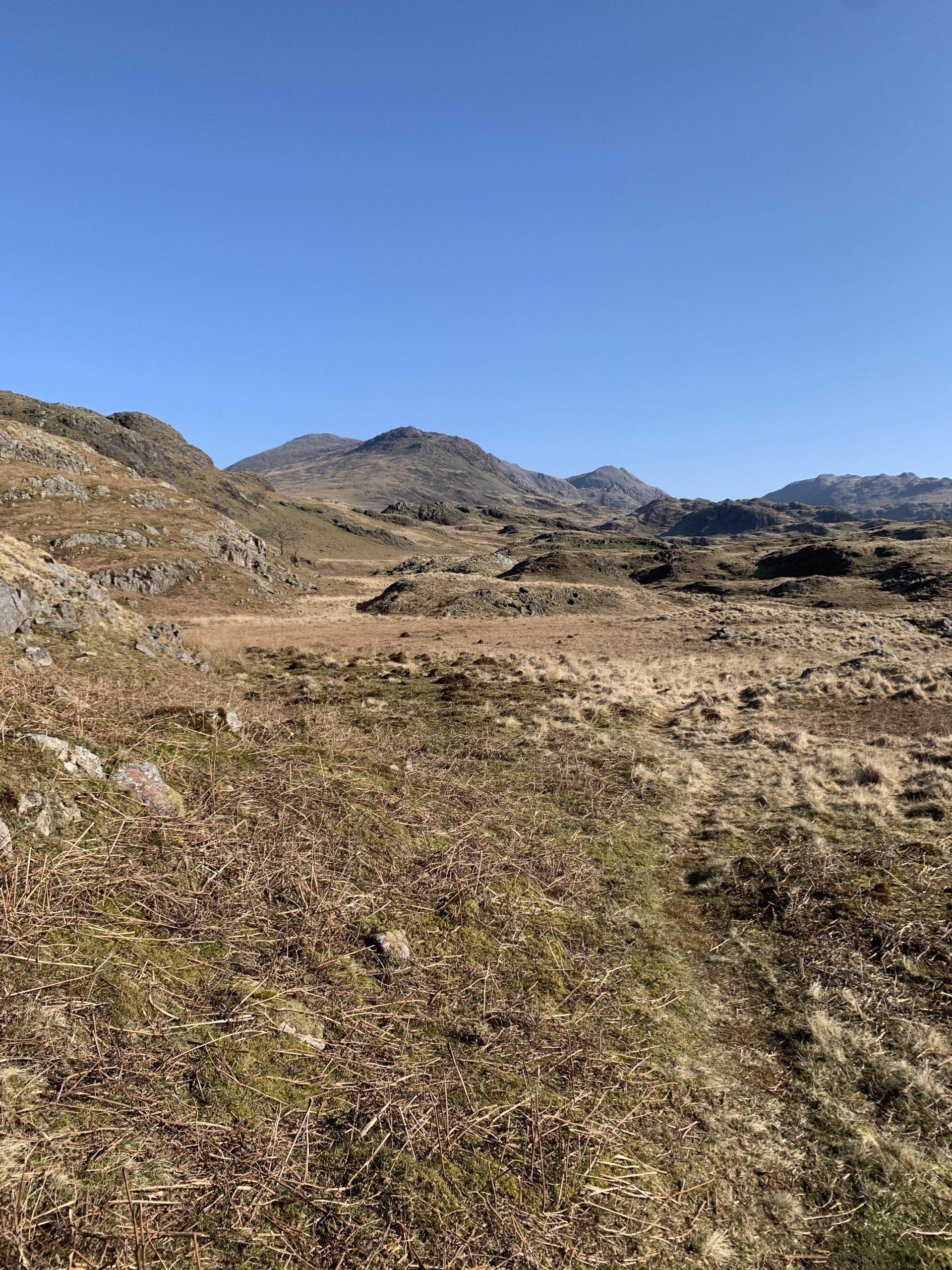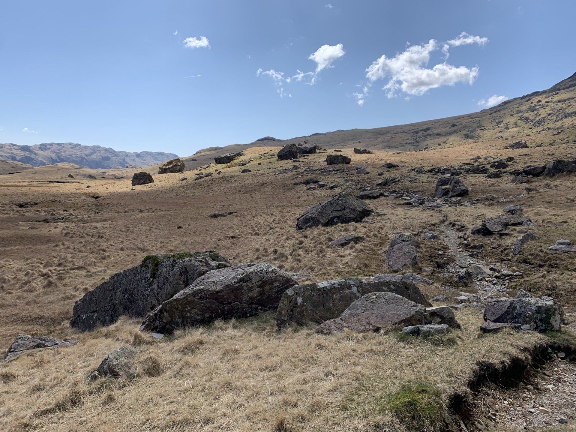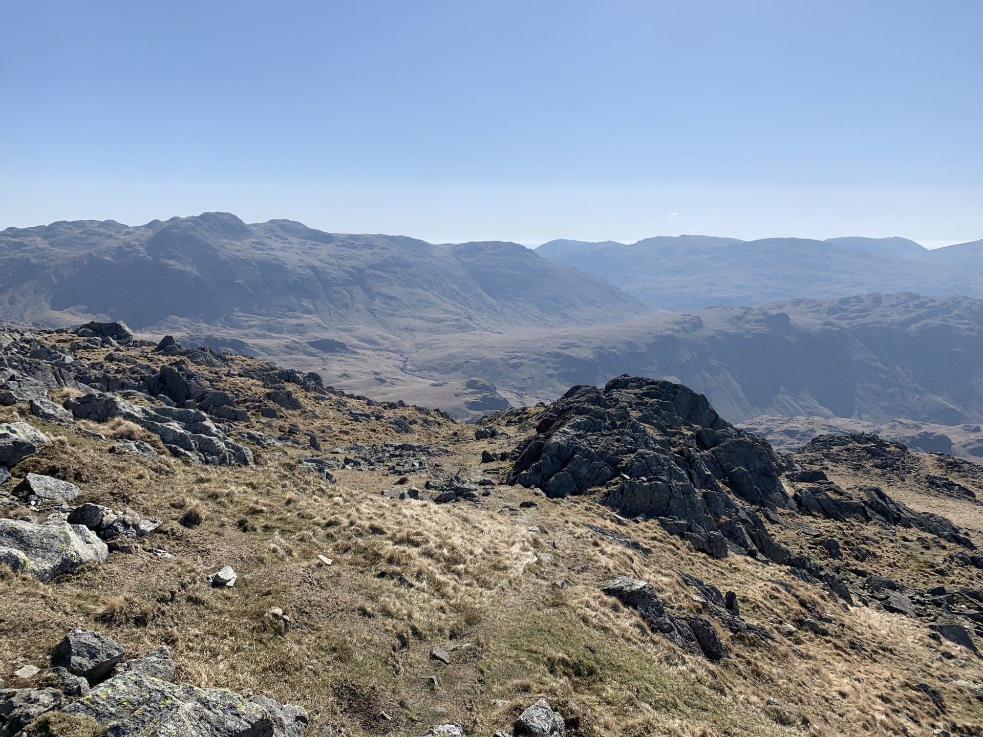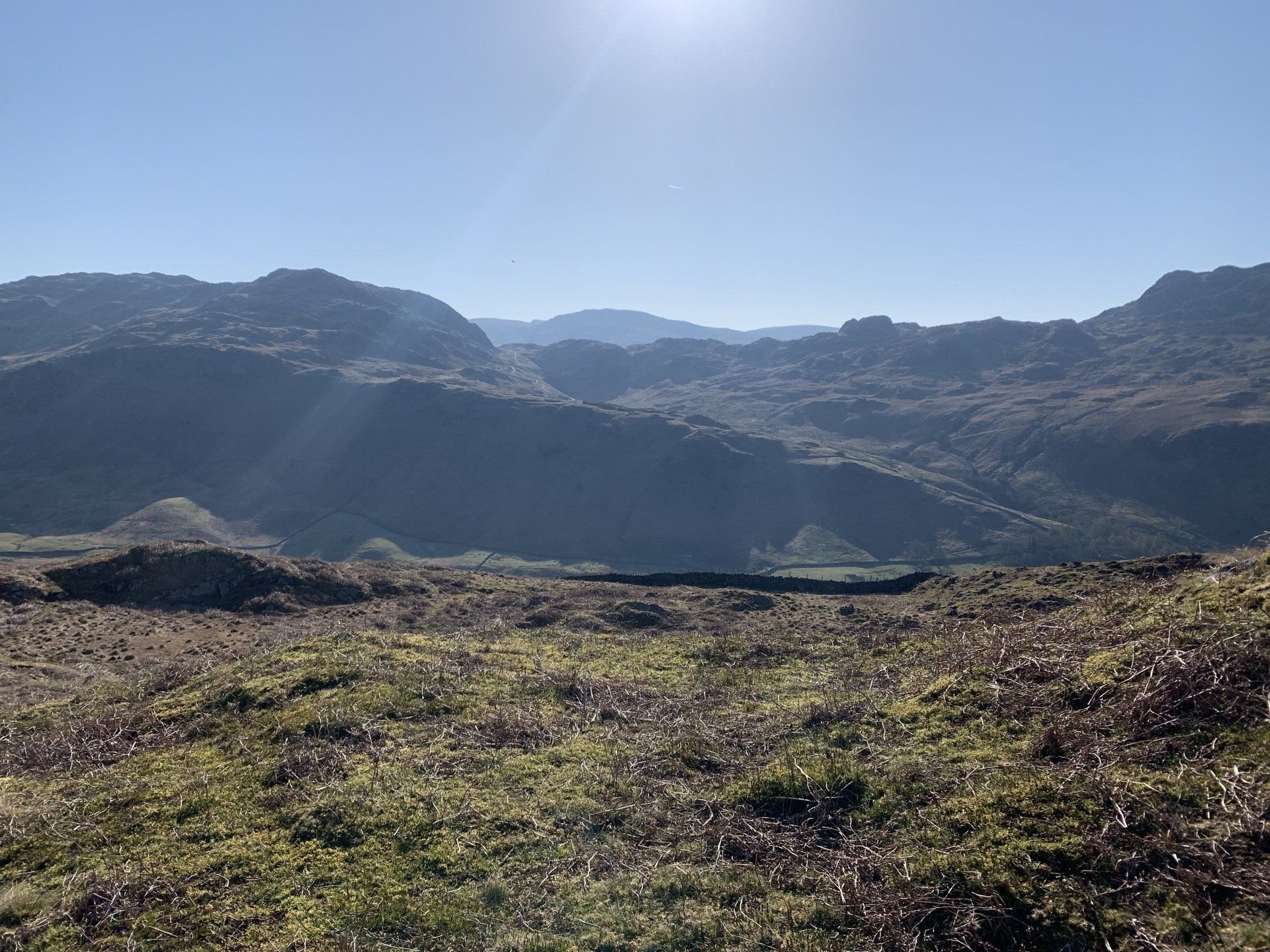 Apr 2021 - Ascent from Wha House. Superb walk in perfect conditions. In contrast to yesterday (weird staring chap in the car park), I met a lovely farmer at the start point. She was genuinely interested in me and easy to speak to. She wouldn't let me have a go on her quad bike though. In fact, on every occasion I've walked from here or up the road at Brotherikeld, I've witnessed local farmers out on the fells rounding up the sheep. Fascinating to watch the dogs do their stuff. Today, it was me inadvertently driving a bunch on; a huge flock scampered on ahead of me as I made my way towards Slight Side. Eventually, as things got steeper, they all veered off to the right. I sat and had a snack on the summit of Slight Side, taking in upper Eskdale and the horseshoe of Scafell, the Pike, Ill Crag, Esk Pike, Bowfell and Crinkle Crags, not forgetting retrospective views of Harter Fell, Hard Knott and, above Burnmoor Tarn, Whin Rigg and Illgill Head. By the time I'd reached Scafell, after exploring the wonderful Long Green (why isn't this a Wainwright?), I could see literally every summit in Lakeland. Of course, I was naming them all inwardly. Gable and the western fells were particularly stunning as were the Coniston fells to the south-east. Had the summit to myself whilst I could see dozens of folk milling about on the Pike. Fortunately, I couldn't hear them, despite the complete lack of a breeze. I crossed to a spot overlooking Broad Stand for lunch. After grub, I picked my way down the scree to Foxes Tarn before the wonderful chocked gully that leads steeply down to the path up from Cam Spout. It's a brilliant descent to the upper-valley floor and the Great Moss from here, alongside a series of waterfalls, with some gentle scrambling. I spotted a great wild swim spot for Gemma. After the Sampson's Stones, an erratic collection of massive boulders below Cam Spot Crag, the return is long but wonderful. Eskdale retains such a wild feel. At the conclusion of the walk, I encountered a confrontational chicken. Magnificent day!