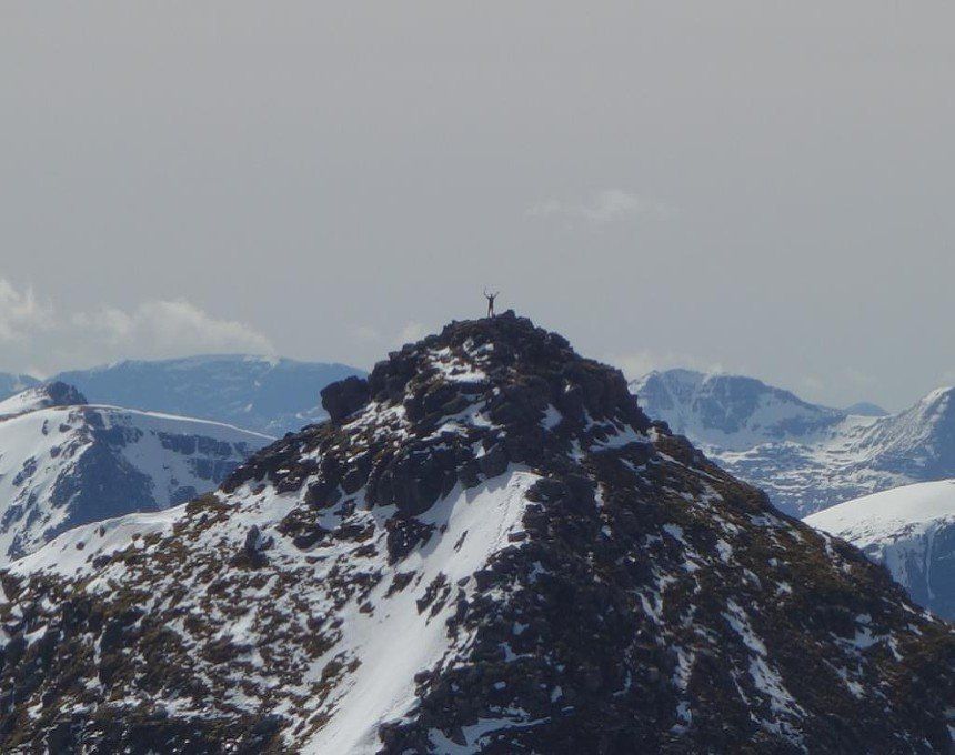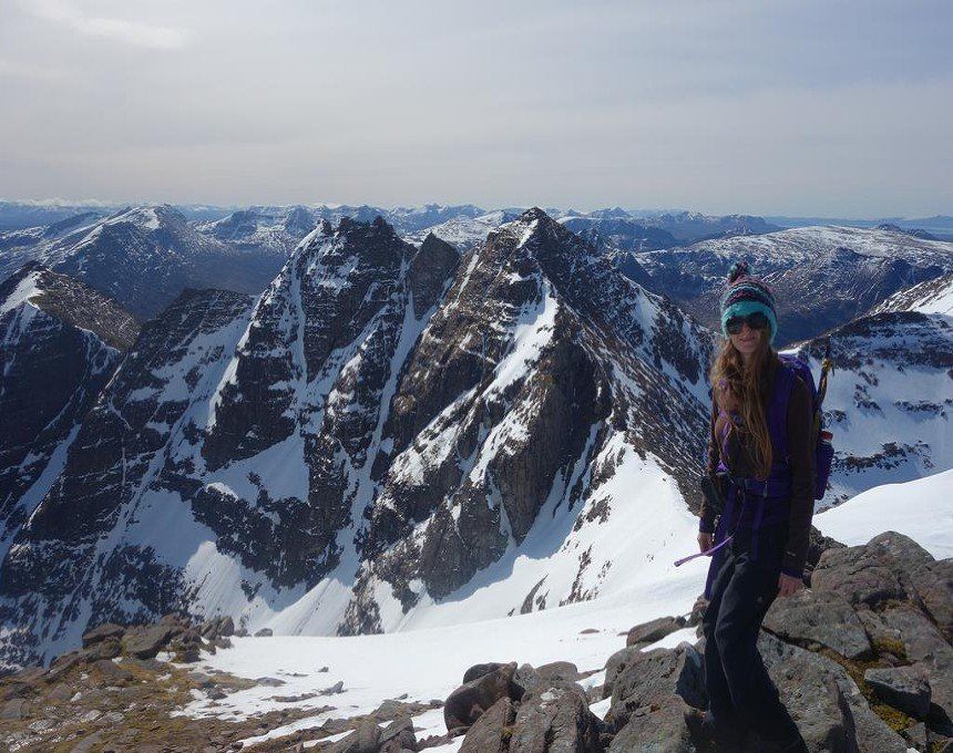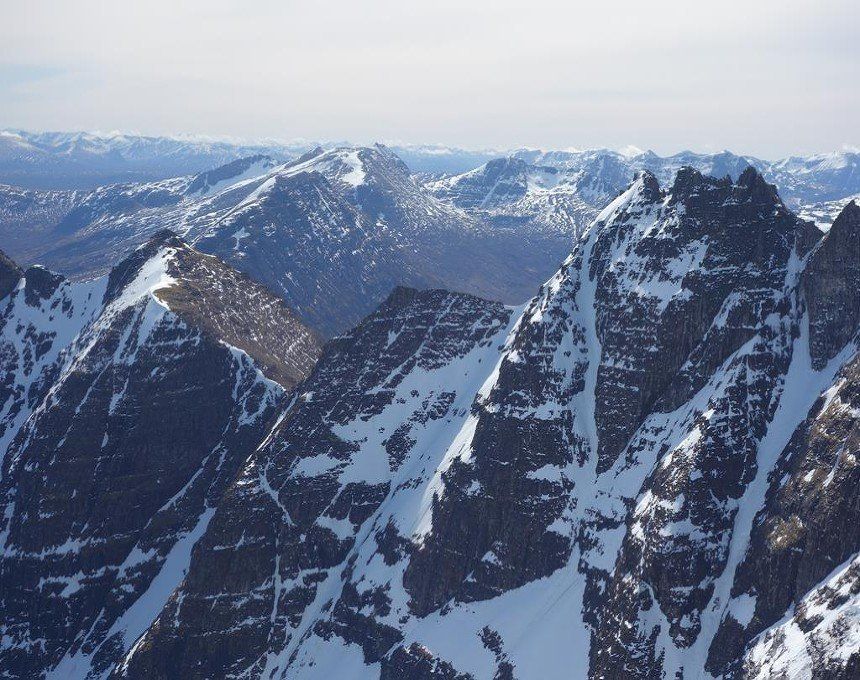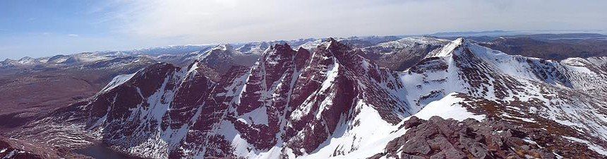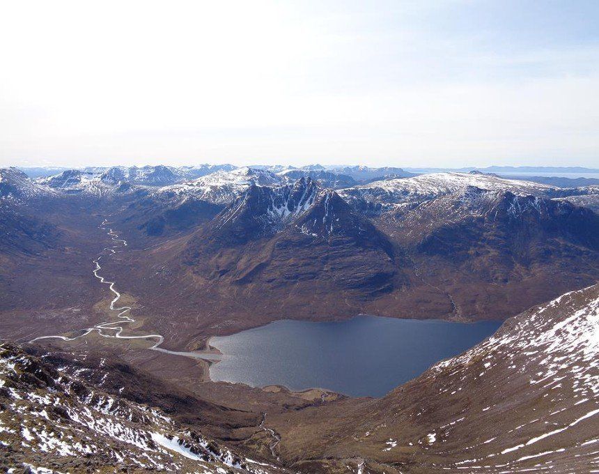 April 2015 - (with Gemma) Ascent from Dundonnell. Mountain walking doesn't get any better. Wonderful drive around to the start point followed by an epic mountain day. We ascended from Dundonnell to the ridge of Meall Garbh and then on through Coir a Mhuillinn towards Sron a Choire. There was evidence of a huge recent avalanche to our right as the valley narrowed. Here, we decided to ascend steeply through safer snowfields and get onto the ridge early and take in the extra summit of Glas Mheall Mor. Once on the ridge, the views just got better and better. After returning to the beallach, it was a steep ascent through loose boulders and scree to the summit of Bidein a Ghlas Thuill. This is one of the finest viewpoints I've ever seen in the British Isles: Sgurr Fiona and the An Teallach pinnacles as a backdrop to the yawning gulf of Coire Toll an Lochain. We spent some time here drinking in the panoramas: Distant snowy peaks to the north, east and south, the Summer Isles to the west. Simply stunning. I went on to Sgurr Fiona which provided an excellent scramble to the summit where I got a view of the exposed ridge ahead, one we'll return to one summer. Gemma didn't fancy the down and up and waited on the summit of Bidein a Ghlas Thuill, where we met up again after about 45 minutes. We descended a short way back to the beallach and had lunch, before some snow running down to Sron a Choire, great fun. Achy legs on the long descent and plenty of chat about where this climb rates...we both agreed, very highly.