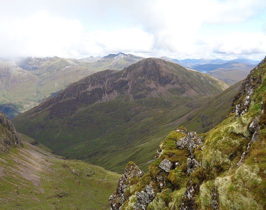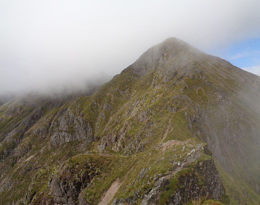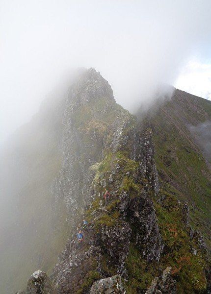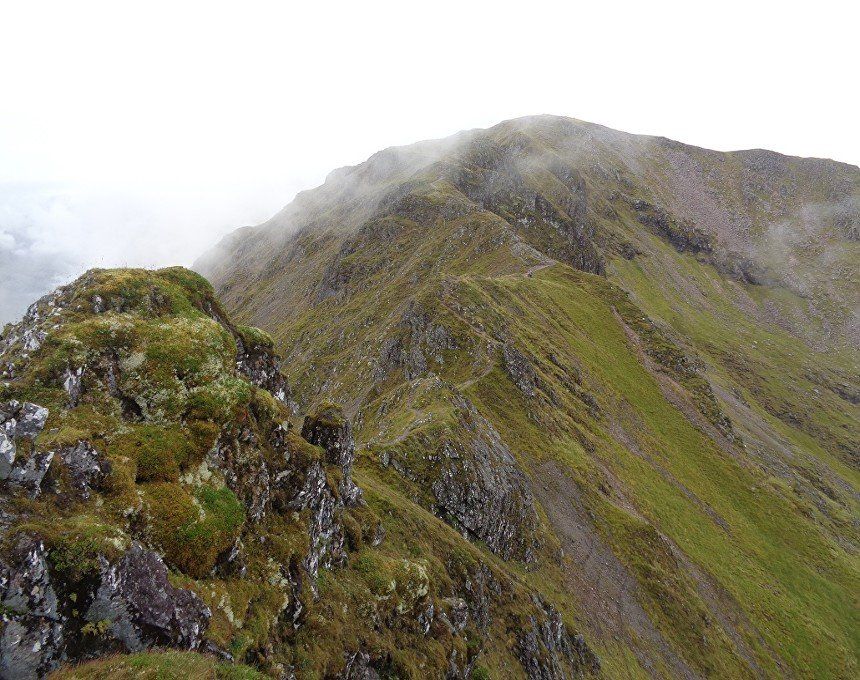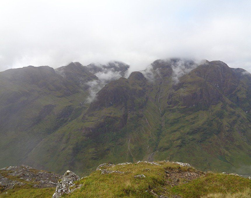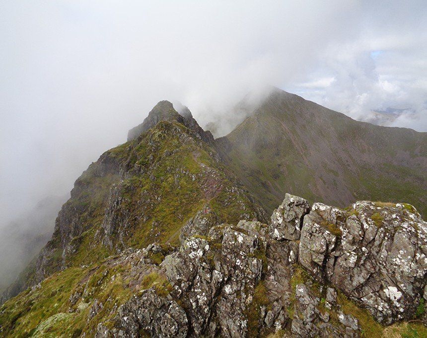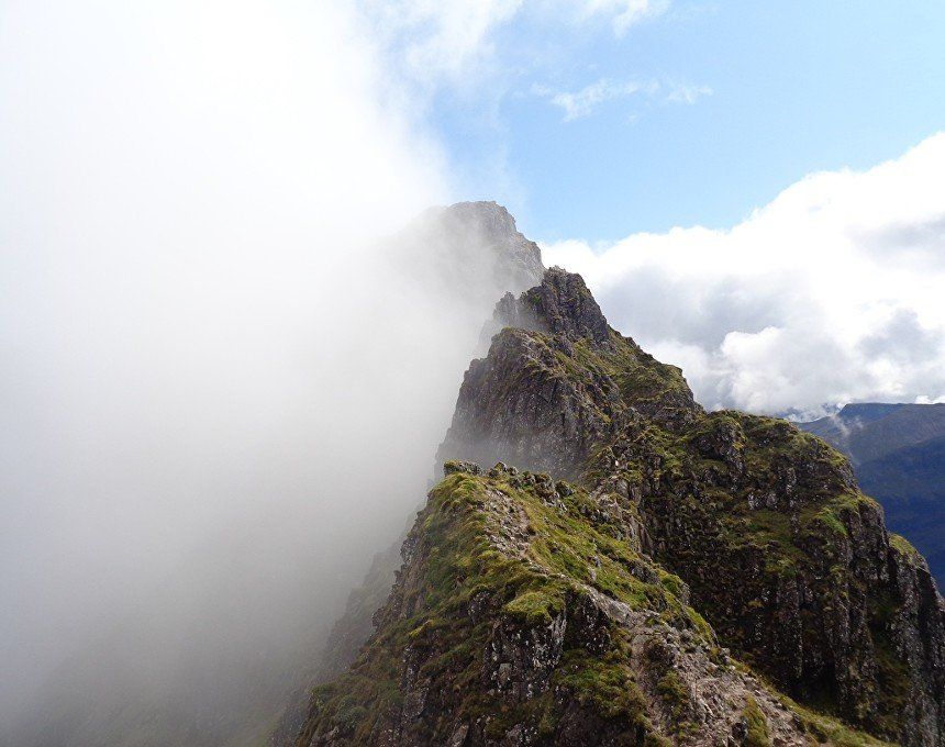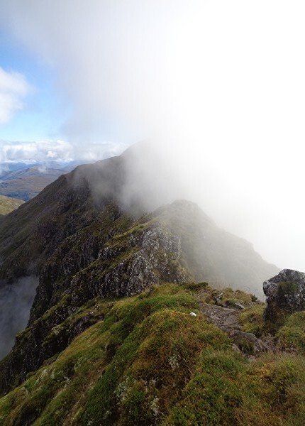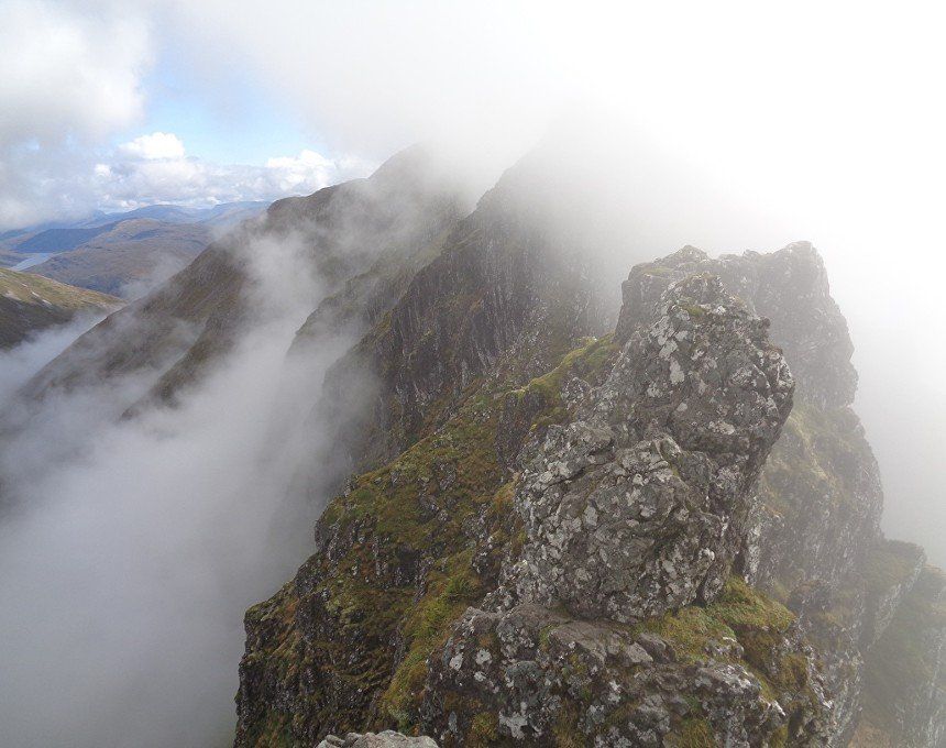 Aug 2017 – Ascent from Allt na Ruigh car park. Simply sensational. What an adventure; a great day out. Massively steep ascent but compelling views across to the mountains on the southern side of Glen Coe. Reached Am Bodach and the traverse of the Aonach Eagach began with an exposed downclimb. Famed as the narrowest ridge on the British mainland (though Liathach and An Teallach must run it close), the Aonach Eagach gives a thrilling and spectacular traverse for keen scramblers, linking the Munros of Meall Dearg and Sgorr nam Fiannaidh. The ridge has several steep rocky chimneys and other scrambling sections which must be climbed and descended, and is very exposed in some places (though it is not as consistently narrow as reputation would have it). There are many short scrambles necessary all along this ridge; the trickiest section is known as the 'Crazy Pinnacles' and is well along the ridge. I loved it; above the clouds for the most part and the ever-changing cloudscapes added real atmosphere. Met a party of three, roped up and with helmets making me feel under-dressed! Stuck with them for the most part and got a lift up the glen and a pint in the Clachaig afterwards as an added bonus, lovely chaps. We even shared a dram of whisky on the second Munro. The 'Crazy Pinnacles' was the most exposed I’ve ever felt…yet, on a ridge; no room for error whatsoever; madness really!