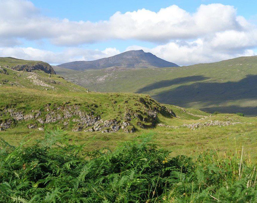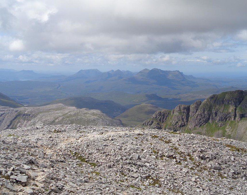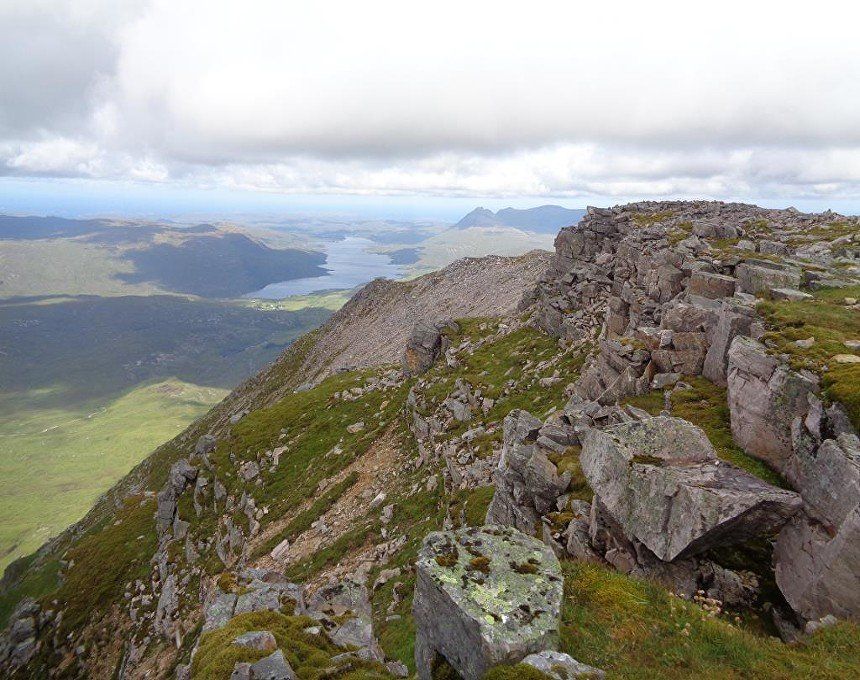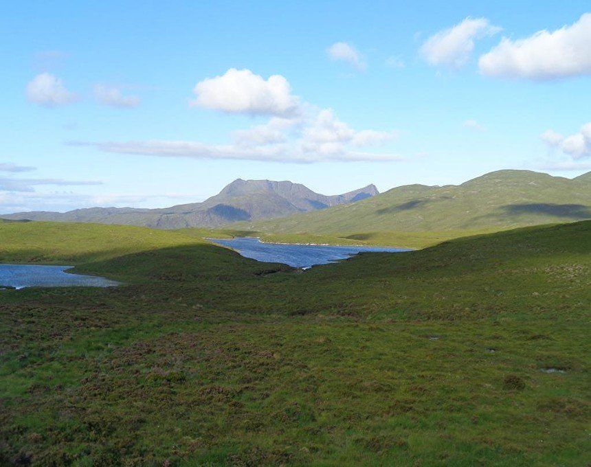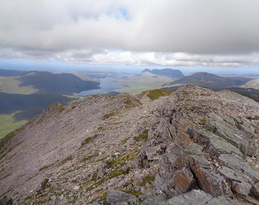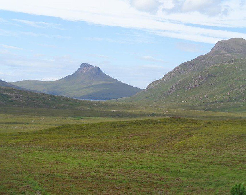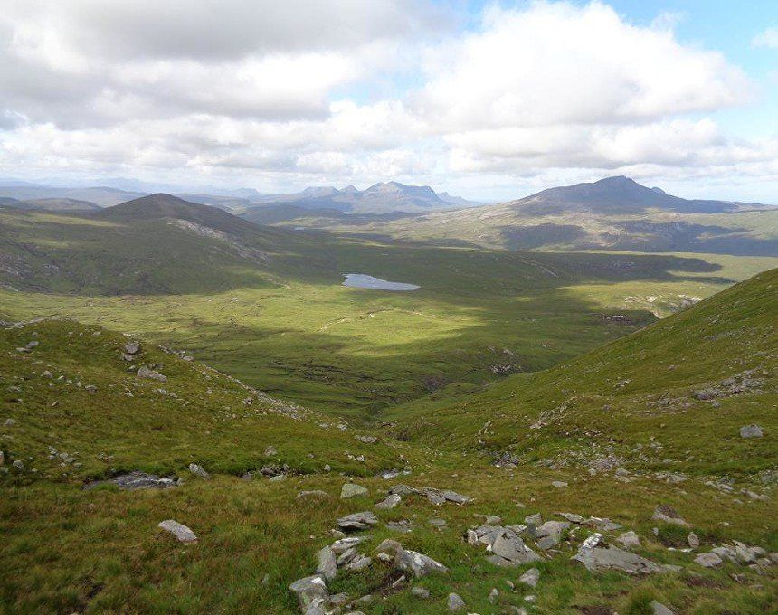 July 2018 - Ascent from Inchnadamph. A long route in, but interesting as it follows, for the most part, Gleann Dubh, which becomes narrower and steep sided. After 4.5km or so from the start the climb begins in earnest. A boggy section is followed by a badly eroded path climbing up the north side of the Allt a' Choinne Mhill. Much higher up the gradient relents into a shallow grassy corrie. The path soon crosses the burn and then climbs up towards the base of a band of quartzite crags. Above the line of crags an upper corrie is reached, with the bealach between Conival and Beinn an Fhurain beyond. Then I headed up the north ridge of Conival on a stony path; there are fine views looking over into Coire a'Mhadaidh, its lochan overshadowed by the impressive quartzite buttresses of Na Tuadhan. Higher up is a better-defined section of ridge, grassy going giving relief from the stones for a while. Beyond this the ridge climbs again, with some fine crags on the SW side, eventually reaching the summit cairn of Conival at a junction of three ridges. The cairn takes the form of a wind-shelter and has grand views looking back along Loch Assynt and the amazing mountains of Canisp, Cul Mor and Suilven. The east ridge leads the eye across masses of scree slopes to Ben More Assynt; traversing the ridge is very rough going. At 998m Ben More Assynt is the highest mountain over a vast area of northern Scotland as well as being the second Munro of the day; the view is of a majestic, desolate, sweeping bare wilderness to the east and amazing mountain panoramas and the Atlantic to the west. Took the obligatory picture of Stac Pollaidh on the drive back to Ullapool.