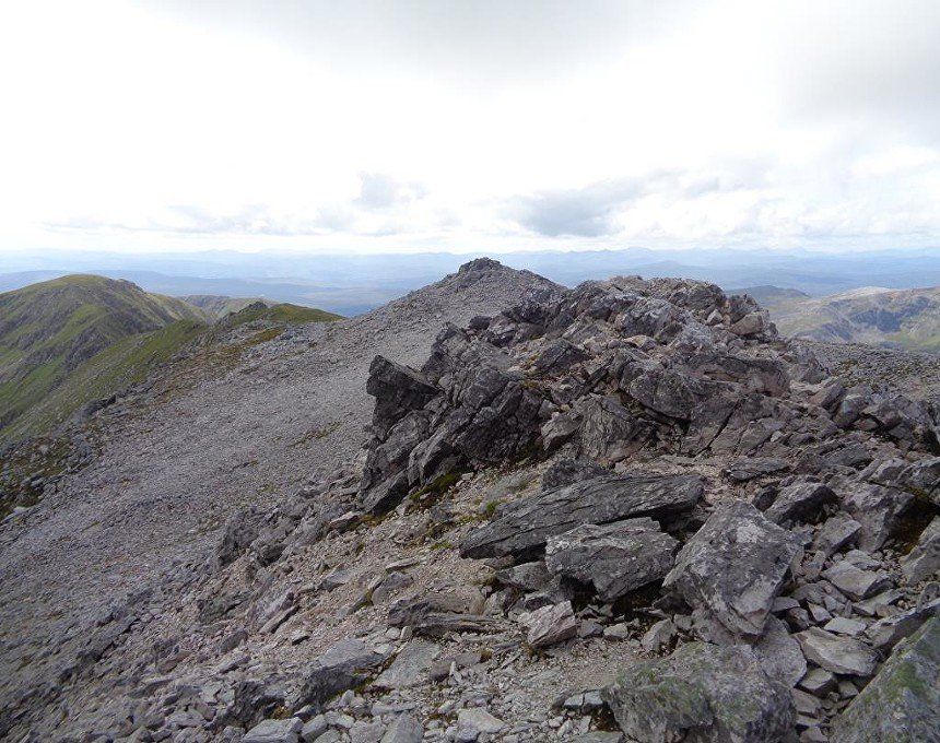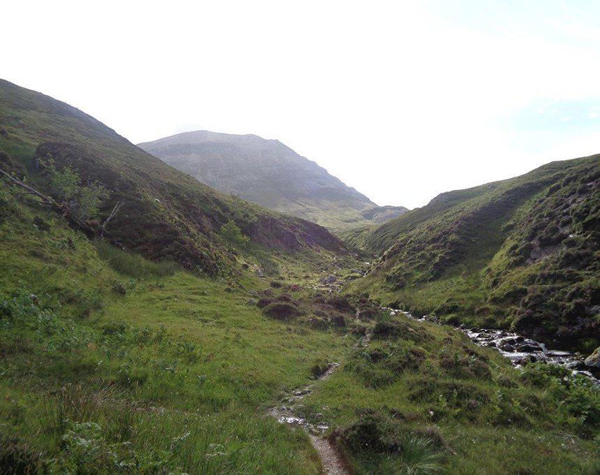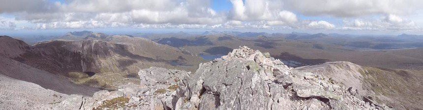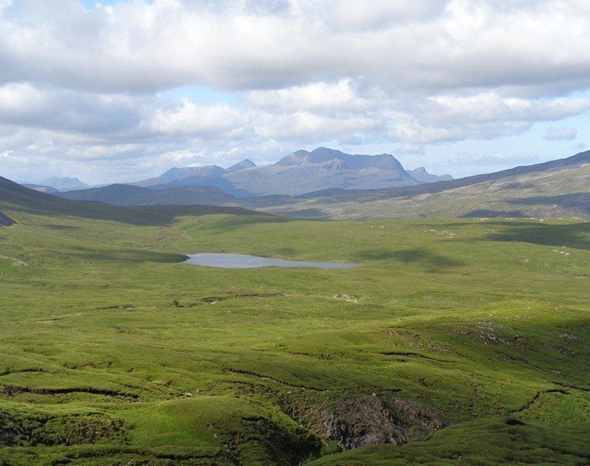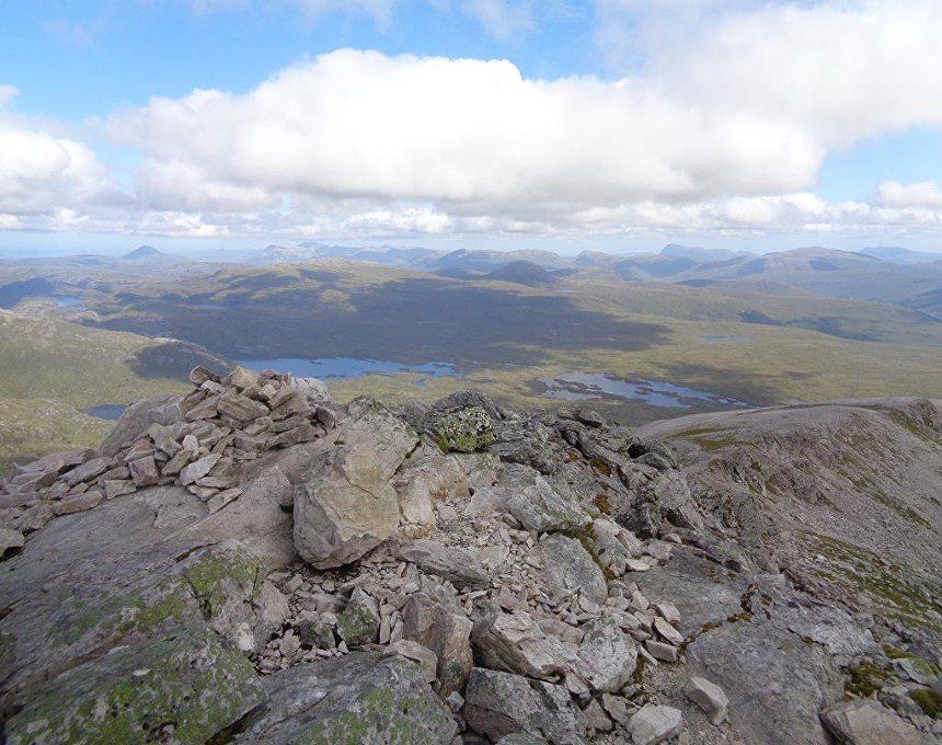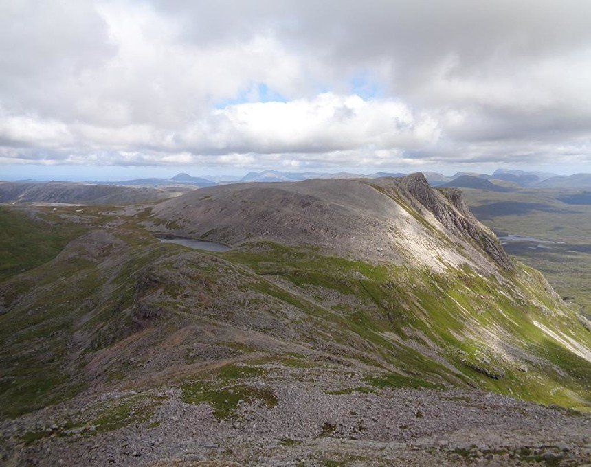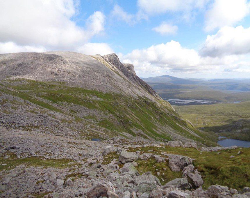 July 2018 - Ascent from Inchnadamph. A long route in, but interesting as it follows, for the most part, Gleann Dubh, which becomes narrower and steep sided. After 4.5km or so from the start the climb begins in earnest. A boggy section is followed by a badly eroded path climbing up the north side of the Allt a' Choinne Mhill. Much higher up the gradient relents into a shallow grassy corrie. The path soon crosses the burn and then climbs up towards the base of a band of quartzite crags. Above the line of crags an upper corrie is reached, with the bealach between Conival and Beinn an Fhurain beyond. Then I headed up the north ridge of Conival on a stony path; there are fine views looking over into Coire a'Mhadaidh, its lochan overshadowed by the impressive quartzite buttresses of Na Tuadhan. Higher up is a better-defined section of ridge, grassy going giving relief from the stones for a while. Beyond this the ridge climbs again, with some fine crags on the SW side, eventually reaching the summit cairn of Conival at a junction of three ridges. The cairn takes the form of a wind-shelter and has grand views looking back along Loch Assynt and the amazing mountains of Canisp, Cul Mor and Suilven. The east ridge leads the eye across masses of scree slopes to Ben More Assynt; traversing the ridge is very rough going. At 998m Ben More Assynt is the highest mountain over a vast area of northern Scotland as well as being the second Munro of the day; the view is of a majestic, desolate, sweeping bare wilderness to the east and amazing mountain panoramas and the Atlantic to the west. Took the obligatory picture of Stac Pollaidh on the drive back to Ullapool.