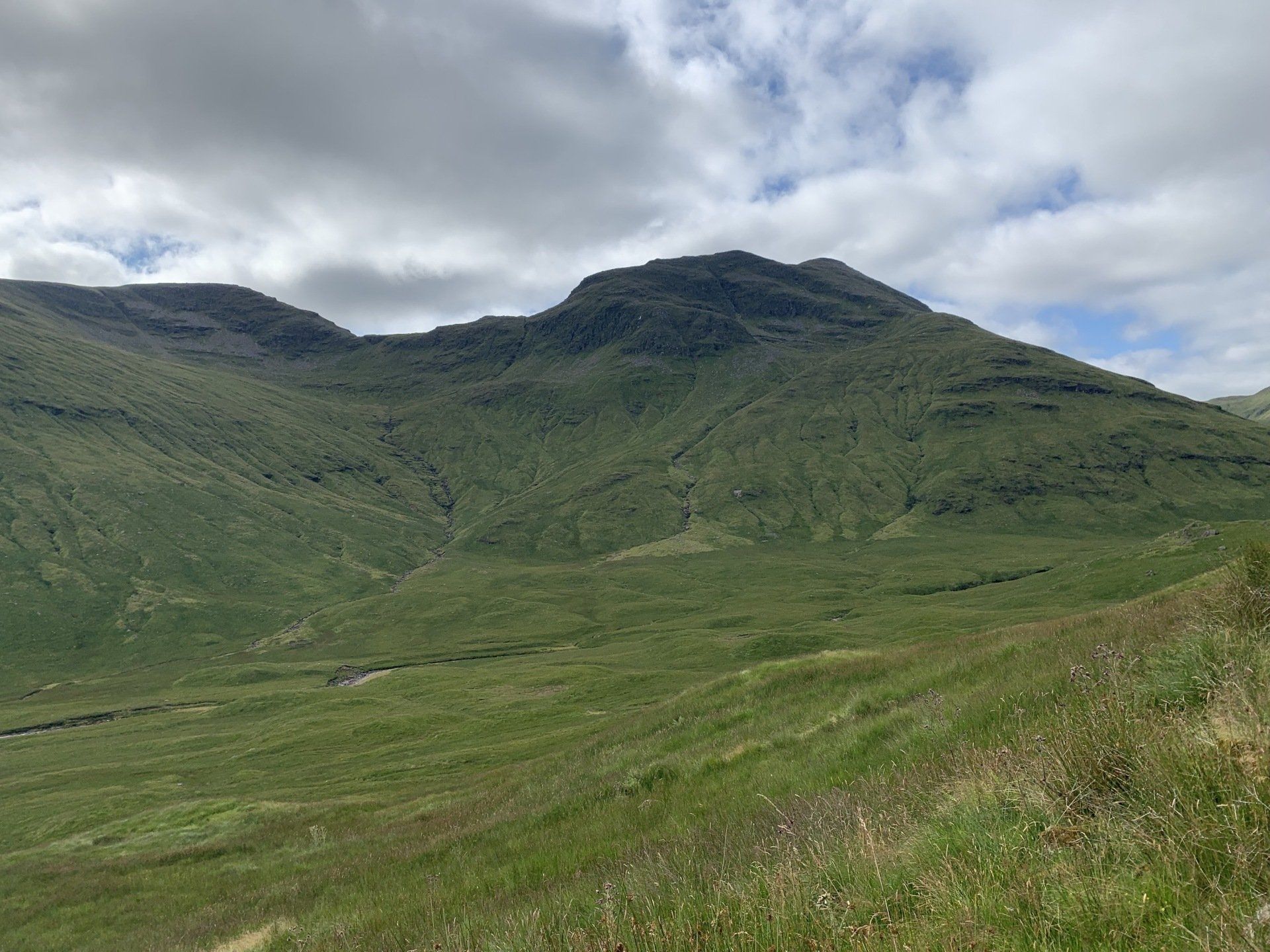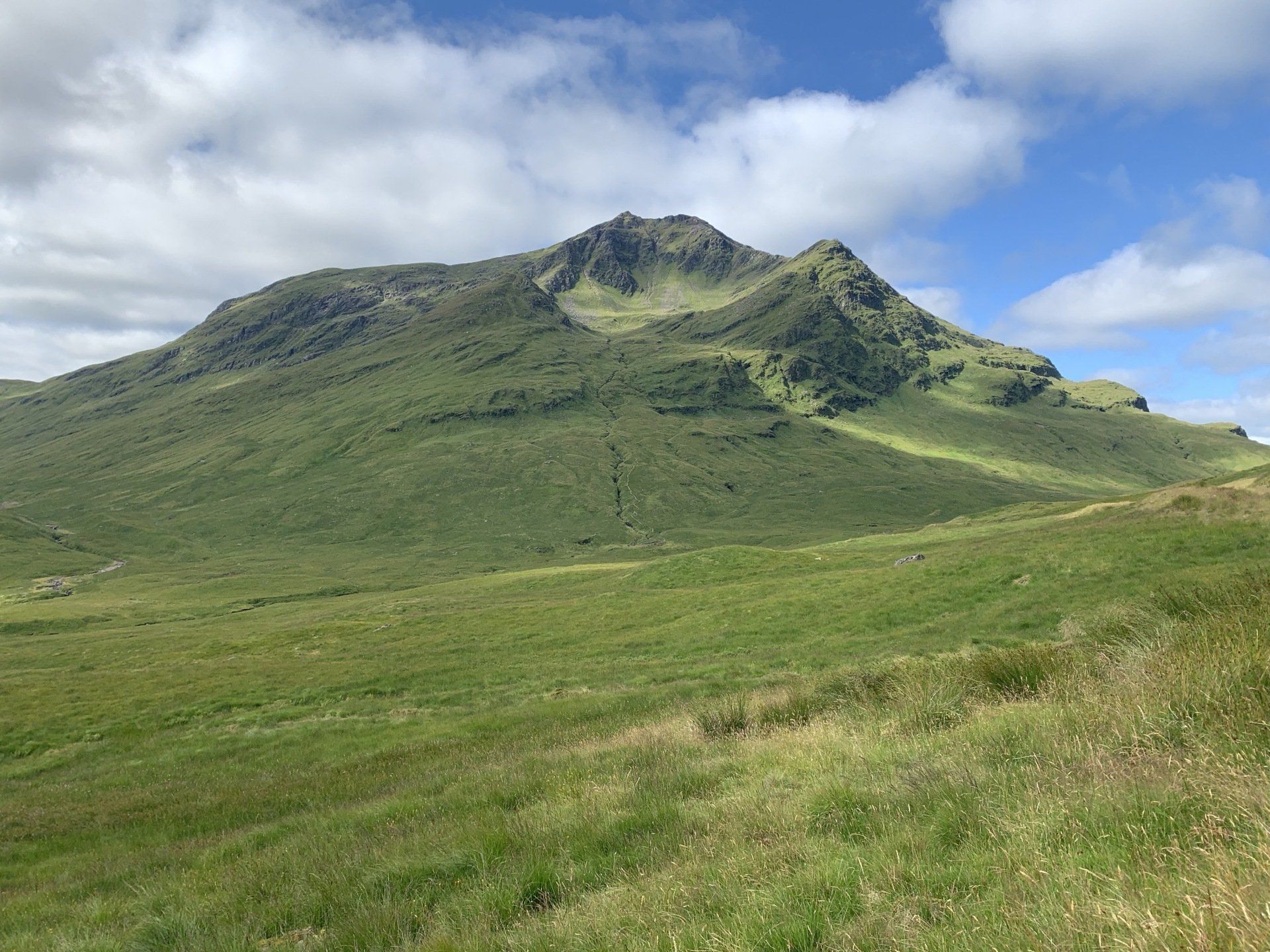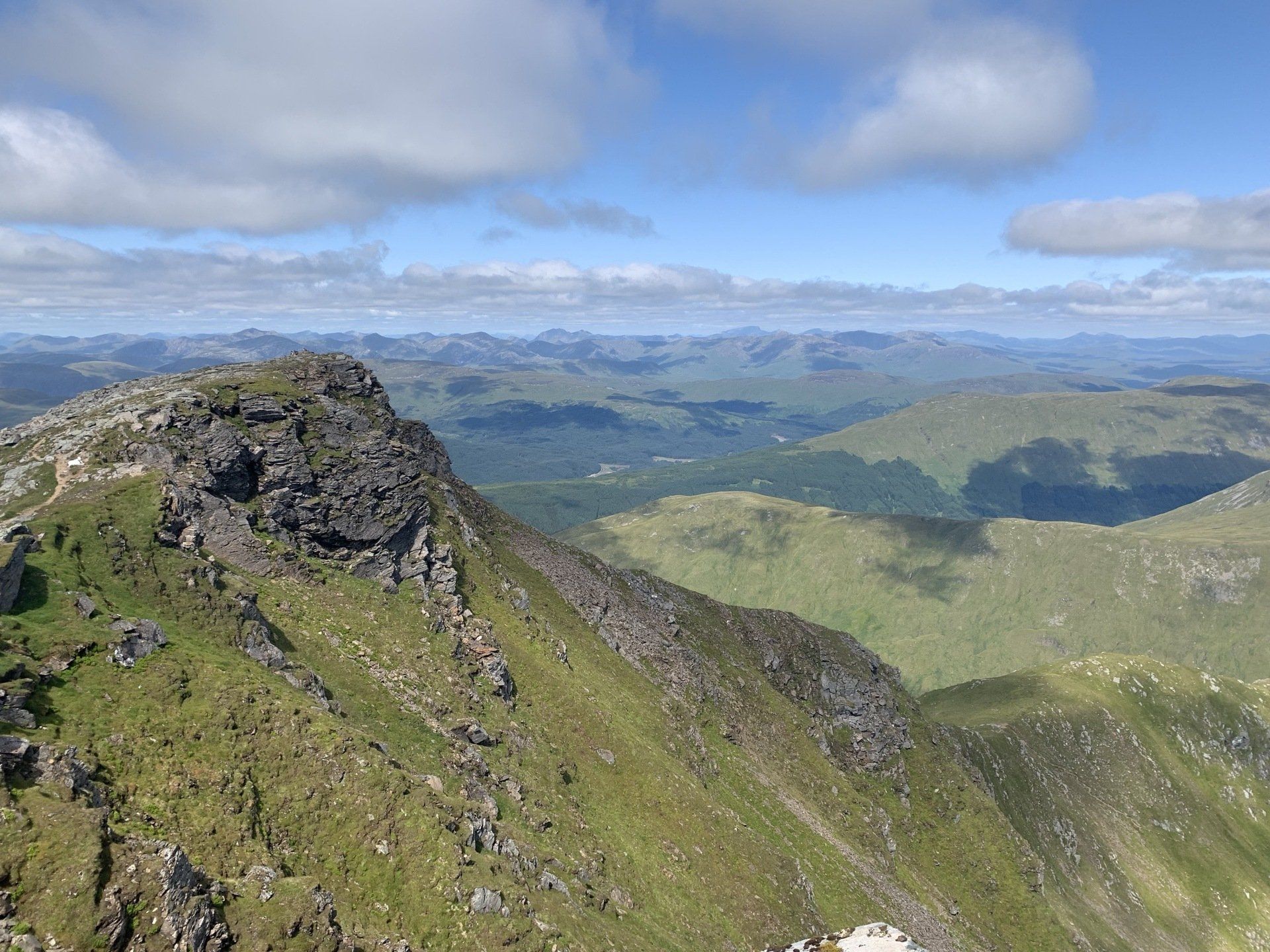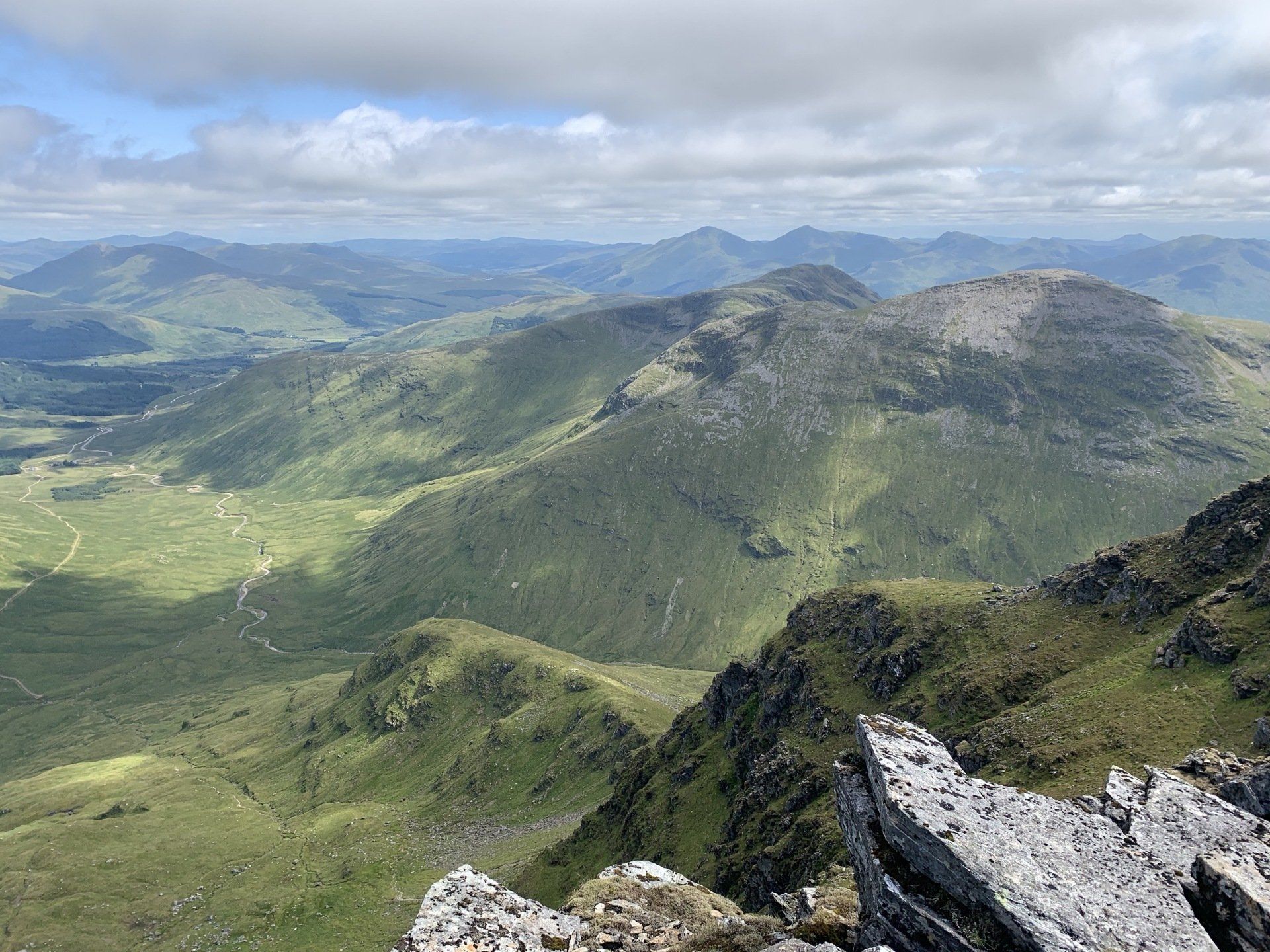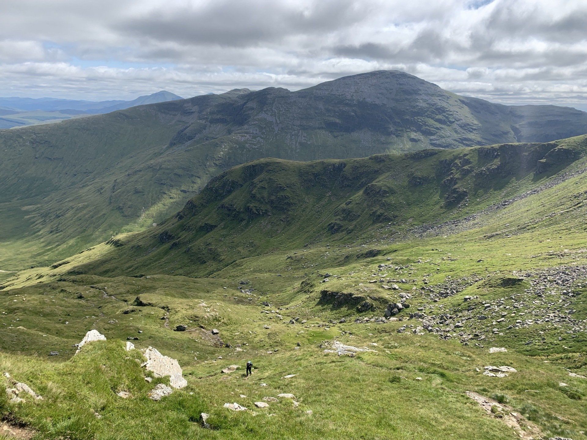 Aug 2021 - (with Gemma) Ascent from Dalrigh. Just a wonderful walk. Ben Lui is a fantastic mountain and I was excited about tackling it from this angle having previously summited it from the north-west. Fantastically peaceful, if long, trek in alongside the Cononish River on both there and back. Although it’s a considerable walk in, the views ahead of Ben Lui are magnificent and a taste of what’s to come. After several miles, the climb begins in earnest. We chose the Stob Garbh ridge after the corrie , for the ascent - a great ridge which offers amazing views over to the munros of Glen Etive, Glen Coe and north-west towards the Mamores and Nevis. Once we reached the summit, the panoramas were astonishing. Countless mountains in view. We improvised slightly on the descent, passed the remains of a plane that crashed into the mountain in 1941 and eventually joined the north-east ridge. This is turn led to steep grassy slopes before we rejoined the outward route just below the corrie. Achy feet by the time we reached the car,.