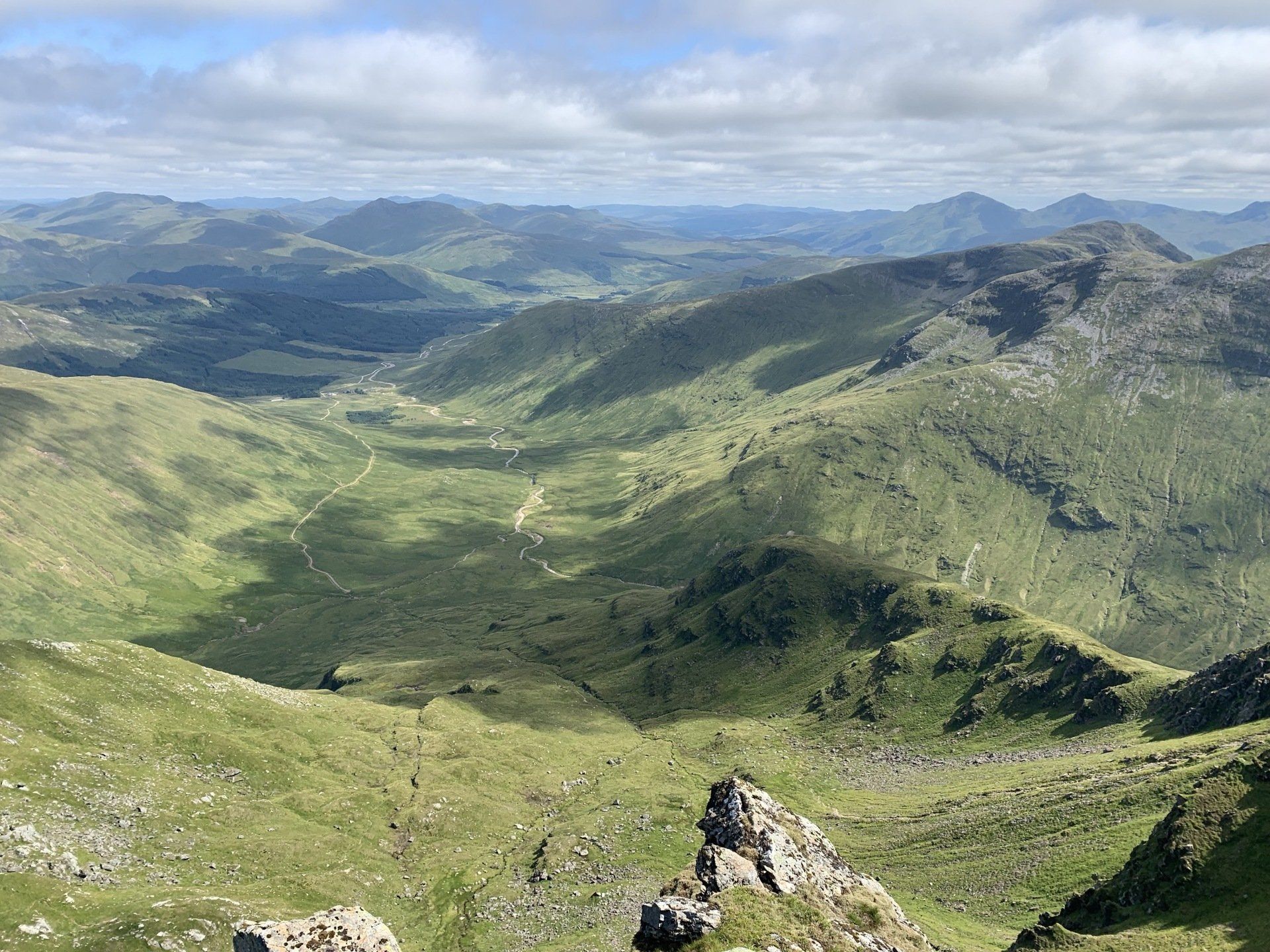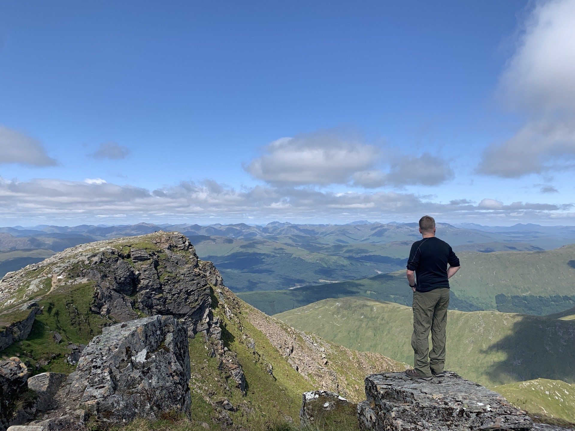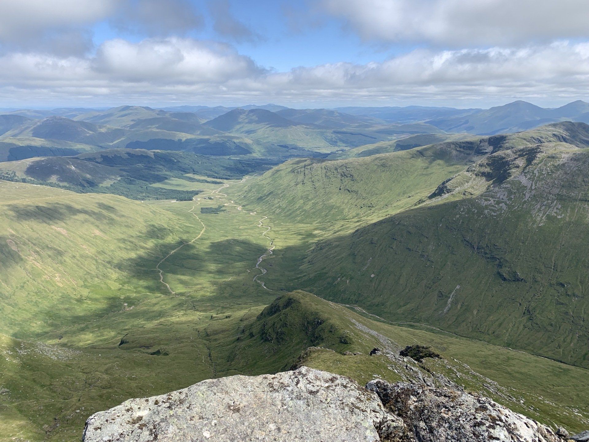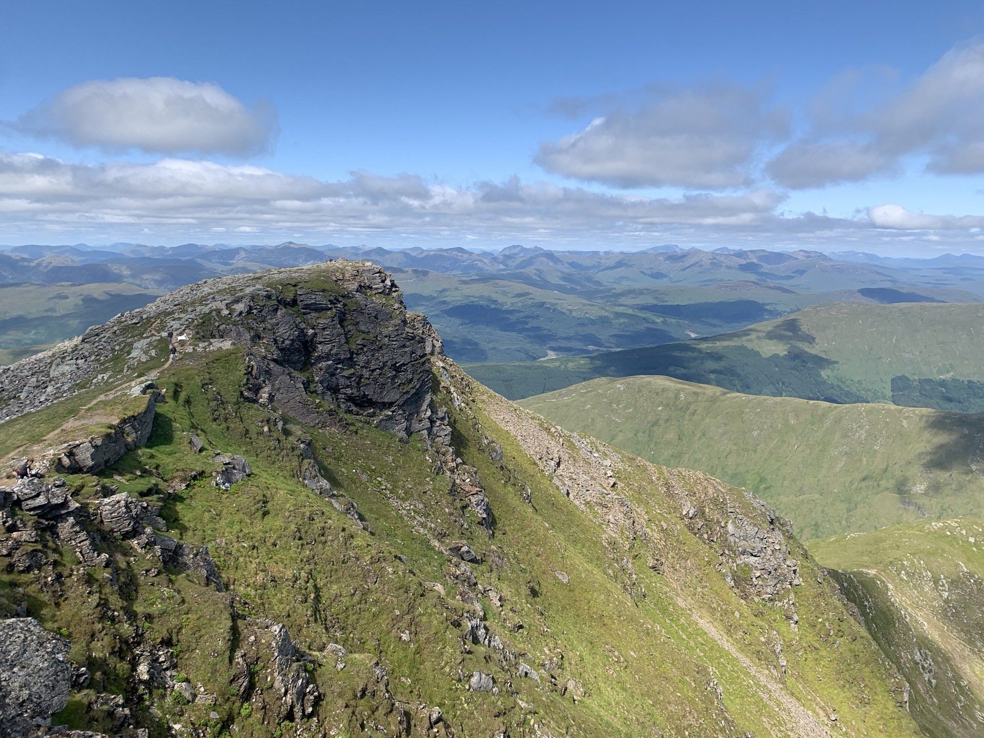 Aug 2021 - (with Gemma) Ascent from Dalrigh. Just a wonderful walk. Ben Lui is a fantastic mountain and I was excited about tackling it from this angle having previously summited it from the north-west. Fantastically peaceful, if long, trek in alongside the Cononish River on both there and back. Although it’s a considerable walk in, the views ahead of Ben Lui are magnificent and a taste of what’s to come. After several miles, the climb begins in earnest. We chose the Stob Garbh ridge after the corrie , for the ascent - a great ridge which offers amazing views over to the munros of Glen Etive, Glen Coe and north-west towards the Mamores and Nevis. Once we reached the summit, the panoramas were astonishing. Countless mountains in view. We improvised slightly on the descent, passed the remains of a plane that crashed into the mountain in 1941 and eventually joined the north-east ridge. This is turn led to steep grassy slopes before we rejoined the outward route just below the corrie. Achy feet by the time we reached the car,.