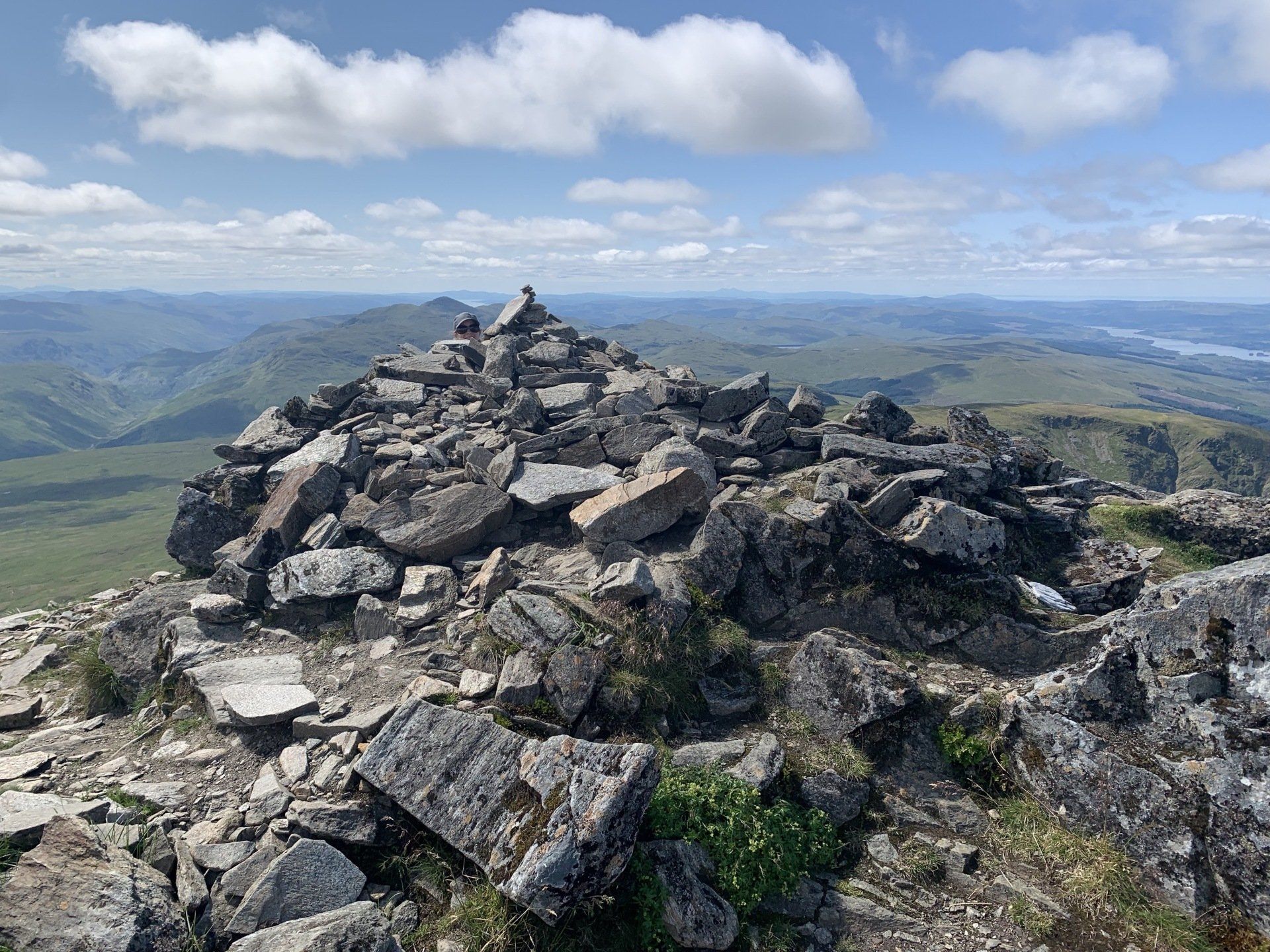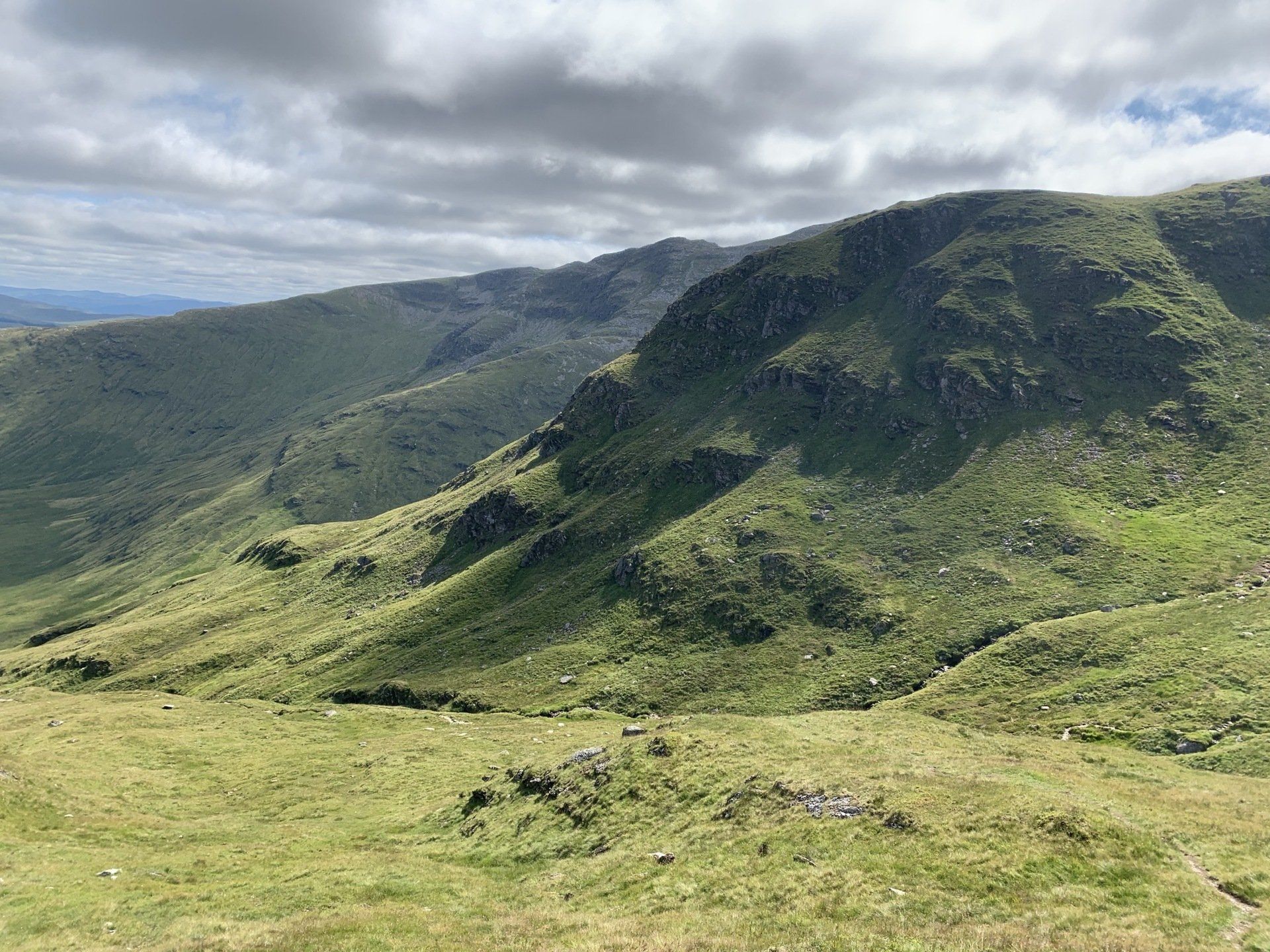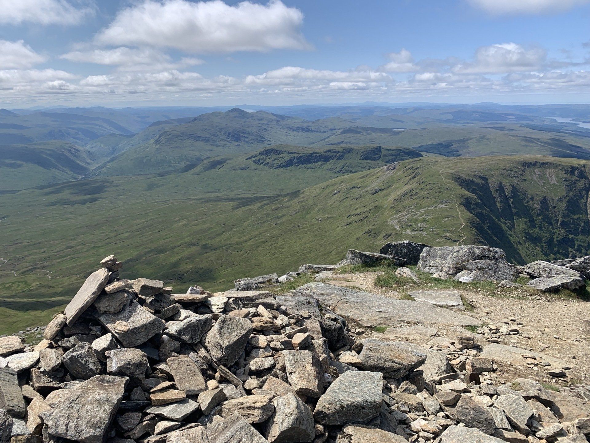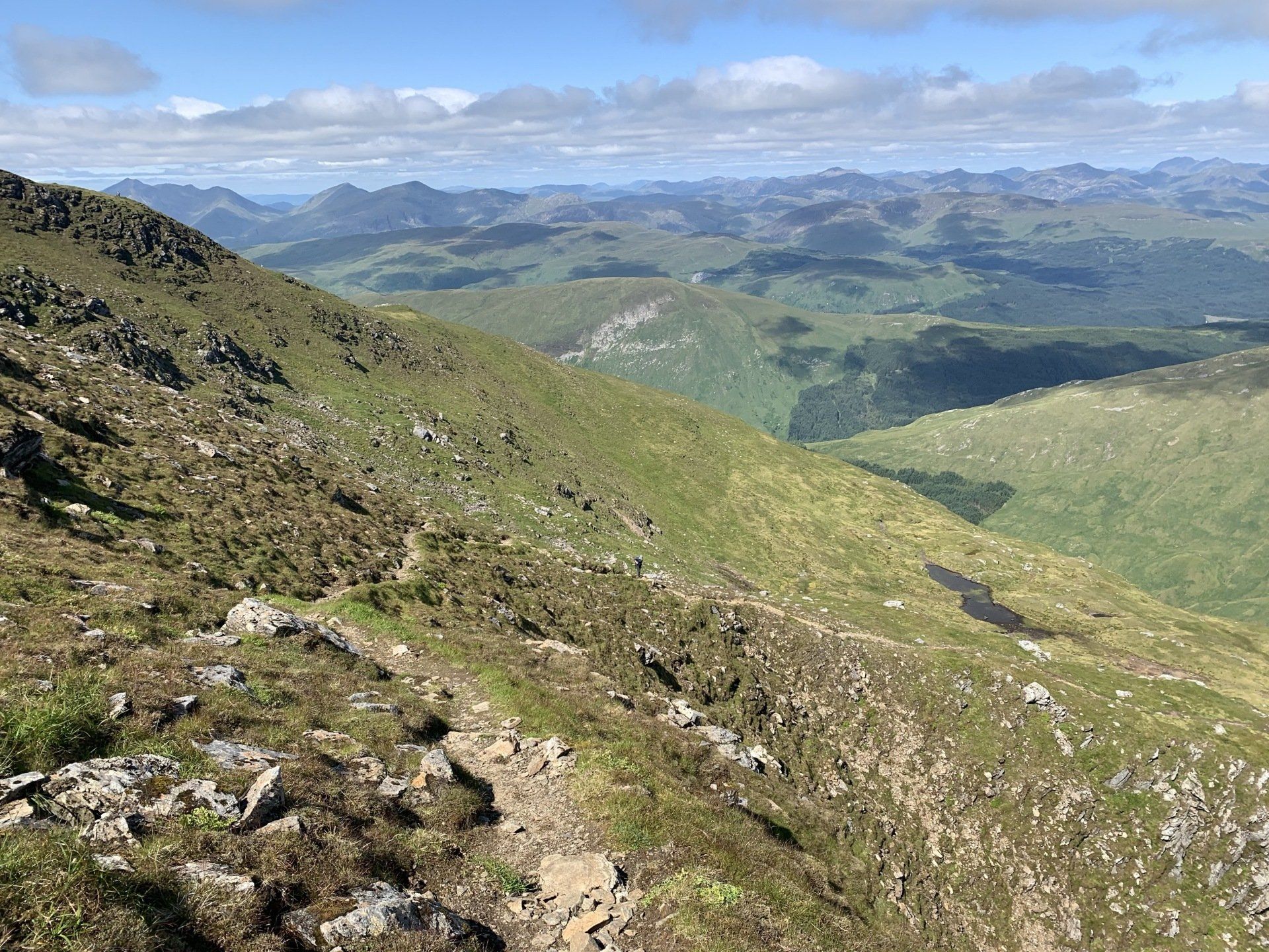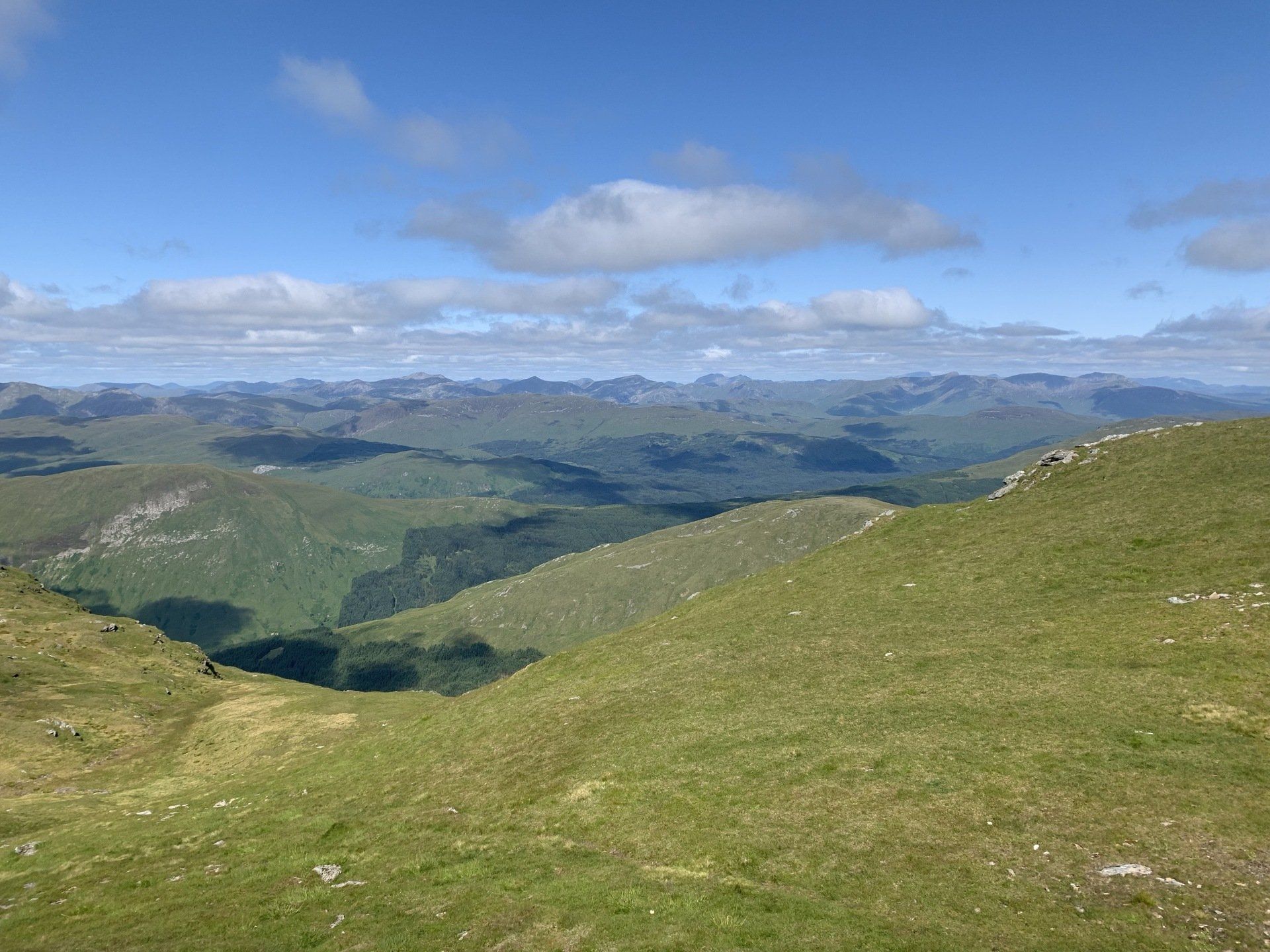 Aug 2021 - (with Gemma) Ascent from Dalrigh. Just a wonderful walk. Ben Lui is a fantastic mountain and I was excited about tackling it from this angle having previously summited it from the north-west. Fantastically peaceful, if long, trek in alongside the Cononish River on both there and back. Although it’s a considerable walk in, the views ahead of Ben Lui are magnificent and a taste of what’s to come. After several miles, the climb begins in earnest. We chose the Stob Garbh ridge after the corrie , for the ascent - a great ridge which offers amazing views over to the munros of Glen Etive, Glen Coe and north-west towards the Mamores and Nevis. Once we reached the summit, the panoramas were astonishing. Countless mountains in view. We improvised slightly on the descent, passed the remains of a plane that crashed into the mountain in 1941 and eventually joined the north-east ridge. This is turn led to steep grassy slopes before we rejoined the outward route just below the corrie. Achy feet by the time we reached the car,.