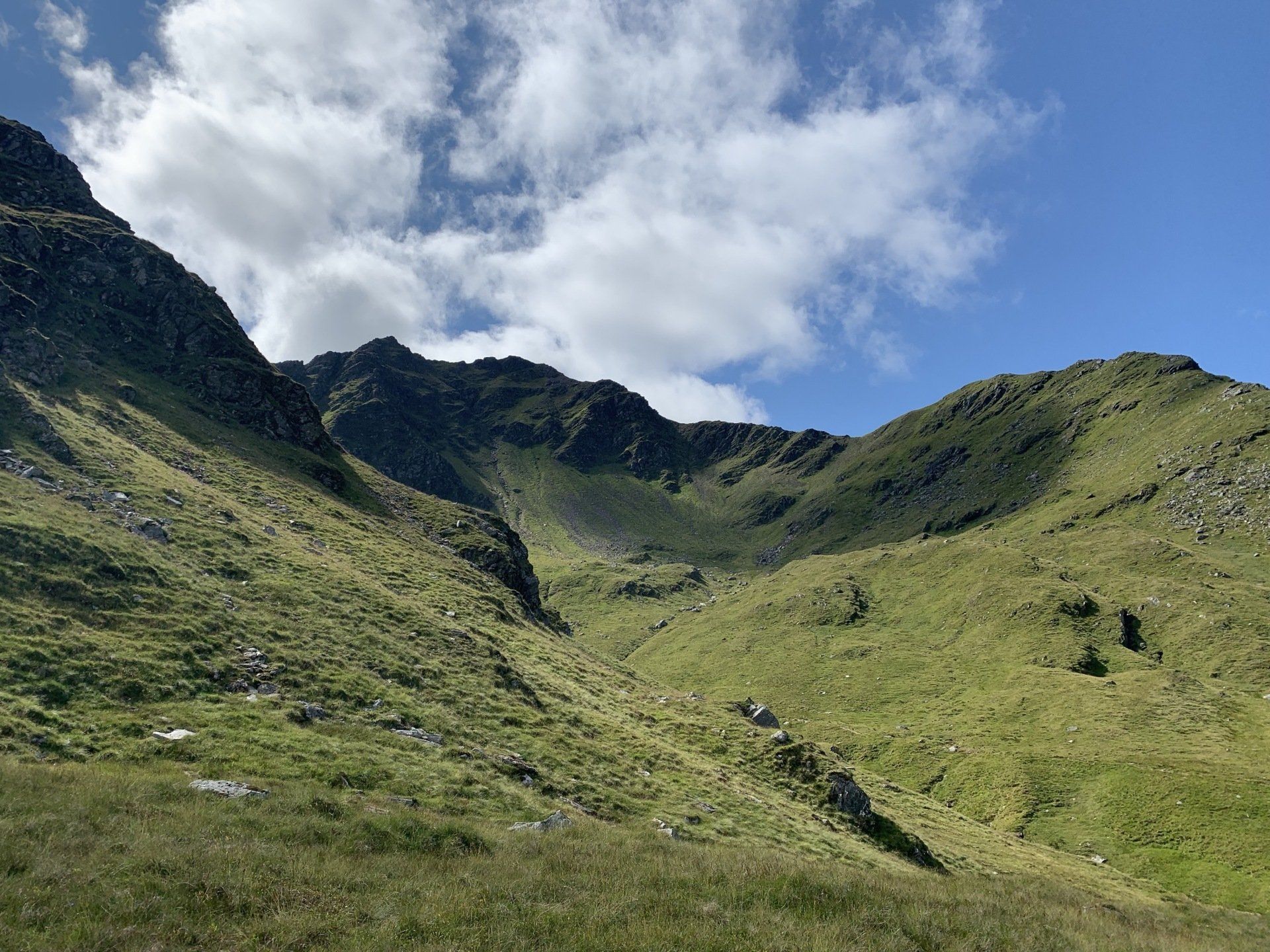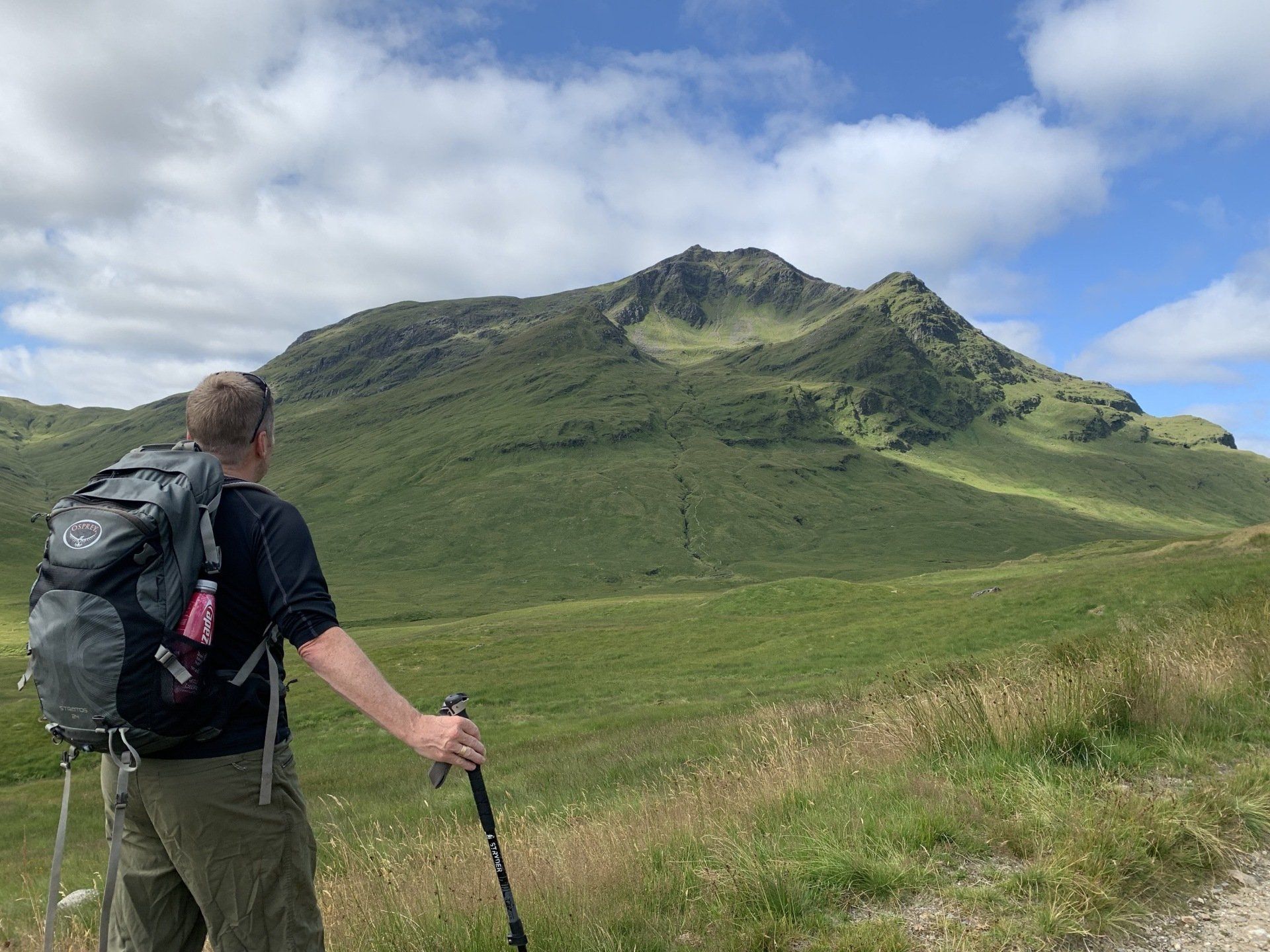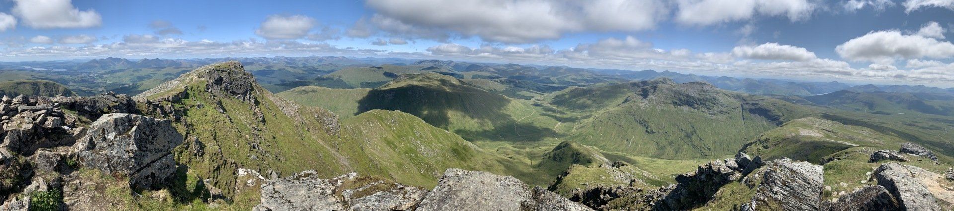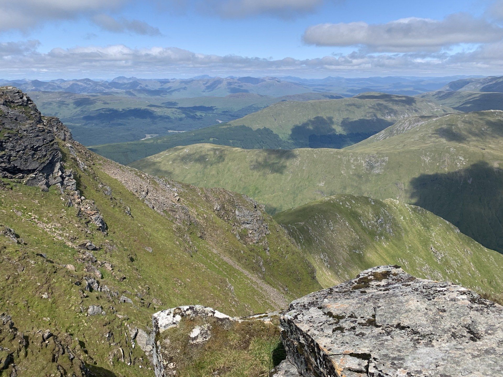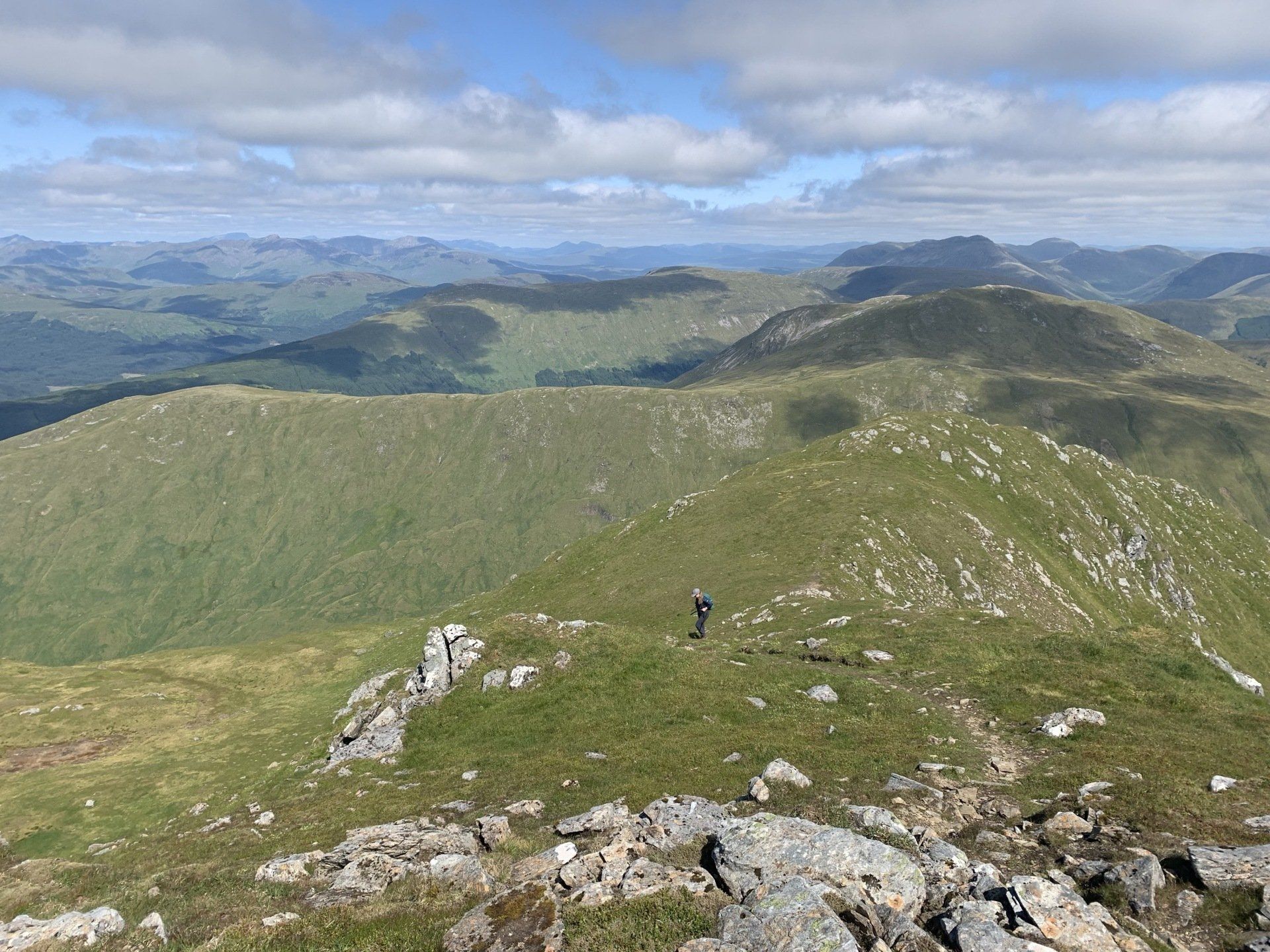 Aug 2021 - (with Gemma) Ascent from Dalrigh. Just a wonderful walk. Ben Lui is a fantastic mountain and I was excited about tackling it from this angle having previously summited it from the north-west. Fantastically peaceful, if long, trek in alongside the Cononish River on both there and back. Although it’s a considerable walk in, the views ahead of Ben Lui are magnificent and a taste of what’s to come. After several miles, the climb begins in earnest. We chose the Stob Garbh ridge after the corrie , for the ascent - a great ridge which offers amazing views over to the munros of Glen Etive, Glen Coe and north-west towards the Mamores and Nevis. Once we reached the summit, the panoramas were astonishing. Countless mountains in view. We improvised slightly on the descent, passed the remains of a plane that crashed into the mountain in 1941 and eventually joined the north-east ridge. This is turn led to steep grassy slopes before we rejoined the outward route just below the corrie. Achy feet by the time we reached the car,.