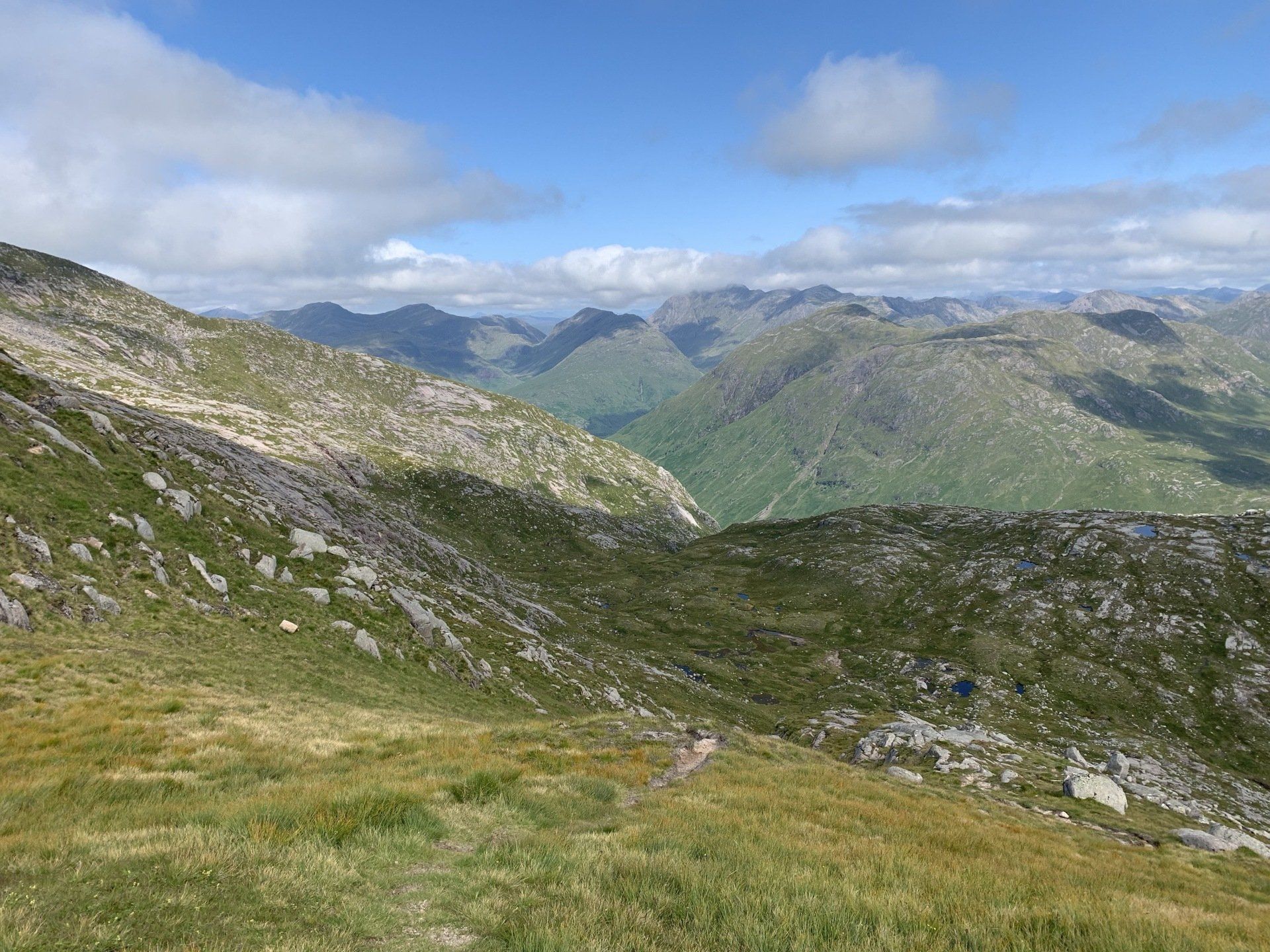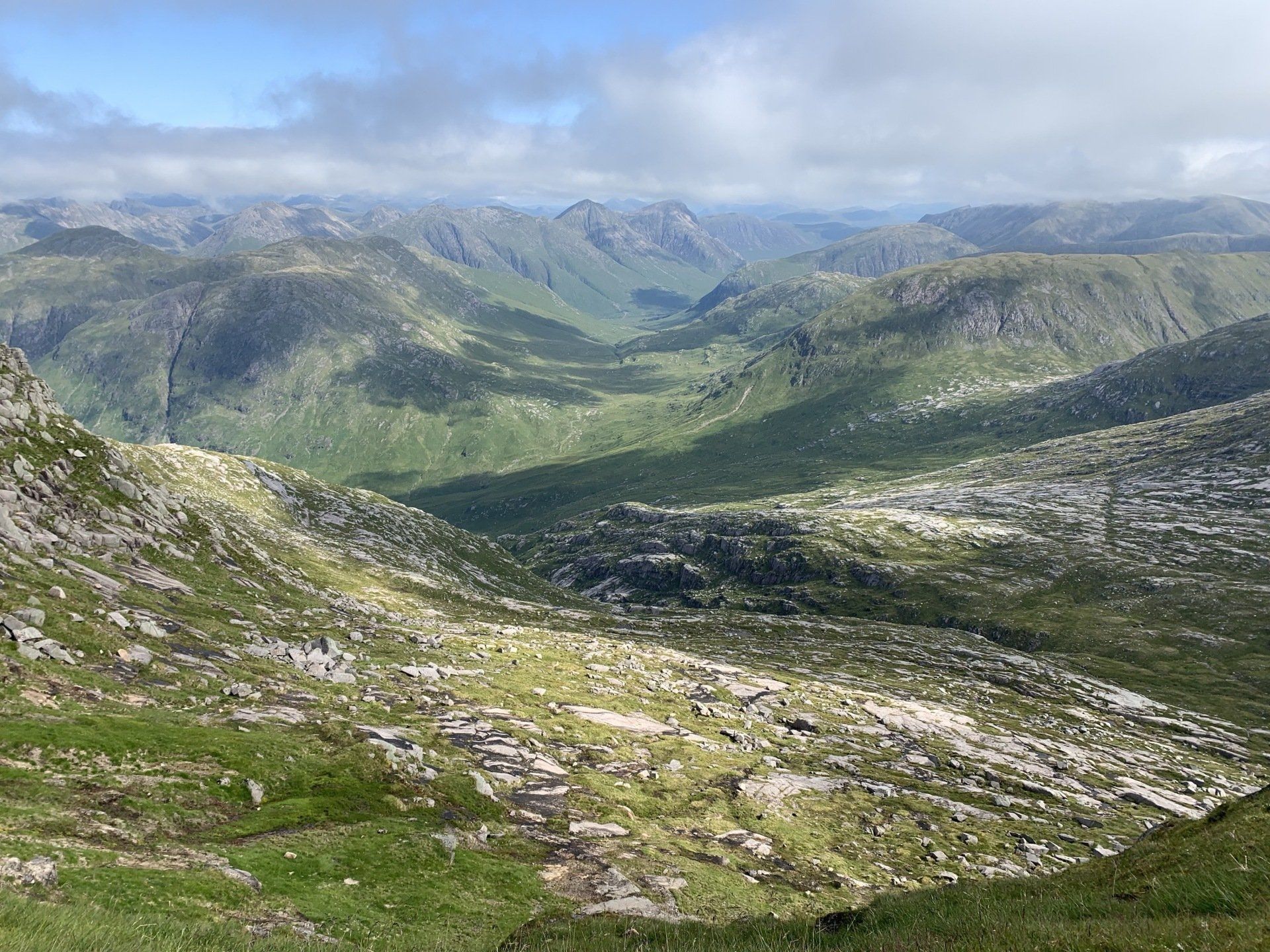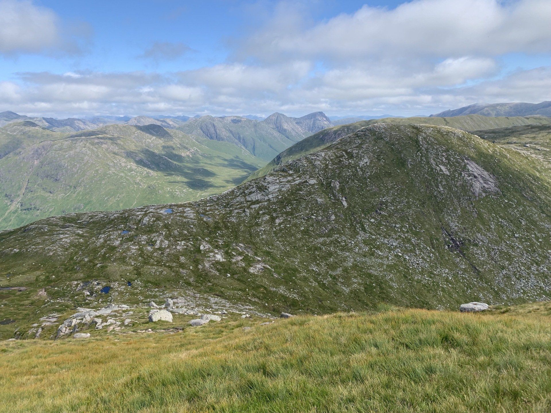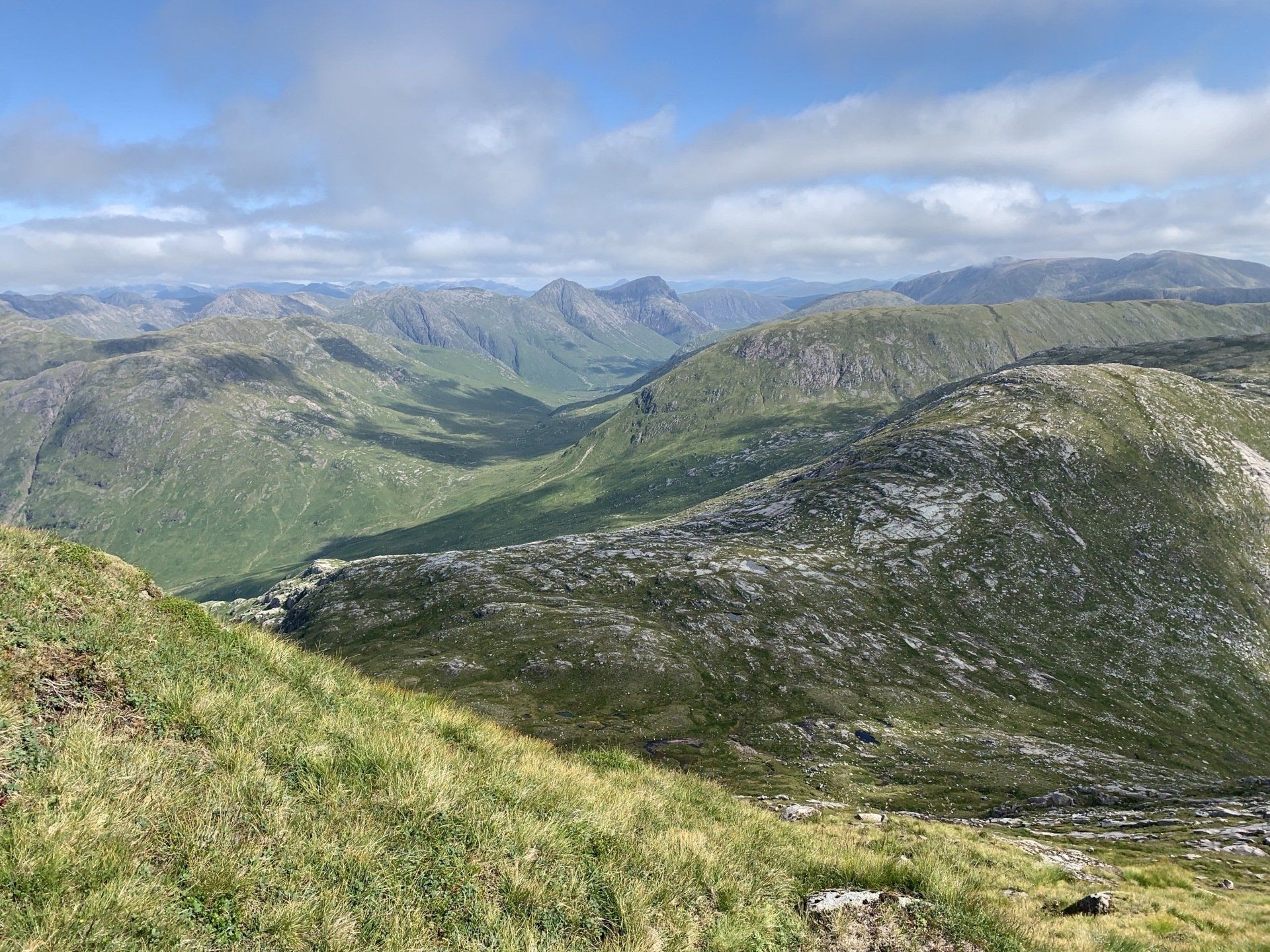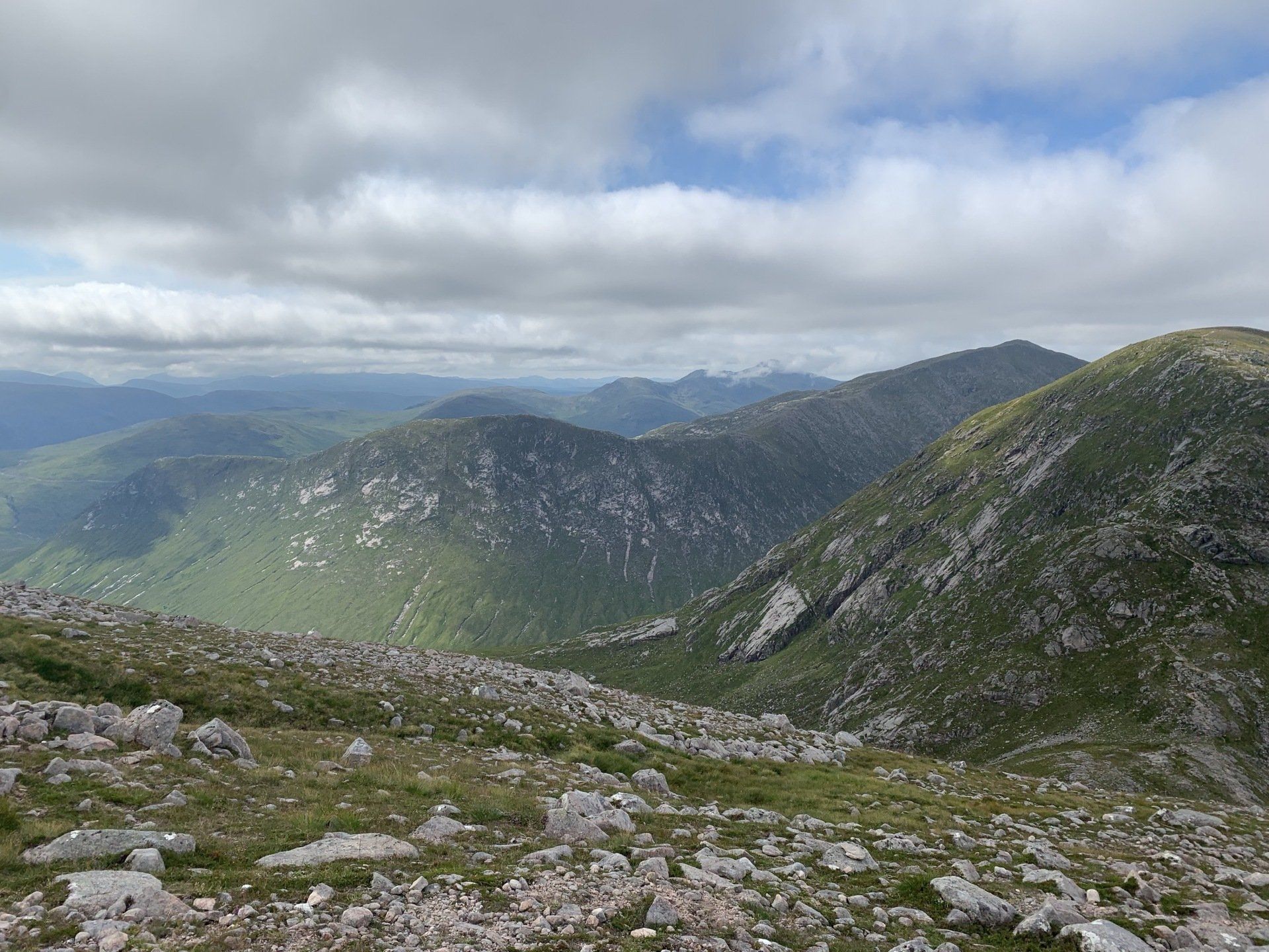 Aug 2021 - Ascent from Coiletir. Gemma's legs were dead after yesterday so it was a solo hike for me today. Gorgeous drive as always from Tyndrum to Glen Etive and the start point. Surprised to see the amount of hydro-eletric power works going on lower down in Glen Etive. Other than the workers encountered at the very beginning and end, I didn't see a single soul today. It was a long slog up but once on the tops, the views and terrain were both excellent. The munros of Glen Orchy, Glen Coe and the nearby peaks of Ben Starav and Glas Bheinn Mhòr were stunning. Amazing rock scenery in the two bealachs between the mountains. Long but lovely walk off Meall nan Eun. Two new munros which takes me up to 152/282.