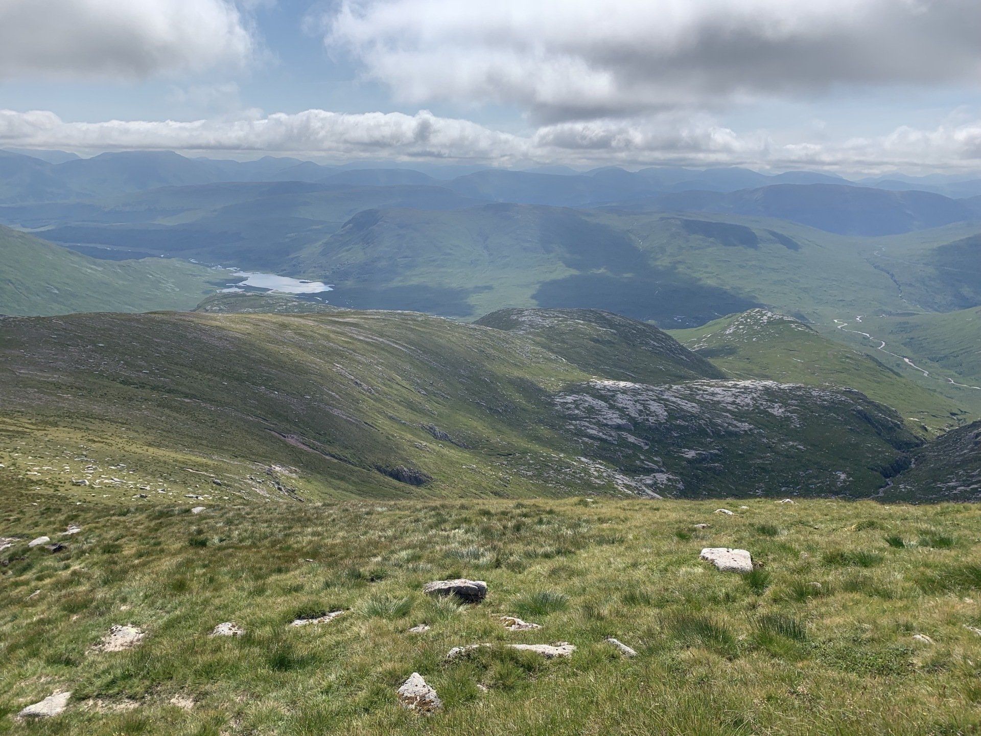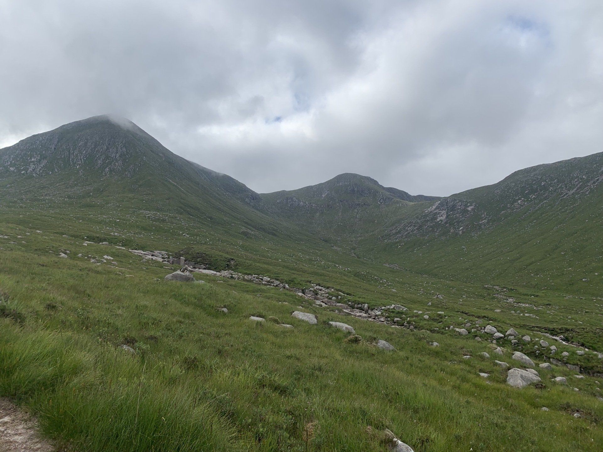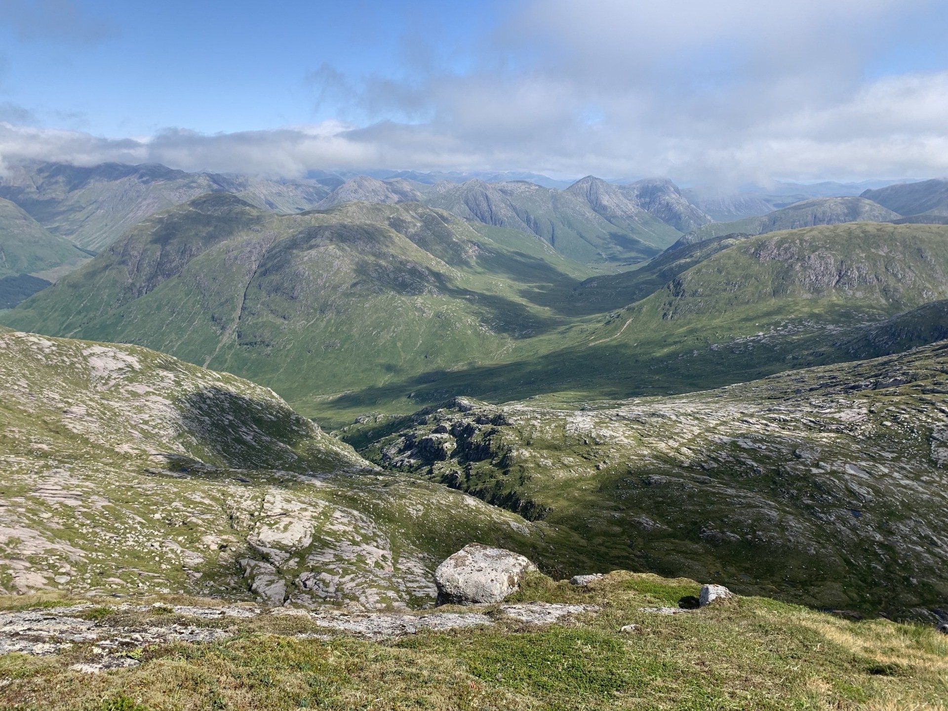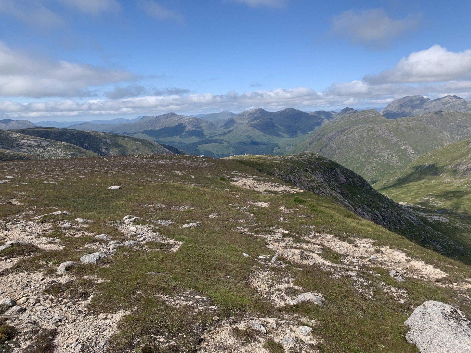 Aug 2021 - Ascent from Coiletir. Gemma's legs were dead after yesterday so it was a solo hike for me today. Gorgeous drive as always from Tyndrum to Glen Etive and the start point. Surprised to see the amount of hydro-eletric power works going on lower down in Glen Etive. Other than the workers encountered at the very beginning and end, I didn't see a single soul today. It was a long slog up but once on the tops, the views and terrain were both excellent. The munros of Glen Orchy, Glen Coe and the nearby peaks of Ben Starav and Glas Bheinn Mhòr were stunning. Amazing rock scenery in the two bealachs between the mountains. Long but lovely walk off Meall nan Eun. Two new munros which takes me up to 152/282.