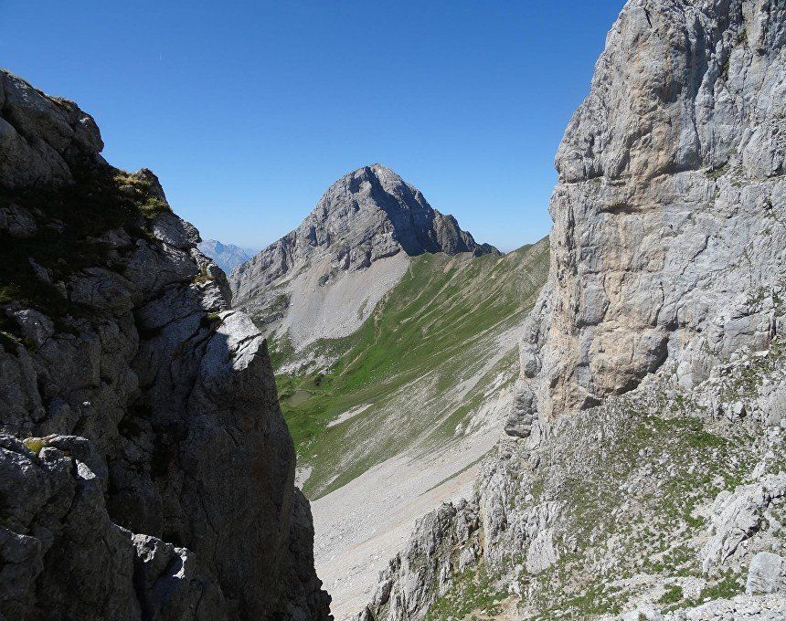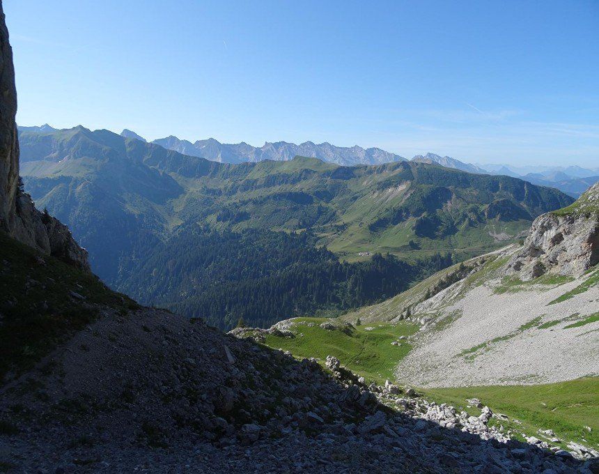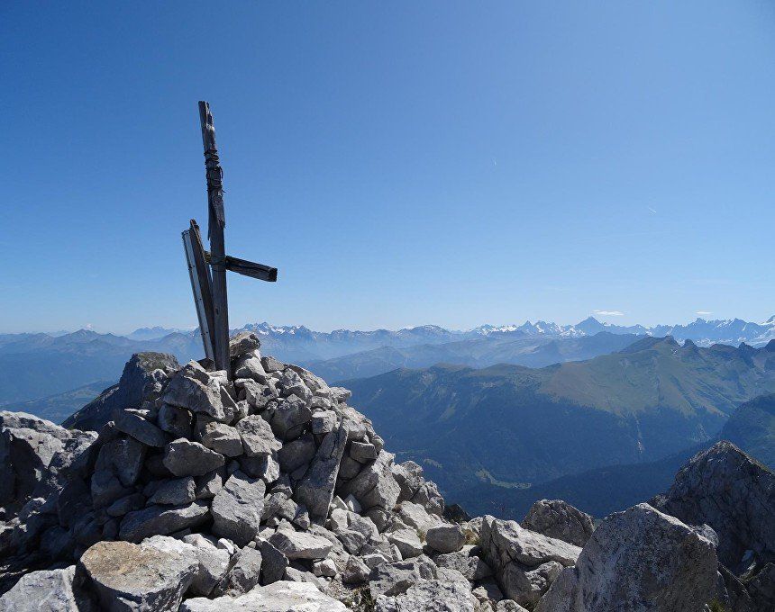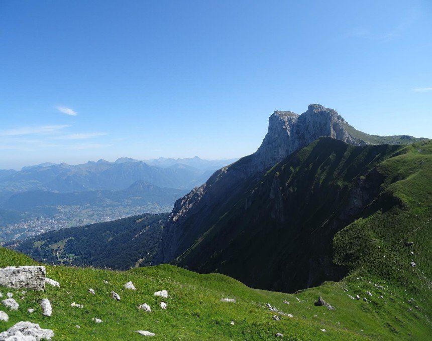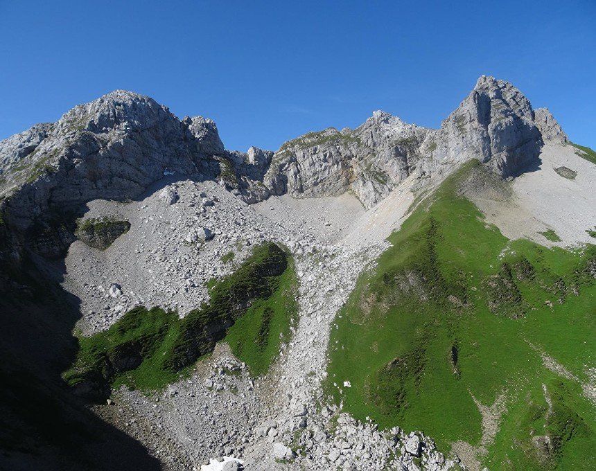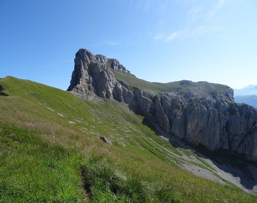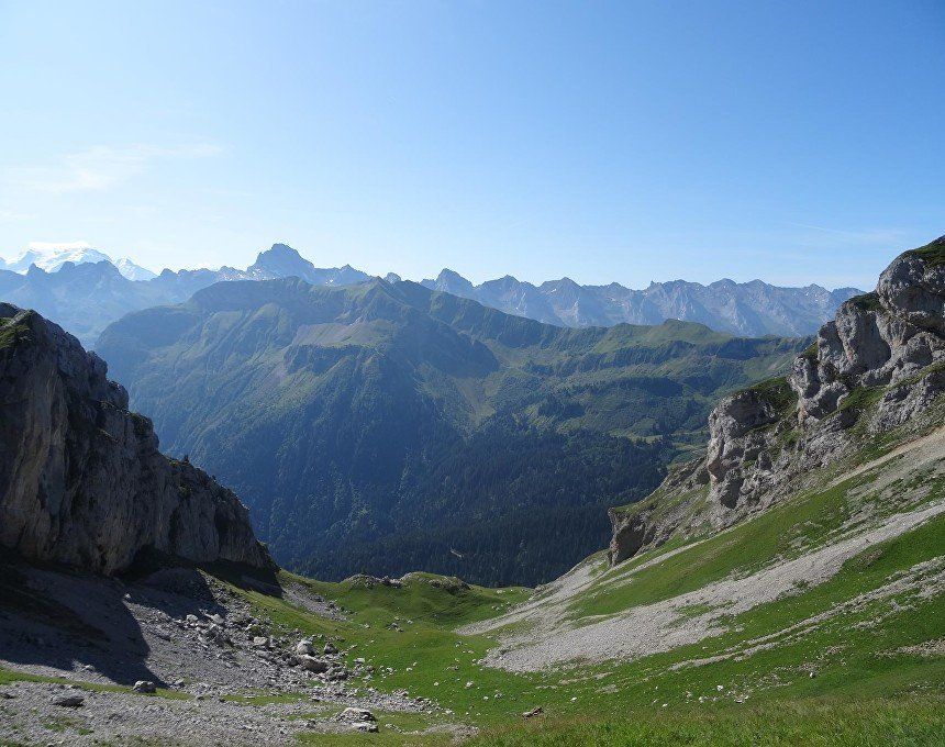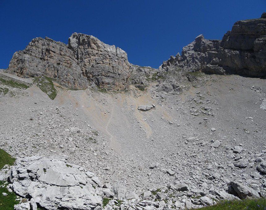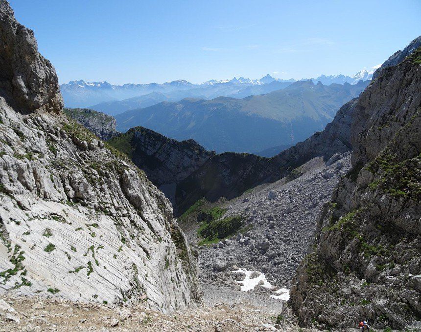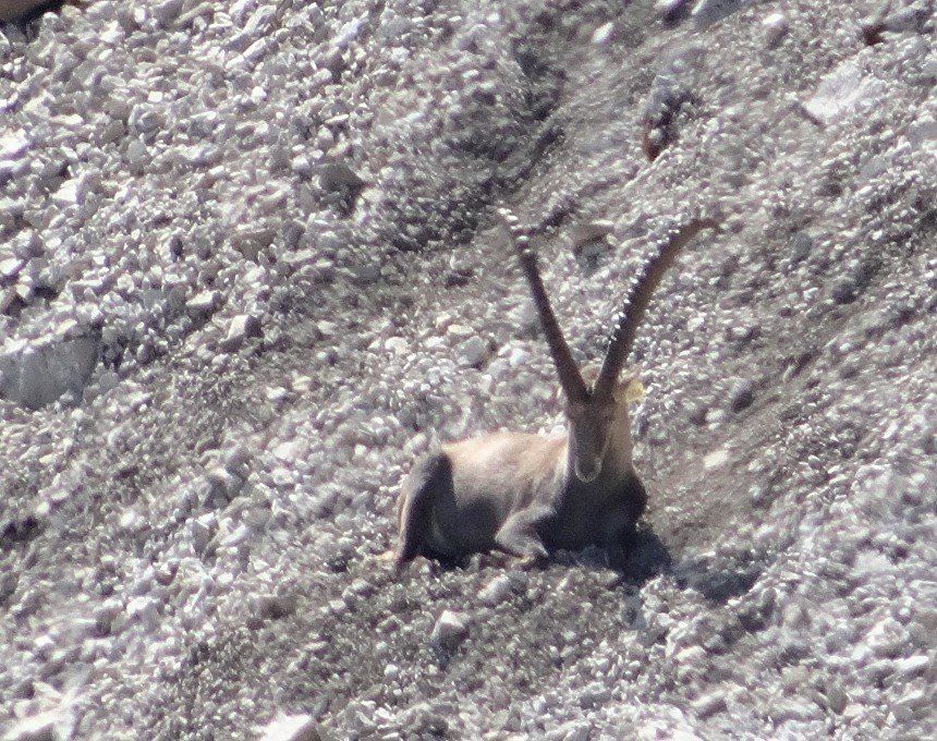 Aug 2019 - Ascent from Col de la Colombière. From the col, I walked parallel with the contours until a steep ascent up to 2100m, across grass, and over rocky terrain brought me to the caves named Les grottes des Montarquis. Sorry that the photos are rubbish - haven't mastered that setting on the camera! Scooped out at the base of a cliff, these caves show you the extent that water can erode limestone. It was quite eerie inside but a relief from the scorching heat. To get to Pointe du Midi, there was a huge down and up, and finally, a steep scree in a narrow gully which reminded me of Lords Rake. Plenty of Ibex around to keep me entertained though. The views from the summit were spectacular, arguable the finest viewpoint of my stay in France so far. Some fun scree-running in descent via the lake.