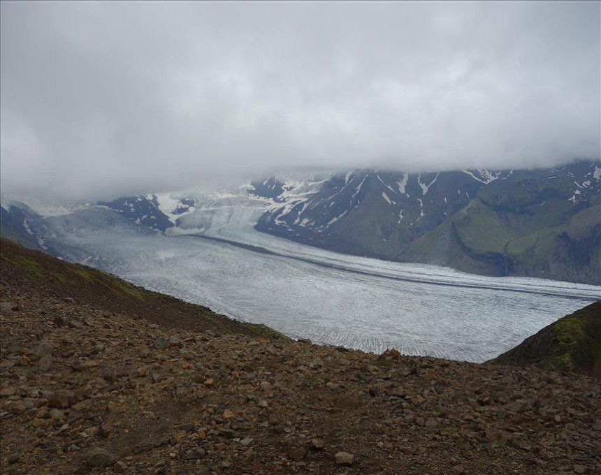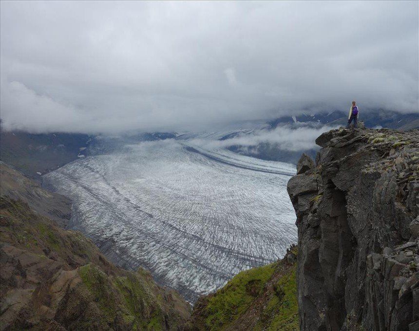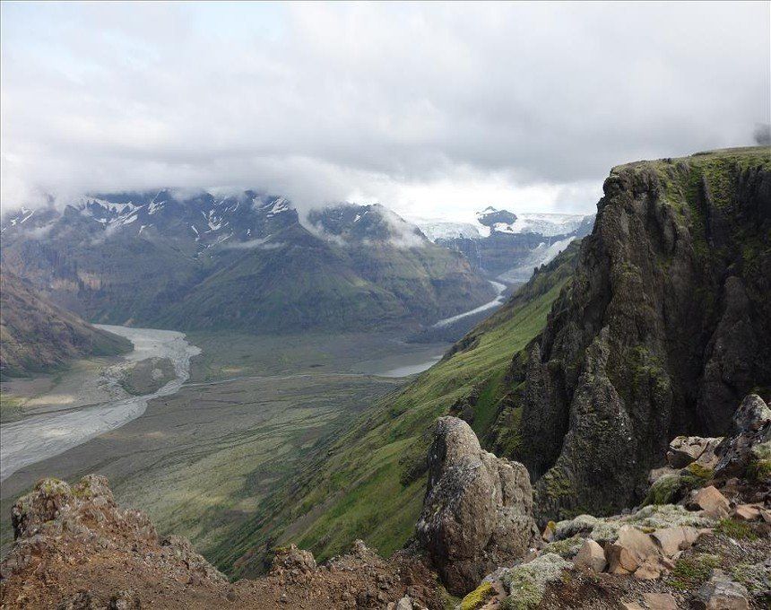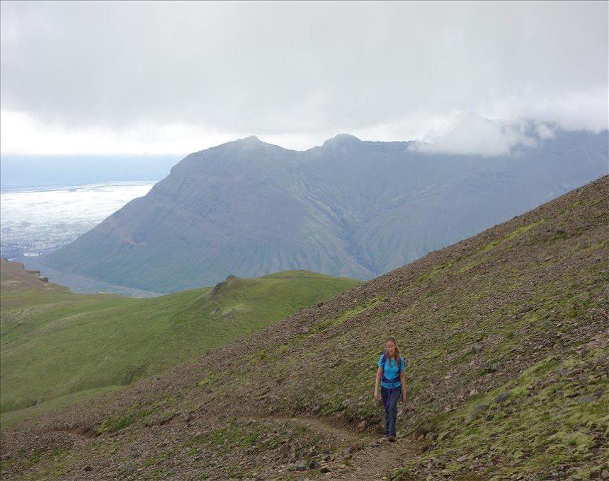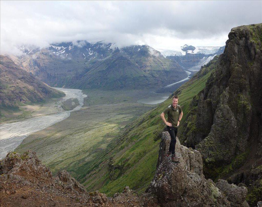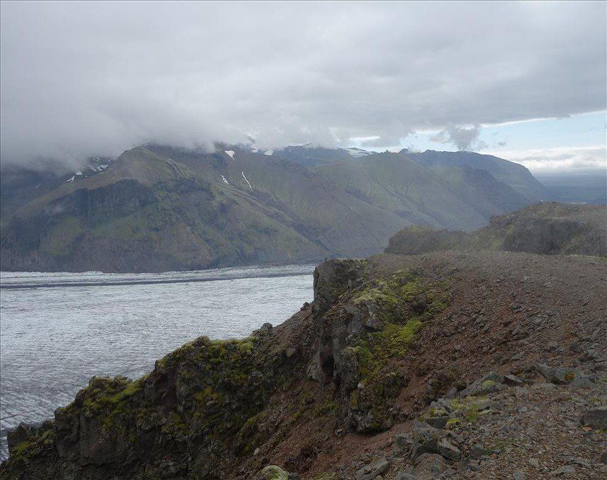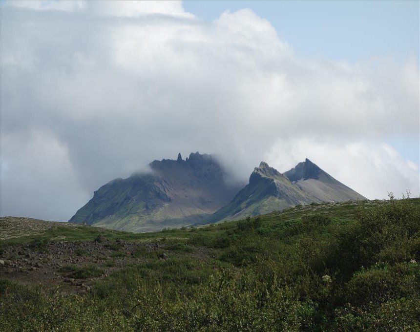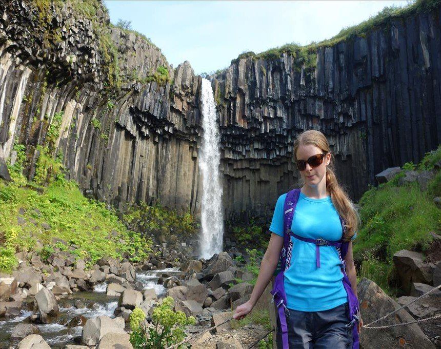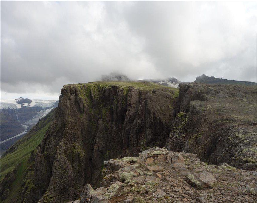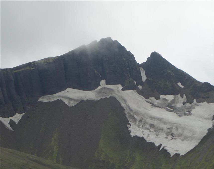 July 2014 – (with Gemma) Ascent from Skaftafell Visitor Centre. Today we rose early for a mountain hike up the 1126m peak, Kristinartindar. It was a simply magnificent climb with astounding views, exhilarating scrambling and knife edge arêtes; a 13 mile hike through changing scenery. Initially we climbed to Svartifoss, a wonderful waterfall with volcanic columns framing it. When we reached the flatter ridge, the views to the glacier and mountains to our west were excellent, including Iceland’s highest waterfall. We scrambled around here for a while, and then continued our ascent, with Gemma pausing to take in the flora and fungi! Eventually, we entered the corrie and ascended the scree to a col, where the views down to the glacier were tremendous. From here it was a steep climb and scramble to the summit which is set on an extremely narrow ridge. We sat here for an hour, enjoying our lunch and the occasional views through the clouds, in surprisingly warm weather. On the summit, there was a tremendous distant crashing noise, where we guessed a chunk of ice had fallen from the edge of a glacier into the water below. On the descent, we saw Snipes, Golden Plovers and a Ptarmigan with her chicks, all joyfully hopping around! The huge glacier of Skaftafellsjokull on the eastern side of the ridge was breathtaking, creating a contrast with the greenery and black rock. Iceland’s highest peak, Hvanndalsnukker, also occasionally popped out through the clouds.