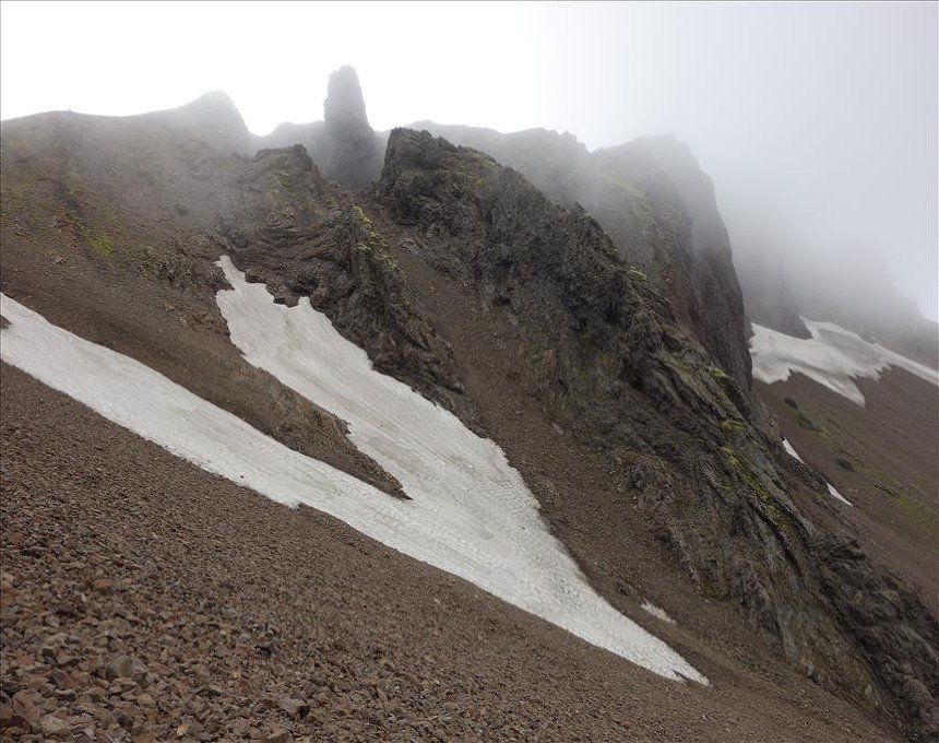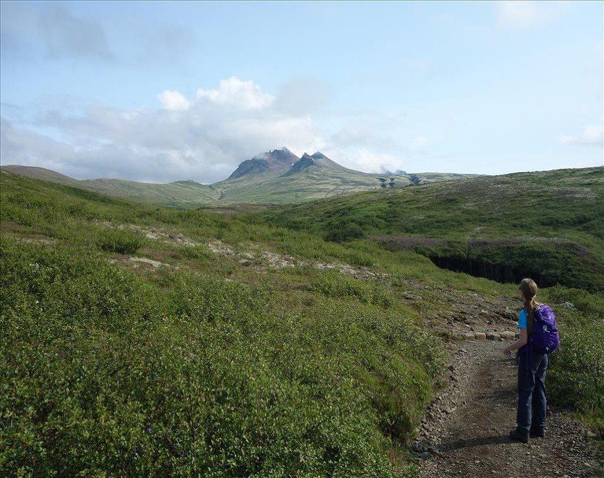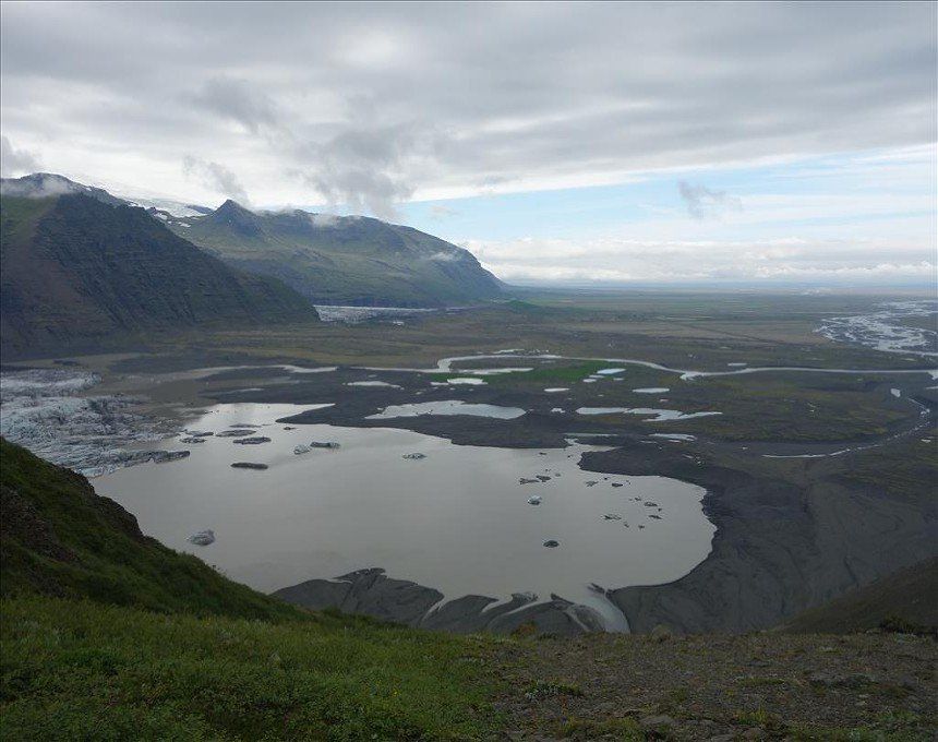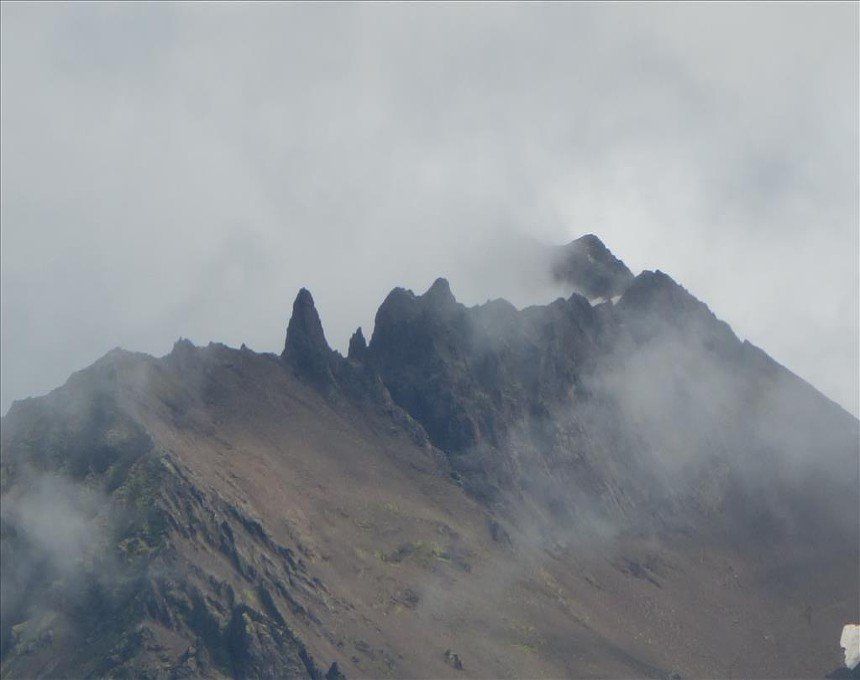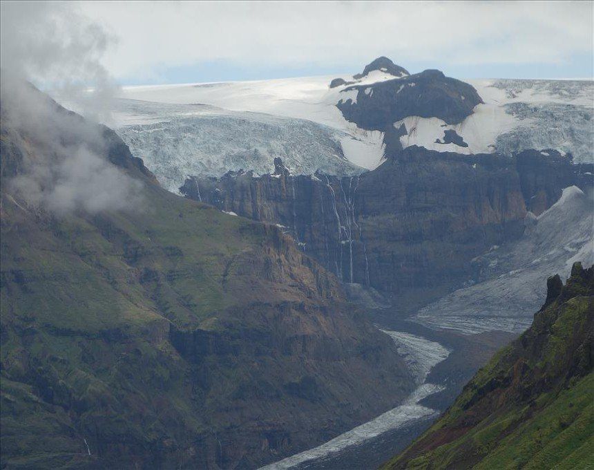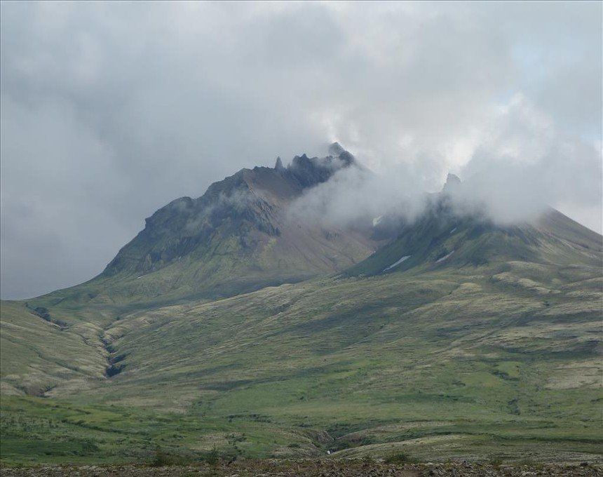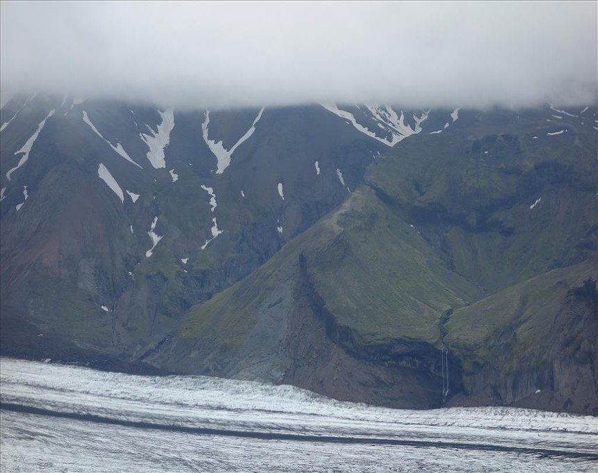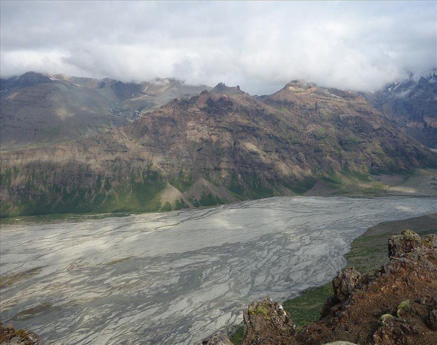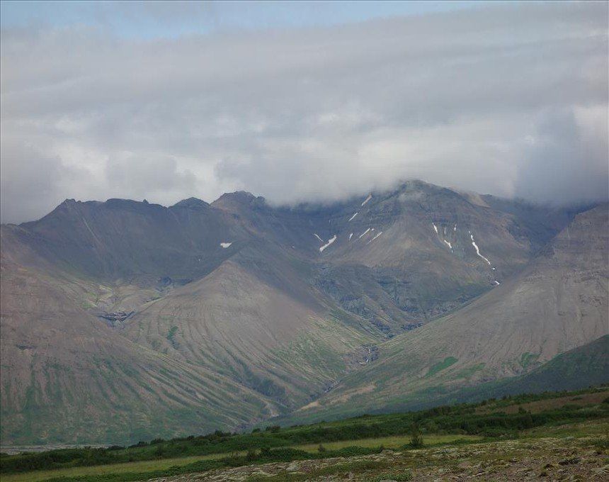 July 2014 – (with Gemma) Ascent from Skaftafell Visitor Centre. Today we rose early for a mountain hike up the 1126m peak, Kristinartindar. It was a simply magnificent climb with astounding views, exhilarating scrambling and knife edge arêtes; a 13 mile hike through changing scenery. Initially we climbed to Svartifoss, a wonderful waterfall with volcanic columns framing it. When we reached the flatter ridge, the views to the glacier and mountains to our west were excellent, including Iceland’s highest waterfall. We scrambled around here for a while, and then continued our ascent, with Gemma pausing to take in the flora and fungi! Eventually, we entered the corrie and ascended the scree to a col, where the views down to the glacier were tremendous. From here it was a steep climb and scramble to the summit which is set on an extremely narrow ridge. We sat here for an hour, enjoying our lunch and the occasional views through the clouds, in surprisingly warm weather. On the summit, there was a tremendous distant crashing noise, where we guessed a chunk of ice had fallen from the edge of a glacier into the water below. On the descent, we saw Snipes, Golden Plovers and a Ptarmigan with her chicks, all joyfully hopping around! The huge glacier of Skaftafellsjokull on the eastern side of the ridge was breathtaking, creating a contrast with the greenery and black rock. Iceland’s highest peak, Hvanndalsnukker, also occasionally popped out through the clouds.