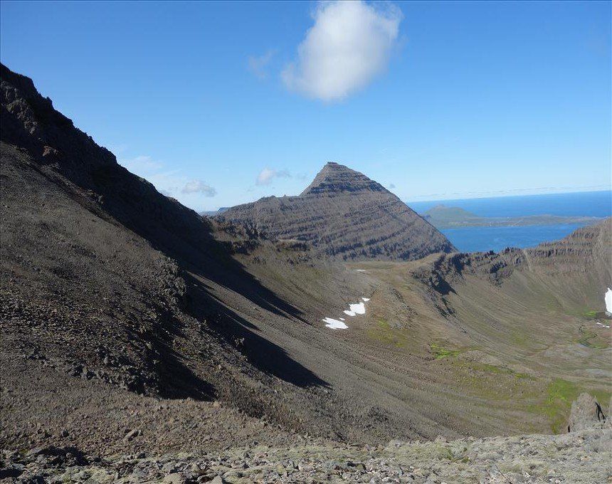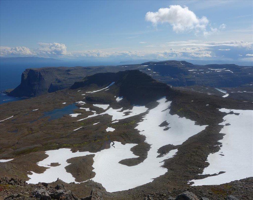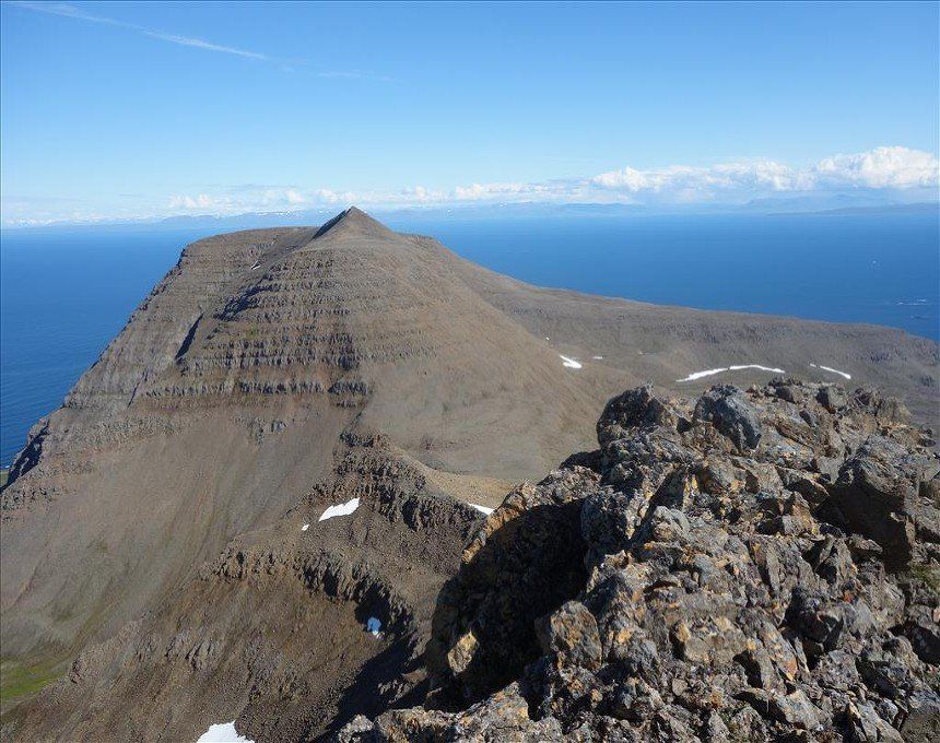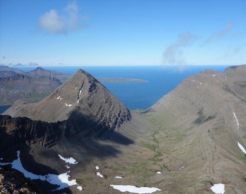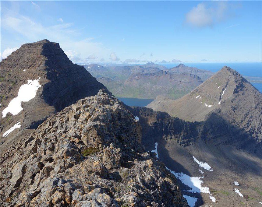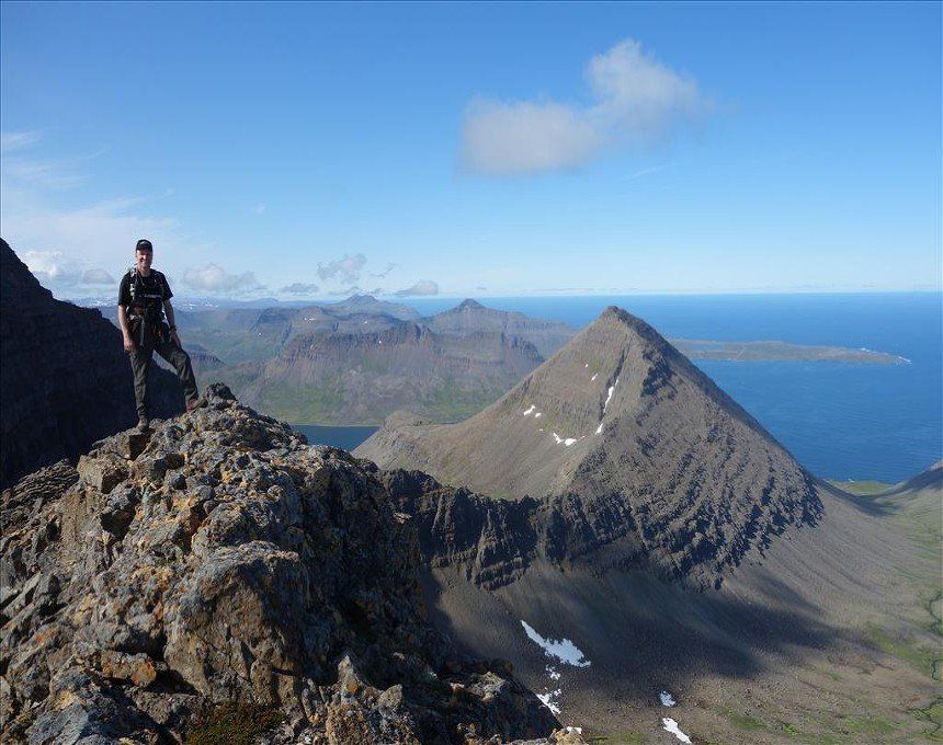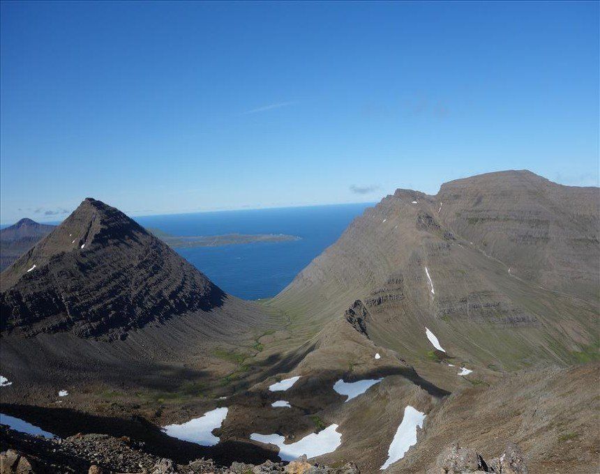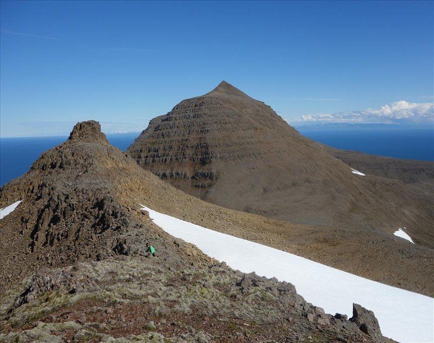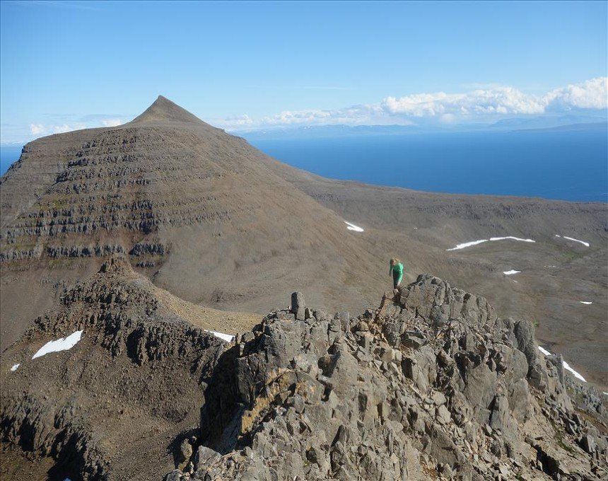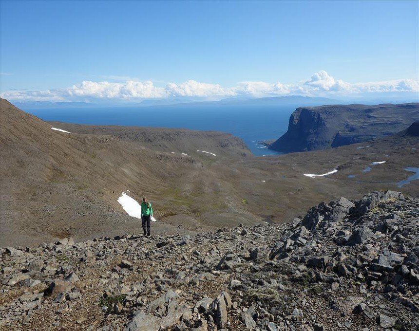 August 2014 - (with Gemma) A wonderful drive to the Westfjords today followed by an epic mountain climb! The drive was simply stunning in gorgeous weather. We stopped at Holmavik Information Centre and it was here that the mountain urge became insatiable! I identified Lambatindur (854m) about 45 minutes further around the fjords from our guesthouse for the night in Drangsnes. Gemma was initially reluctant but warmed to the idea as we rounded fjord after fjord and the scenery became more and more incredible. The mountains here are very reminiscent of the Cuillins of Skye, black rock rising in imposing, contorted shapes from the sea. The track to the start point was gravel with some hairpin bends and drops over the cliffs. Gemma was very critical of my driving! Never have we climbed in such an isolated area. We saw no one else or a single path for the entirety of the hike! Despite a path being mentioned on the map, there was none so it was instinct mostly. The climb alongside the gorge was steep and exposed at times, and there were several subsequent mini scrambles to negotiate before we arrived in a huge bowl. From here, we climbed up onto a ridge with stunning views and were left with a proper scramble to the summit which was tiny and offered breathtaking panoramas. We had some fun in the snowfields on the way down! Amazing walk. Later on in Drangsnes we soothed our aches and pains in the thermal hot tubs on the shore.