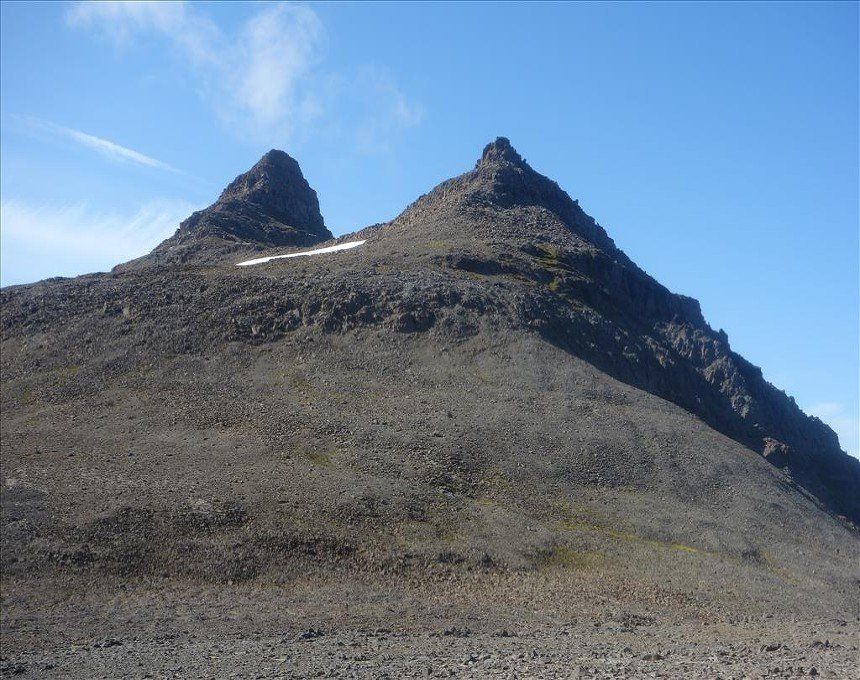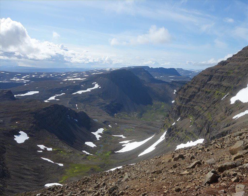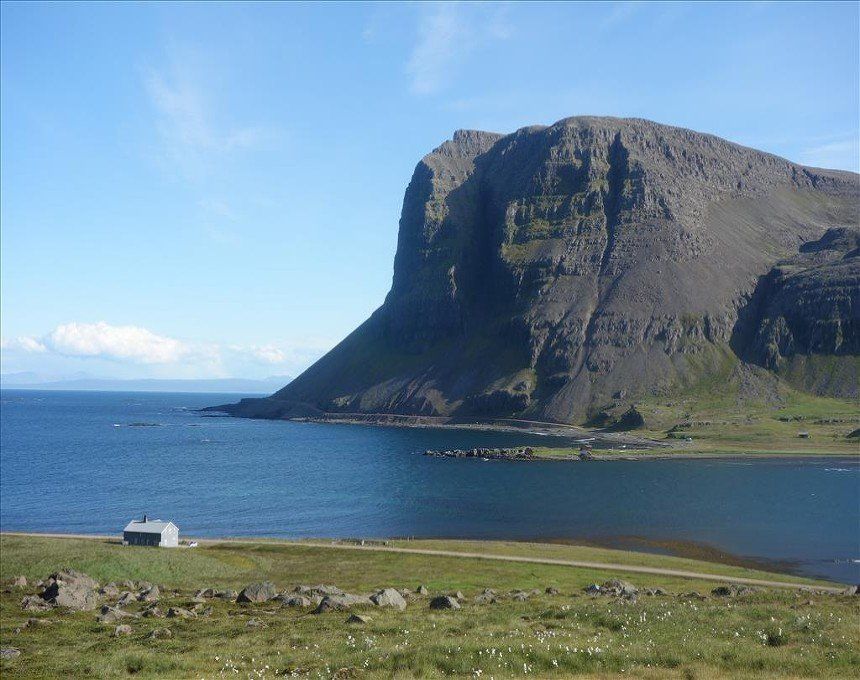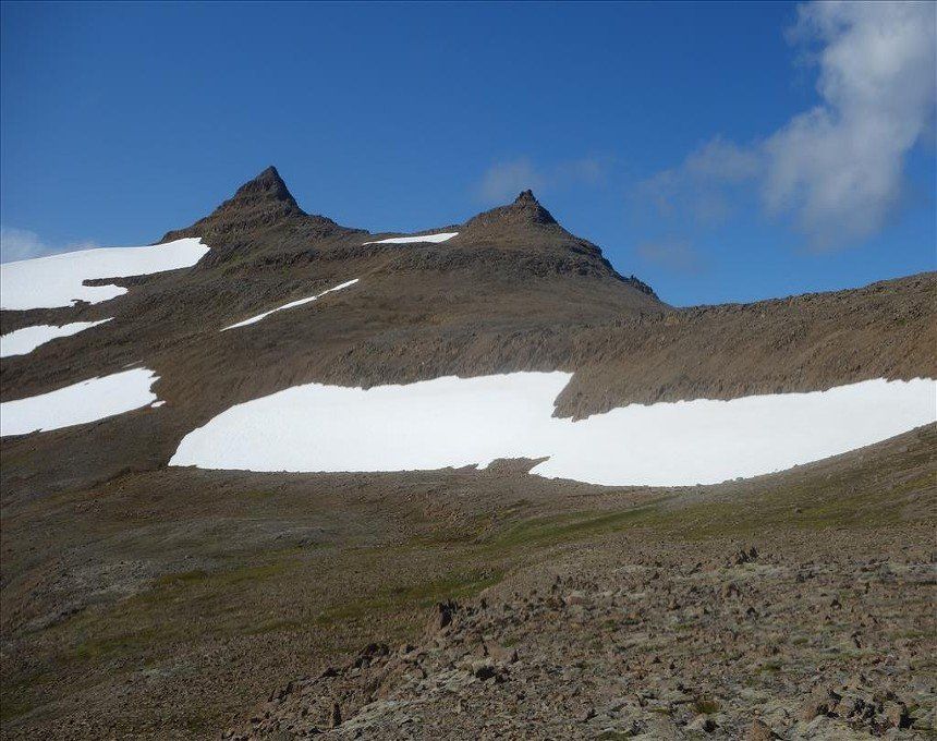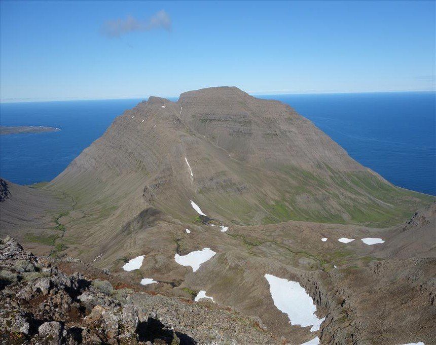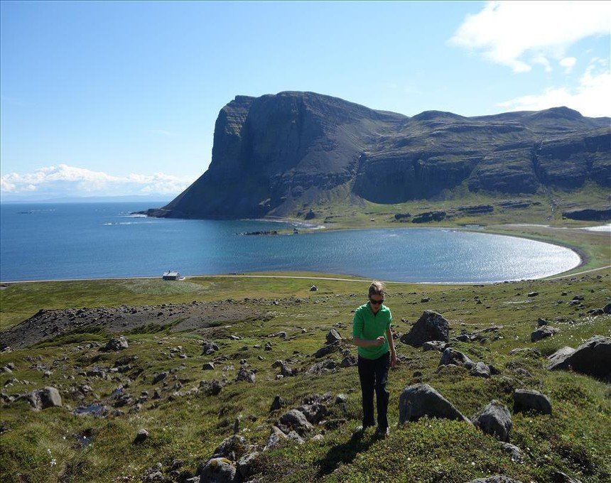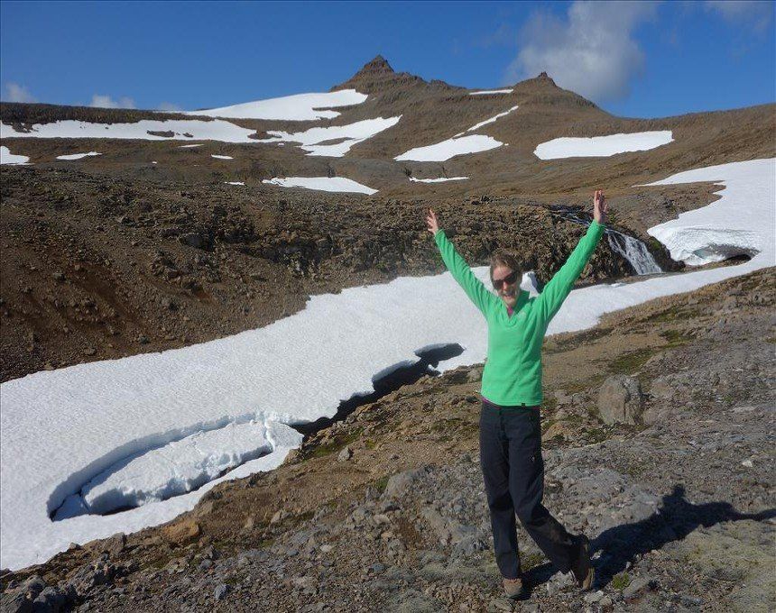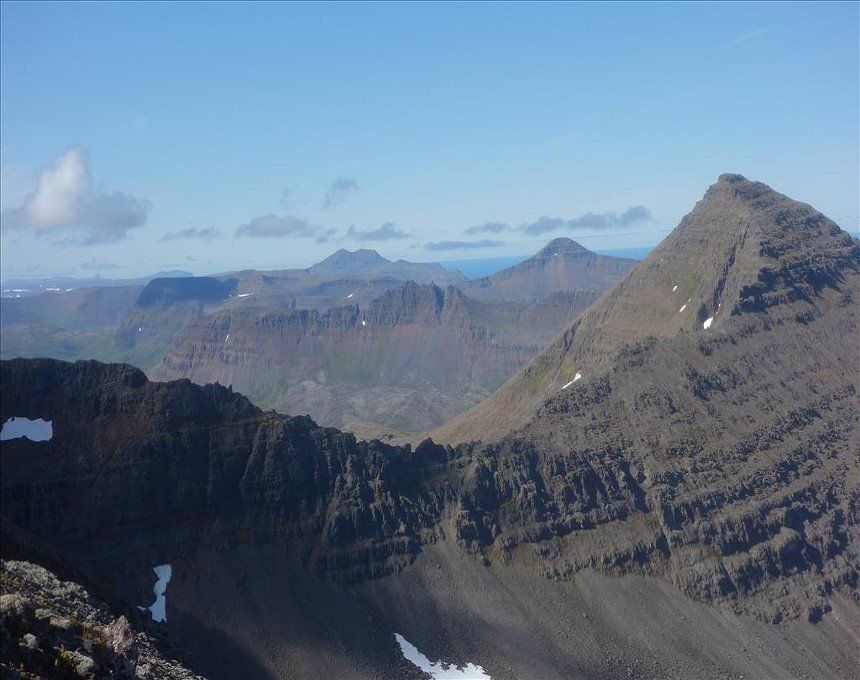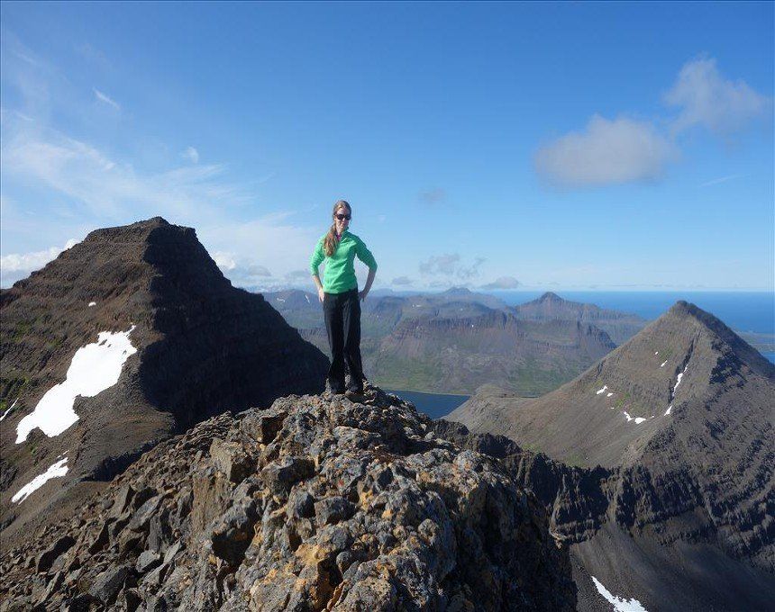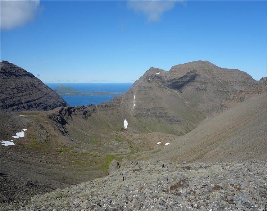 August 2014 - (with Gemma) A wonderful drive to the Westfjords today followed by an epic mountain climb! The drive was simply stunning in gorgeous weather. We stopped at Holmavik Information Centre and it was here that the mountain urge became insatiable! I identified Lambatindur (854m) about 45 minutes further around the fjords from our guesthouse for the night in Drangsnes. Gemma was initially reluctant but warmed to the idea as we rounded fjord after fjord and the scenery became more and more incredible. The mountains here are very reminiscent of the Cuillins of Skye, black rock rising in imposing, contorted shapes from the sea. The track to the start point was gravel with some hairpin bends and drops over the cliffs. Gemma was very critical of my driving! Never have we climbed in such an isolated area. We saw no one else or a single path for the entirety of the hike! Despite a path being mentioned on the map, there was none so it was instinct mostly. The climb alongside the gorge was steep and exposed at times, and there were several subsequent mini scrambles to negotiate before we arrived in a huge bowl. From here, we climbed up onto a ridge with stunning views and were left with a proper scramble to the summit which was tiny and offered breathtaking panoramas. We had some fun in the snowfields on the way down! Amazing walk. Later on in Drangsnes we soothed our aches and pains in the thermal hot tubs on the shore.