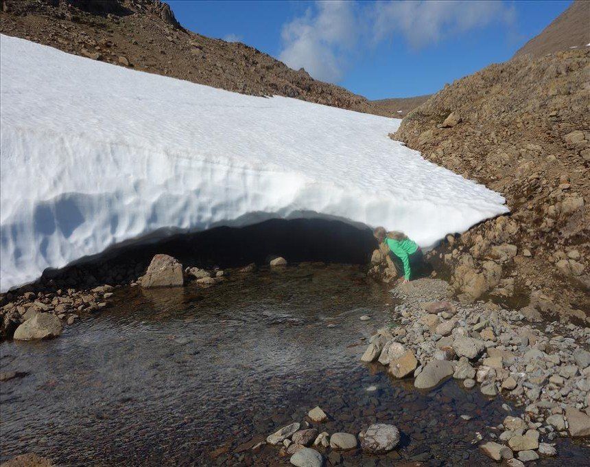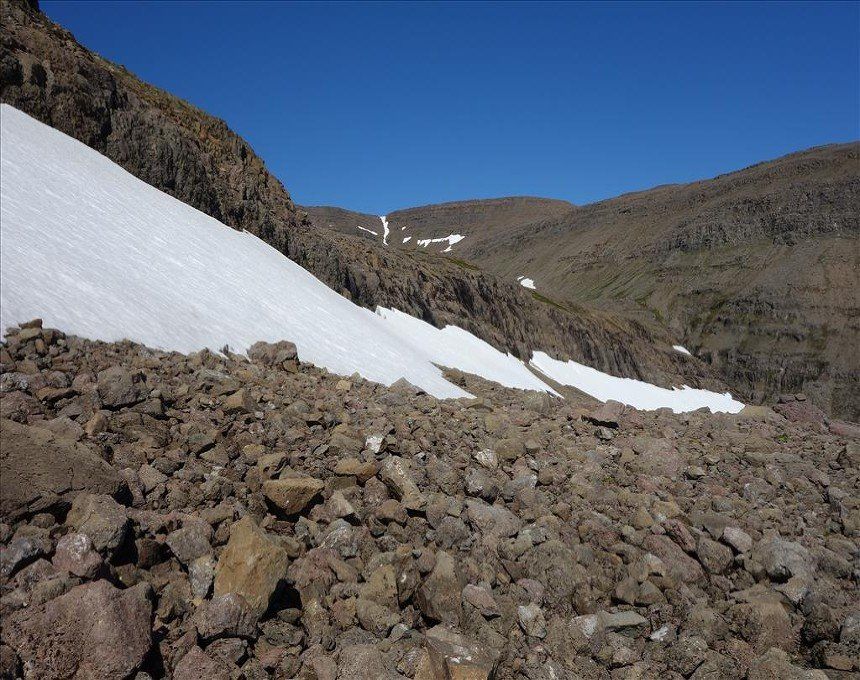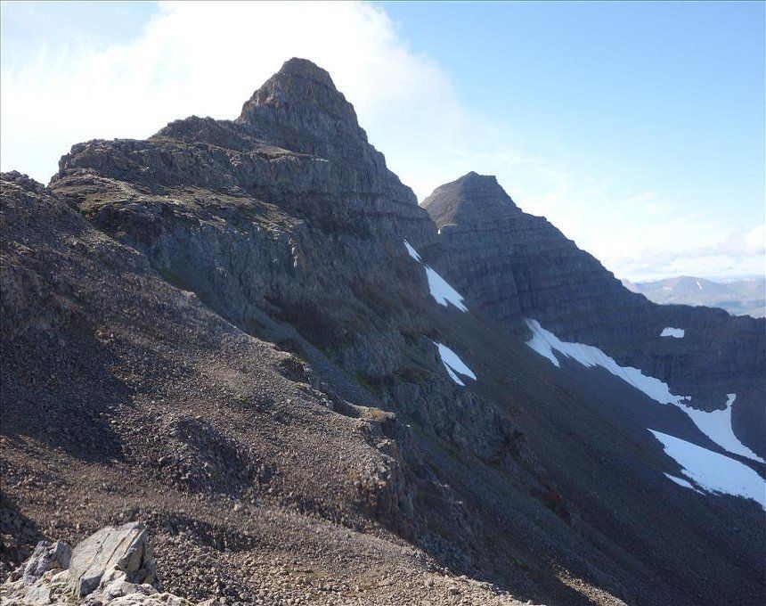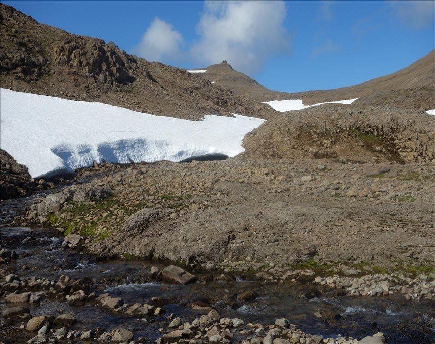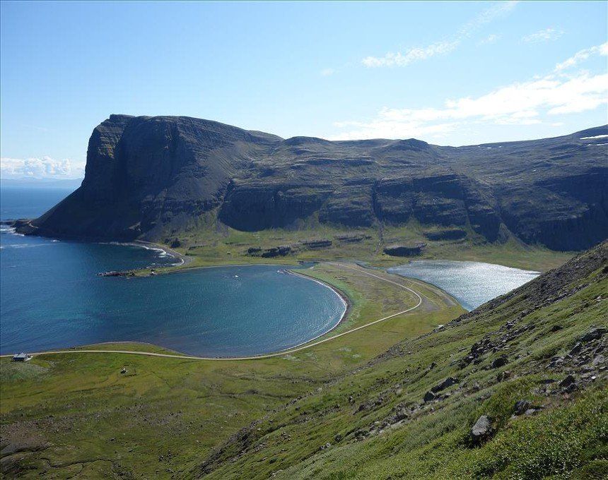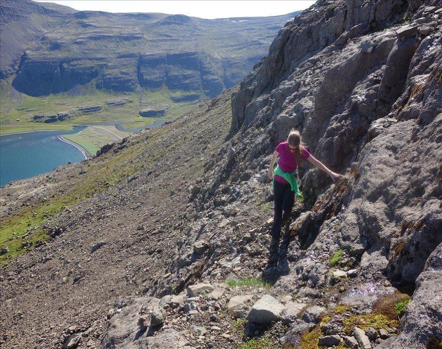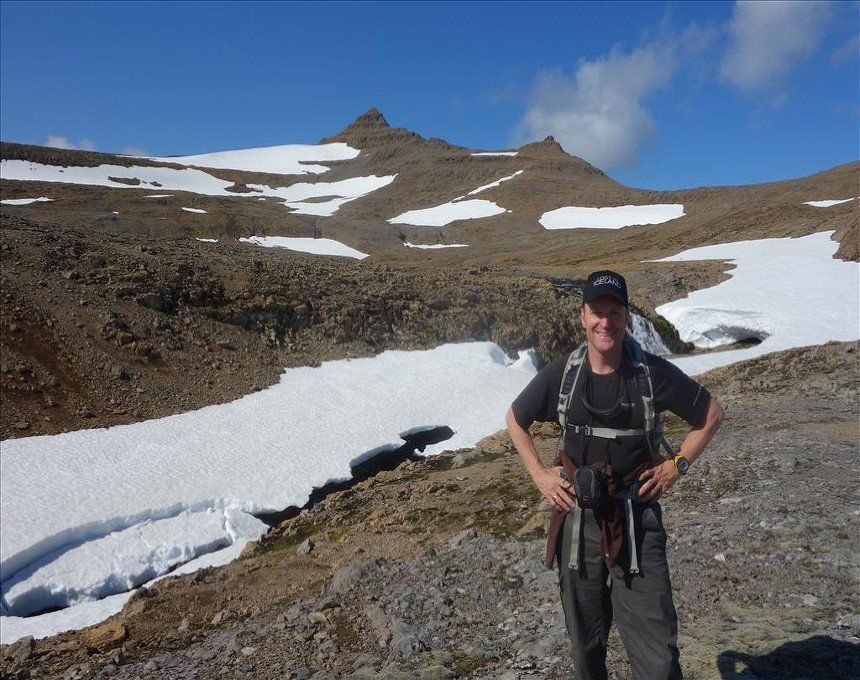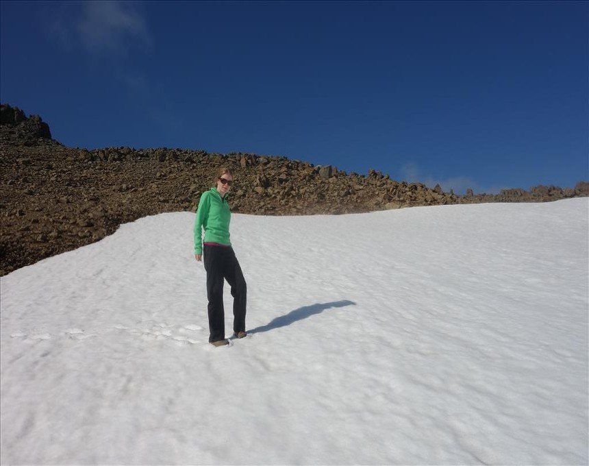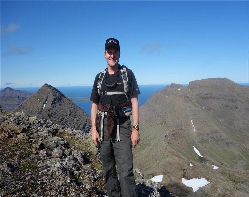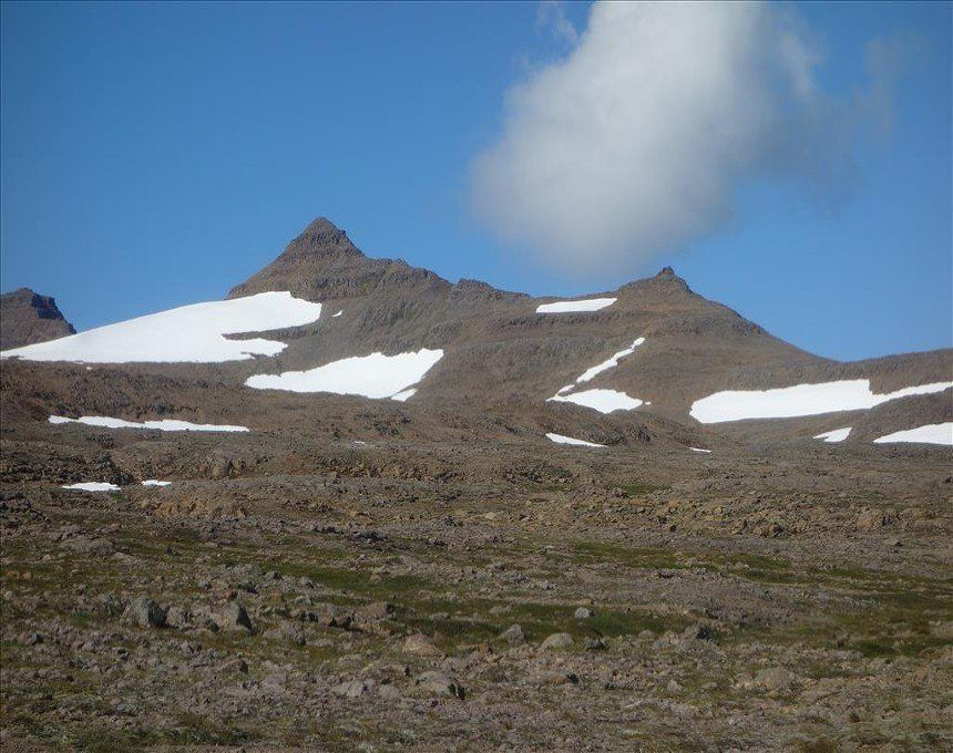 August 2014 - (with Gemma) A wonderful drive to the Westfjords today followed by an epic mountain climb! The drive was simply stunning in gorgeous weather. We stopped at Holmavik Information Centre and it was here that the mountain urge became insatiable! I identified Lambatindur (854m) about 45 minutes further around the fjords from our guesthouse for the night in Drangsnes. Gemma was initially reluctant but warmed to the idea as we rounded fjord after fjord and the scenery became more and more incredible. The mountains here are very reminiscent of the Cuillins of Skye, black rock rising in imposing, contorted shapes from the sea. The track to the start point was gravel with some hairpin bends and drops over the cliffs. Gemma was very critical of my driving! Never have we climbed in such an isolated area. We saw no one else or a single path for the entirety of the hike! Despite a path being mentioned on the map, there was none so it was instinct mostly. The climb alongside the gorge was steep and exposed at times, and there were several subsequent mini scrambles to negotiate before we arrived in a huge bowl. From here, we climbed up onto a ridge with stunning views and were left with a proper scramble to the summit which was tiny and offered breathtaking panoramas. We had some fun in the snowfields on the way down! Amazing walk. Later on in Drangsnes we soothed our aches and pains in the thermal hot tubs on the shore.