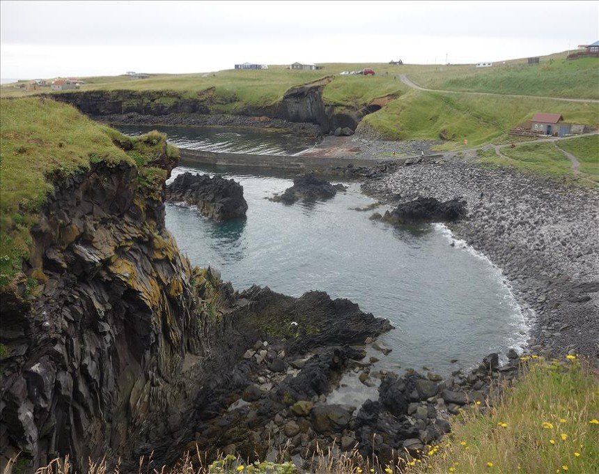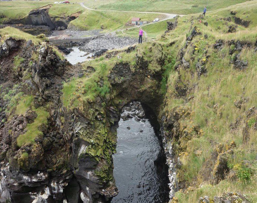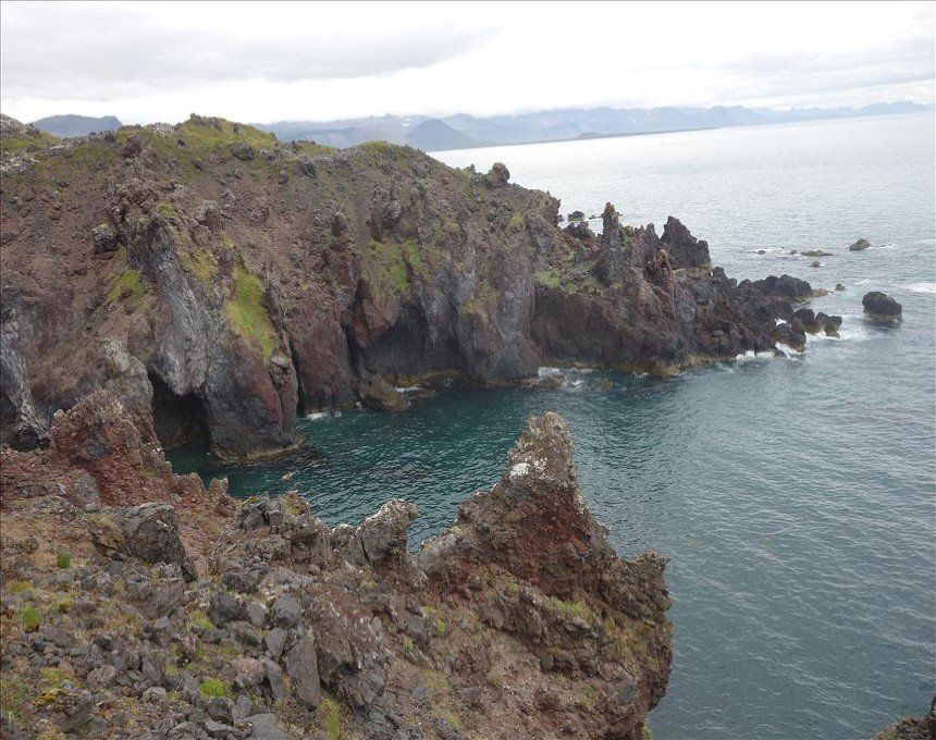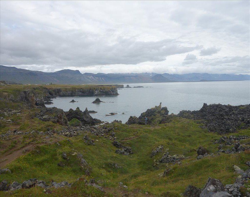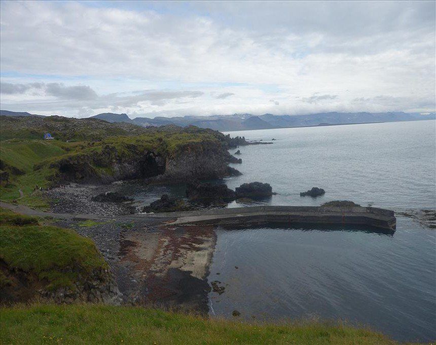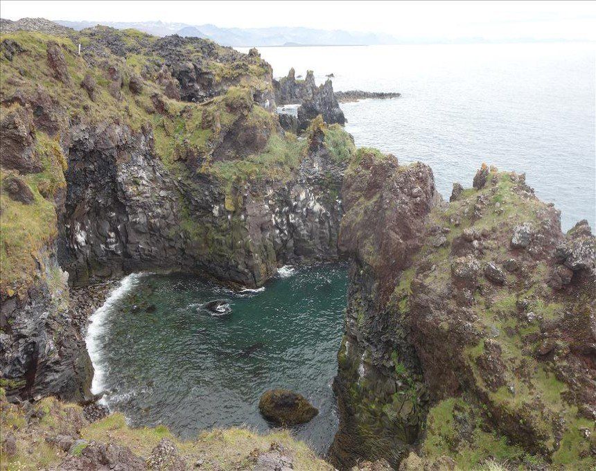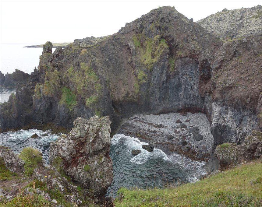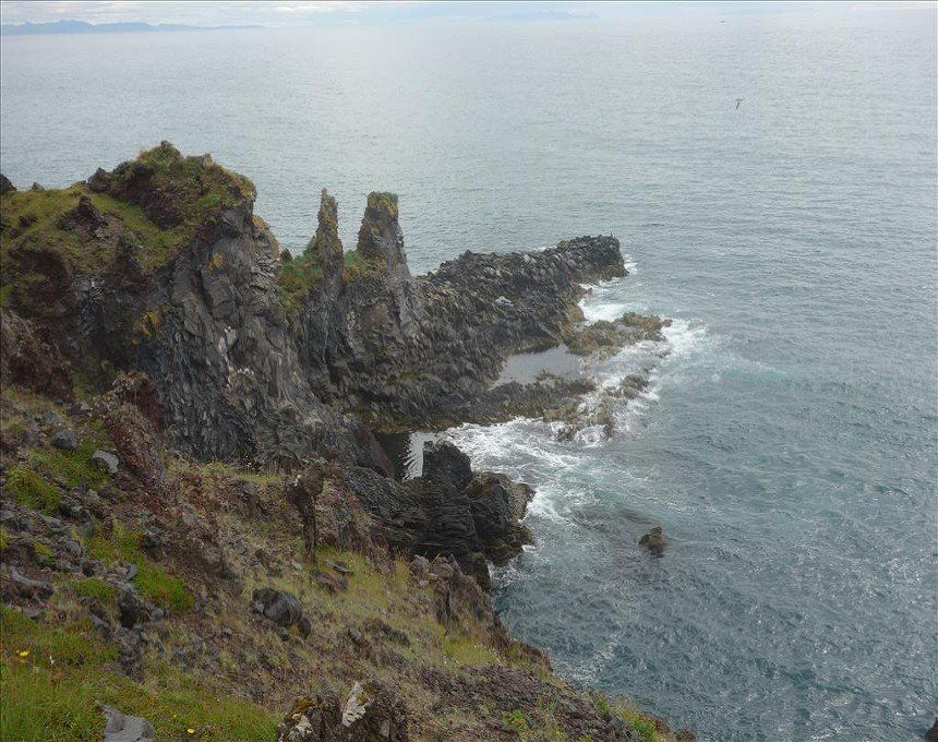 Aug 2014 - (with Gemma) Gemma got attacked by Artic Terns today! We drove a short distance south over the Snaefellsnes peninsula to Hellnar where we enjoyed a fantastic coastal walk to Arnstarpi and back. We spent ages exploring the various caves, sea stacks and contorted shapes of this basalt coastline; scrambling up and over things here and there. The area is teeming with raucous birds (as Gemma discovered!) The tiny harbour was a wonderful example to fishing in these waters, as we watched a boat return and unload its ice boxes full of fish.