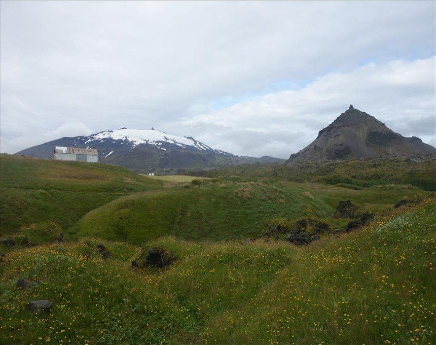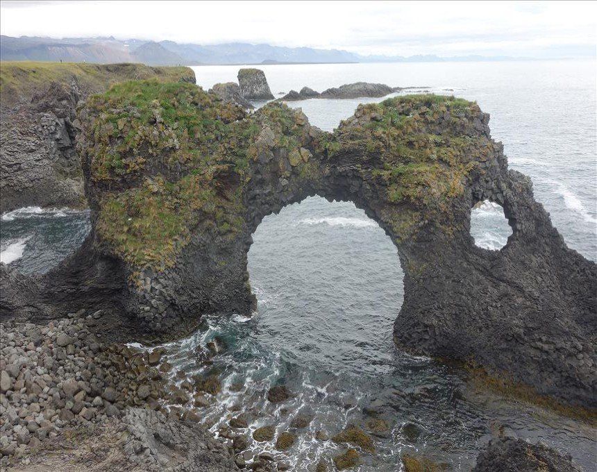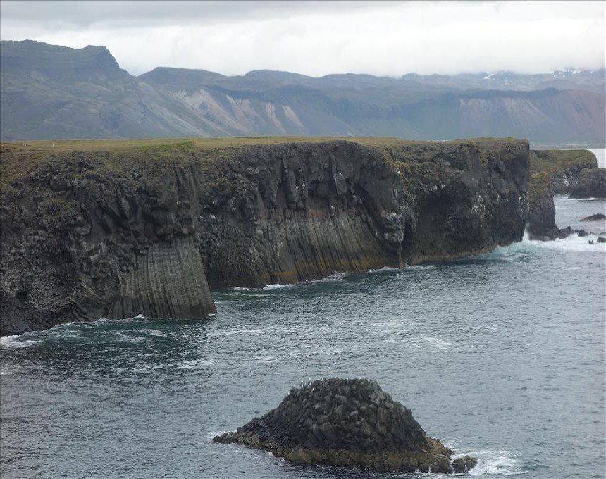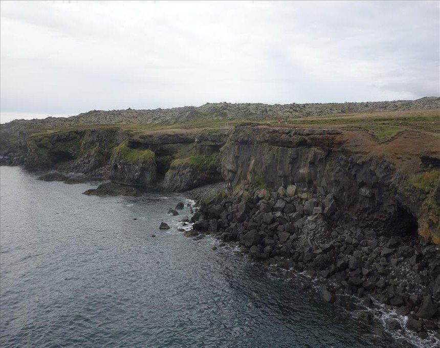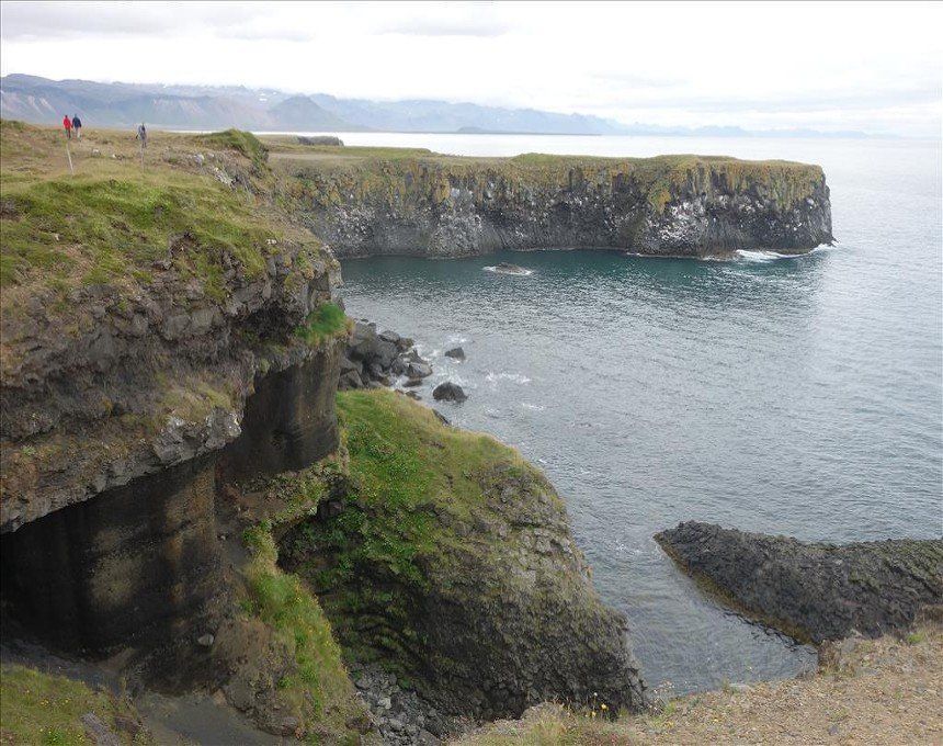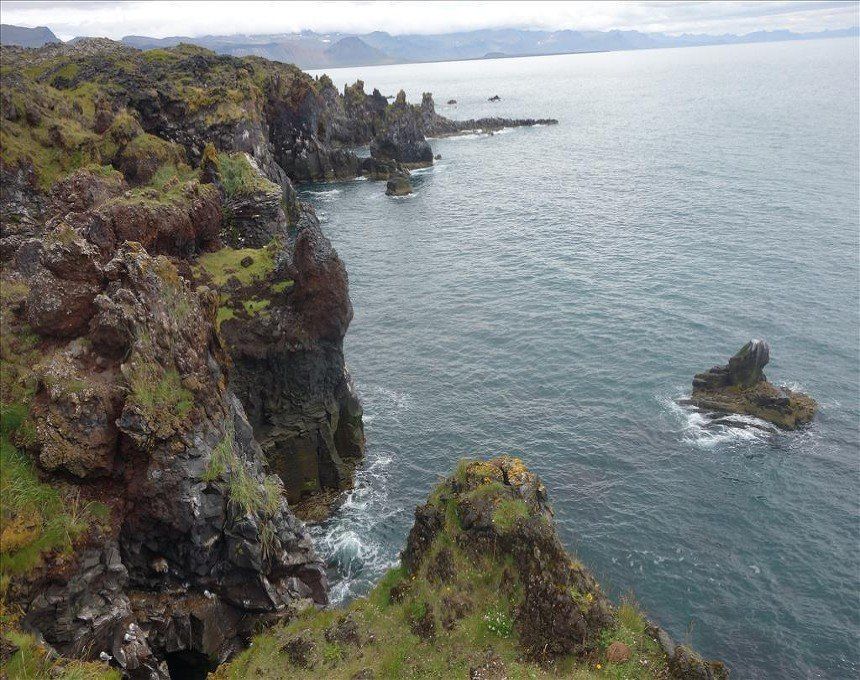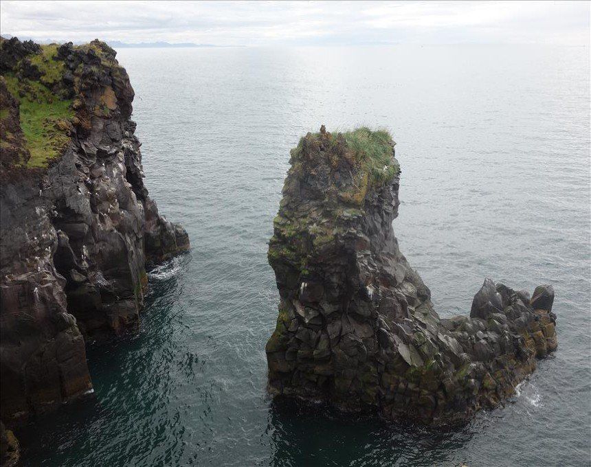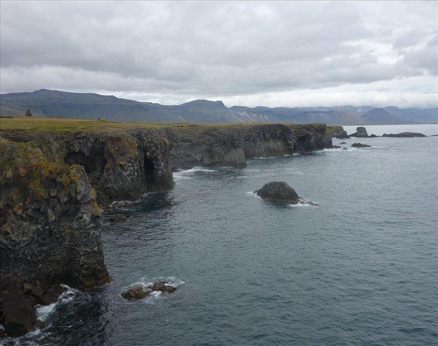 Aug 2014 - (with Gemma) Gemma got attacked by Artic Terns today! We drove a short distance south over the Snaefellsnes peninsula to Hellnar where we enjoyed a fantastic coastal walk to Arnstarpi and back. We spent ages exploring the various caves, sea stacks and contorted shapes of this basalt coastline; scrambling up and over things here and there. The area is teeming with raucous birds (as Gemma discovered!) The tiny harbour was a wonderful example to fishing in these waters, as we watched a boat return and unload its ice boxes full of fish.