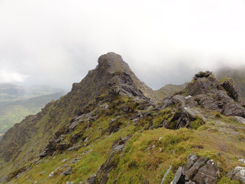 Aug 2012 (with Gemma) Ascent from Lislebane. Today was a walk of two halves. The first, a delightful route with close up, stunning rock scenery and plenty of exhilarating scrambling, the second a scary, exposed traverse of the Reeks Ridge with a great deal of wavering composure! After a brilliant scramble up Brother O’ Shea’s Gully onto the Beenkeragh Ridge, we ascended steeply to the summit of Carrantuohill which offered incredible panoramas and a geocache. From there we descended and ascended multiple times across the Reeks Ridge which was pulsating and absolutely required concentration which was difficult at times due to our weary legs. The section from Knocknapeasta to Cruach Mhor was really challenging and I lost my nerve a few times. It terrifies me to watch Gemma scrambling over exposed, knife edged ridges or down slippery rock slabs with no hand holds whatsoever. She does so well. To my horror, I realised I’d failed to bring my phone with me (first time ever) and we were still 950m up at 6:00pm. My mum was going spare back at the guest house and even called the Killarney Police to try to co-ordinate a search! When we arrived back at 8:30pm I had some explaining to do! Also we saw mountain goats and a startled mountain hare. An adventure today to say the least.