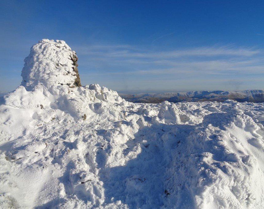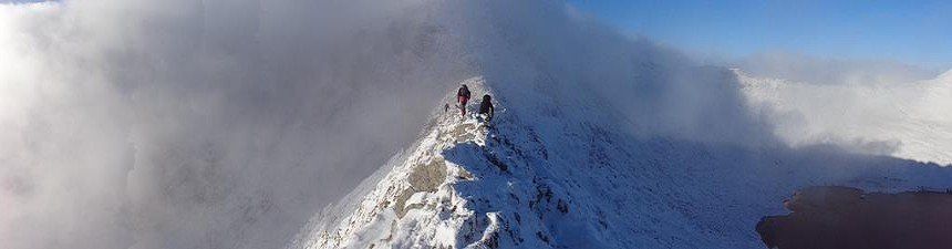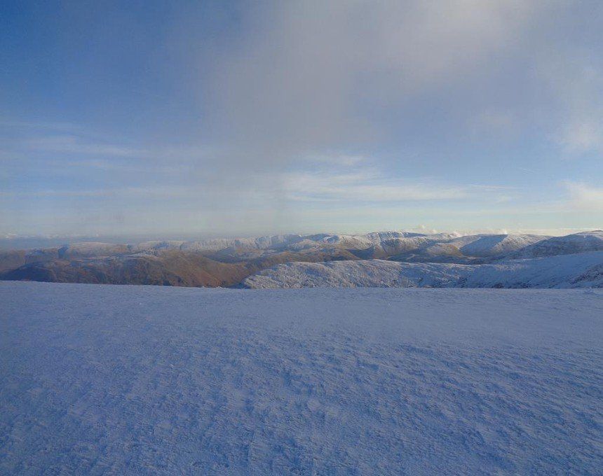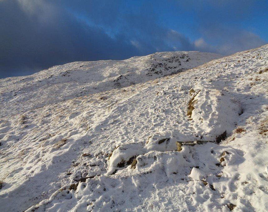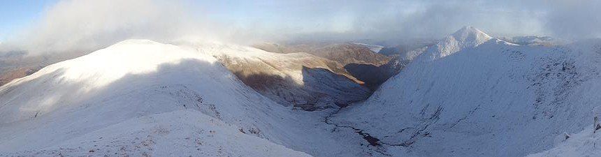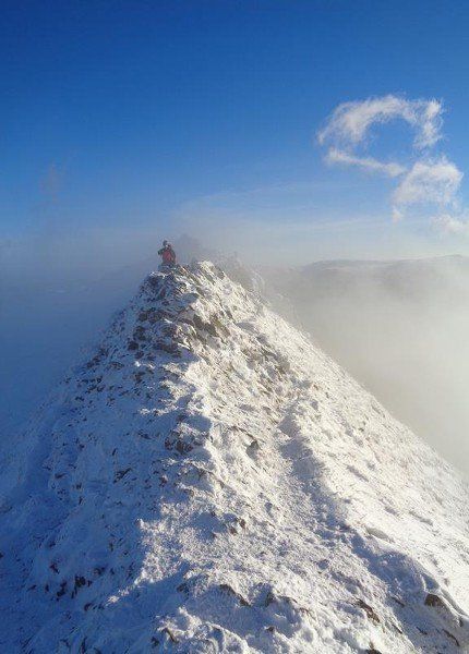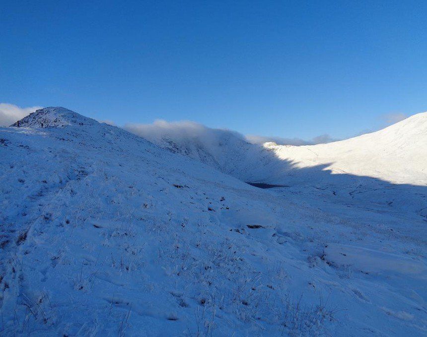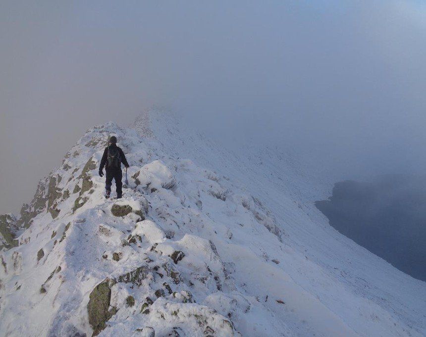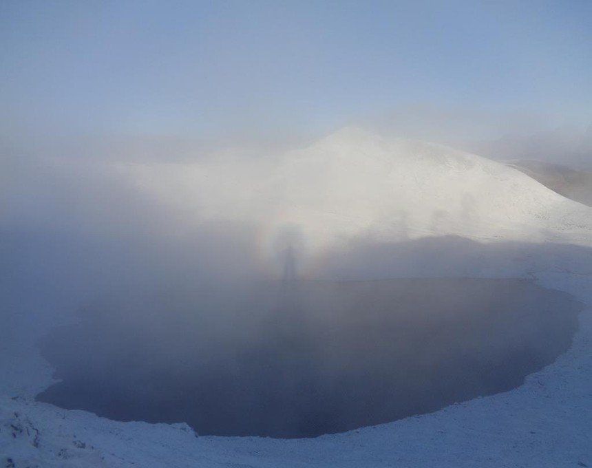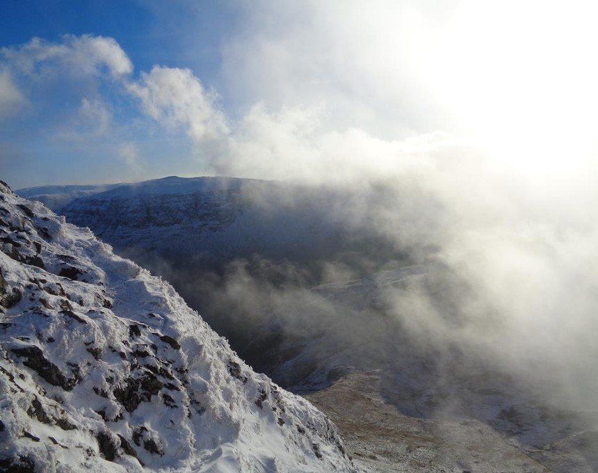 Dec 2014 – Ascent from Glenridding. Another gorgeous day so I drove to Ullswater for the ascent. The climb up Mires Beck to Birkhouse Moor was great and, on the summit, I met a chap from Yorkshire and shared many mountain tales as we crossed to the Hole in the Wall and up onto the Edge. Crampons were on by now and there were many without them turning back. First time for me tackling Striding Edge in snow and it was fabulous with moody, swirling clouds providing atmosphere and a Brocken spectre tracking me above Swirral Edge! Ice axe was needed on the scramble to the summit where I had lunch. Here, my Yorkshire buddy and I parted company. On the crossing over Lower Man and Whiteside towards Raise I saw another two Brocken spectres! The descent via Sticks Pass was great, passing through the remains of the Greenside Lead Mines.