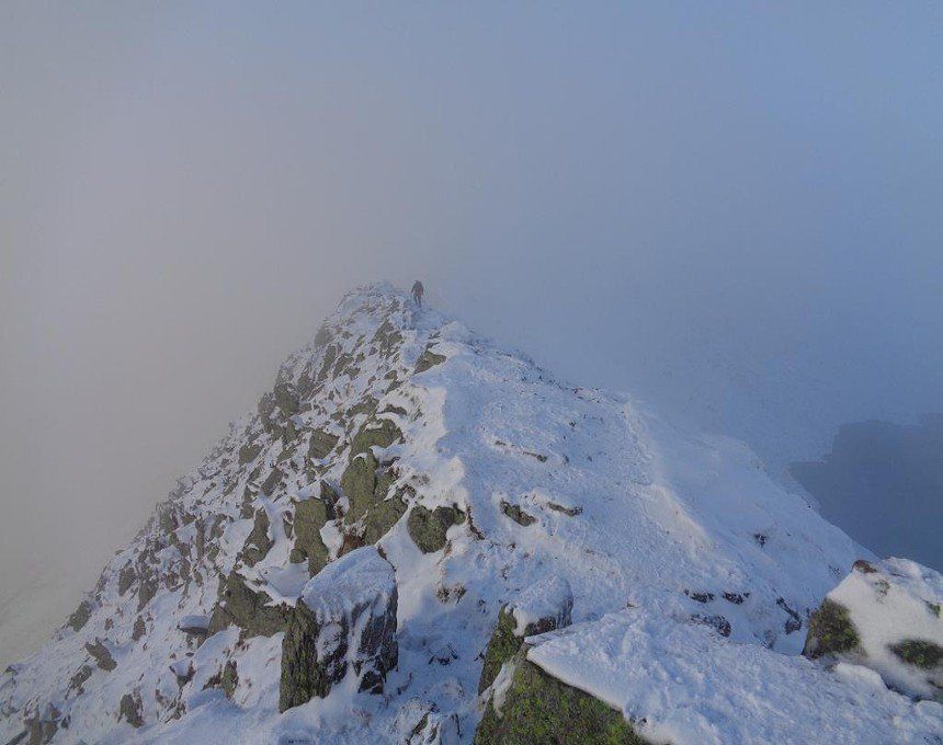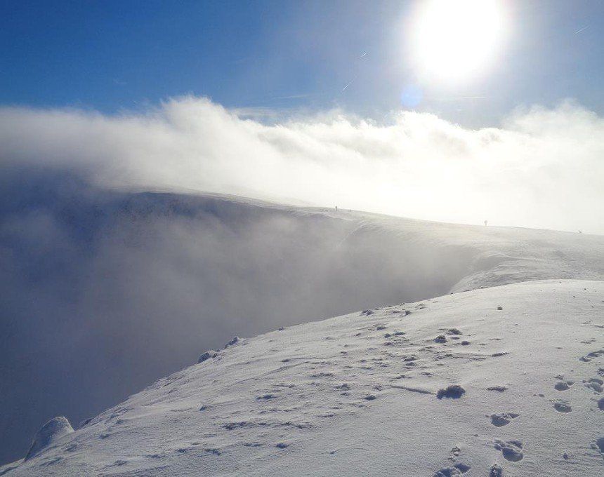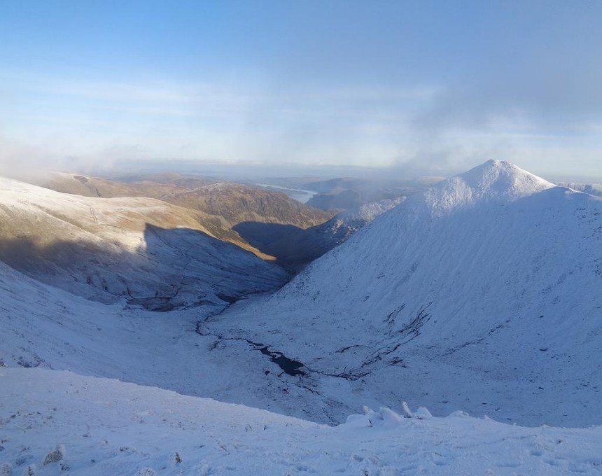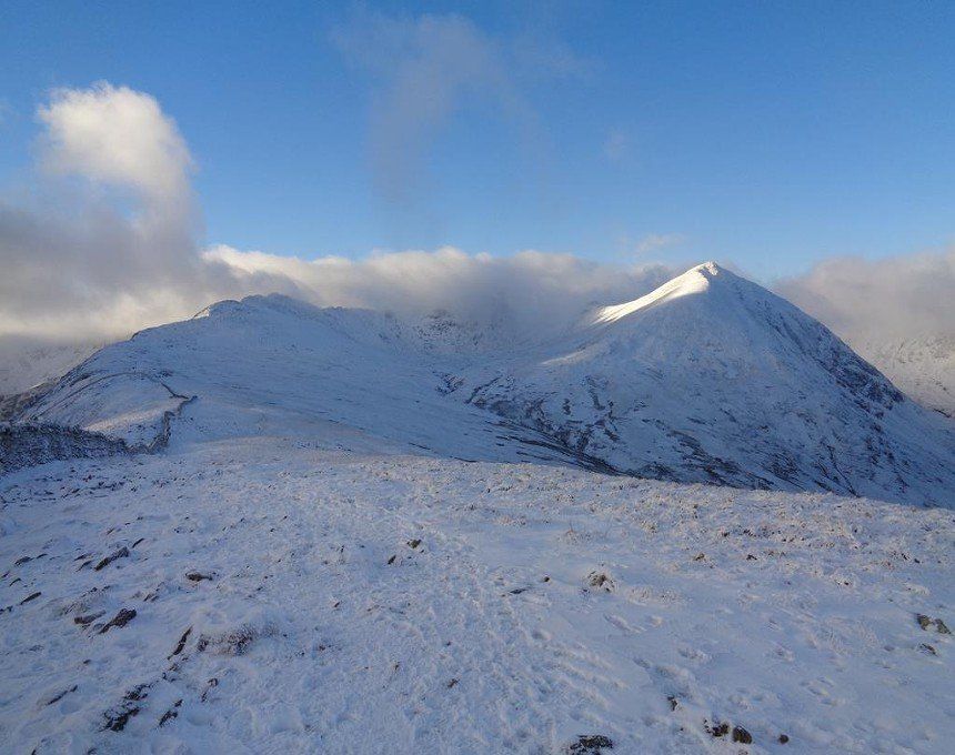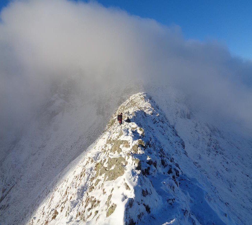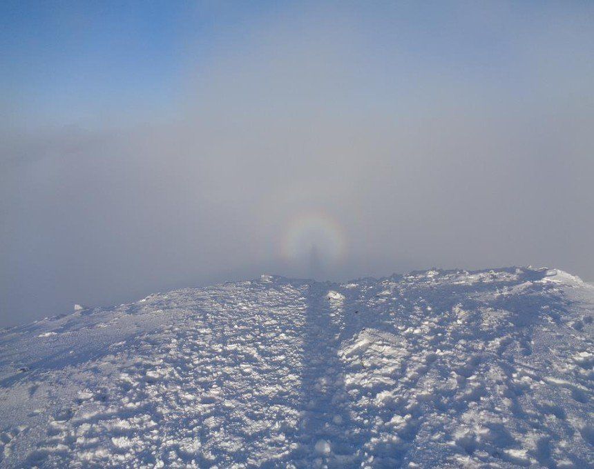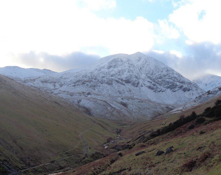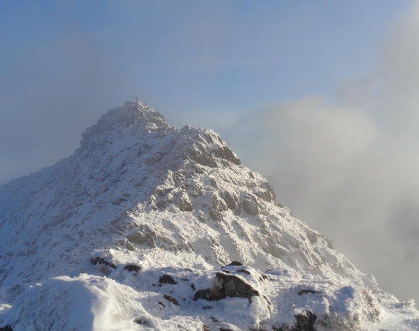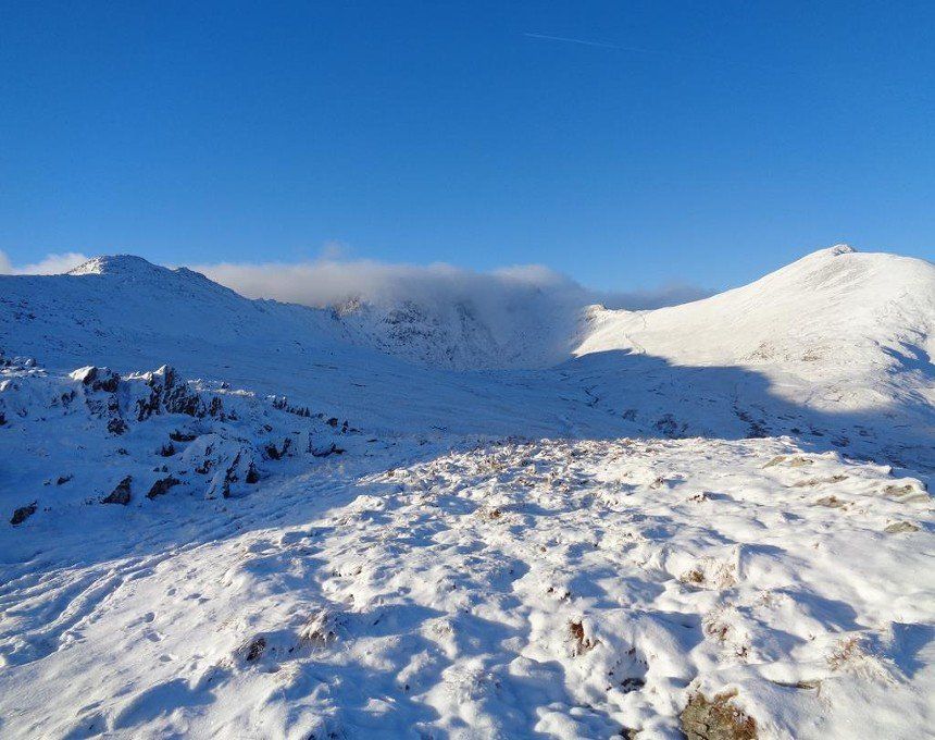 Dec 2014 – Ascent from Glenridding. Another gorgeous day so I drove to Ullswater for the ascent. The climb up Mires Beck to Birkhouse Moor was great and, on the summit, I met a chap from Yorkshire and shared many mountain tales as we crossed to the Hole in the Wall and up onto the Edge. Crampons were on by now and there were many without them turning back. First time for me tackling Striding Edge in snow and it was fabulous with moody, swirling clouds providing atmosphere and a Brocken spectre tracking me above Swirral Edge! Ice axe was needed on the scramble to the summit where I had lunch. Here, my Yorkshire buddy and I parted company. On the crossing over Lower Man and Whiteside towards Raise I saw another two Brocken spectres! The descent via Sticks Pass was great, passing through the remains of the Greenside Lead Mines.