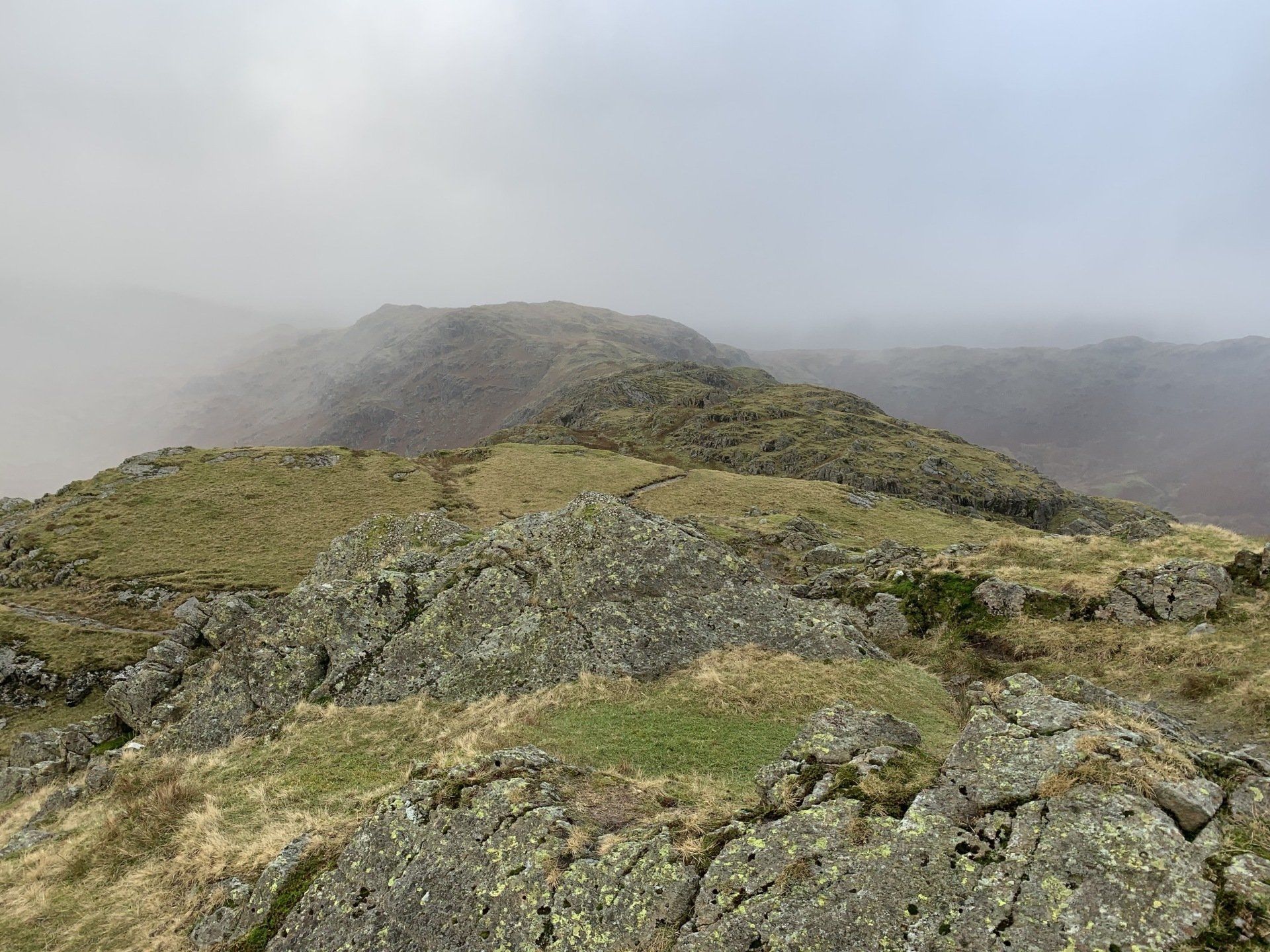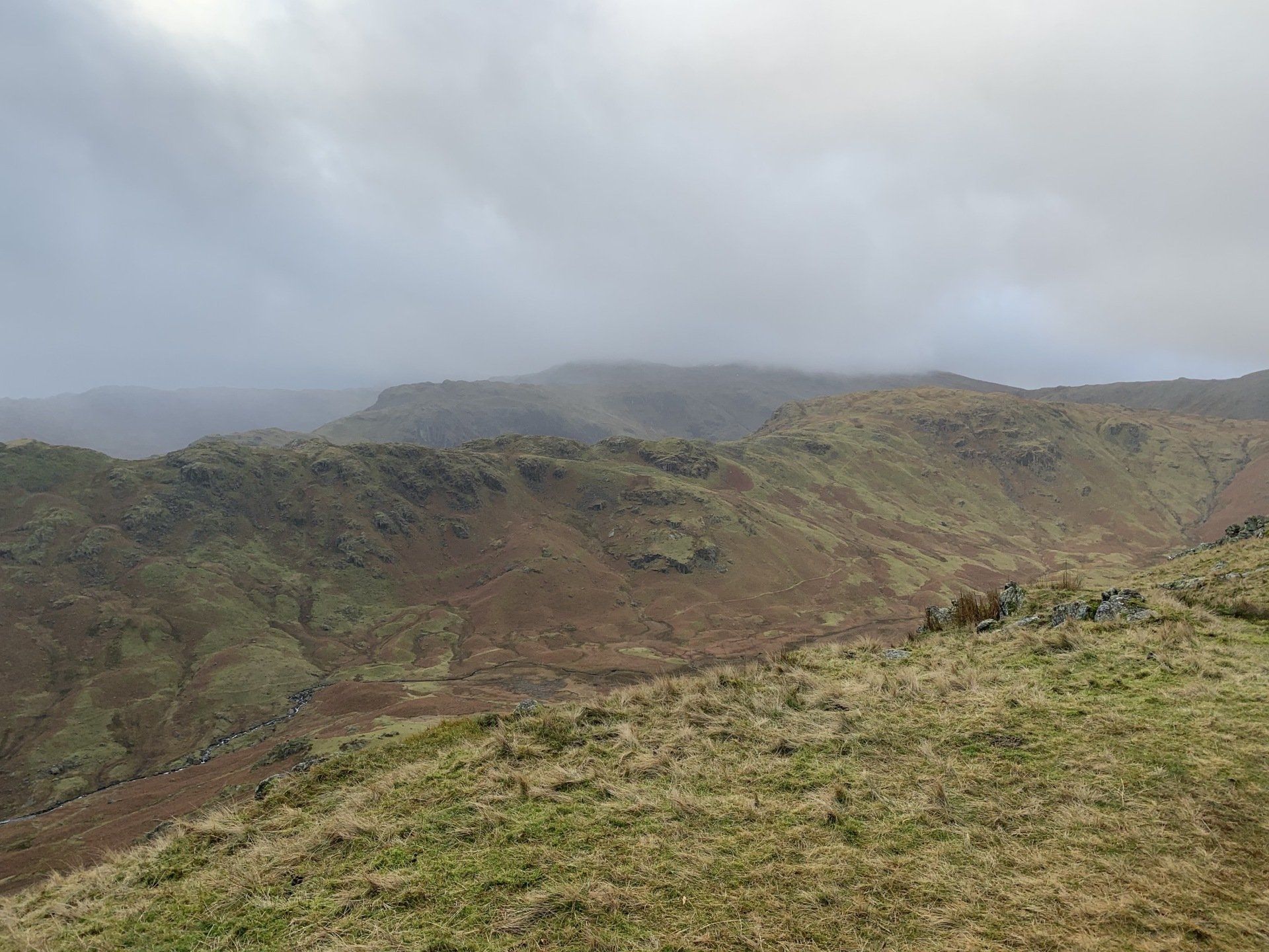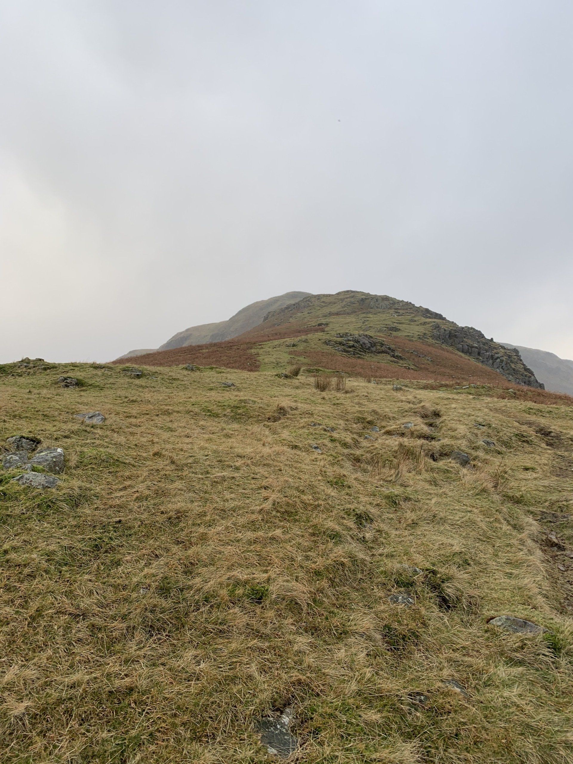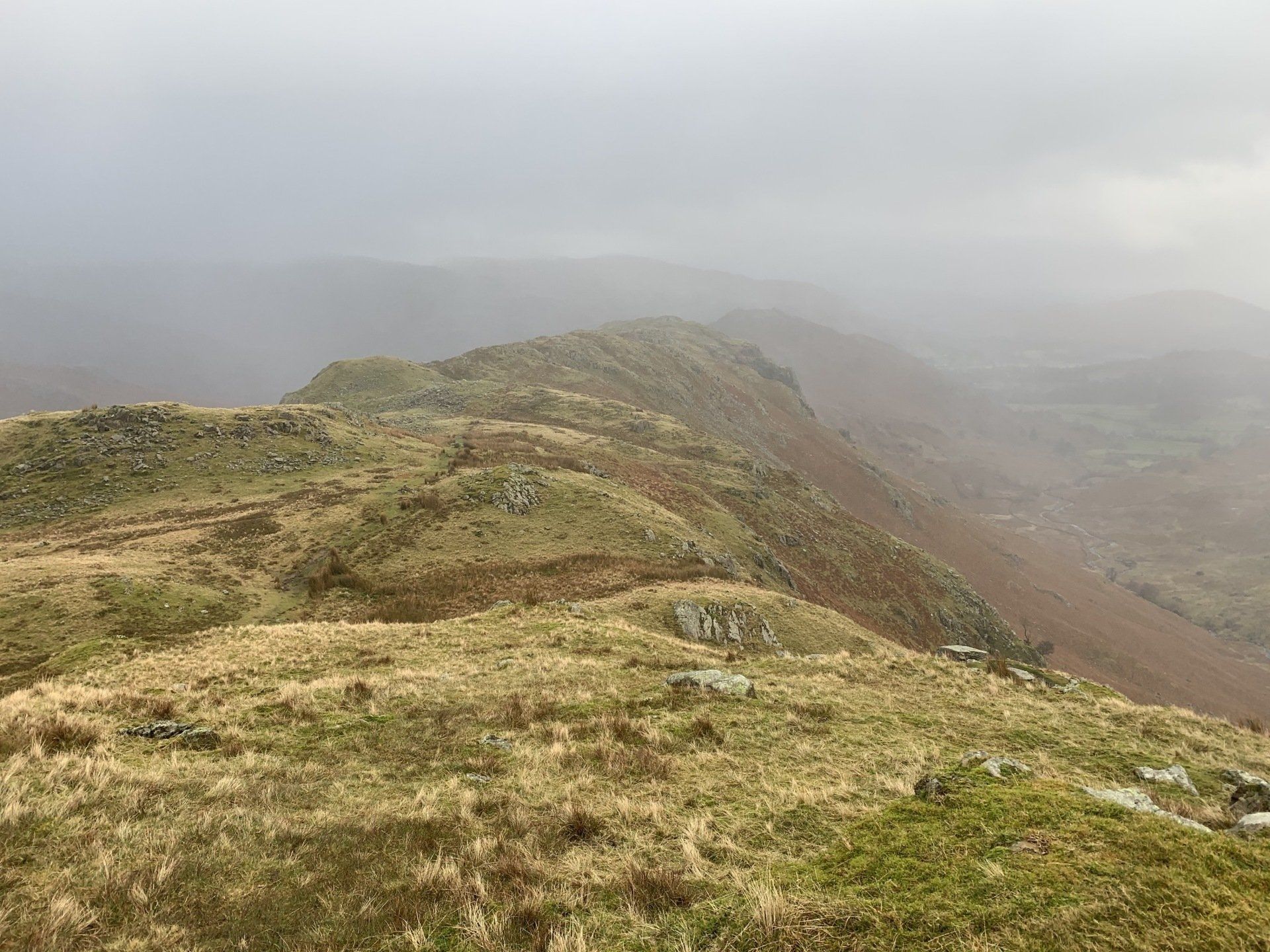 Jan 2020 - Ascent from Town Head. Final walk, this time around. Bus to Town Head and then the ascent of Steel Fell with the crags of the bizarrely named Cotra Breast for company. The views up through the equally oddly named Greenburn Bottom were lovely, despite the hanging cloud. I rounded the head of the valley to Calf Crag before the the traverse of the enjoyable, undulating ridge back to Helm Crag via Gibson Knott. Dropped down to Grasmere.