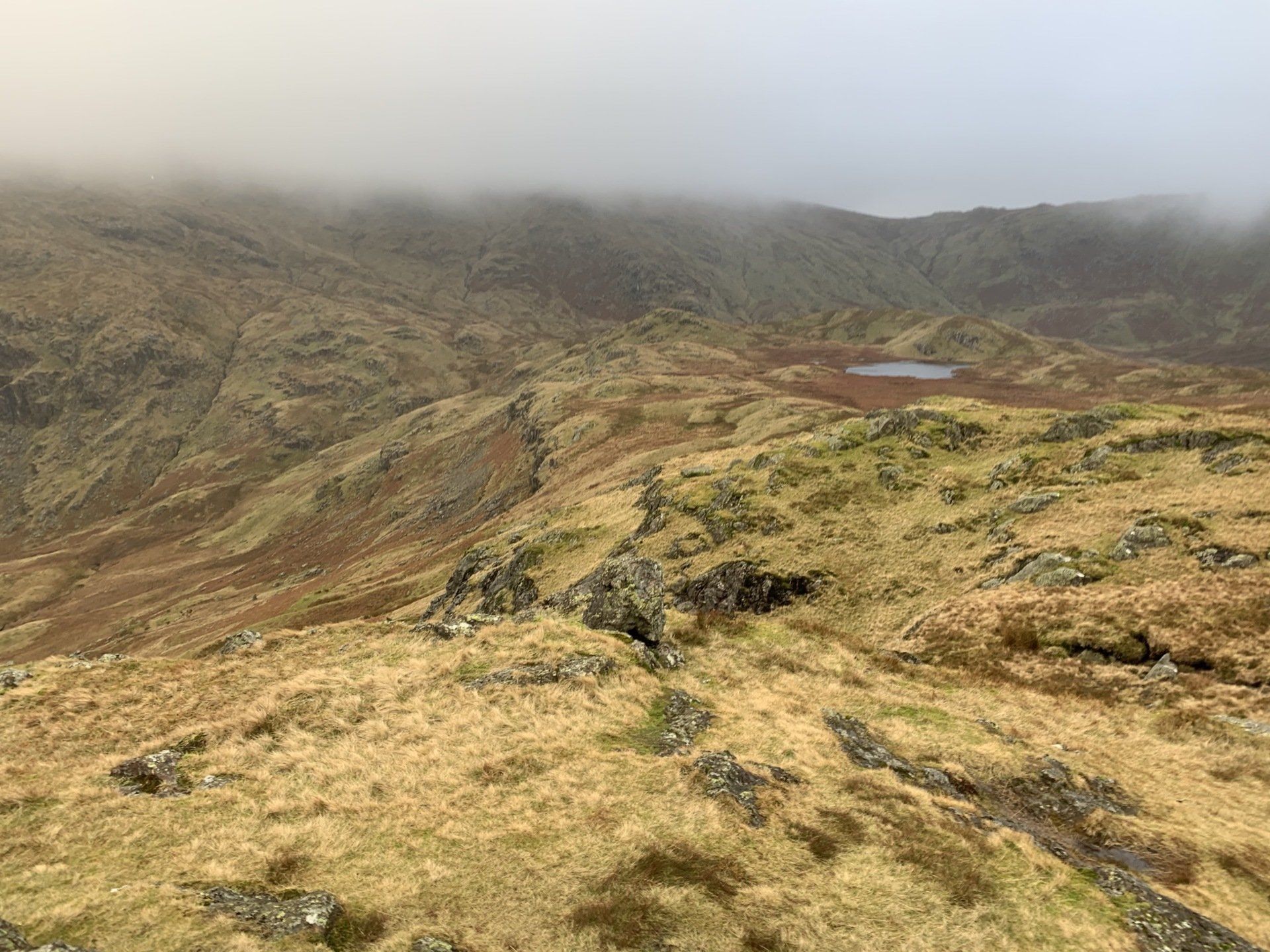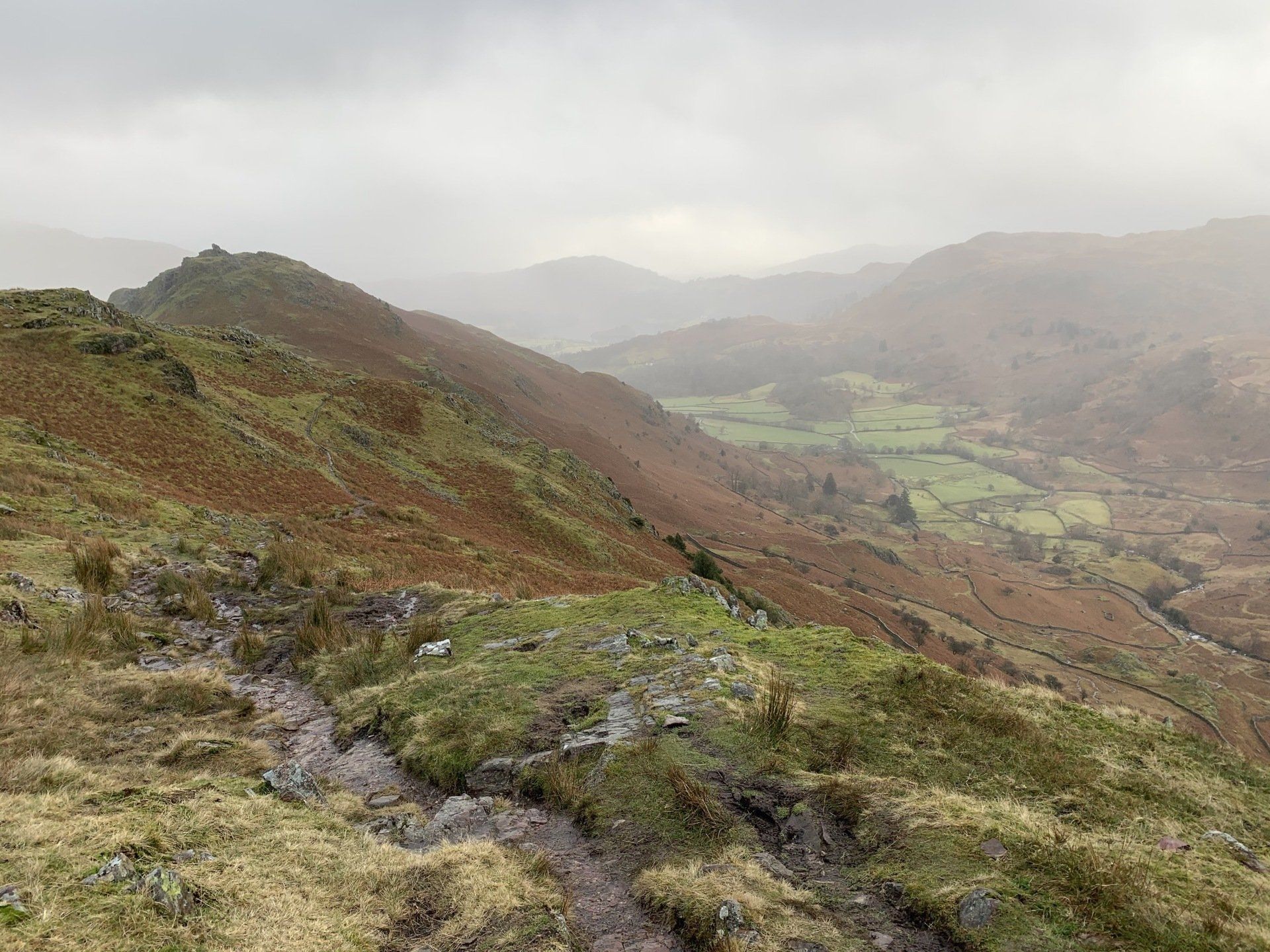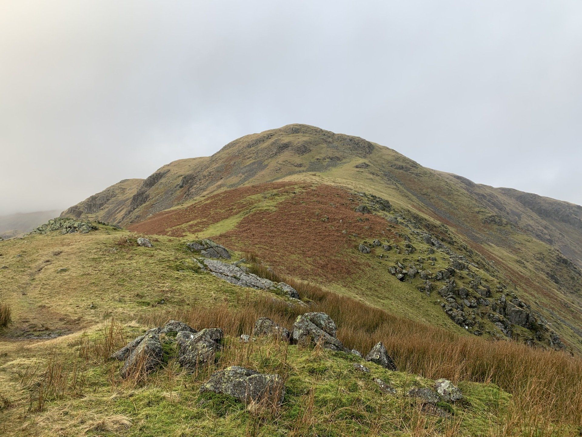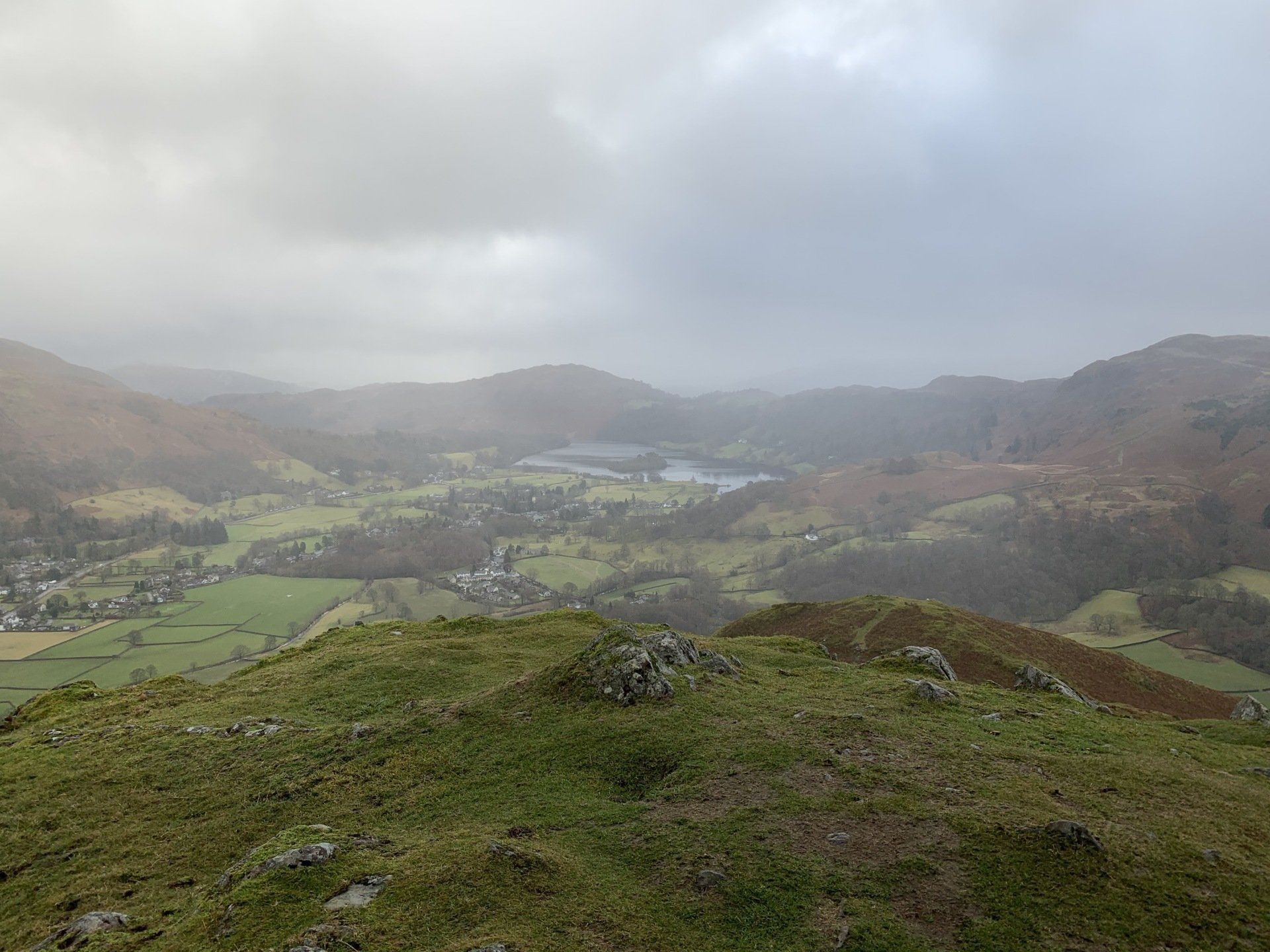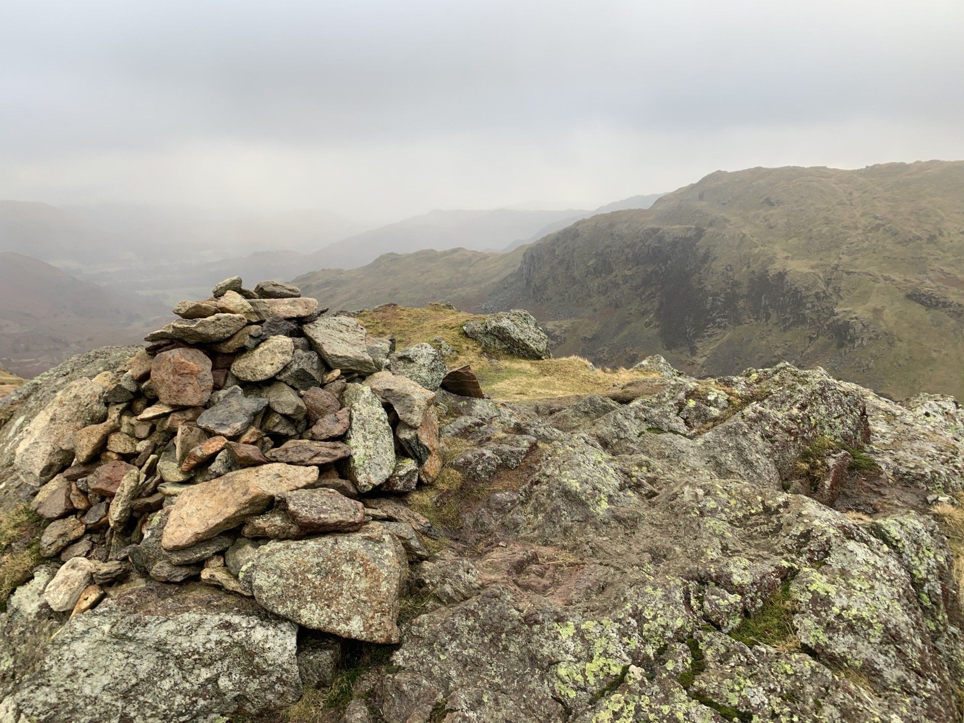 Jan 2020 - Ascent from Town Head. Final walk, this time around. Bus to Town Head and then the ascent of Steel Fell with the crags of the bizarrely named Cotra Breast for company. The views up through the equally oddly named Greenburn Bottom were lovely, despite the hanging cloud. I rounded the head of the valley to Calf Crag before the the traverse of the enjoyable, undulating ridge back to Helm Crag via Gibson Knott. Dropped down to Grasmere.