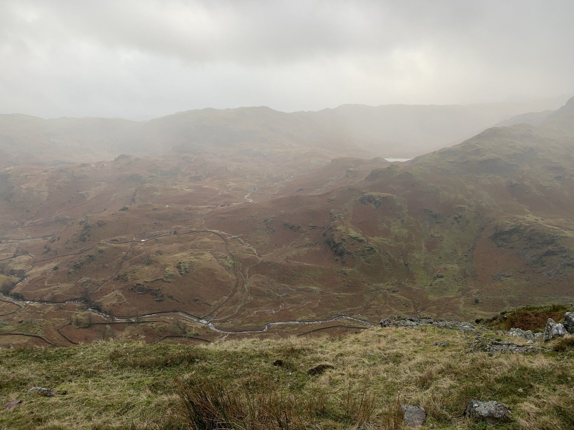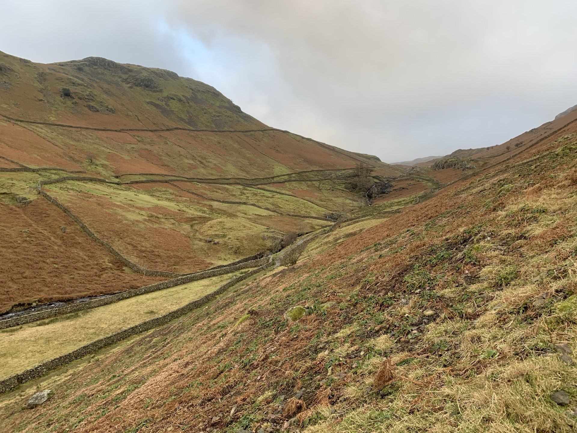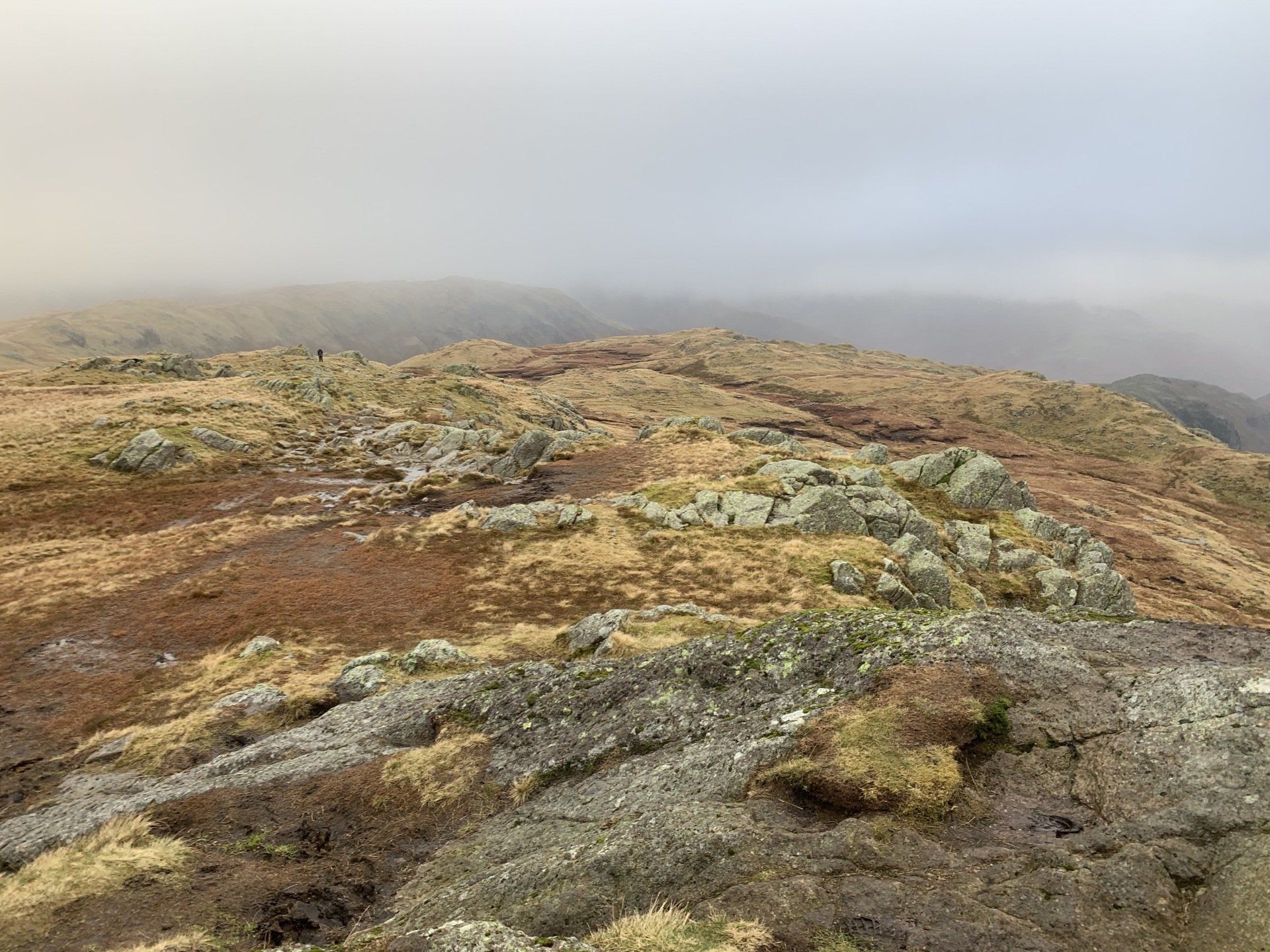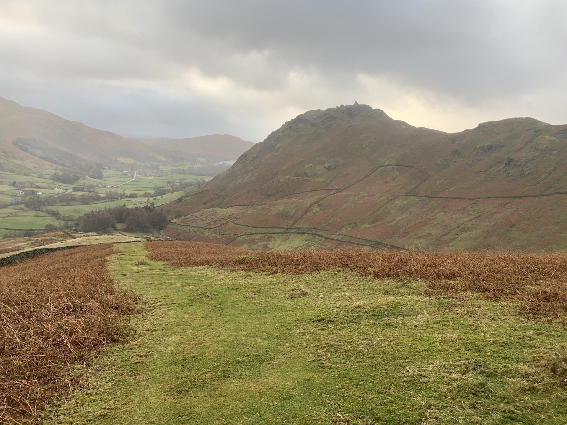 Jan 2020 - Ascent from Town Head. Final walk, this time around. Bus to Town Head and then the ascent of Steel Fell with the crags of the bizarrely named Cotra Breast for company. The views up through the equally oddly named Greenburn Bottom were lovely, despite the hanging cloud. I rounded the head of the valley to Calf Crag before the the traverse of the enjoyable, undulating ridge back to Helm Crag via Gibson Knott. Dropped down to Grasmere.