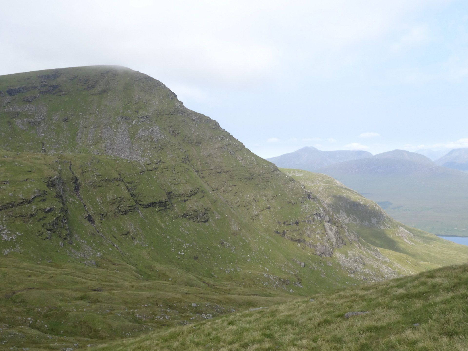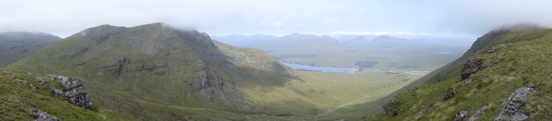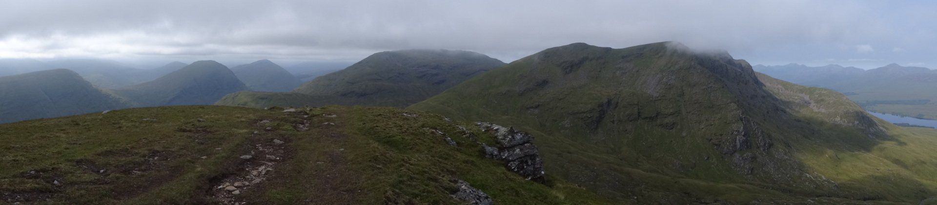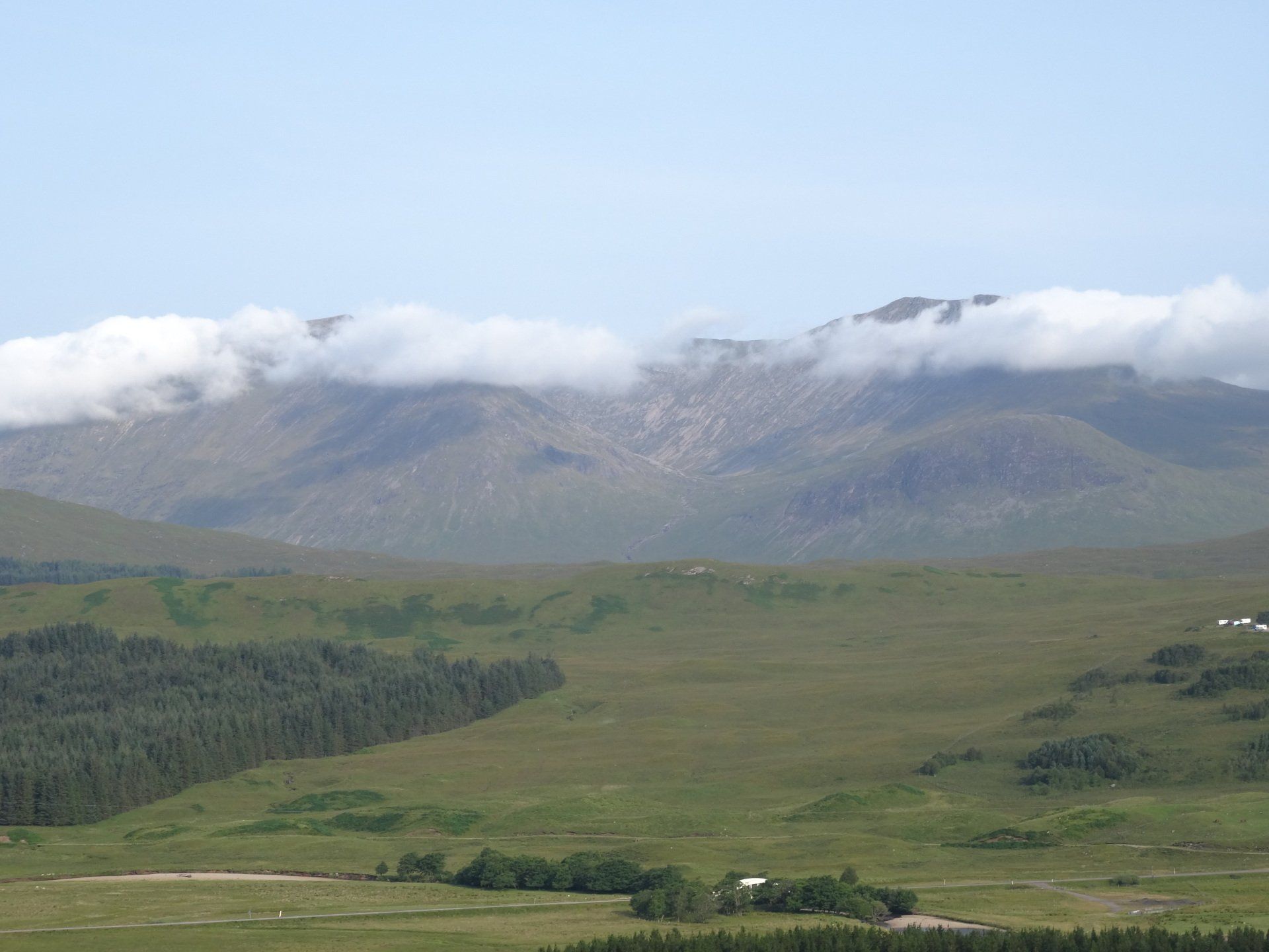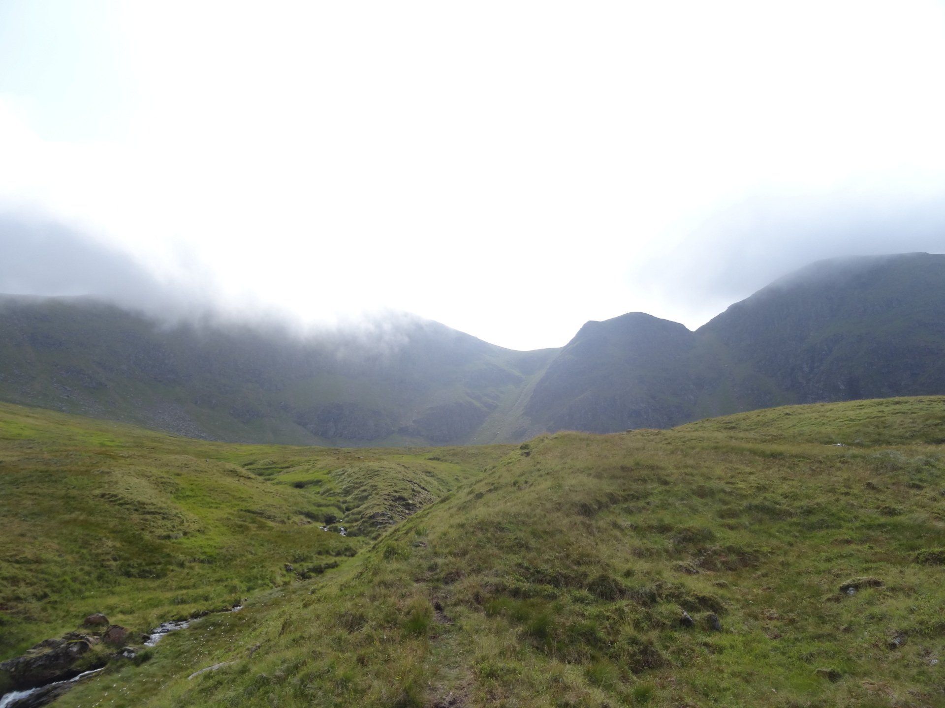 Aug 2020 - Ascent from A82 near Achaladair Farm. Out early and decided to tackle these two in the less common anti-clockwise direction. So glad I did, as the best of the views were in the morning before the cloud descended and clung to the tops. The ascent up through the Coire Achaladair was stunning with the north face of Beinn an Dothaidh and the tumbling waterfalls of the Allt Achaladair as company. Eventually, it led to Coire Daingean, an amazing place with stunning rock scenery. Here the views east to the Loch Lyon munros were fabulous. Then began a fantastic ridge walk that lasted for ages. Initially, there were excellent views across the desolate expanse of Rannoch Moor and towards the Glen Etive tops. The swirling cloud created a wonderful atmosphere as I enjoyed the downs and ups of the ridge, and the precipitous crags of the western edge. Met one of only two other walkers I saw today on the summit of Meall Buidhe before the steep pull up to the summit of Beinn a'Chreachain, my 141st Munro – halfway! Had lunch on the summit in the clag, hoping it would clear. It didn’t, but as I descended the north-eastern ridge, it did, however the haze meant photos were almost impossible to capture what the naked eye saw. Coire an Lochain looked spectacular with its glacial lake and it was pathless hillside for a while before picking up a path alongside the river. A weird tunnel under the railway required stooping before wading through the wonderfully named Water of Tulla – the bridge was down and has been for a while according to reports. So, with soaked boots, the last few miles followed mostly the western edge of the river back to the car. This trek was made more enjoyable by the views up to the mountains I’d just enjoyed. 141/282.