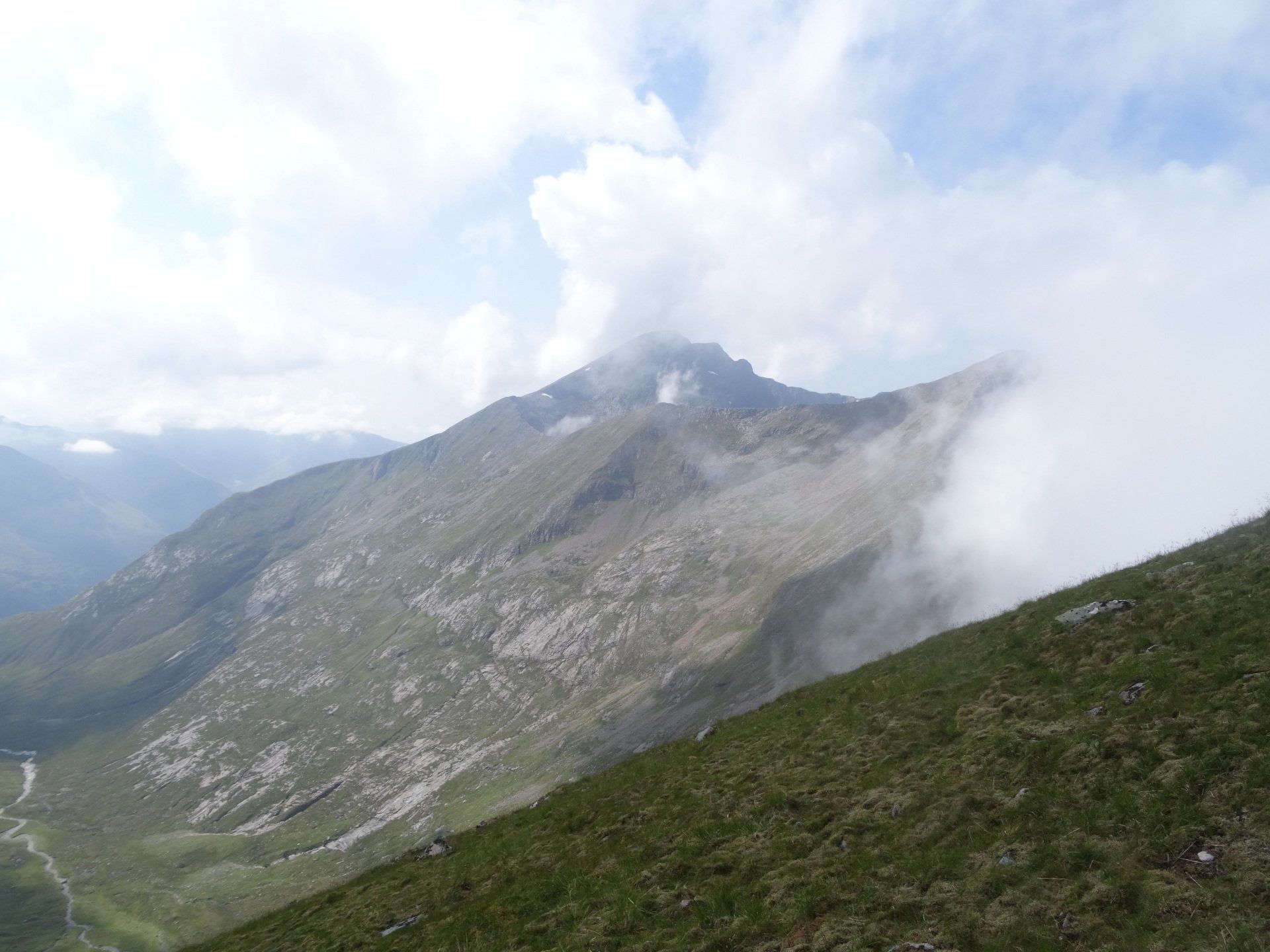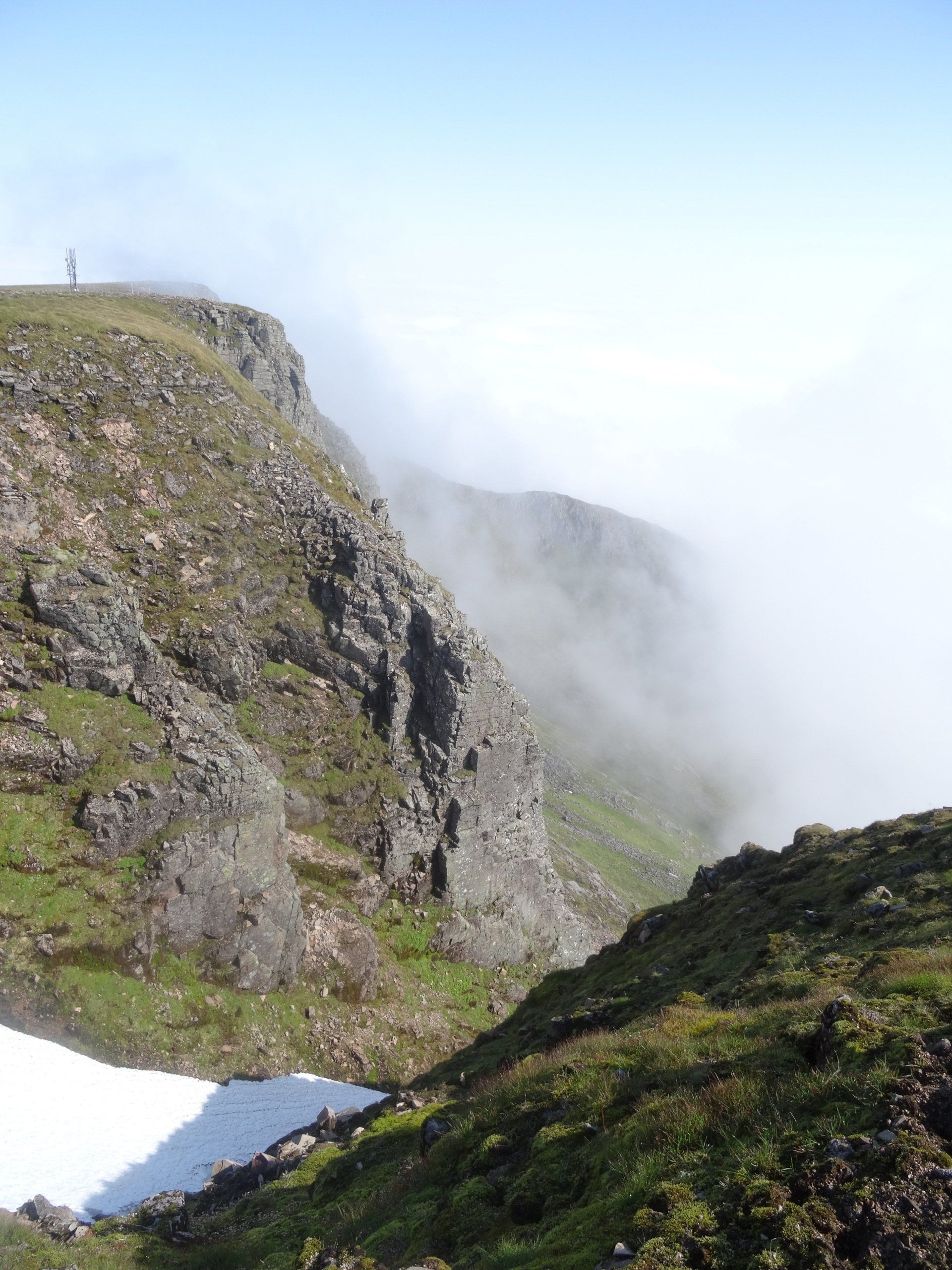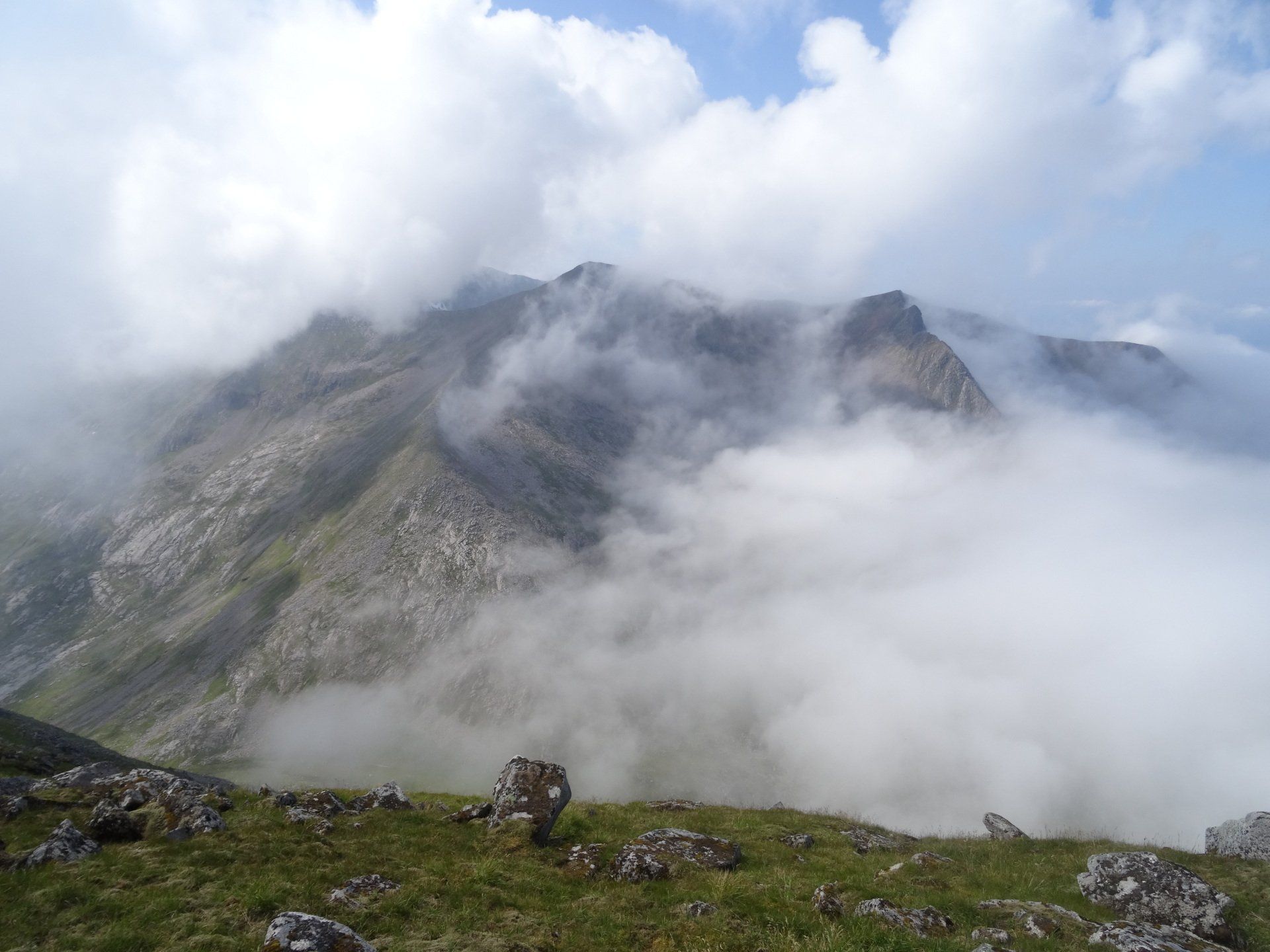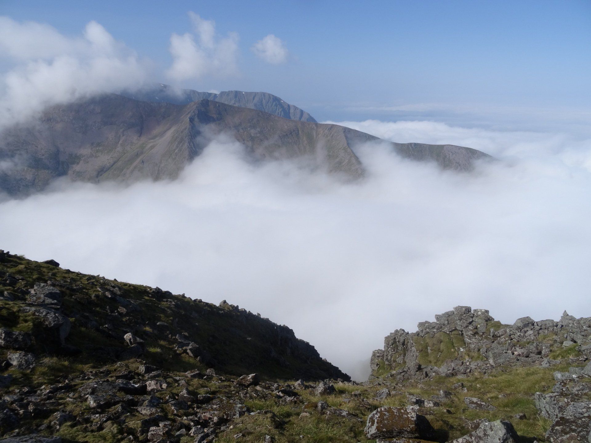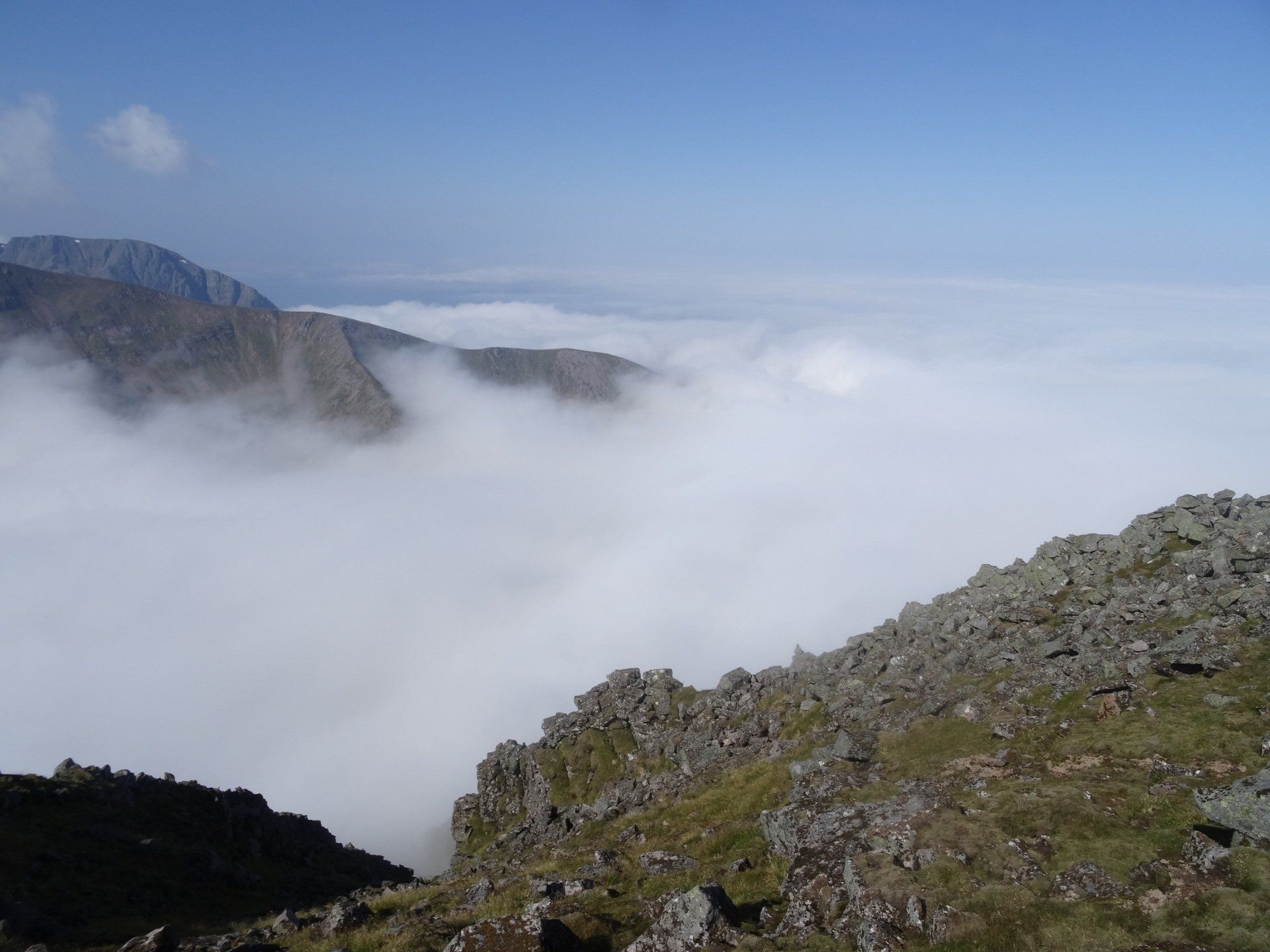 Aug 2020 - Ascent from Nevis Gondola. After yesterday’s epic, an easier walk was in order. I last did these two 4 years ago from Glen Nevis, the purist’s way, so I didn’t feel guilty about using the cable car from the Nevis Range up to 600m. I’m glad I did as, after ascending rapidly to 1200m, I was greeted by a glorious partial inversion. In fact, the clouds were spectacular throughout the walk, providing ever-changing vistas. Sat and had a snack whilst they swirled around Carn Mor Dearg and Ben Nevis itself. The sun was brutal today and I applied sun cream several times, absolutely no shade up at this height. Spent ages on the summit of Aonach Beag but had company – a Snow bunting that was amazingly trusting. Tried to coax it to eat from my hand and almost succeeded. It ate its fill of biscuit crumbs that I offered, and then would take some off before returning for more. Obviously, some family nearby. Extremely cute. The views of the Grey Corries were fab, and I could see across upper Glen Nevis to yesterday’s summits.