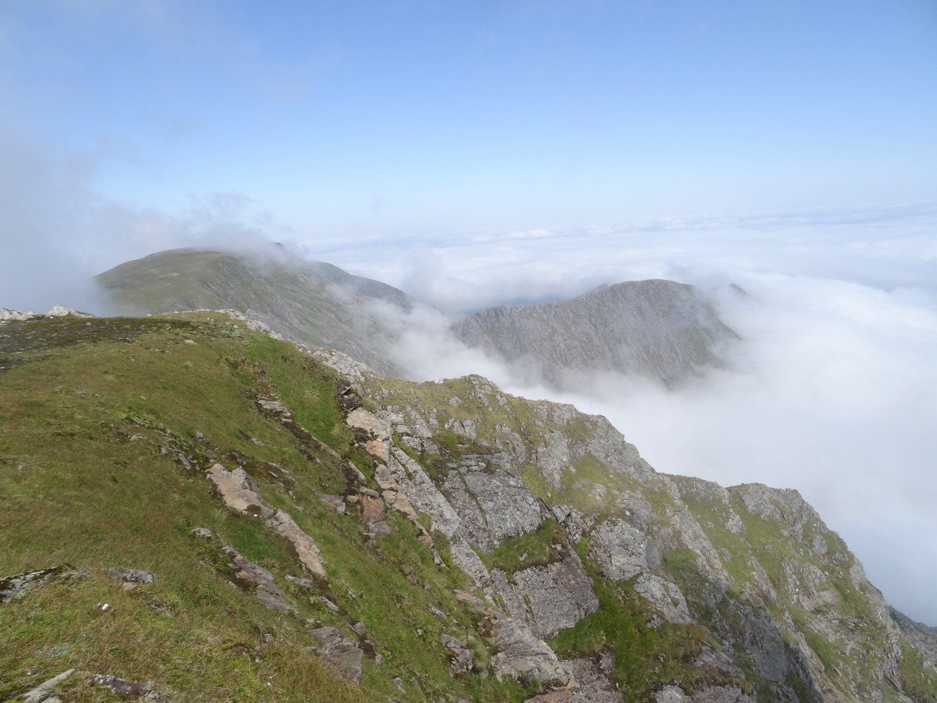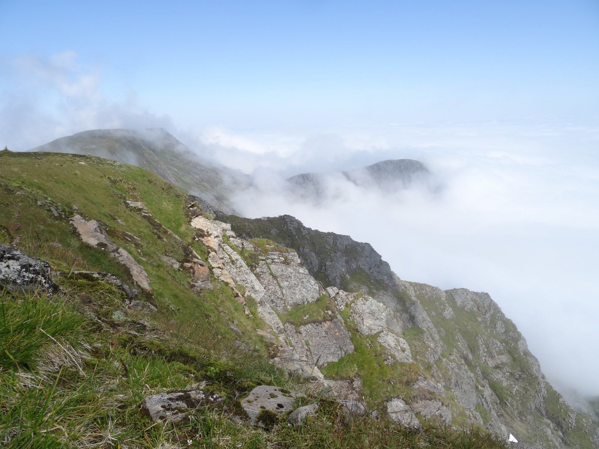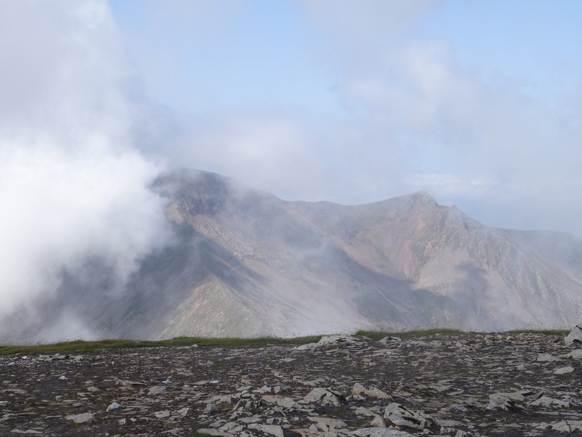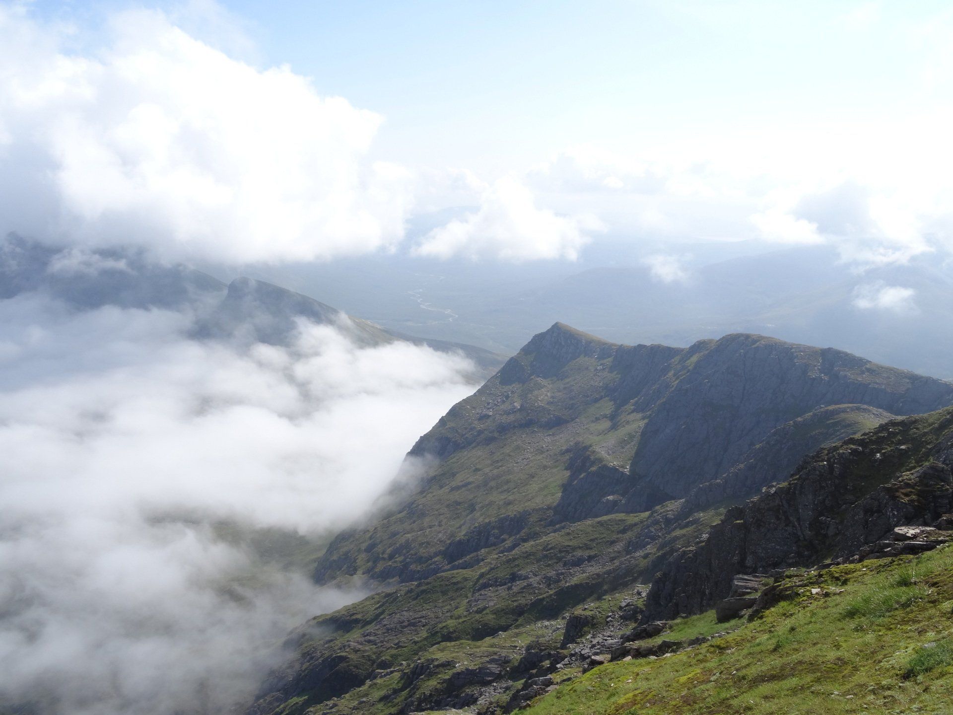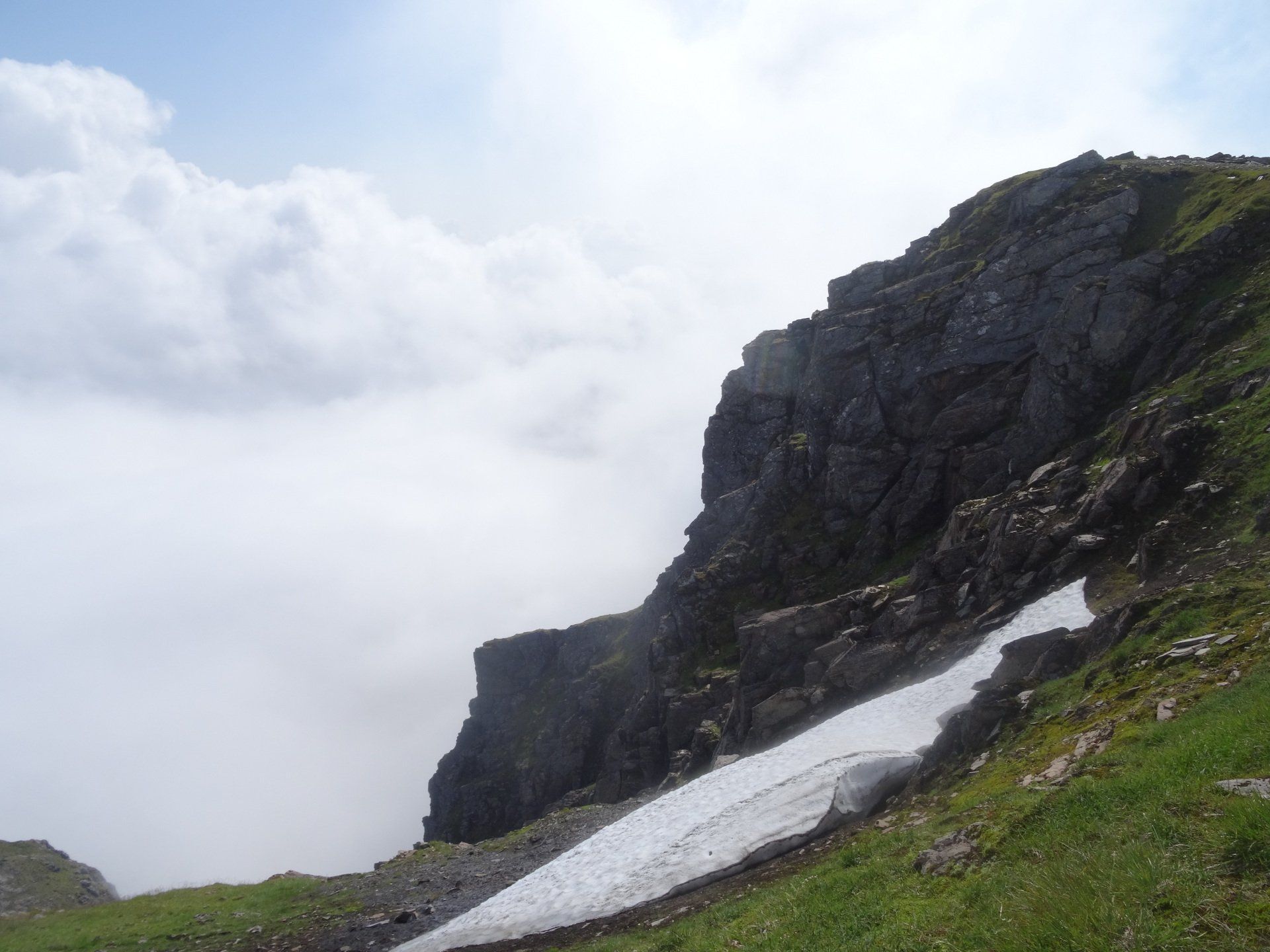 Aug 2020 - Ascent from Nevis Gondola. After yesterday’s epic, an easier walk was in order. I last did these two 4 years ago from Glen Nevis, the purist’s way, so I didn’t feel guilty about using the cable car from the Nevis Range up to 600m. I’m glad I did as, after ascending rapidly to 1200m, I was greeted by a glorious partial inversion. In fact, the clouds were spectacular throughout the walk, providing ever-changing vistas. Sat and had a snack whilst they swirled around Carn Mor Dearg and Ben Nevis itself. The sun was brutal today and I applied sun cream several times, absolutely no shade up at this height. Spent ages on the summit of Aonach Beag but had company – a Snow bunting that was amazingly trusting. Tried to coax it to eat from my hand and almost succeeded. It ate its fill of biscuit crumbs that I offered, and then would take some off before returning for more. Obviously, some family nearby. Extremely cute. The views of the Grey Corries were fab, and I could see across upper Glen Nevis to yesterday’s summits.