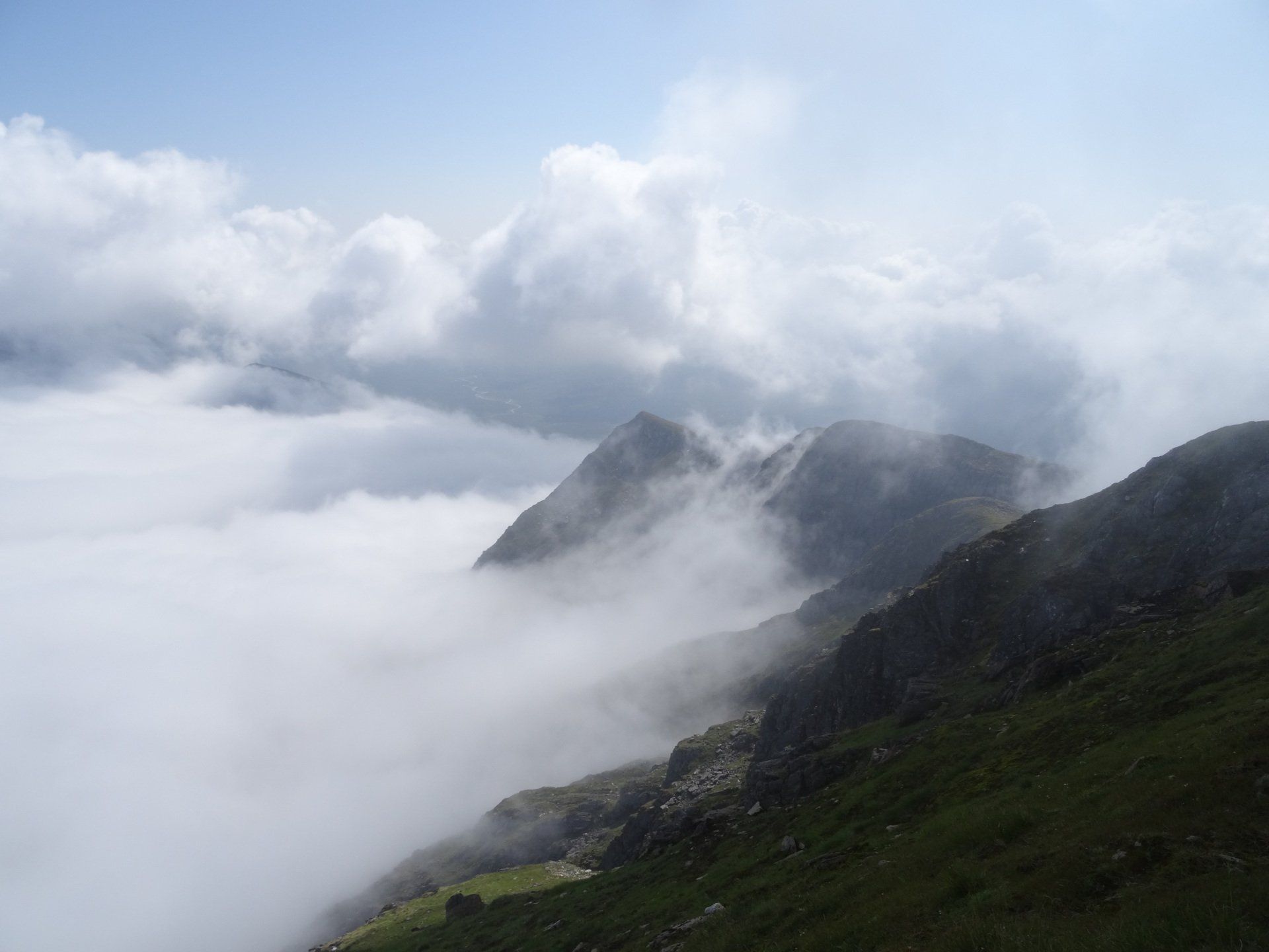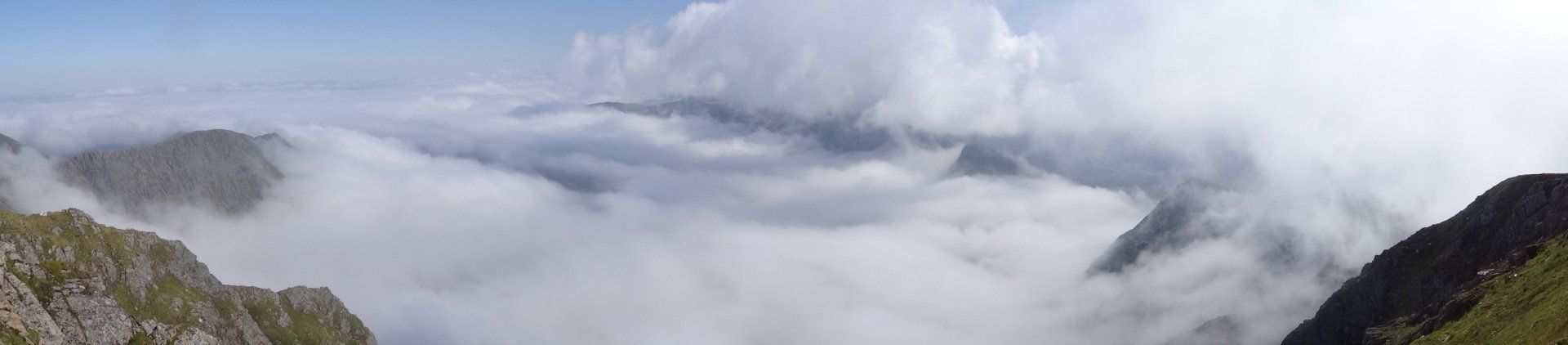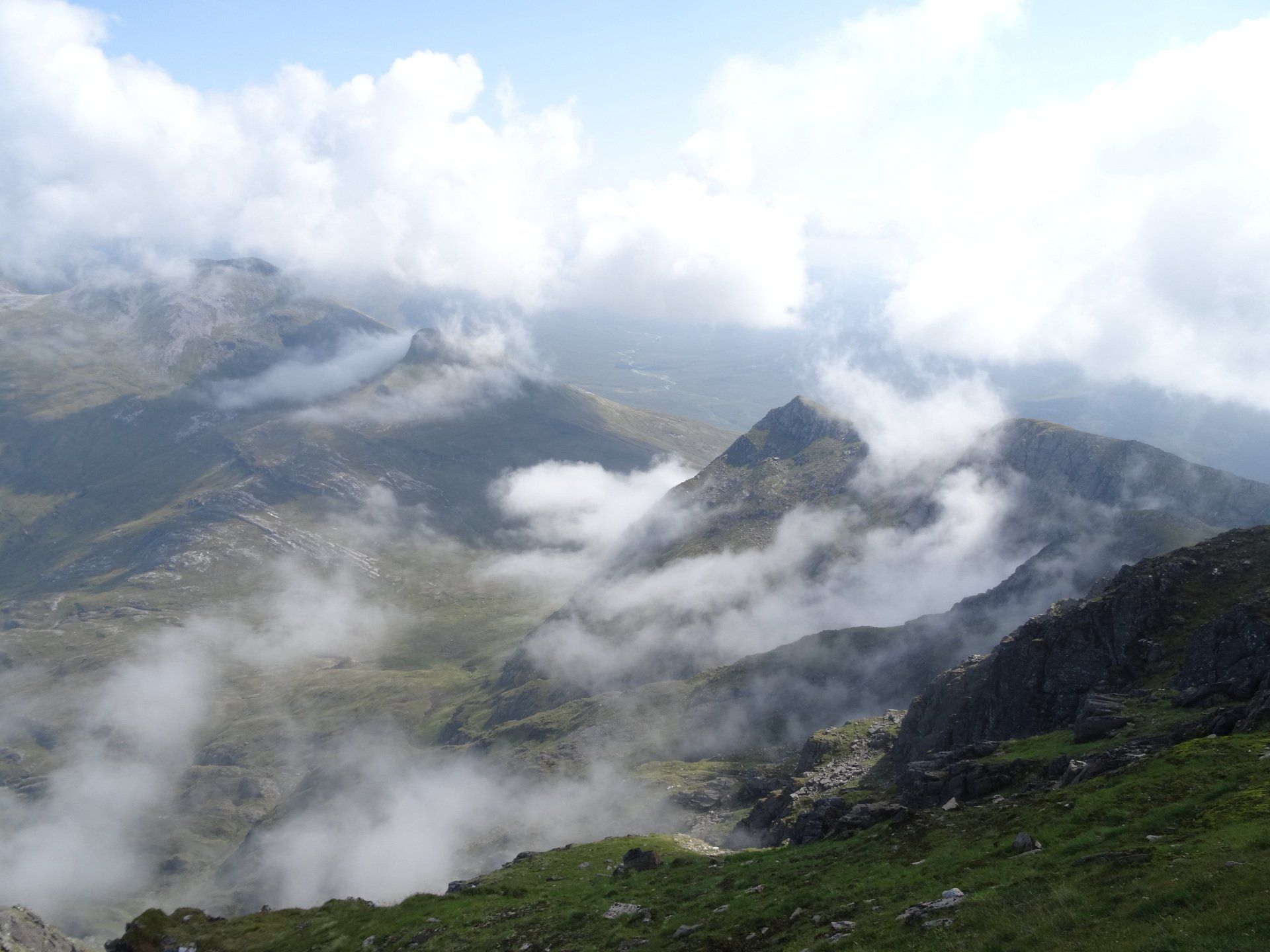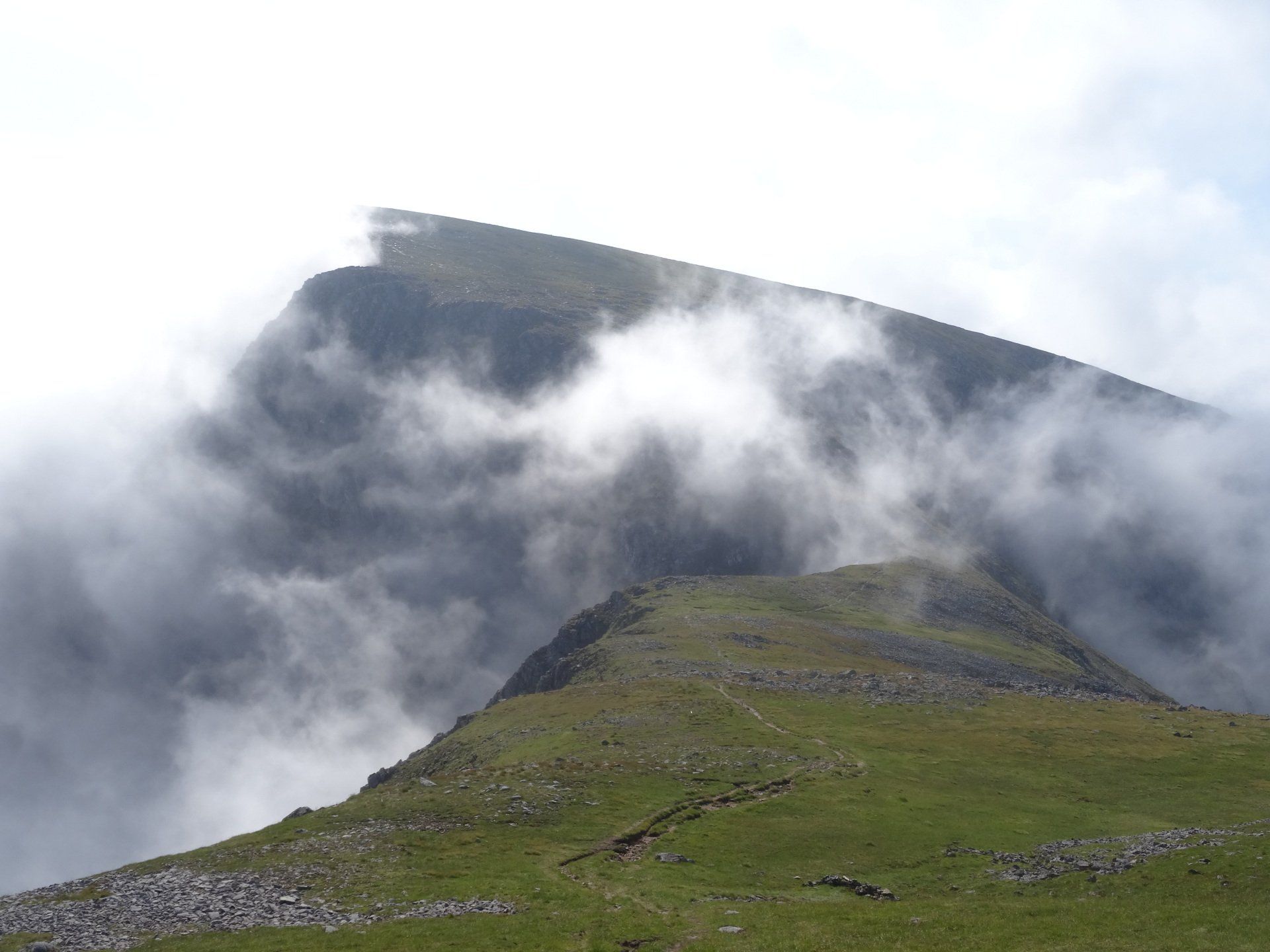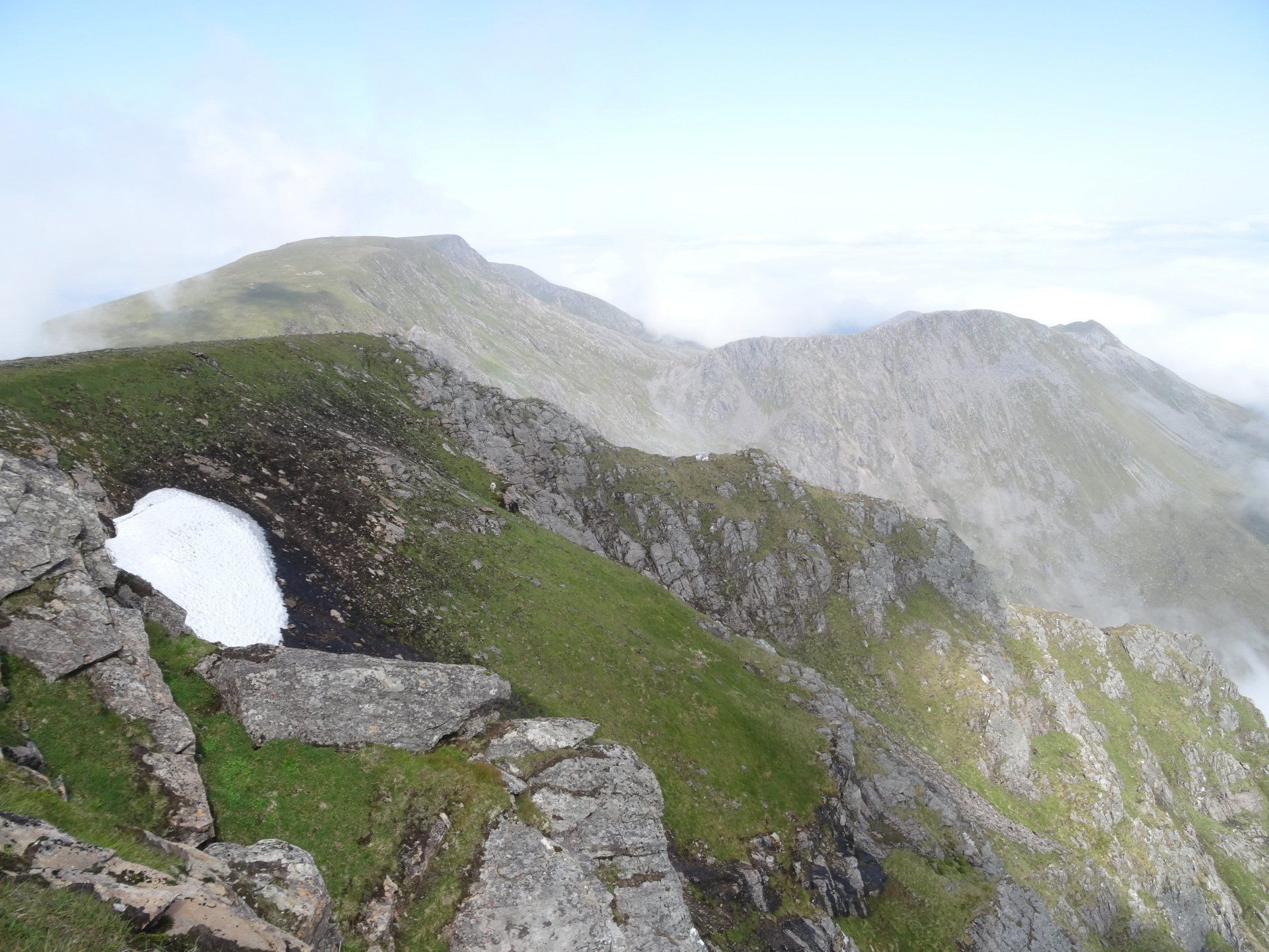 Aug 2020 - Ascent from Nevis Gondola. After yesterday’s epic, an easier walk was in order. I last did these two 4 years ago from Glen Nevis, the purist’s way, so I didn’t feel guilty about using the cable car from the Nevis Range up to 600m. I’m glad I did as, after ascending rapidly to 1200m, I was greeted by a glorious partial inversion. In fact, the clouds were spectacular throughout the walk, providing ever-changing vistas. Sat and had a snack whilst they swirled around Carn Mor Dearg and Ben Nevis itself. The sun was brutal today and I applied sun cream several times, absolutely no shade up at this height. Spent ages on the summit of Aonach Beag but had company – a Snow bunting that was amazingly trusting. Tried to coax it to eat from my hand and almost succeeded. It ate its fill of biscuit crumbs that I offered, and then would take some off before returning for more. Obviously, some family nearby. Extremely cute. The views of the Grey Corries were fab, and I could see across upper Glen Nevis to yesterday’s summits.