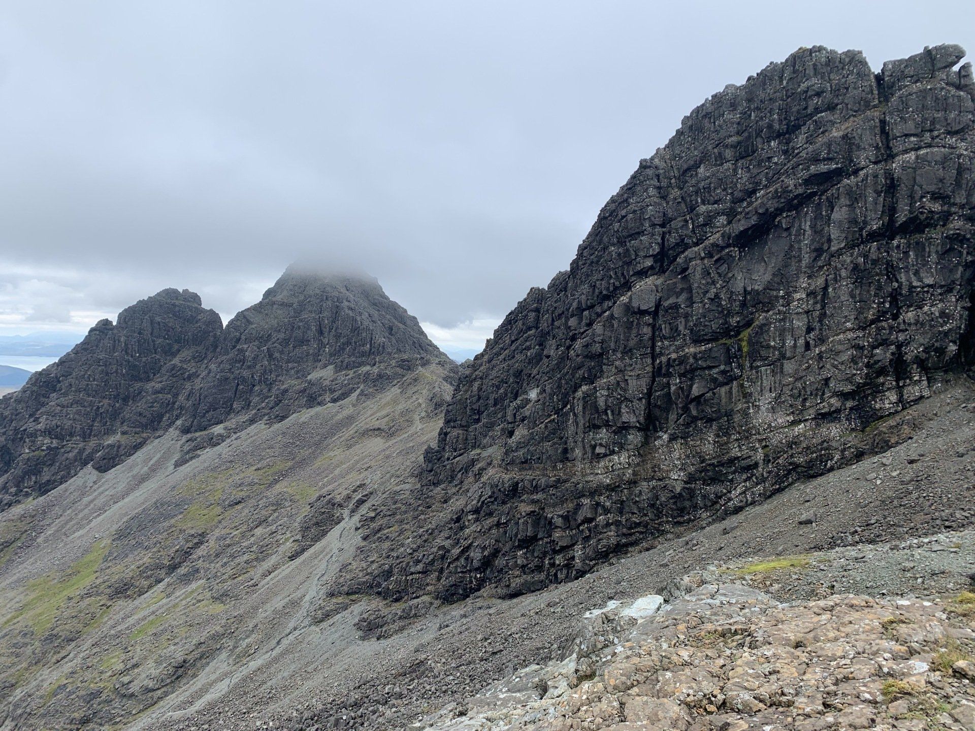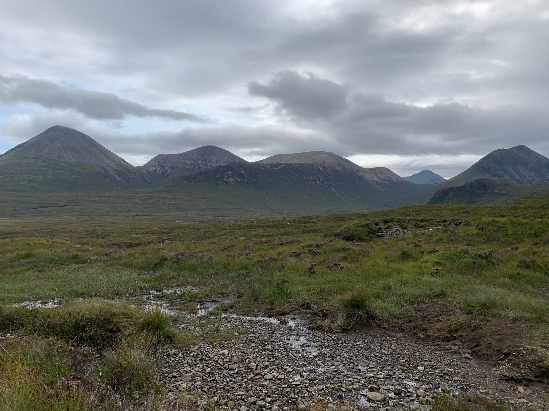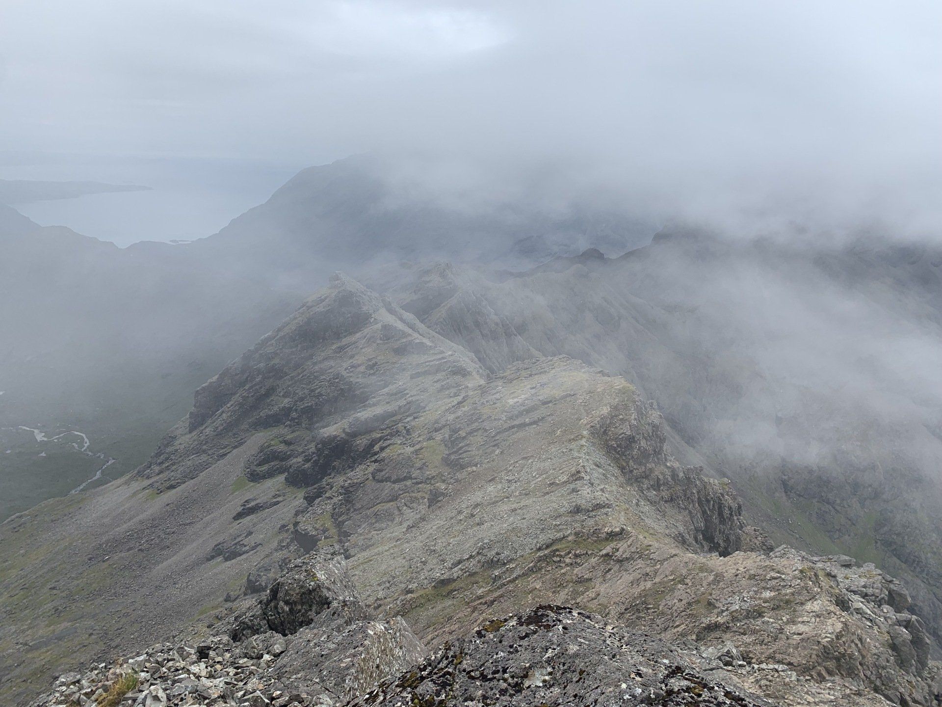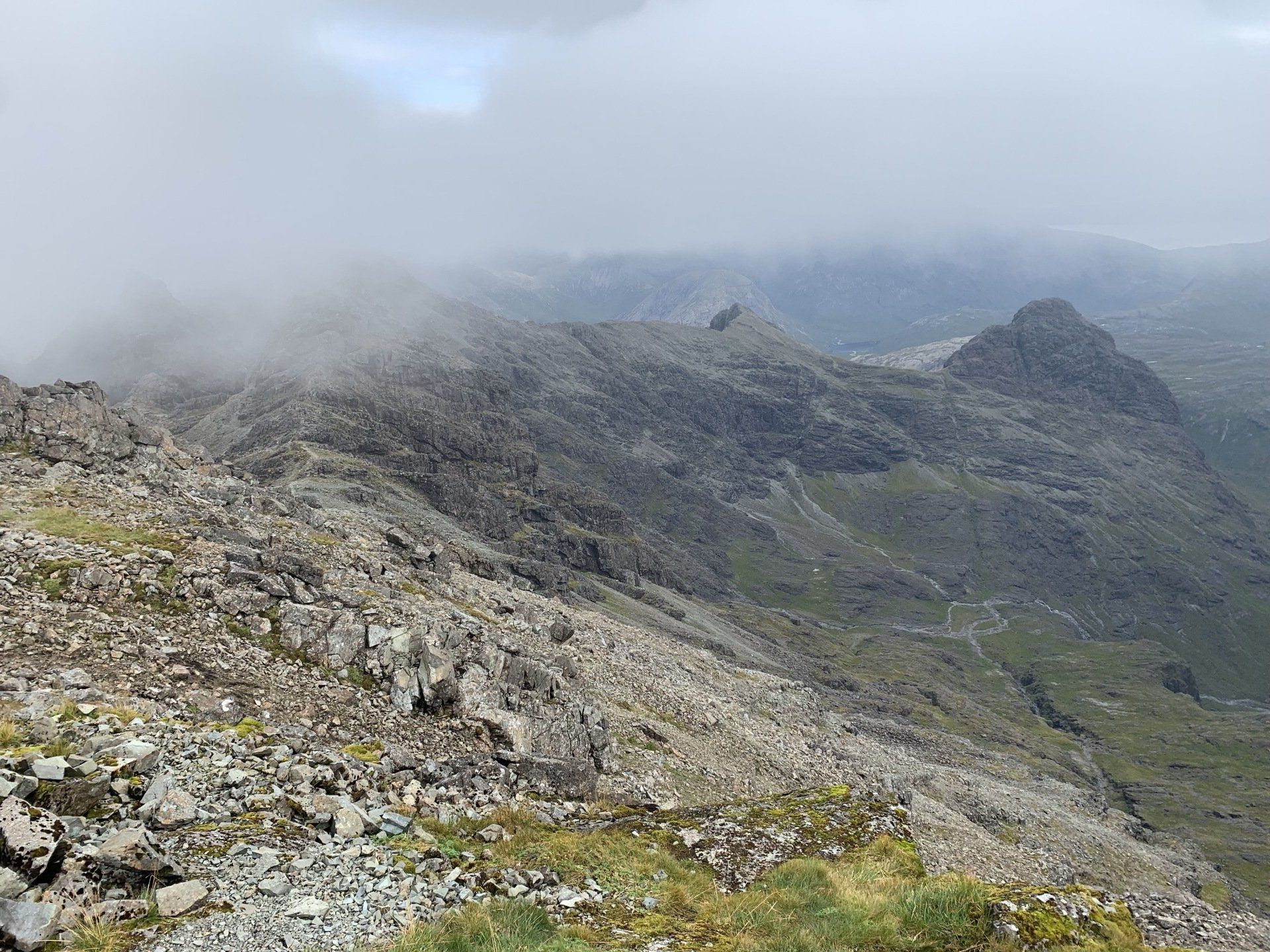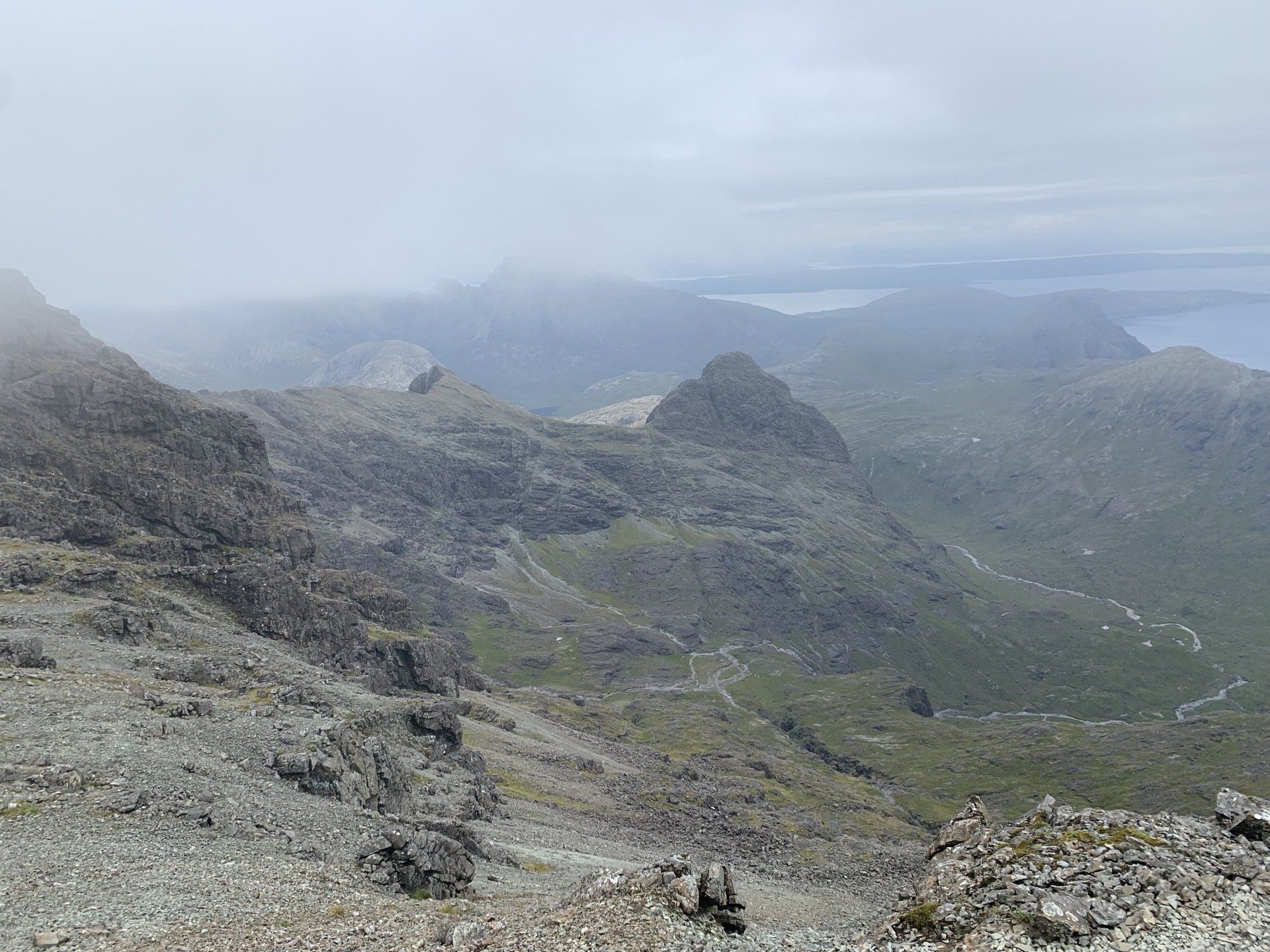 Aug 2021 - (with Gemma) Ascent from Sligachan. Sensational walk and it turned out great on the summits, where we spent over an hour. A fantastic walk in was followed by the ascent through Fionn Choire, a glorious place to be. The cloud cleared from the summit of Bruach na Frithe offering excellent views along the Cuillin ridge and across the deep expanse to Bla Bheinn. Some enjoyable scrambling down from the summit of Sgurr a Bhasteir with the Red Cuillin looking magnificent and views over the whole of Skye and to the Outer Hebrides.