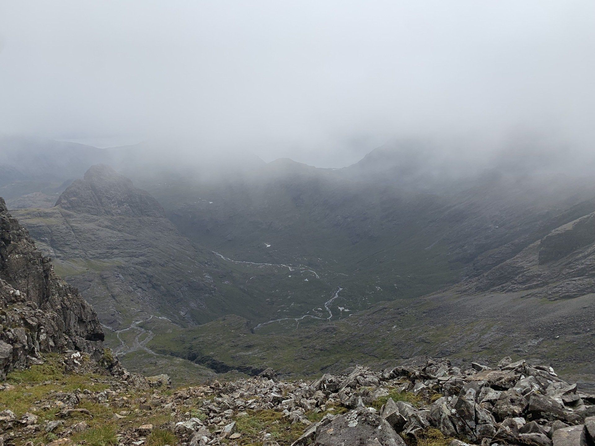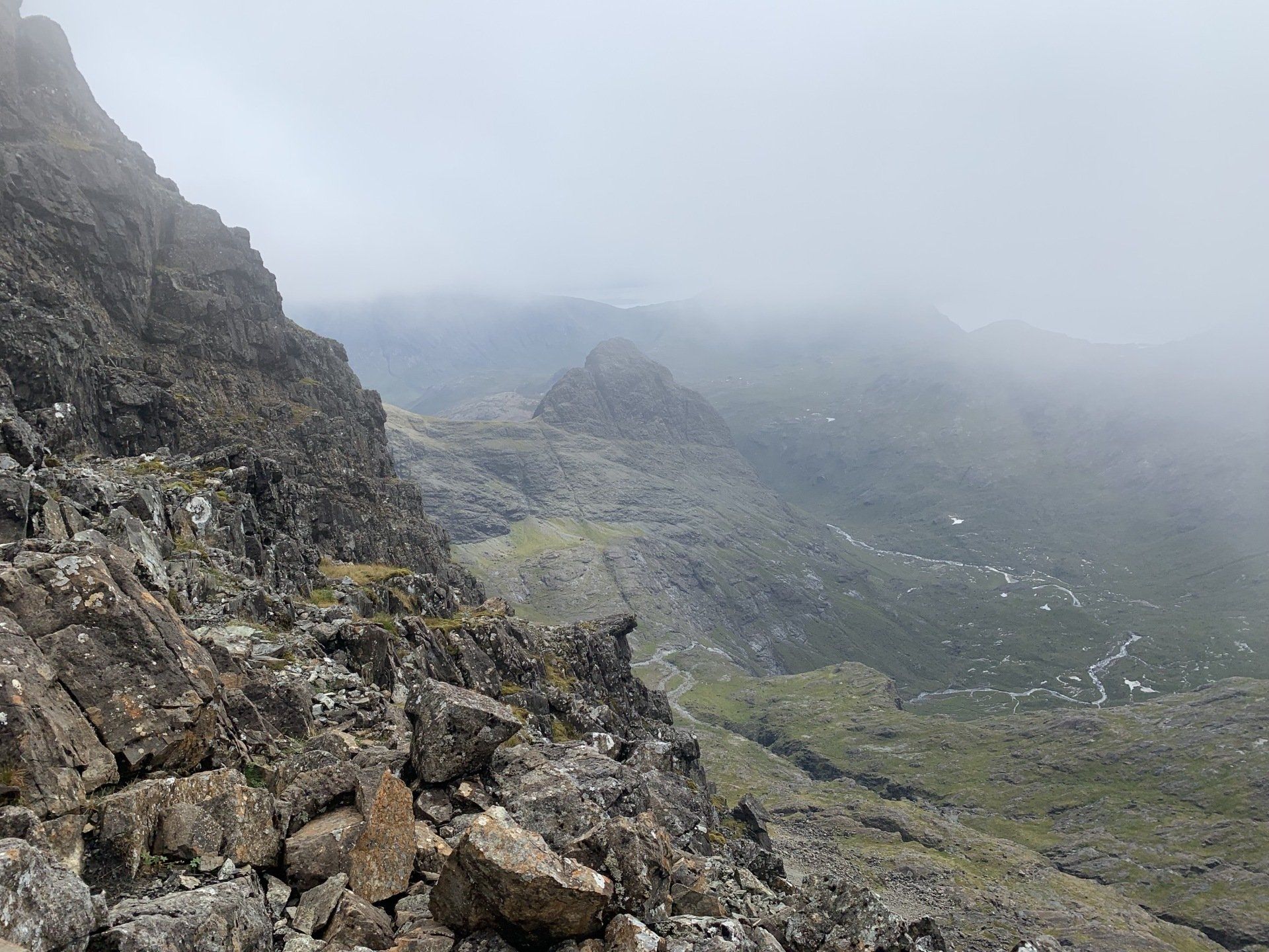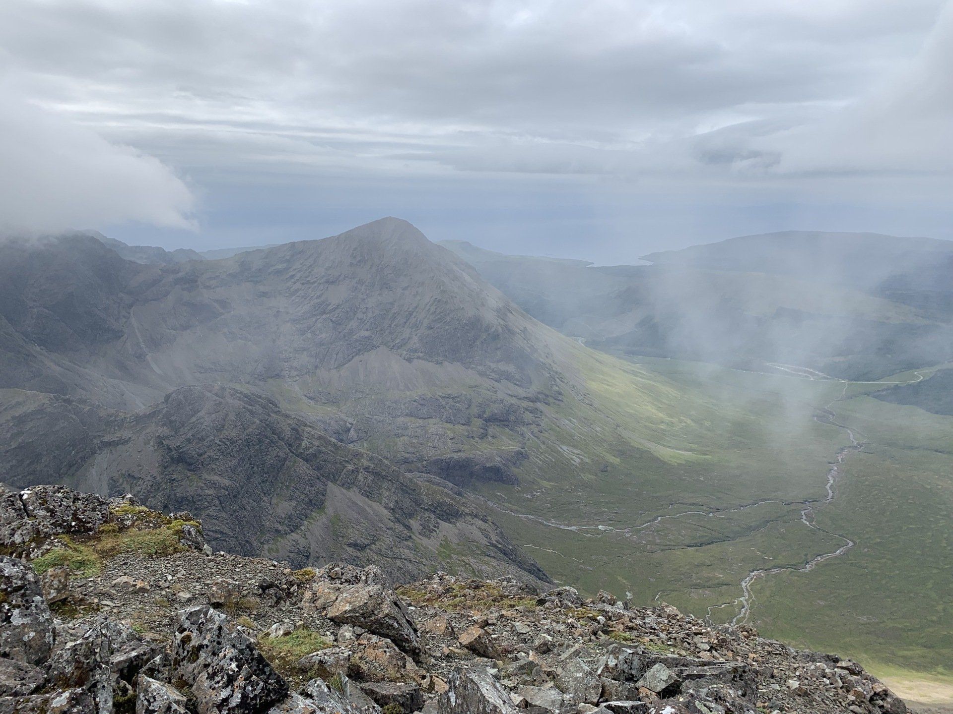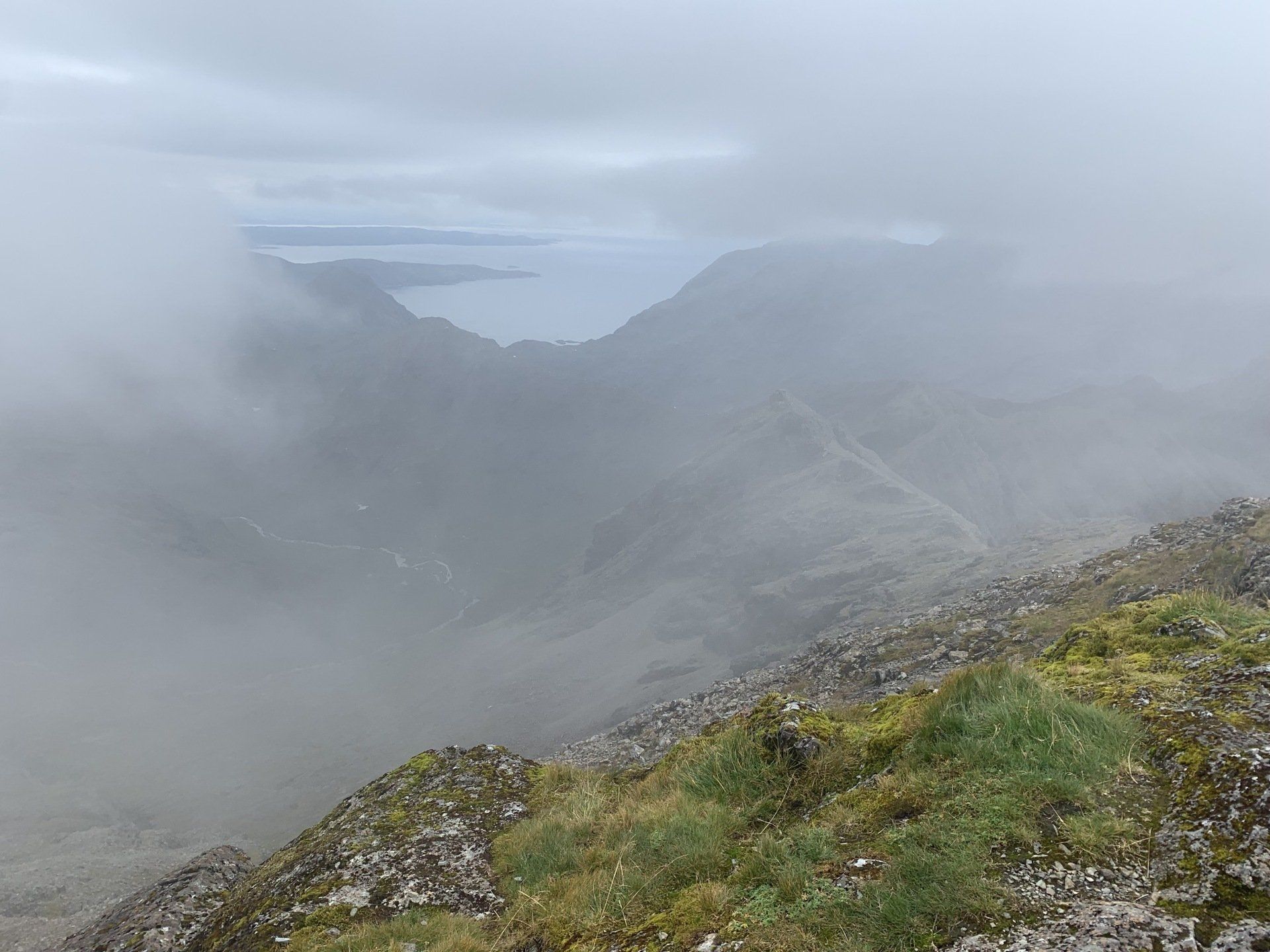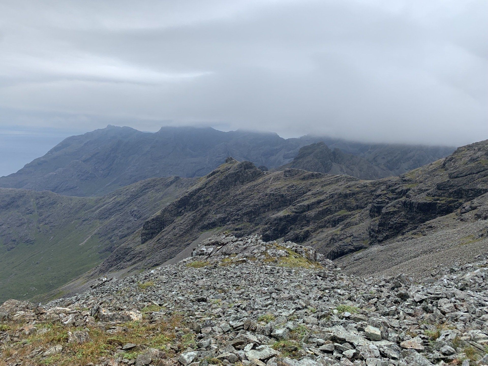 Aug 2021 - (with Gemma) Ascent from Sligachan. Sensational walk and it turned out great on the summits, where we spent over an hour. A fantastic walk in was followed by the ascent through Fionn Choire, a glorious place to be. The cloud cleared from the summit of Bruach na Frithe offering excellent views along the Cuillin ridge and across the deep expanse to Bla Bheinn. Some enjoyable scrambling down from the summit of Sgurr a Bhasteir with the Red Cuillin looking magnificent and views over the whole of Skye and to the Outer Hebrides.