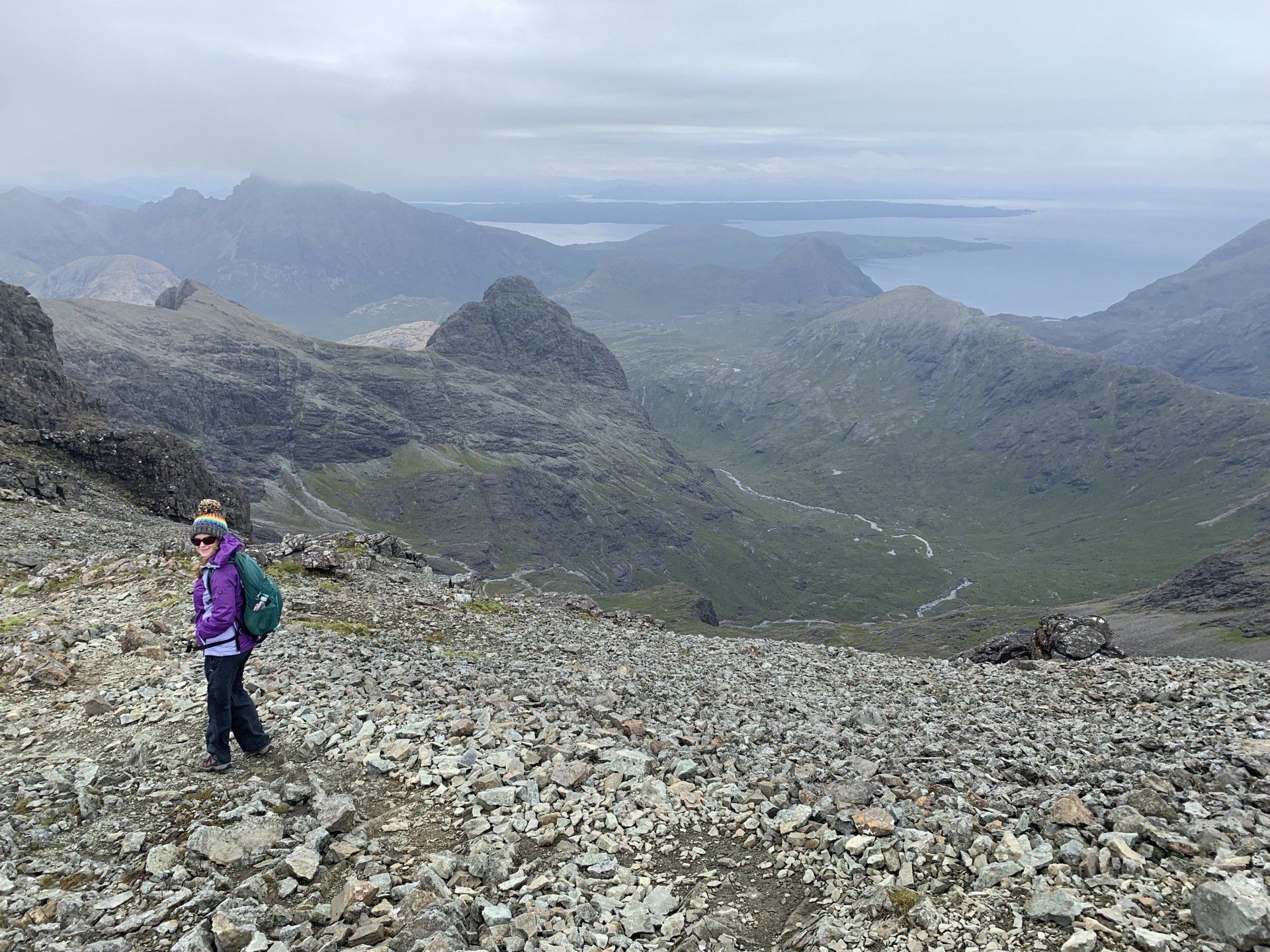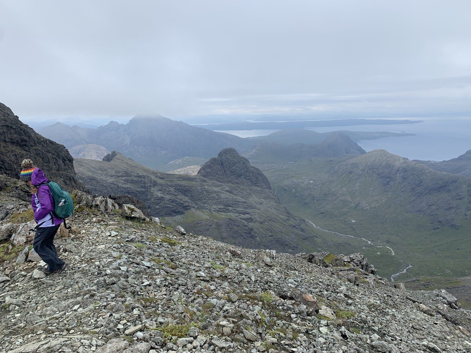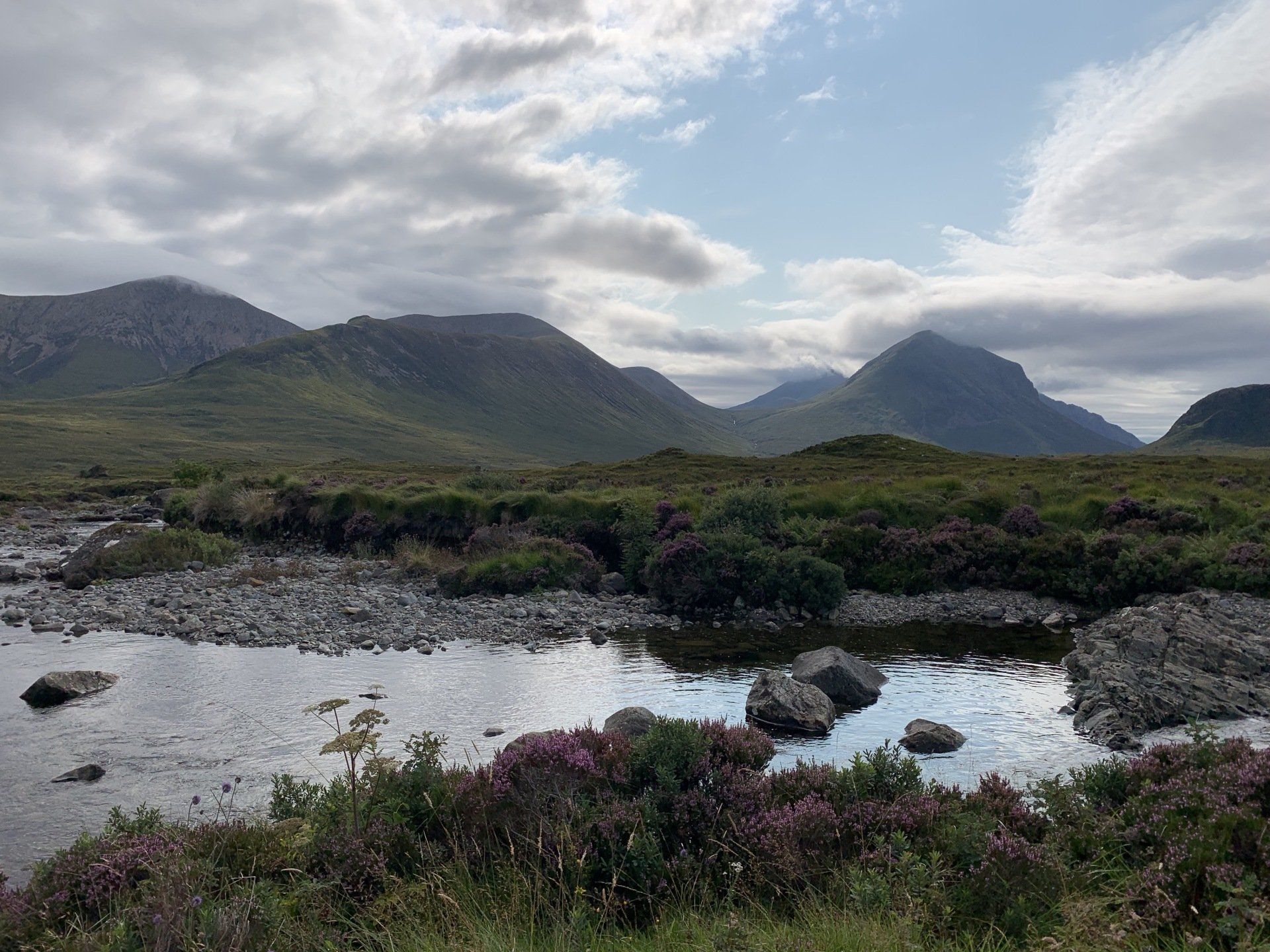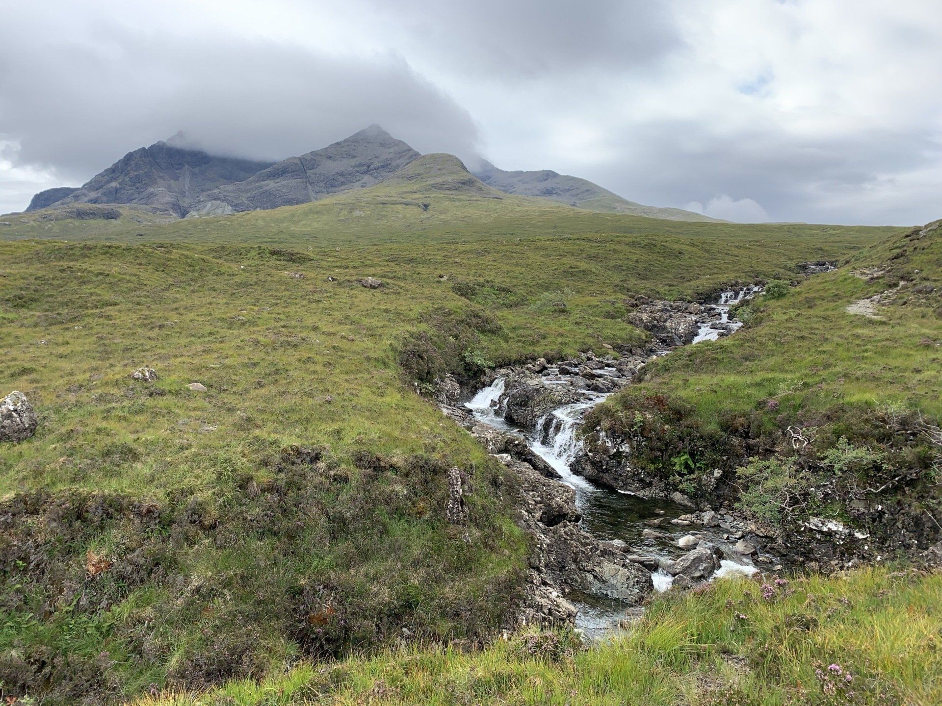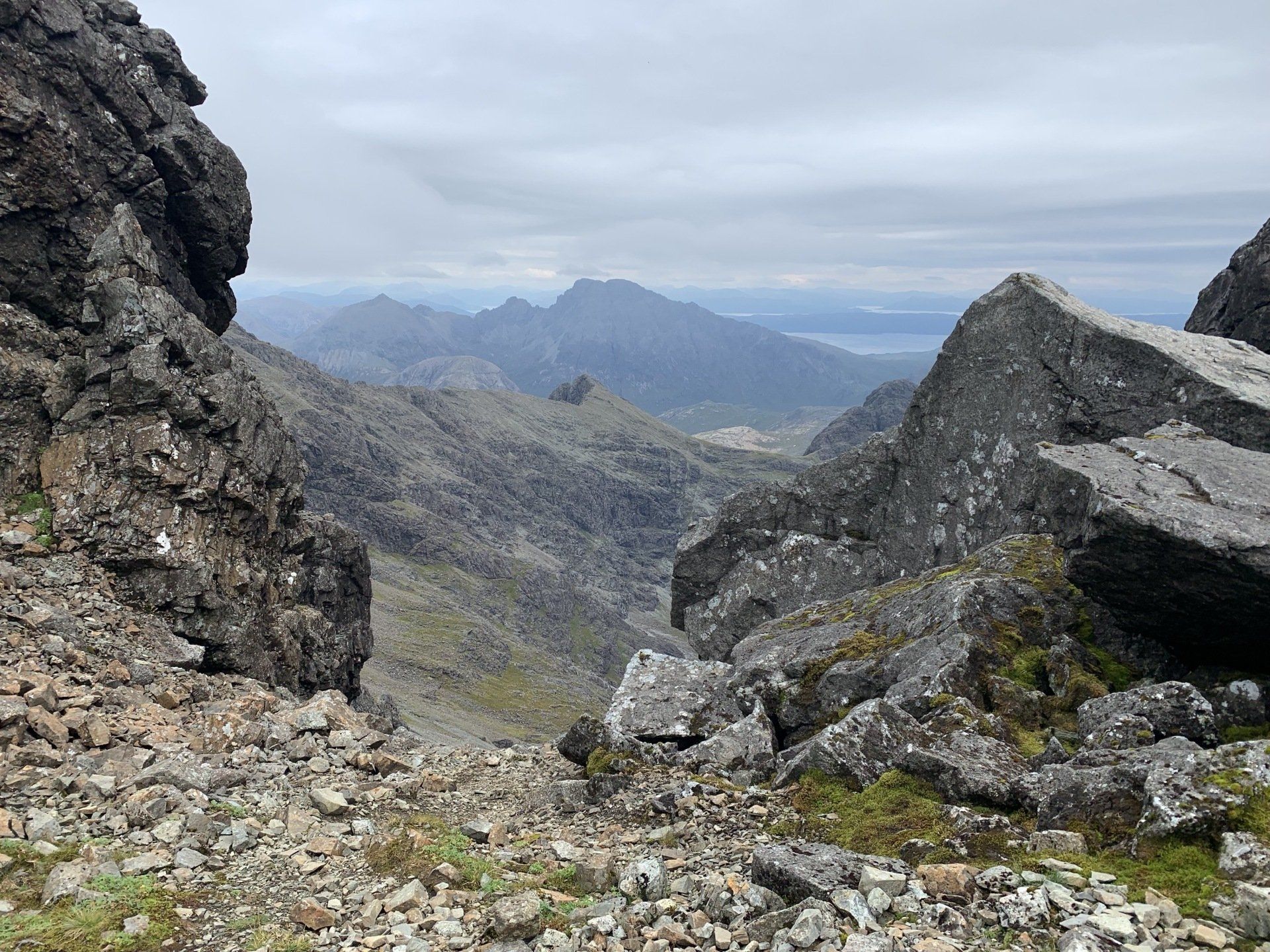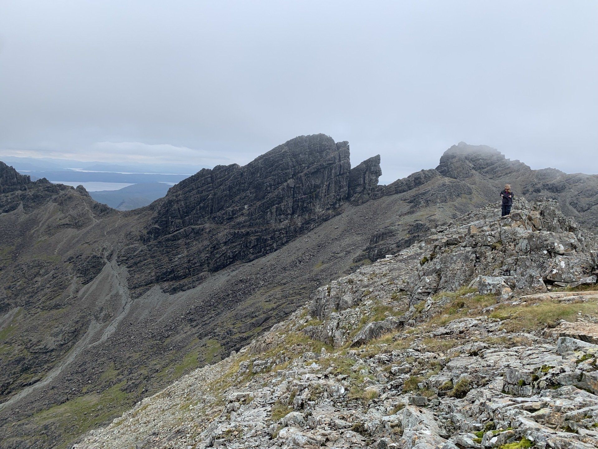 Aug 2021 - (with Gemma) Ascent from Sligachan. Sensational walk and it turned out great on the summits, where we spent over an hour. A fantastic walk in was followed by the ascent through Fionn Choire, a glorious place to be. The cloud cleared from the summit of Bruach na Frithe offering excellent views along the Cuillin ridge and across the deep expanse to Bla Bheinn. Some enjoyable scrambling down from the summit of Sgurr a Bhasteir with the Red Cuillin looking magnificent and views over the whole of Skye and to the Outer Hebrides.