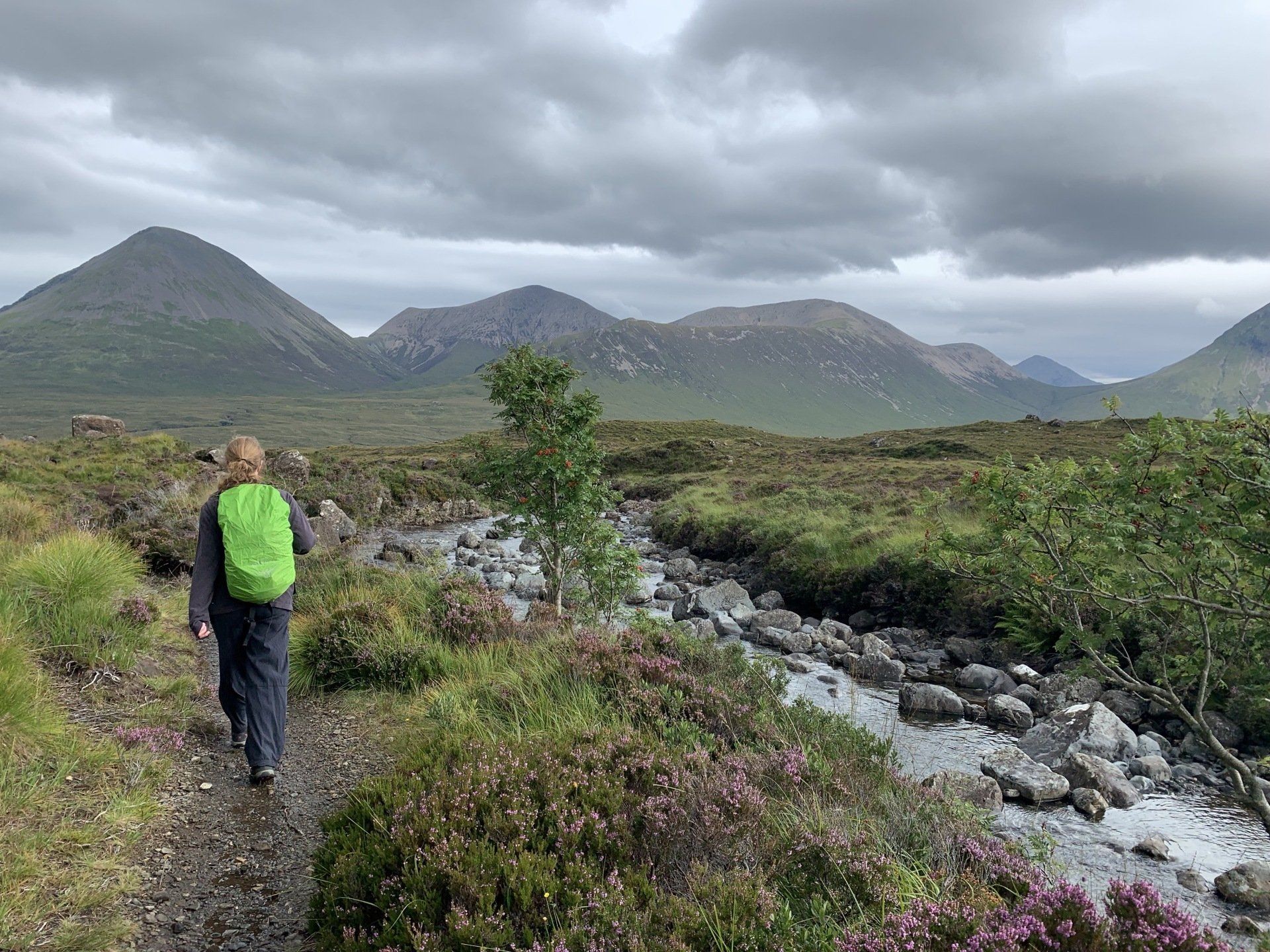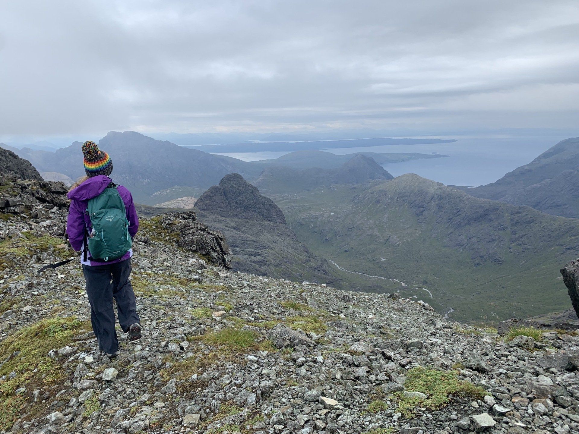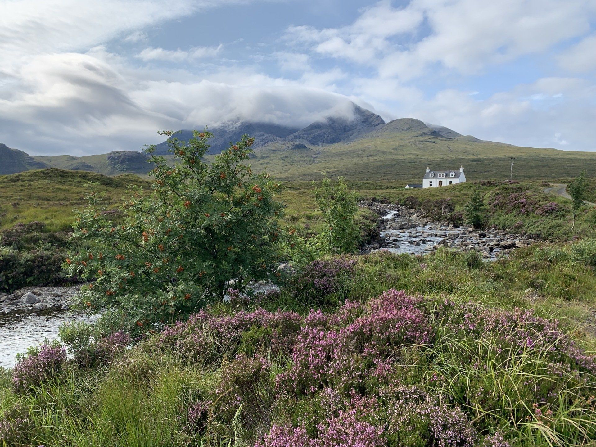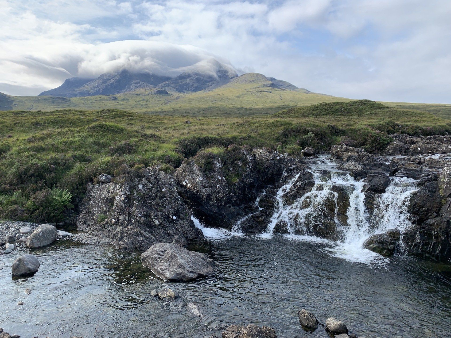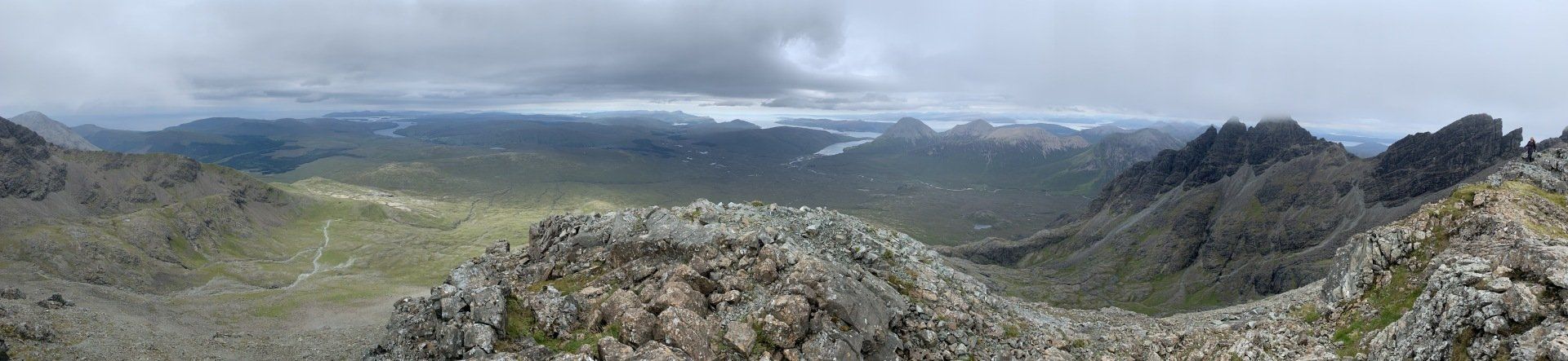Aug 2021 - (with Gemma) Ascent from Sligachan. Sensational walk and it turned out great on the summits, where we spent over an hour. A fantastic walk in was followed by the ascent through Fionn Choire, a glorious place to be. The cloud cleared from the summit of Bruach na Frithe offering excellent views along the Cuillin ridge and across the deep expanse to Bla Bheinn. Some enjoyable scrambling down from the summit of Sgurr a Bhasteir with the Red Cuillin looking magnificent and views over the whole of Skye and to the Outer Hebrides.
