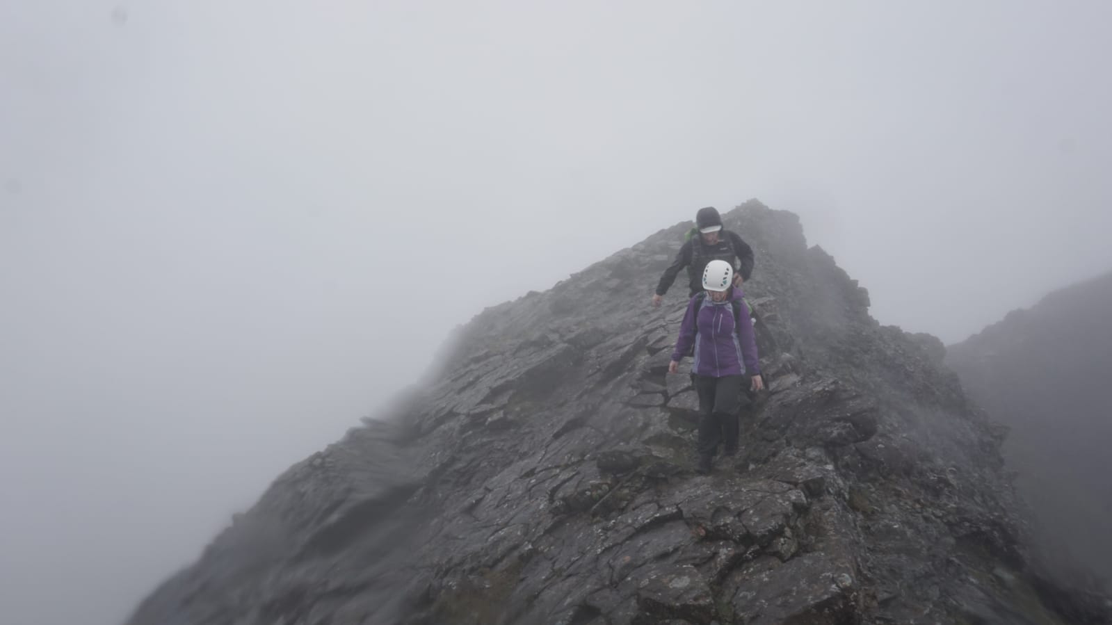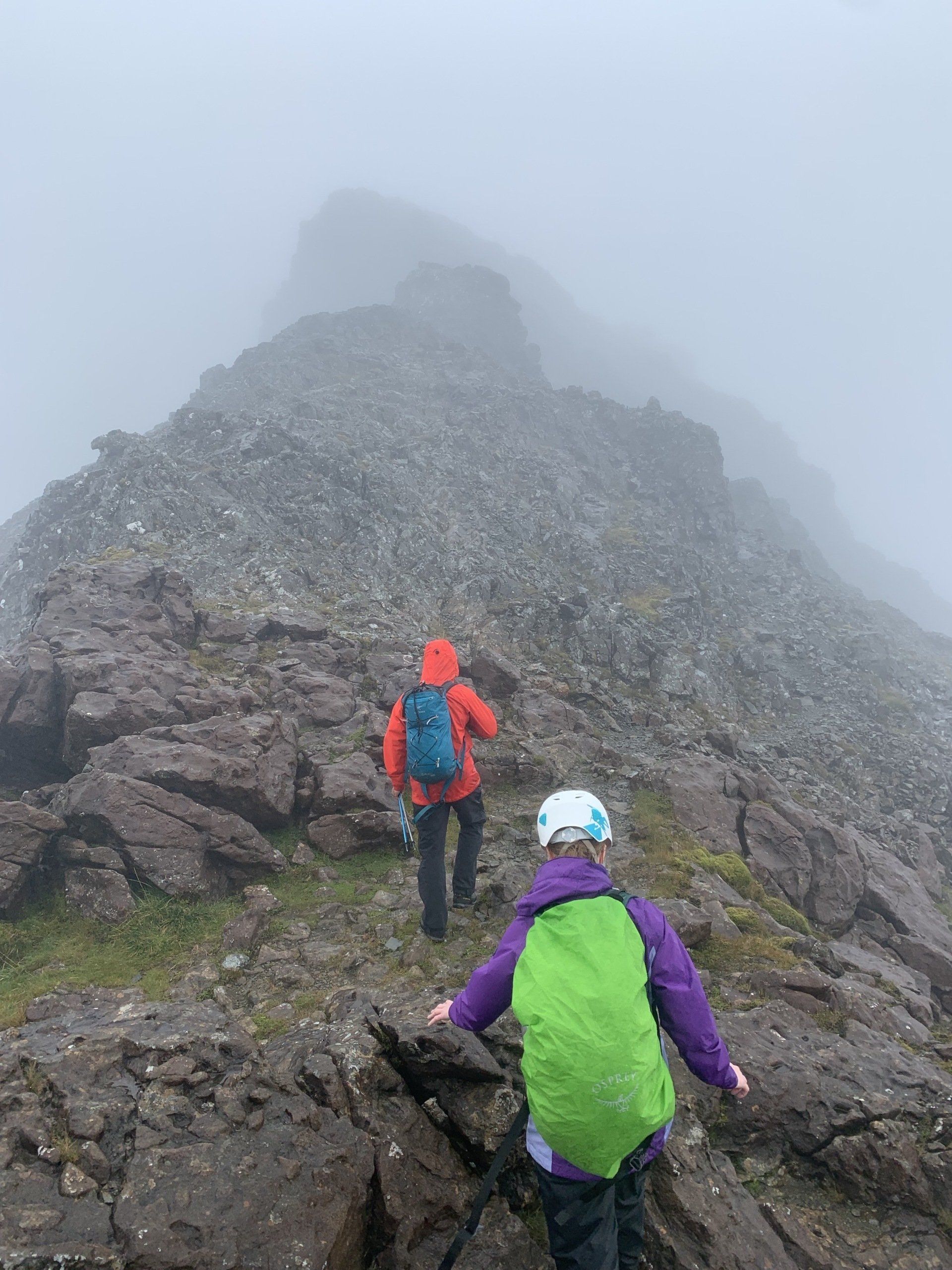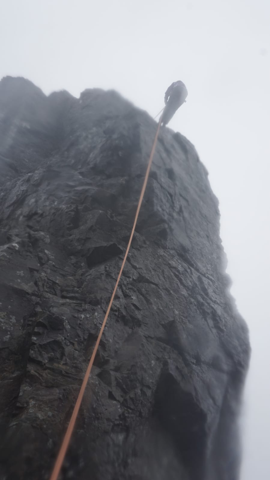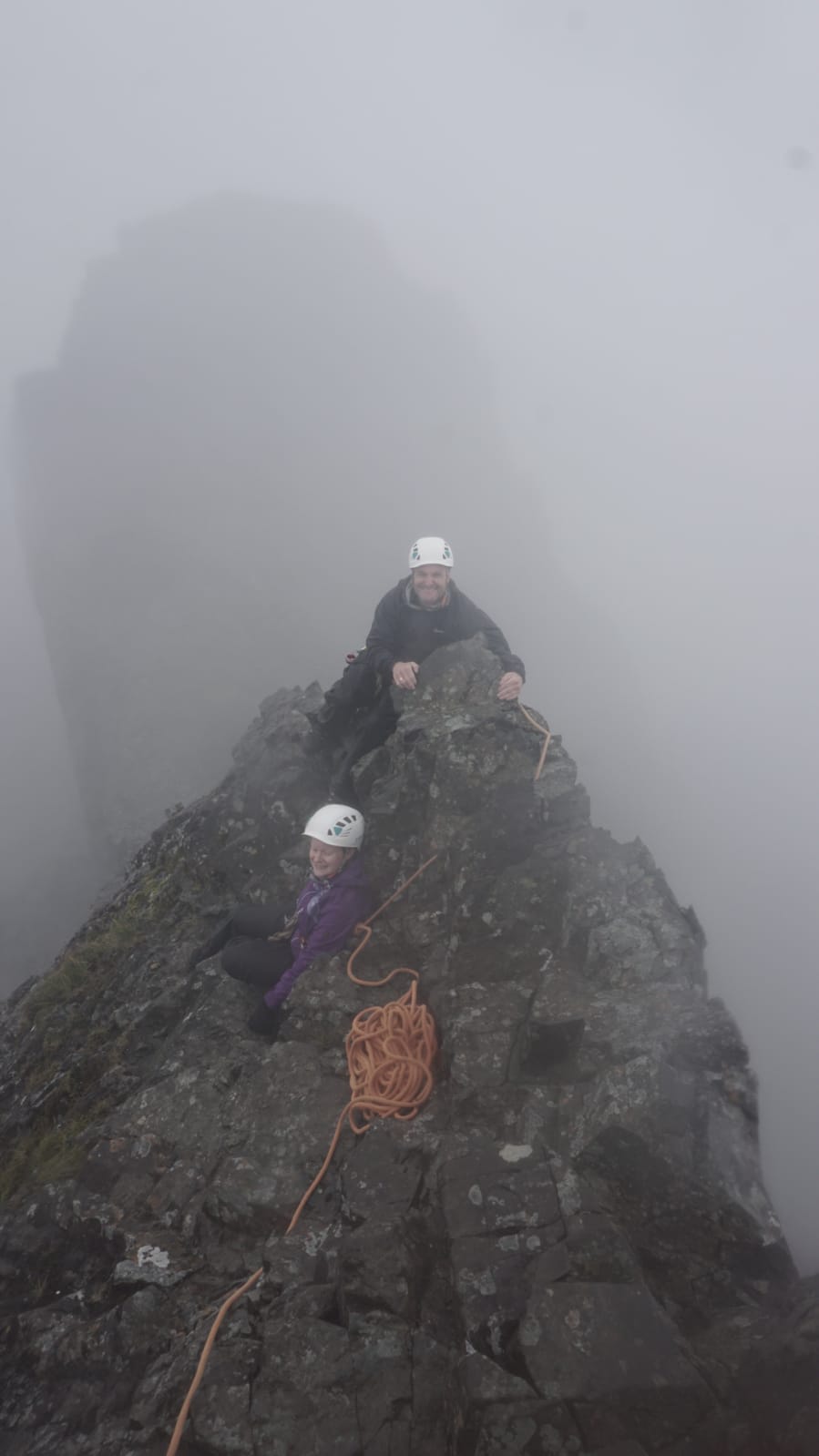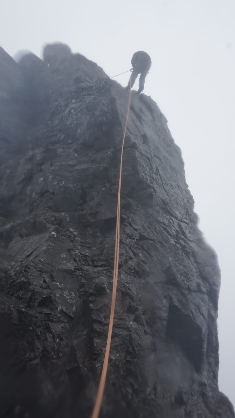 Aug 2021 - (with Gemma and Caspar - guide) Ascent from Glenbrittle Memorial Hut. Just an amazing day despite the poor weather. We met our guide (the bloke with all the ropes, harnesses, helmets and technical climbing kit) at 7:30am in Glenbrittle. His name was Caspar and we warmed to him immediately. Just as well, as what was coming up was possibly the most challenging thing either of us have done to date on a mountain - the 'In Pinn' or the Inaccessible Pinnacle. It is the second highest summit in the Skye Cuillin and notorious as the most difficult of the Munros, requiring a rock-climb and an abseil to complete the ascent. It rises from the summit of Sgùrr Dearg. Although it was rainy and misty, the climb to the base of the Sgurr Dearg itself was superb with some enjoyable scrambling. After a snack, putting on harnesses and helmets and descending the scree to the start of the east ridge up the In Pinn, it was time to go. The ascent is essentially a steep fin of rock, 50 metres in length with yawning exposure on both sides. The initial climb is up a little chimney before shifting onto the crest for the rest of the ascent. Almost immediately, the crux of the climb is encountered, a tricky step up with poor holds, made worse in the wet. Swallowing down the exposure, we figured it out eventually, only to rise up a bit more and see the ridge narrow further and stretch forever upwards. Caspar was now out of sight, having secured the ropes at the first rest point. This made it really unsettling. Gemma refused to look down. I had a few glances and it was awful. The scrambling itself from the first rest point on is relatively easy as the ridge has natural steps. It's just ridiculous exposure. Photos don't do it justice as Caspar couldn't get his camera out or see us on the crest itself. The fact that the rope lies along the ridge also means that a slip off either side would mean a considerable fall before the rope would stop you. Caspar made this slightly less of an issue by using slings around rocks, putting the ropes through crevices and placing in cams at one point. I was tethered to Gemma so if she went off, I would have too and fallen two metres further! If Caspar had fallen off, we would be absolutely...stuck! With these delights circling in my mind and with Gemma performing some hilarious, unorthodox moves, we made it safely to the top. Relief. The abseil down, although scary was nothing in comparison to the climb up. Instead of descending via the route we had taken up to Sgurr Dearg, we crossed the ridge to Sgùrr na Banachdich before going down. Just the tree of us, up in the muck the entire time and we saw nobody else. Just a fabulous adventure. Gemma never wants to repeat it, but I will in better weather one day.