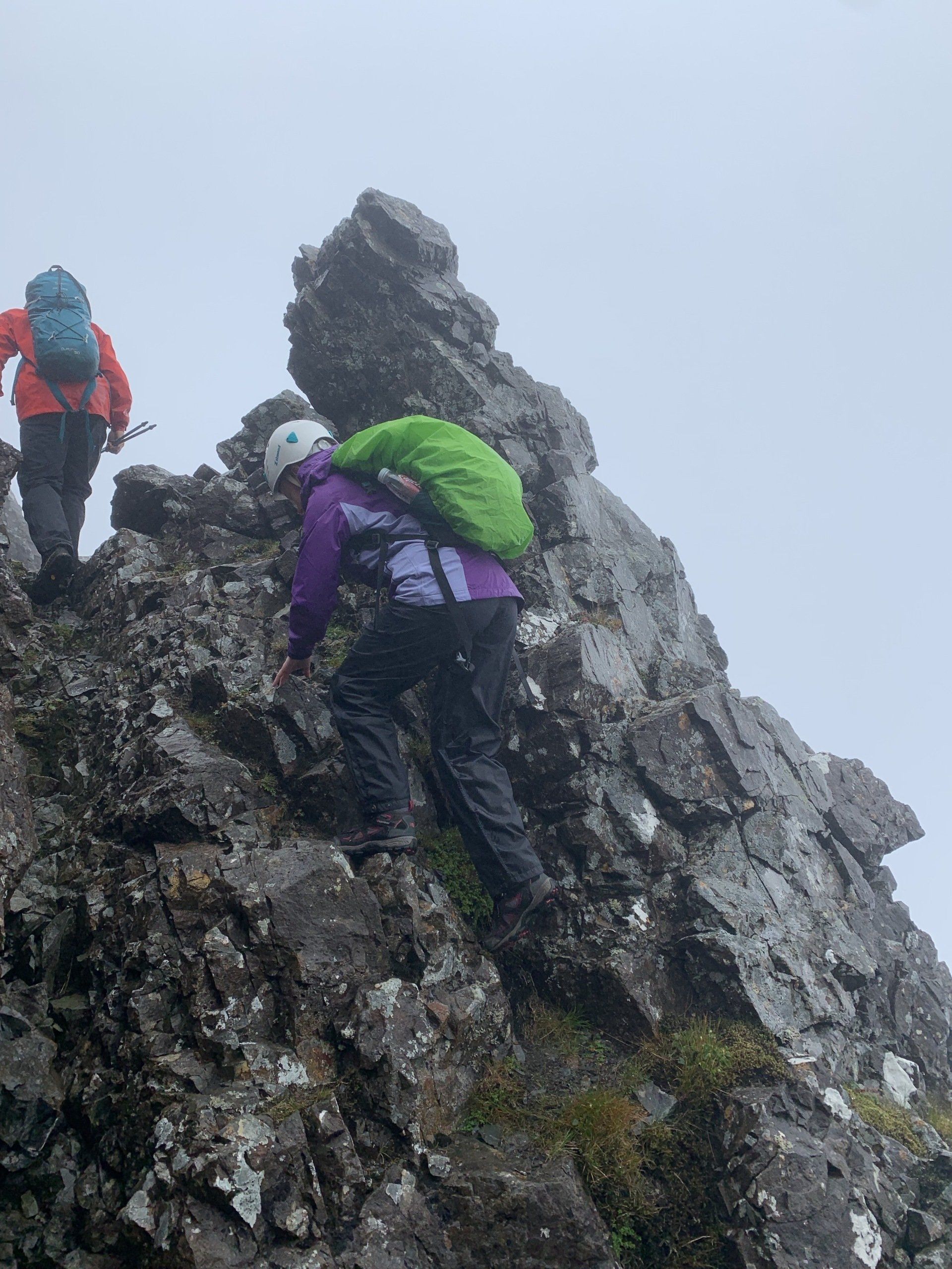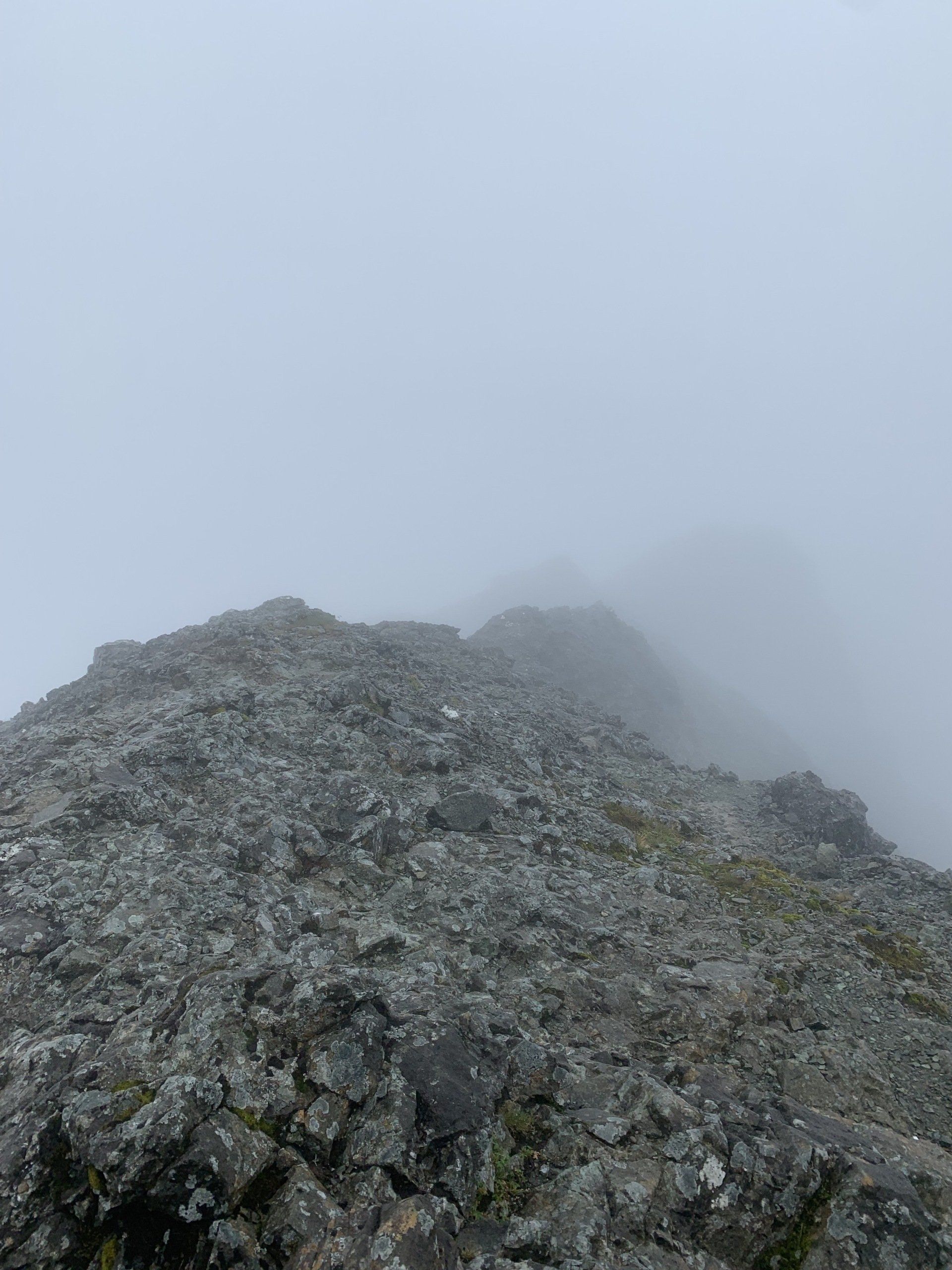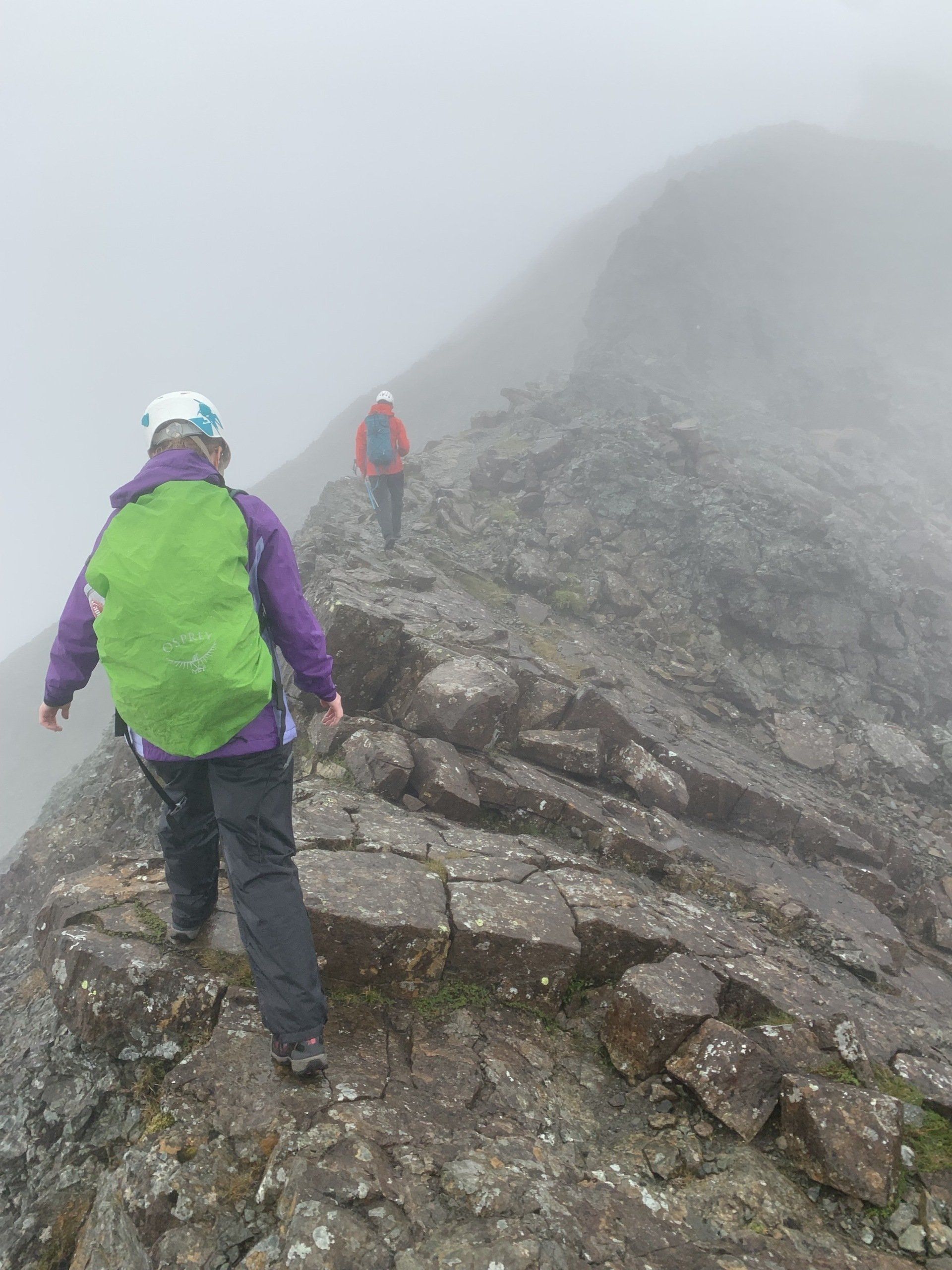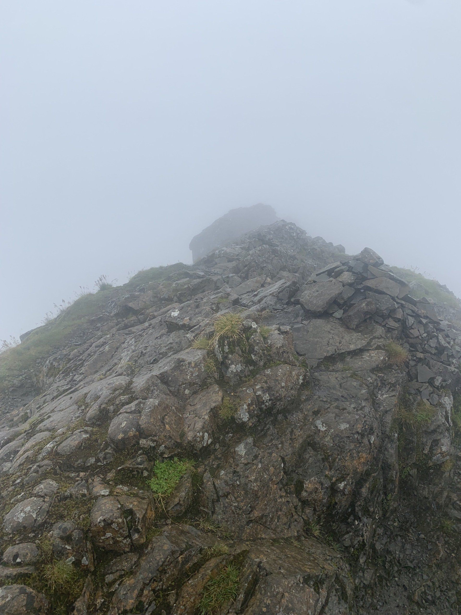 Aug 2021 - (with Gemma and Caspar - guide) Ascent from Glenbrittle Memorial Hut. Just an amazing day despite the poor weather. We met our guide (the bloke with all the ropes, harnesses, helmets and technical climbing kit) at 7:30am in Glenbrittle. His name was Caspar and we warmed to him immediately. Just as well, as what was coming up was possibly the most challenging thing either of us have done to date on a mountain - the 'In Pinn' or the Inaccessible Pinnacle. It is the second highest summit in the Skye Cuillin and notorious as the most difficult of the Munros, requiring a rock-climb and an abseil to complete the ascent. It rises from the summit of Sgùrr Dearg. Although it was rainy and misty, the climb to the base of the Sgurr Dearg itself was superb with some enjoyable scrambling. After a snack, putting on harnesses and helmets and descending the scree to the start of the east ridge up the In Pinn, it was time to go. The ascent is essentially a steep fin of rock, 50 metres in length with yawning exposure on both sides. The initial climb is up a little chimney before shifting onto the crest for the rest of the ascent. Almost immediately, the crux of the climb is encountered, a tricky step up with poor holds, made worse in the wet. Swallowing down the exposure, we figured it out eventually, only to rise up a bit more and see the ridge narrow further and stretch forever upwards. Caspar was now out of sight, having secured the ropes at the first rest point. This made it really unsettling. Gemma refused to look down. I had a few glances and it was awful. The scrambling itself from the first rest point on is relatively easy as the ridge has natural steps. It's just ridiculous exposure. Photos don't do it justice as Caspar couldn't get his camera out or see us on the crest itself. The fact that the rope lies along the ridge also means that a slip off either side would mean a considerable fall before the rope would stop you. Caspar made this slightly less of an issue by using slings around rocks, putting the ropes through crevices and placing in cams at one point. I was tethered to Gemma so if she went off, I would have too and fallen two metres further! If Caspar had fallen off, we would be absolutely...stuck! With these delights circling in my mind and with Gemma performing some hilarious, unorthodox moves, we made it safely to the top. Relief. The abseil down, although scary was nothing in comparison to the climb up. Instead of descending via the route we had taken up to Sgurr Dearg, we crossed the ridge to Sgùrr na Banachdich before going down. Just the tree of us, up in the muck the entire time and we saw nobody else. Just a fabulous adventure. Gemma never wants to repeat it, but I will in better weather one day.