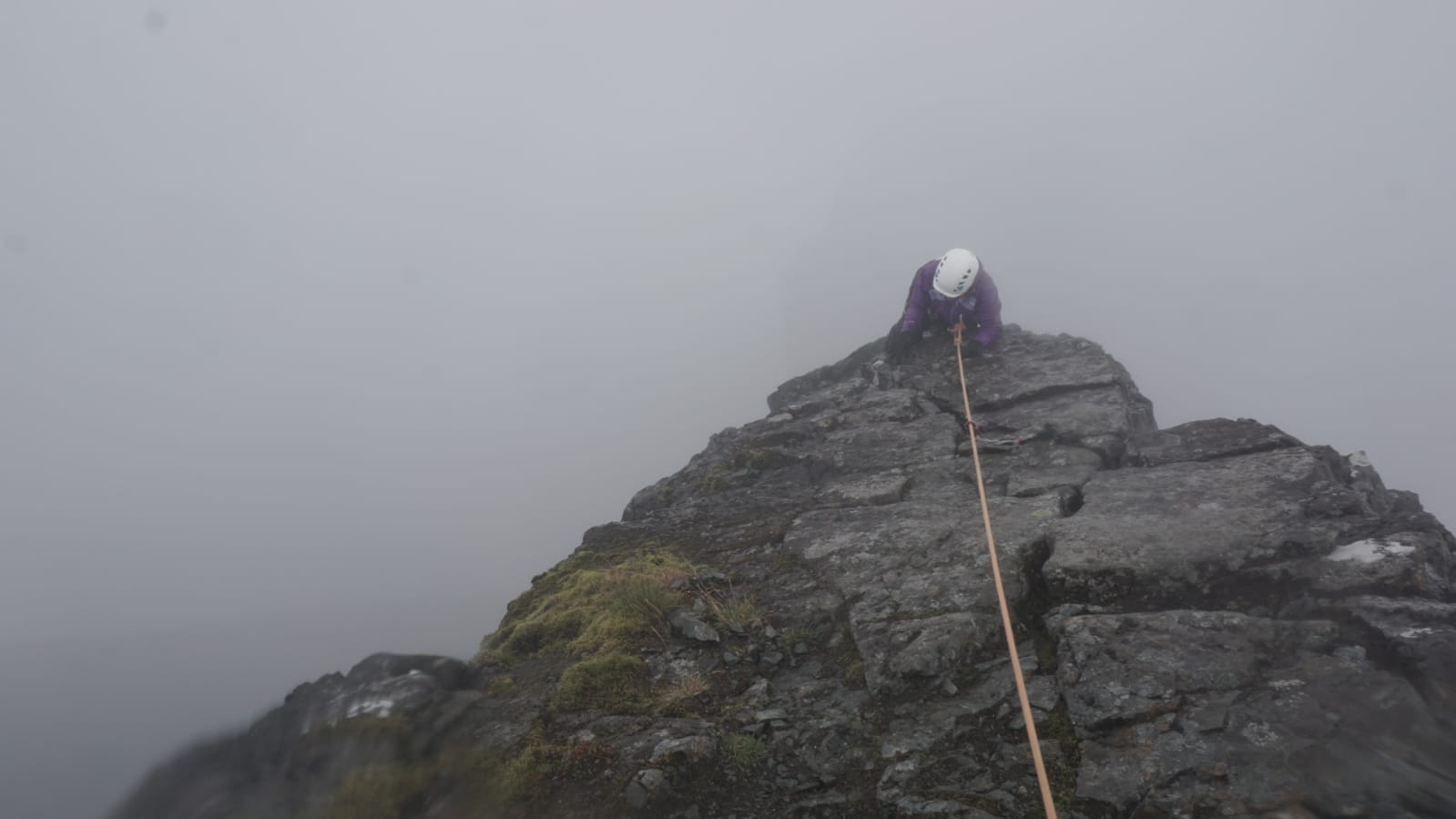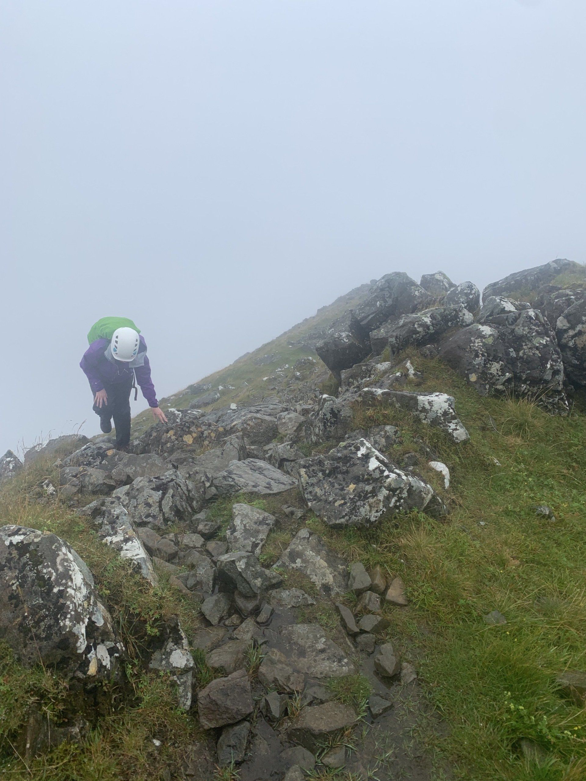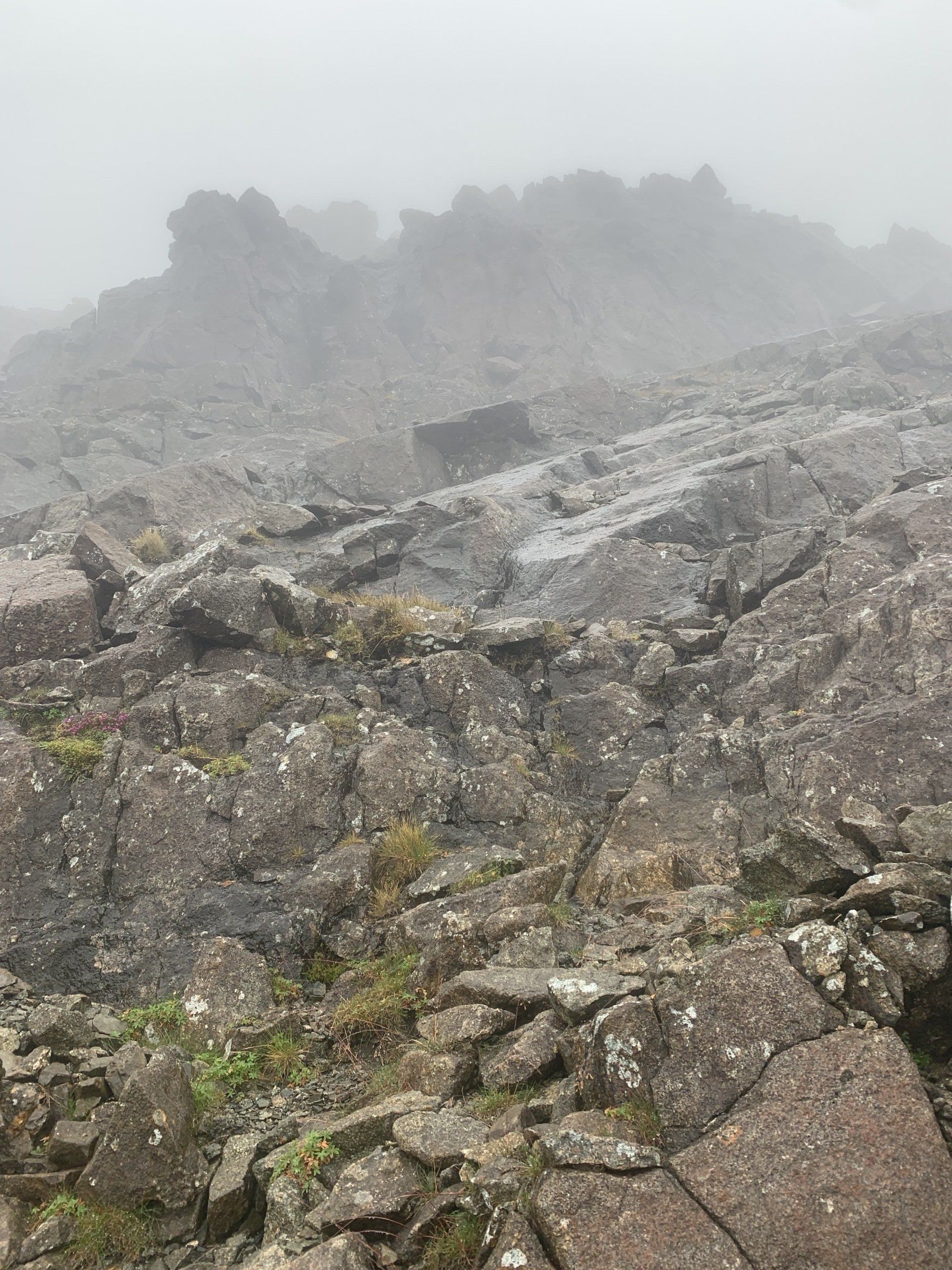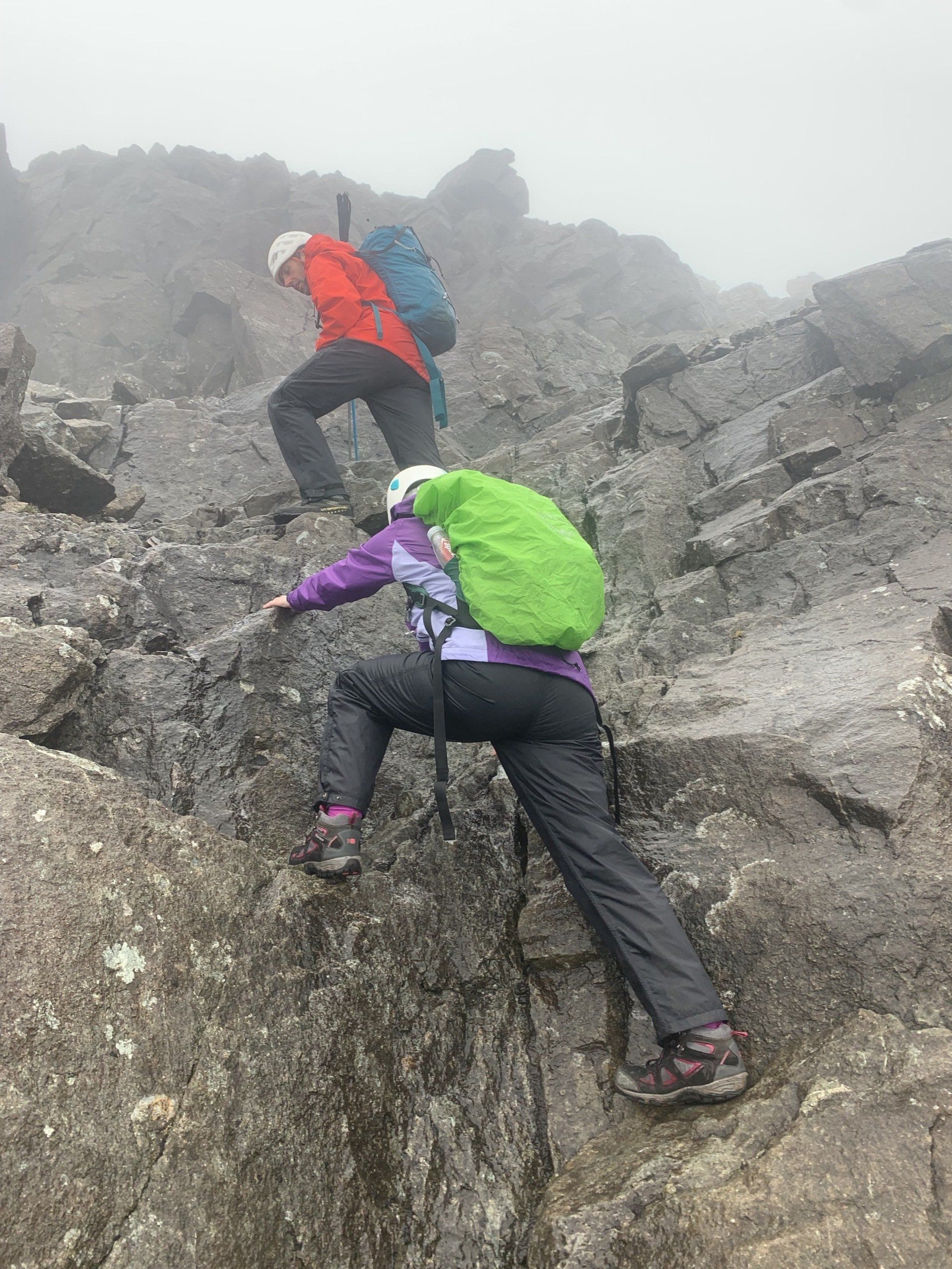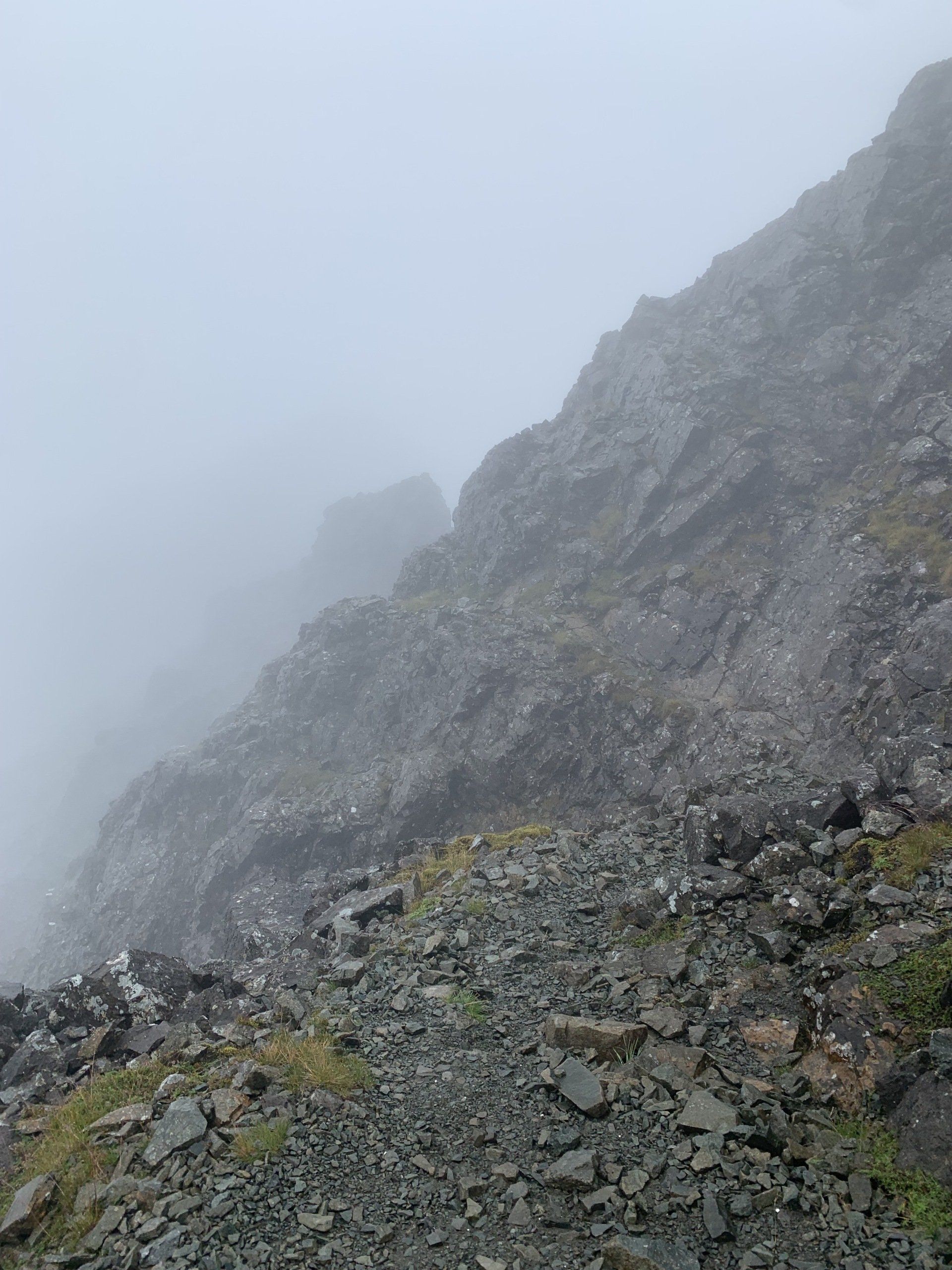 Aug 2021 - (with Gemma and Caspar - guide) Ascent from Glenbrittle Memorial Hut. Just an amazing day despite the poor weather. We met our guide (the bloke with all the ropes, harnesses, helmets and technical climbing kit) at 7:30am in Glenbrittle. His name was Caspar and we warmed to him immediately. Just as well, as what was coming up was possibly the most challenging thing either of us have done to date on a mountain - the 'In Pinn' or the Inaccessible Pinnacle. It is the second highest summit in the Skye Cuillin and notorious as the most difficult of the Munros, requiring a rock-climb and an abseil to complete the ascent. It rises from the summit of Sgùrr Dearg. Although it was rainy and misty, the climb to the base of the Sgurr Dearg itself was superb with some enjoyable scrambling. After a snack, putting on harnesses and helmets and descending the scree to the start of the east ridge up the In Pinn, it was time to go. The ascent is essentially a steep fin of rock, 50 metres in length with yawning exposure on both sides. The initial climb is up a little chimney before shifting onto the crest for the rest of the ascent. Almost immediately, the crux of the climb is encountered, a tricky step up with poor holds, made worse in the wet. Swallowing down the exposure, we figured it out eventually, only to rise up a bit more and see the ridge narrow further and stretch forever upwards. Caspar was now out of sight, having secured the ropes at the first rest point. This made it really unsettling. Gemma refused to look down. I had a few glances and it was awful. The scrambling itself from the first rest point on is relatively easy as the ridge has natural steps. It's just ridiculous exposure. Photos don't do it justice as Caspar couldn't get his camera out or see us on the crest itself. The fact that the rope lies along the ridge also means that a slip off either side would mean a considerable fall before the rope would stop you. Caspar made this slightly less of an issue by using slings around rocks, putting the ropes through crevices and placing in cams at one point. I was tethered to Gemma so if she went off, I would have too and fallen two metres further! If Caspar had fallen off, we would be absolutely...stuck! With these delights circling in my mind and with Gemma performing some hilarious, unorthodox moves, we made it safely to the top. Relief. The abseil down, although scary was nothing in comparison to the climb up. Instead of descending via the route we had taken up to Sgurr Dearg, we crossed the ridge to Sgùrr na Banachdich before going down. Just the tree of us, up in the muck the entire time and we saw nobody else. Just a fabulous adventure. Gemma never wants to repeat it, but I will in better weather one day.