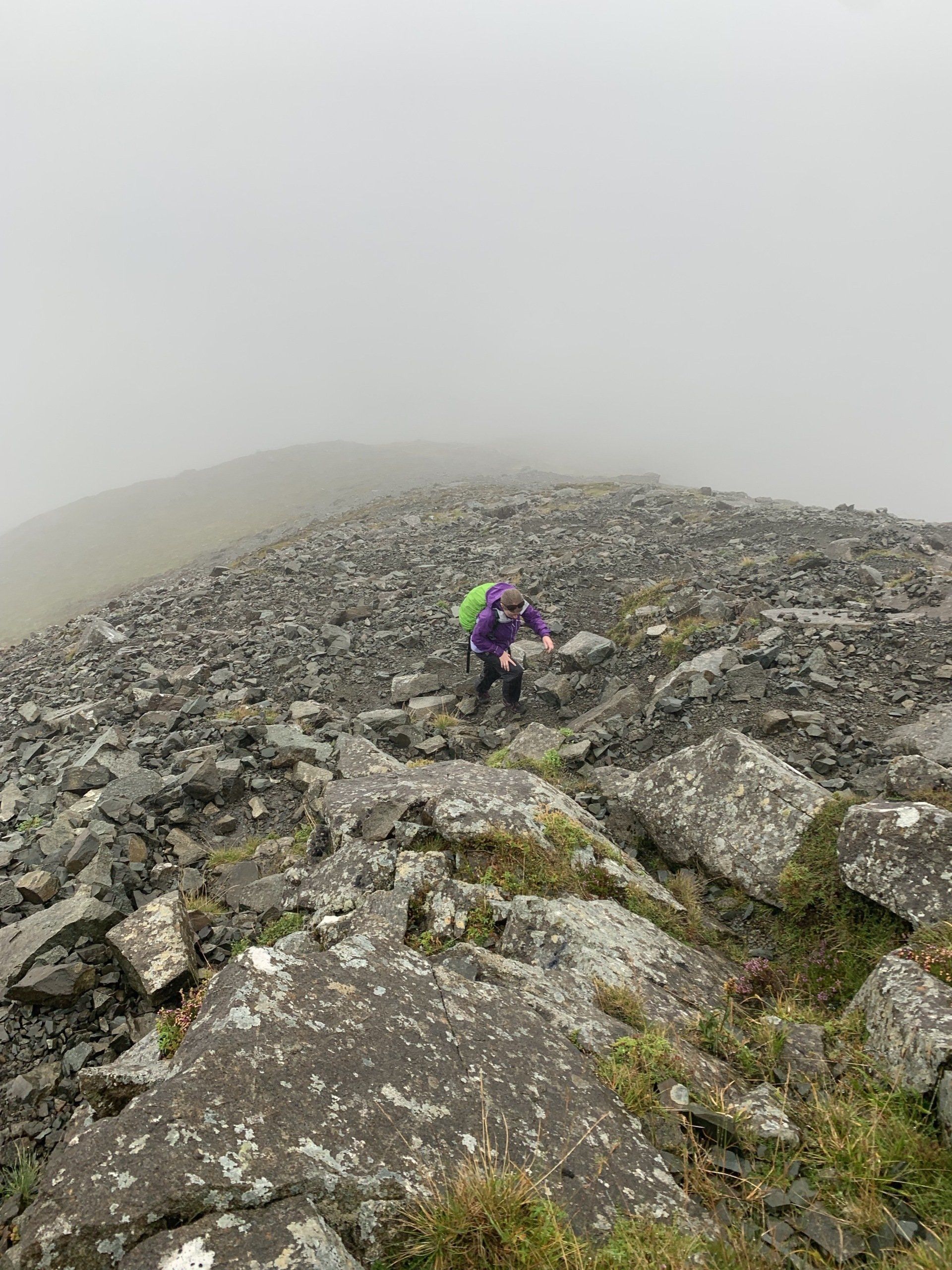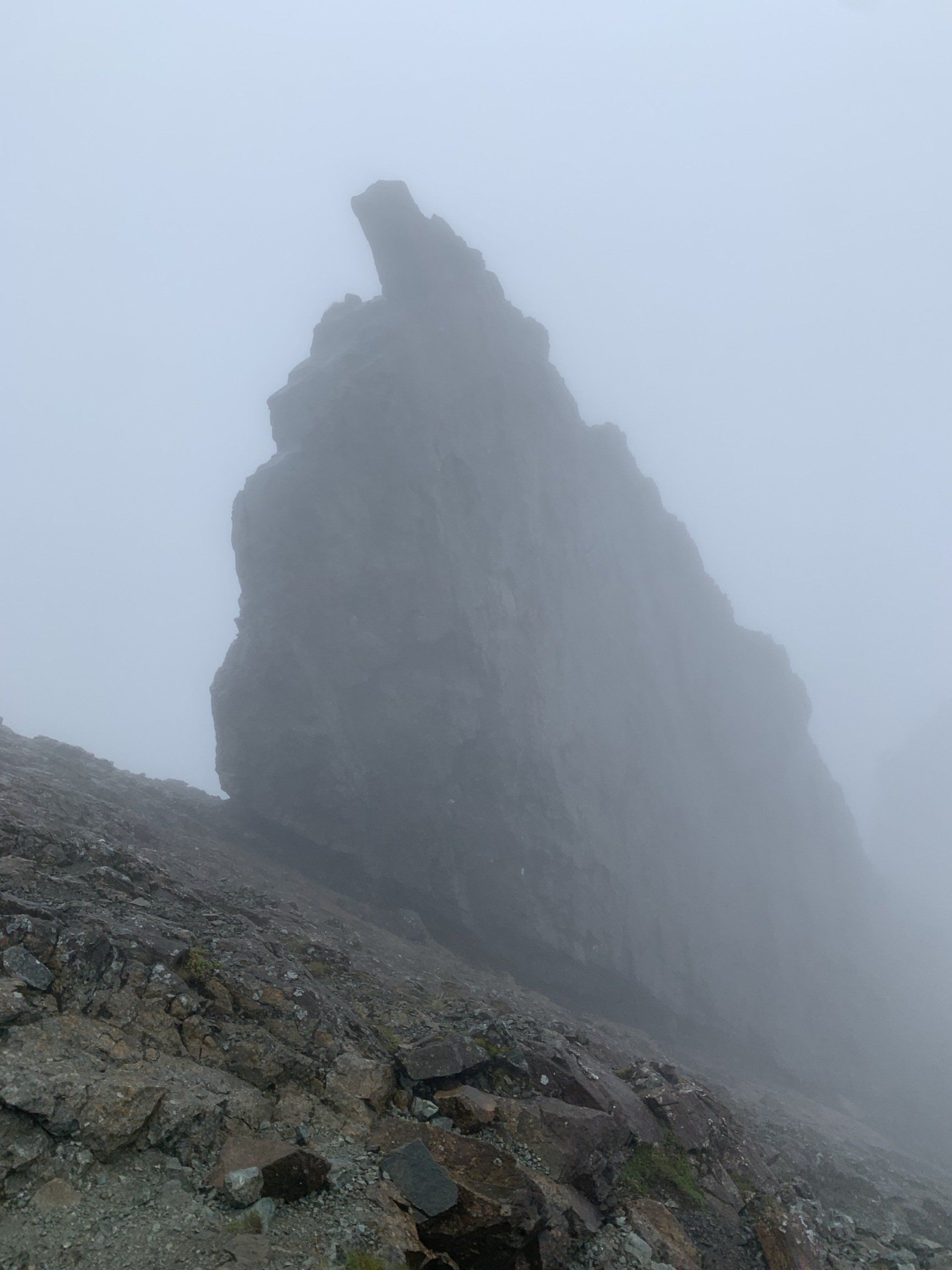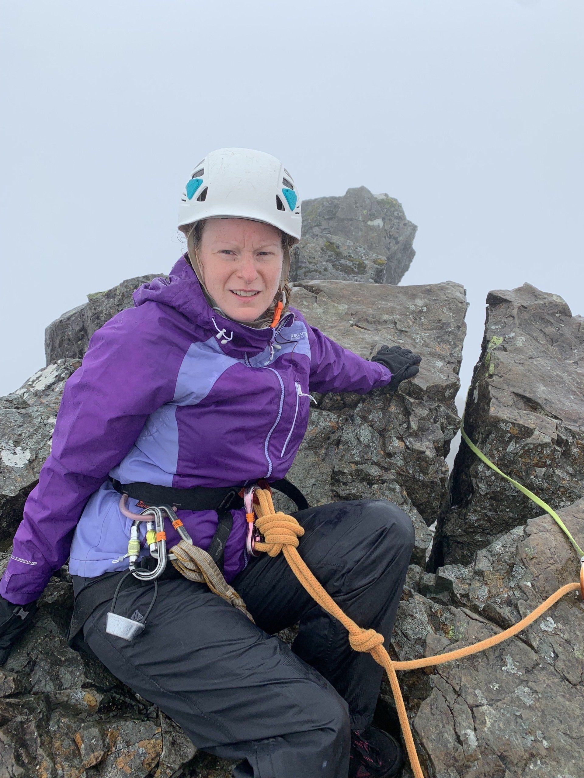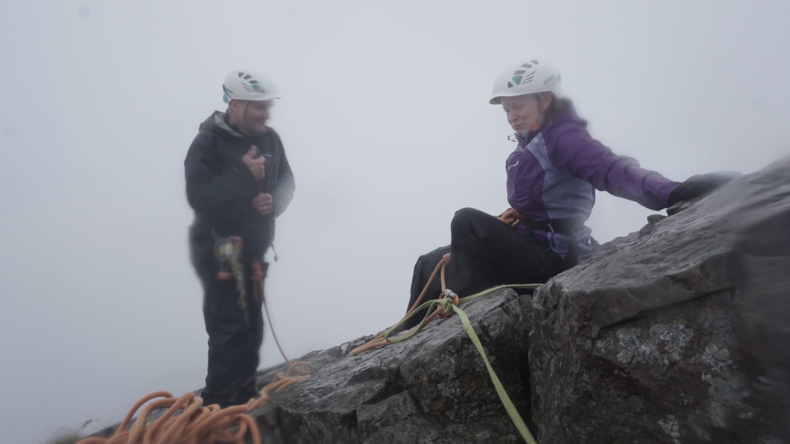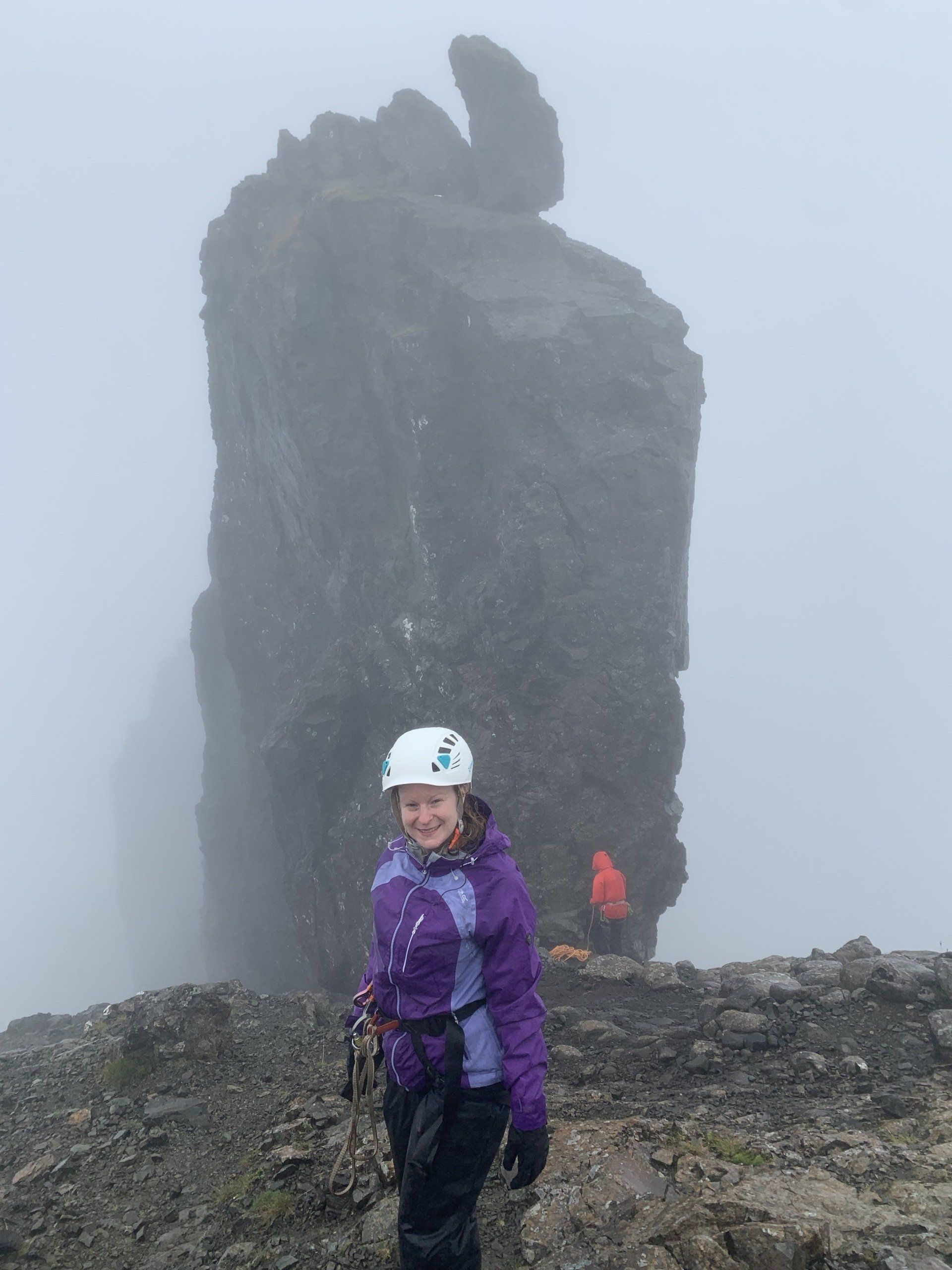 Aug 2021 - (with Gemma and Caspar - guide) Ascent from Glenbrittle Memorial Hut. Just an amazing day despite the poor weather. We met our guide (the bloke with all the ropes, harnesses, helmets and technical climbing kit) at 7:30am in Glenbrittle. His name was Caspar and we warmed to him immediately. Just as well, as what was coming up was possibly the most challenging thing either of us have done to date on a mountain - the 'In Pinn' or the Inaccessible Pinnacle. It is the second highest summit in the Skye Cuillin and notorious as the most difficult of the Munros, requiring a rock-climb and an abseil to complete the ascent. It rises from the summit of Sgùrr Dearg. Although it was rainy and misty, the climb to the base of the Sgurr Dearg itself was superb with some enjoyable scrambling. After a snack, putting on harnesses and helmets and descending the scree to the start of the east ridge up the In Pinn, it was time to go. The ascent is essentially a steep fin of rock, 50 metres in length with yawning exposure on both sides. The initial climb is up a little chimney before shifting onto the crest for the rest of the ascent. Almost immediately, the crux of the climb is encountered, a tricky step up with poor holds, made worse in the wet. Swallowing down the exposure, we figured it out eventually, only to rise up a bit more and see the ridge narrow further and stretch forever upwards. Caspar was now out of sight, having secured the ropes at the first rest point. This made it really unsettling. Gemma refused to look down. I had a few glances and it was awful. The scrambling itself from the first rest point on is relatively easy as the ridge has natural steps. It's just ridiculous exposure. Photos don't do it justice as Caspar couldn't get his camera out or see us on the crest itself. The fact that the rope lies along the ridge also means that a slip off either side would mean a considerable fall before the rope would stop you. Caspar made this slightly less of an issue by using slings around rocks, putting the ropes through crevices and placing in cams at one point. I was tethered to Gemma so if she went off, I would have too and fallen two metres further! If Caspar had fallen off, we would be absolutely...stuck! With these delights circling in my mind and with Gemma performing some hilarious, unorthodox moves, we made it safely to the top. Relief. The abseil down, although scary was nothing in comparison to the climb up. Instead of descending via the route we had taken up to Sgurr Dearg, we crossed the ridge to Sgùrr na Banachdich before going down. Just the tree of us, up in the muck the entire time and we saw nobody else. Just a fabulous adventure. Gemma never wants to repeat it, but I will in better weather one day.