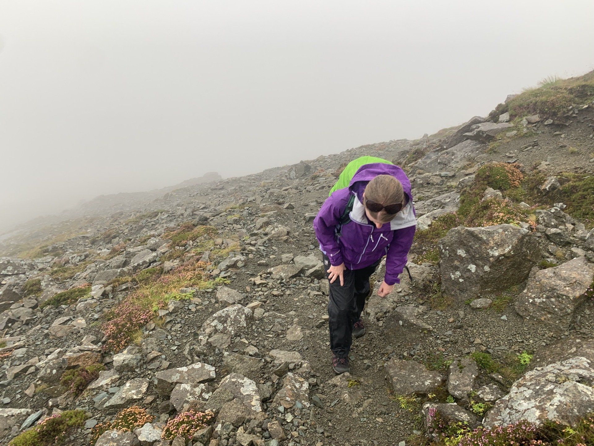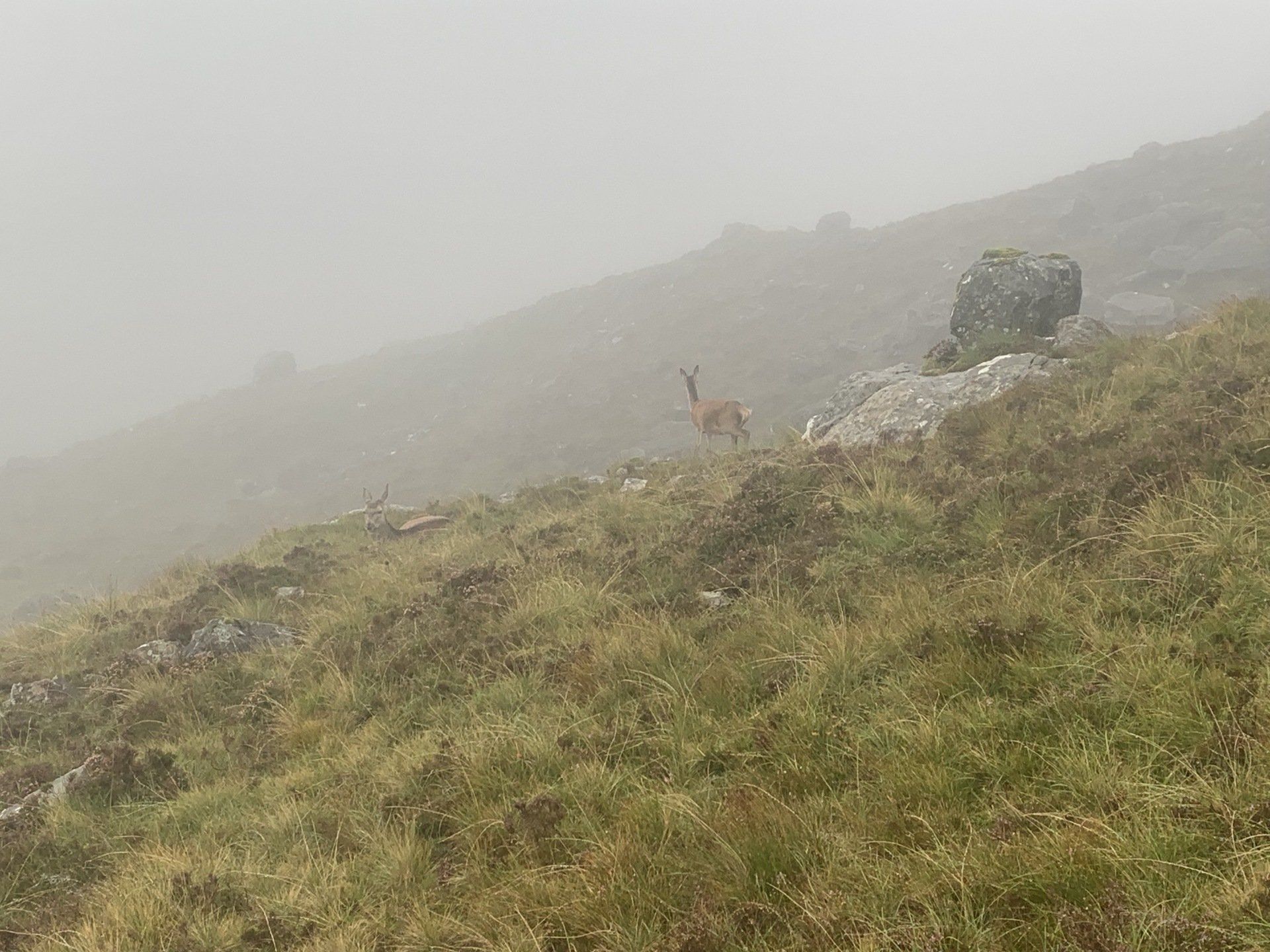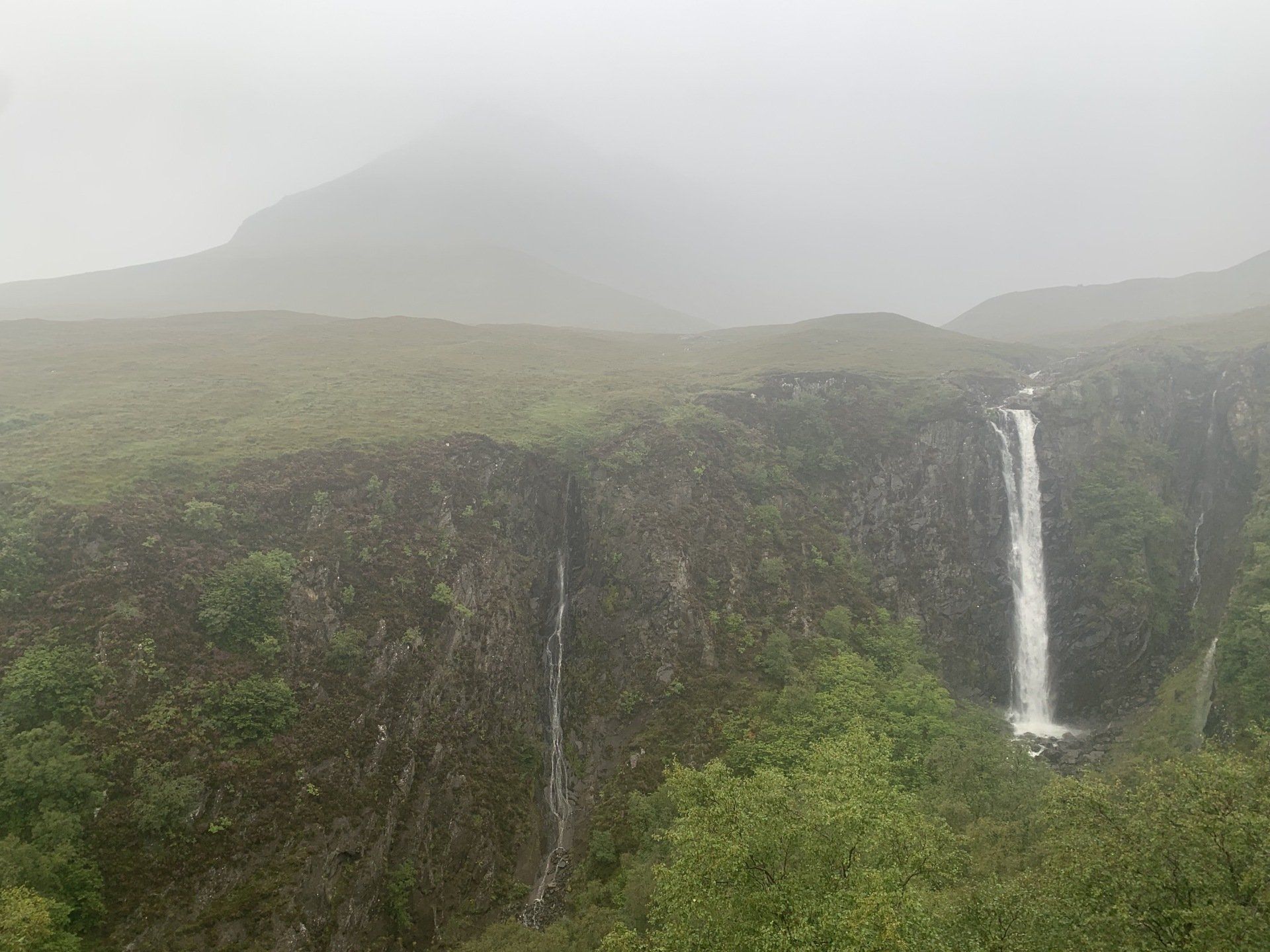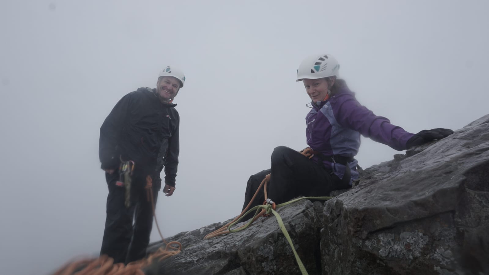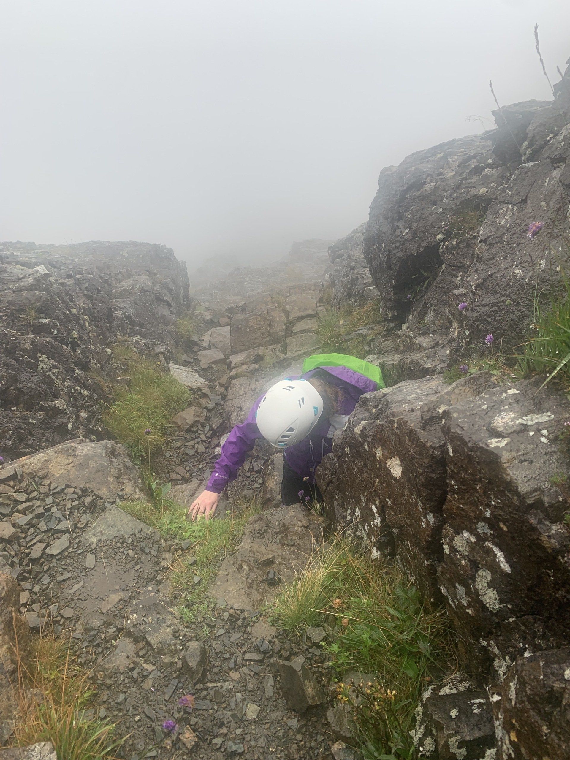 Aug 2021 - (with Gemma and Caspar - guide) Ascent from Glenbrittle Memorial Hut. Just an amazing day despite the poor weather. We met our guide (the bloke with all the ropes, harnesses, helmets and technical climbing kit) at 7:30am in Glenbrittle. His name was Caspar and we warmed to him immediately. Just as well, as what was coming up was possibly the most challenging thing either of us have done to date on a mountain - the 'In Pinn' or the Inaccessible Pinnacle. It is the second highest summit in the Skye Cuillin and notorious as the most difficult of the Munros, requiring a rock-climb and an abseil to complete the ascent. It rises from the summit of Sgùrr Dearg. Although it was rainy and misty, the climb to the base of the Sgurr Dearg itself was superb with some enjoyable scrambling. After a snack, putting on harnesses and helmets and descending the scree to the start of the east ridge up the In Pinn, it was time to go. The ascent is essentially a steep fin of rock, 50 metres in length with yawning exposure on both sides. The initial climb is up a little chimney before shifting onto the crest for the rest of the ascent. Almost immediately, the crux of the climb is encountered, a tricky step up with poor holds, made worse in the wet. Swallowing down the exposure, we figured it out eventually, only to rise up a bit more and see the ridge narrow further and stretch forever upwards. Caspar was now out of sight, having secured the ropes at the first rest point. This made it really unsettling. Gemma refused to look down. I had a few glances and it was awful. The scrambling itself from the first rest point on is relatively easy as the ridge has natural steps. It's just ridiculous exposure. Photos don't do it justice as Caspar couldn't get his camera out or see us on the crest itself. The fact that the rope lies along the ridge also means that a slip off either side would mean a considerable fall before the rope would stop you. Caspar made this slightly less of an issue by using slings around rocks, putting the ropes through crevices and placing in cams at one point. I was tethered to Gemma so if she went off, I would have too and fallen two metres further! If Caspar had fallen off, we would be absolutely...stuck! With these delights circling in my mind and with Gemma performing some hilarious, unorthodox moves, we made it safely to the top. Relief. The abseil down, although scary was nothing in comparison to the climb up. Instead of descending via the route we had taken up to Sgurr Dearg, we crossed the ridge to Sgùrr na Banachdich before going down. Just the tree of us, up in the muck the entire time and we saw nobody else. Just a fabulous adventure. Gemma never wants to repeat it, but I will in better weather one day.