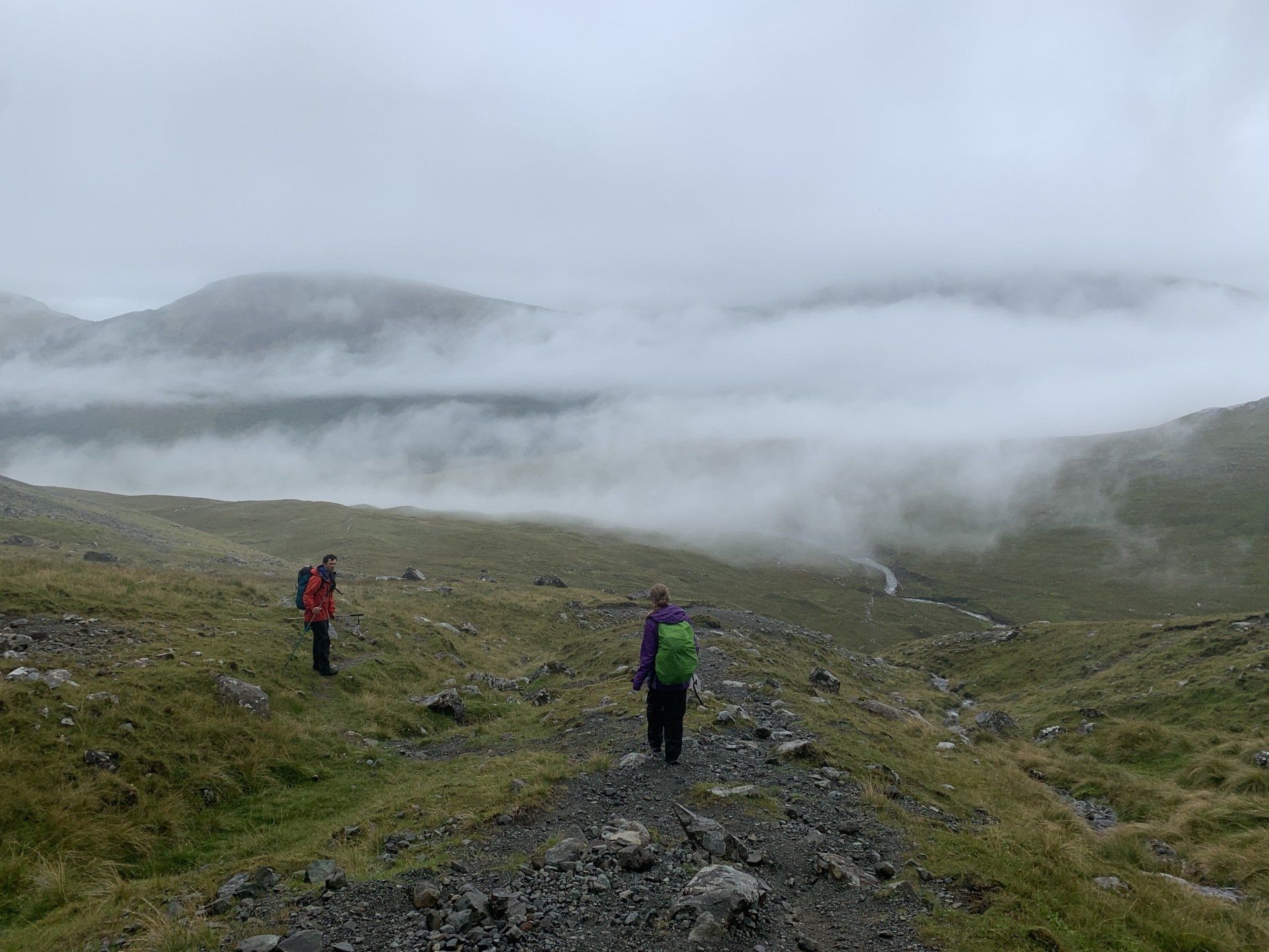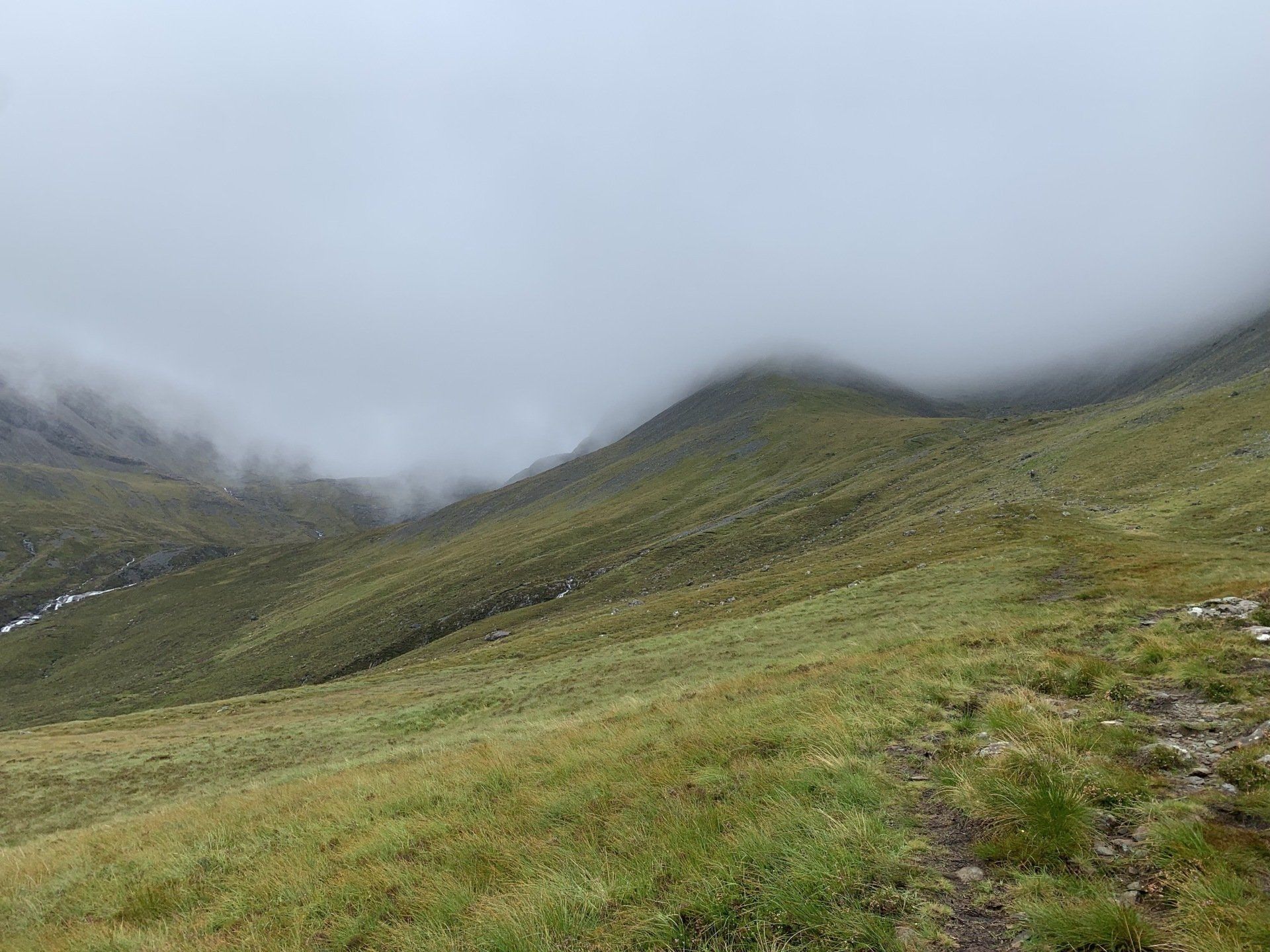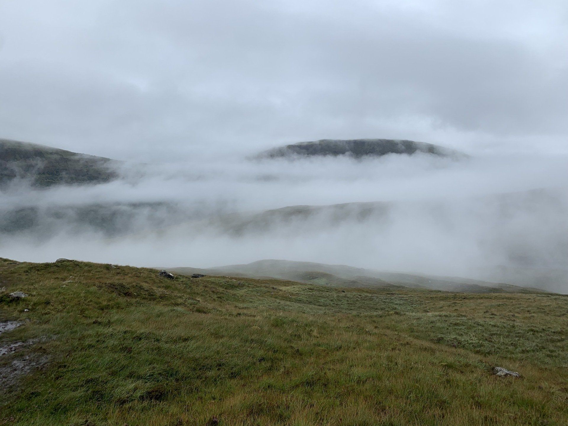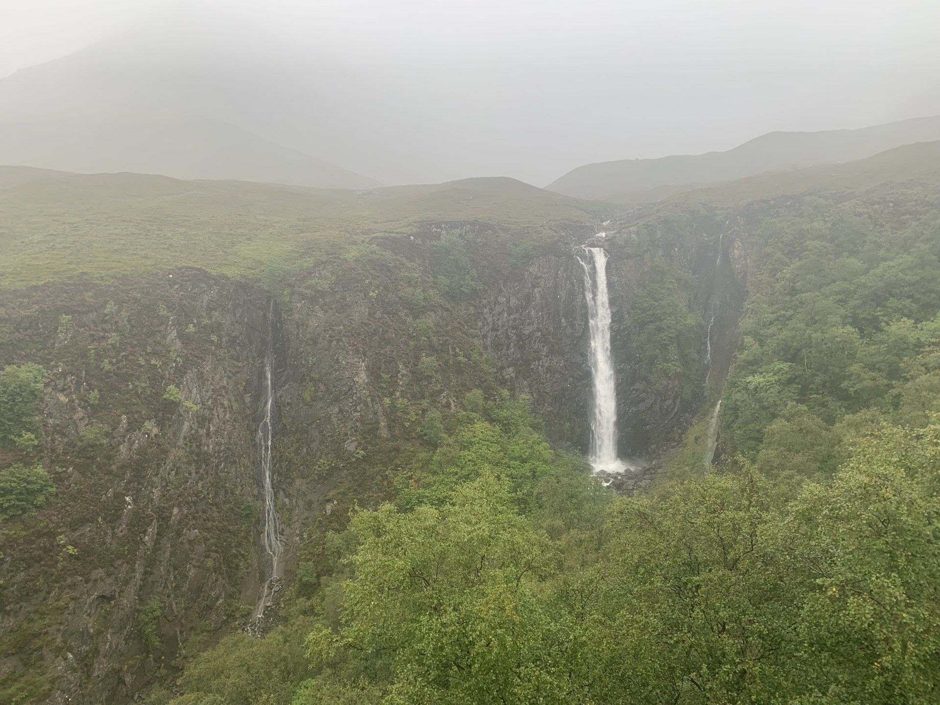 Aug 2021 - (with Gemma and Caspar - guide) Ascent from Glenbrittle Memorial Hut. Just an amazing day despite the poor weather. We met our guide (the bloke with all the ropes, harnesses, helmets and technical climbing kit) at 7:30am in Glenbrittle. His name was Caspar and we warmed to him immediately. Just as well, as what was coming up was possibly the most challenging thing either of us have done to date on a mountain - the 'In Pinn' or the Inaccessible Pinnacle. It is the second highest summit in the Skye Cuillin and notorious as the most difficult of the Munros, requiring a rock-climb and an abseil to complete the ascent. It rises from the summit of Sgùrr Dearg. Although it was rainy and misty, the climb to the base of the Sgurr Dearg itself was superb with some enjoyable scrambling. After a snack, putting on harnesses and helmets and descending the scree to the start of the east ridge up the In Pinn, it was time to go. The ascent is essentially a steep fin of rock, 50 metres in length with yawning exposure on both sides. The initial climb is up a little chimney before shifting onto the crest for the rest of the ascent. Almost immediately, the crux of the climb is encountered, a tricky step up with poor holds, made worse in the wet. Swallowing down the exposure, we figured it out eventually, only to rise up a bit more and see the ridge narrow further and stretch forever upwards. Caspar was now out of sight, having secured the ropes at the first rest point. This made it really unsettling. Gemma refused to look down. I had a few glances and it was awful. The scrambling itself from the first rest point on is relatively easy as the ridge has natural steps. It's just ridiculous exposure. Photos don't do it justice as Caspar couldn't get his camera out or see us on the crest itself. The fact that the rope lies along the ridge also means that a slip off either side would mean a considerable fall before the rope would stop you. Caspar made this slightly less of an issue by using slings around rocks, putting the ropes through crevices and placing in cams at one point. I was tethered to Gemma so if she went off, I would have too and fallen two metres further! If Caspar had fallen off, we would be absolutely...stuck! With these delights circling in my mind and with Gemma performing some hilarious, unorthodox moves, we made it safely to the top. Relief. The abseil down, although scary was nothing in comparison to the climb up. Instead of descending via the route we had taken up to Sgurr Dearg, we crossed the ridge to Sgùrr na Banachdich before going down. Just the tree of us, up in the muck the entire time and we saw nobody else. Just a fabulous adventure. Gemma never wants to repeat it, but I will in better weather one day.